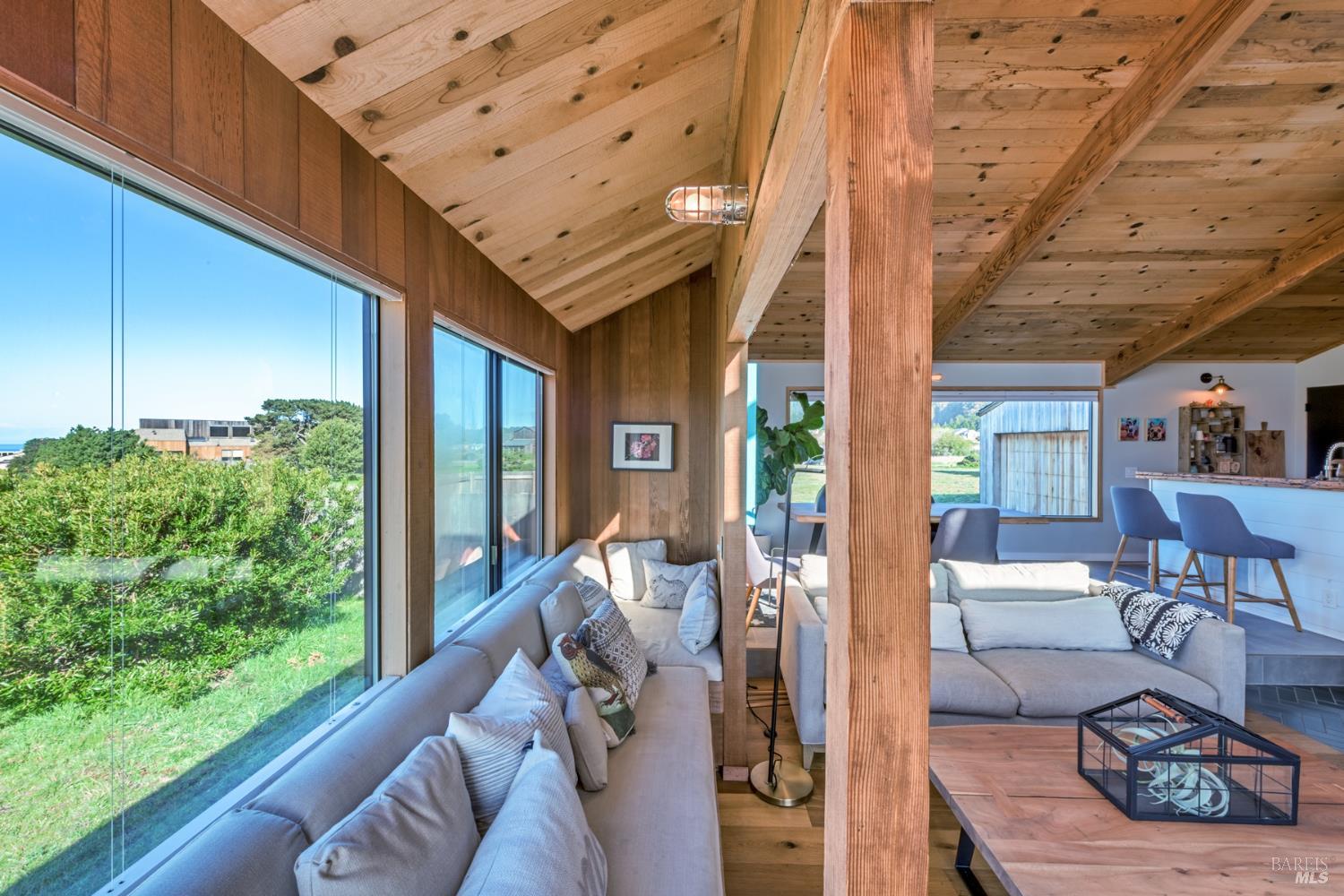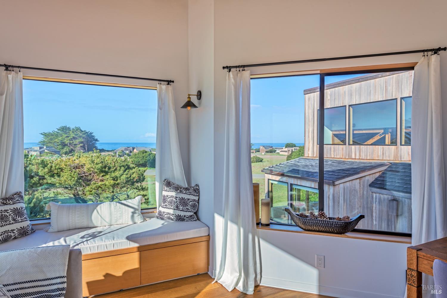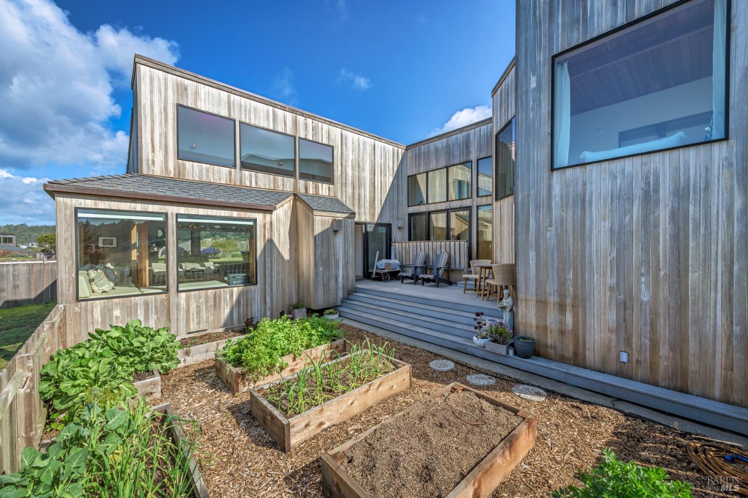 Impeccable, West Meadow, 2 bed/2 bath home with an additional fun loft space designed by Obie Bowman, FAIA, with ocean/meadow views plus detached 2-car garage with separate office and sauna room. The separate office/studio space is the ideal space for someone working from home. This architectural gem was renovated with a refreshed modern feel. Recent upgrades since 2017 include new flooring, shiplap walls, barn slider doors, kitchen appliances, high-end fixtures/finishes, blinds & paint. Living room features hardwood floors, open beam ceiling, built-in window seat nook and wood burning stove with Heath tile hearth. Dining room adjoins kitchen offering stainless steel appliances and butcher-block countertops. Primary bedroom features completely remodeled en-suite bathroom. Guest bedroom has remodeled guest hall bathroom. The loft with panoramic views offers a retreat away from living spaces with a great window seat for napping, reading a book or just TV lounging. The enclosed courtyard is a great spot to relax after using the outdoor hot tub or the indoor sauna. The ocean view garden has raised container beds with lots of space for growing your own food and flowers. Some furnishings included in sale. Unit 28 and Masthead Reach leads to all the best beaches incl. Walk on Beach, Tide Pool beach, the seal rookery and Shell Beach. One Eyed Jacks is a short stroll or bike ride away with BBQ area, play ground, Petanque/bocce court and just space to hang out along the cool hedgerow. Several new windows were installed in 2025. This house shows beautifully how classic Sea Ranch architecture meets modern design!
