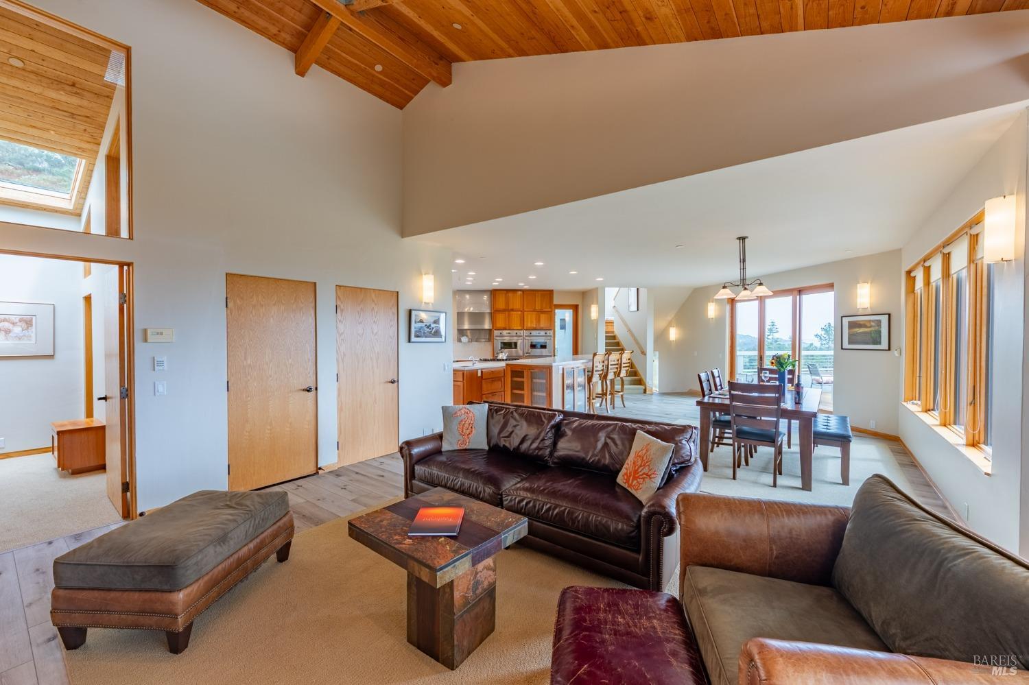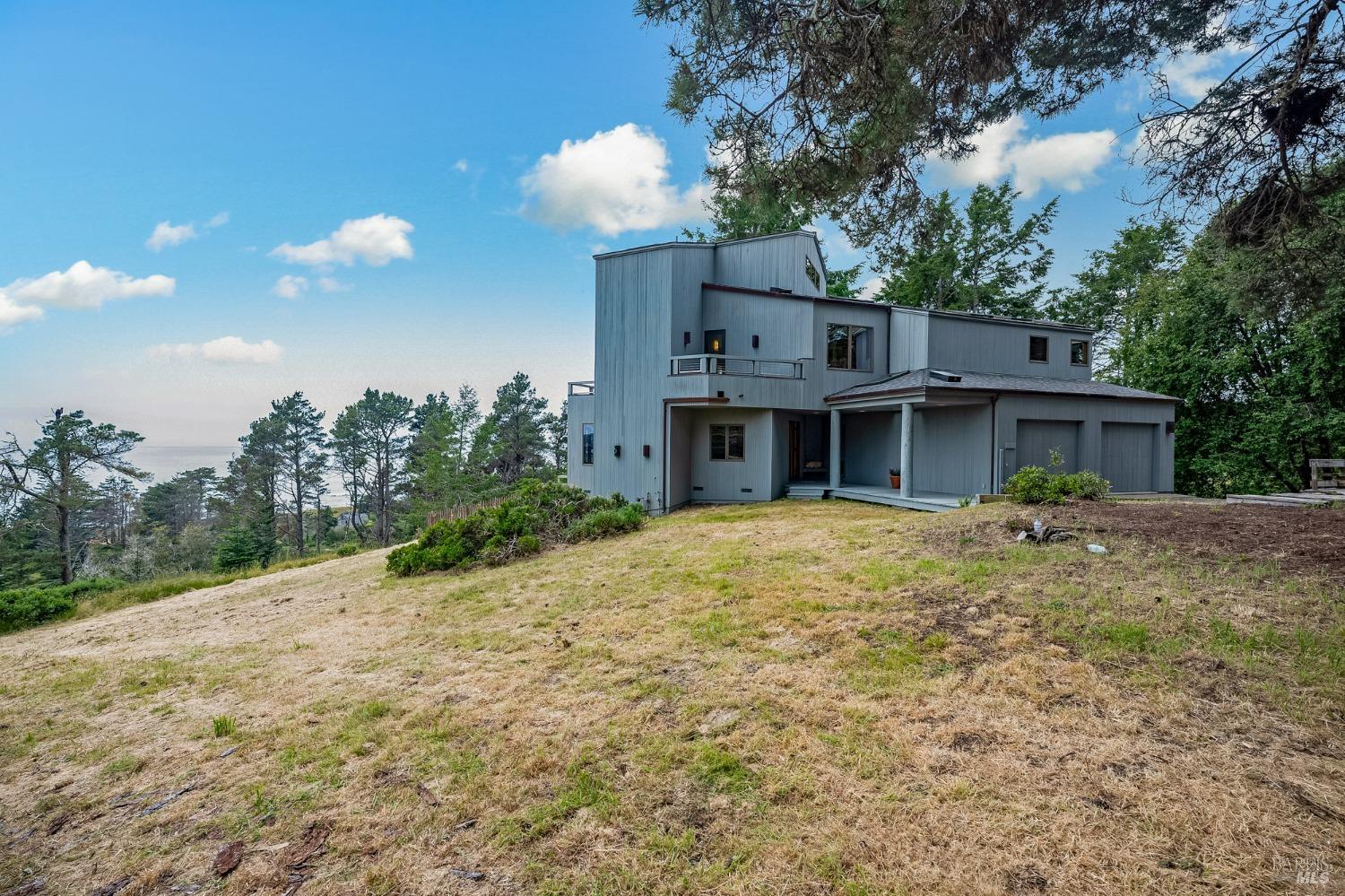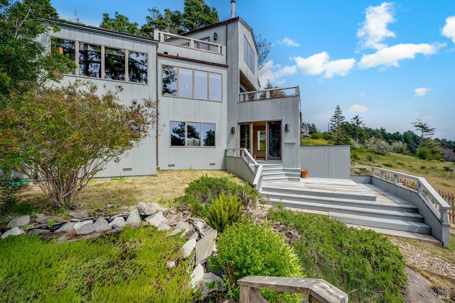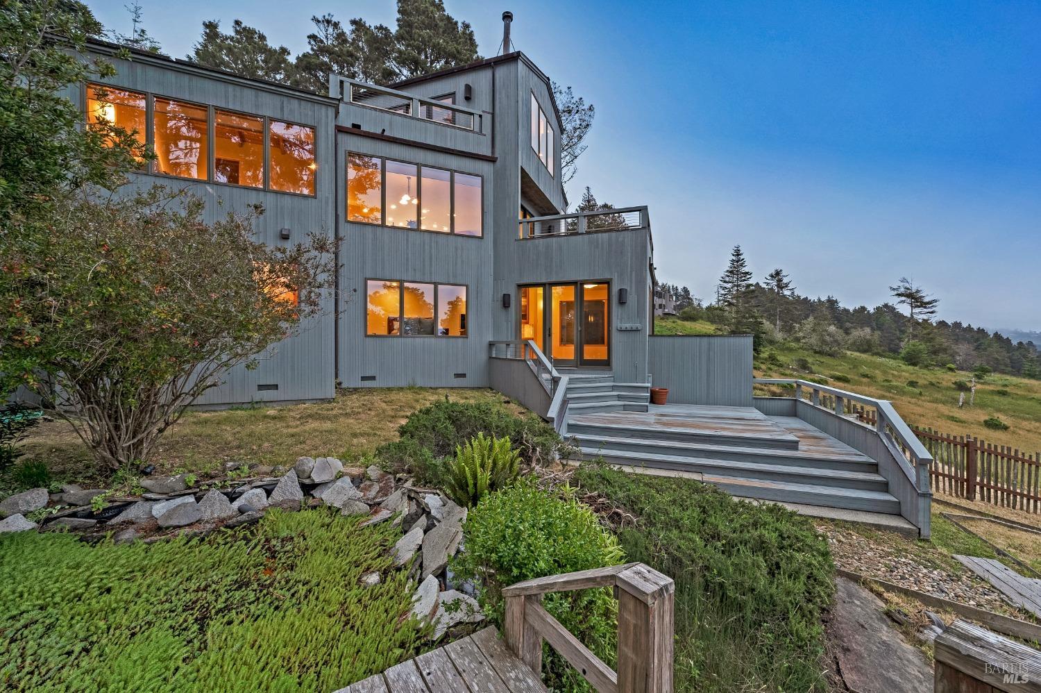You'll feel right at home as soon as you experience the open concept design of this lovely 3 bedroom, 3.5 bath custom designed hillside ocean-view home. Across the threshold, nice touches include wide plank hardwood flooring in the foyer, kitchen & living spaces. A home office with custom cabinets & a garden room or media room complete the main level with 2 guest suites. The upper level offers natural light & stylish fixtures in a neutral decor. Enjoy crackling fireplaces in the living room, primary bedroom, library & garden room that radiates a welcoming ambiance & contribute a couple of choice spots for warming up during winter. Delectable notions become aromatic realities in the elegant, spacious gourmet kitchen, with natural light, premium appliances of Viking, Subzero, Bosch & Thermador, two ovens & wine refrigerator! Custom cabinets topped with beautiful granite counters in an attractive island layout. The calm primary bedroom includes 2 walk-in closets & a private bath with tub & a curb less shower. The other two bedrooms, conveniently accessible from the main floor, are quiet & rich with ample closet space. On the top floor is the lookout room with great ocean views, a library wall & wet bar. Socializing on 1 of the 4 ipe hardwood decks is ideal for grilling or relaxing.