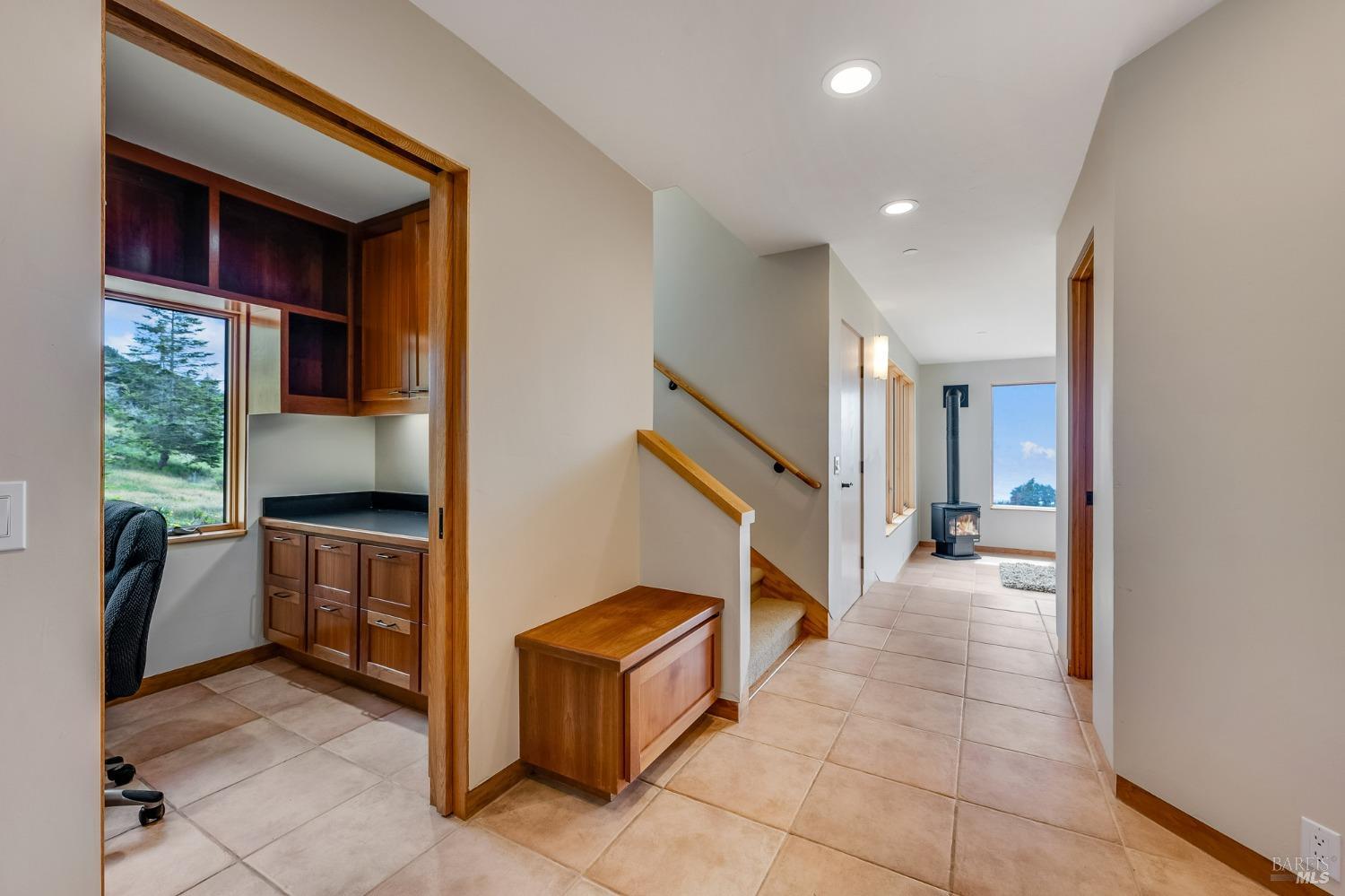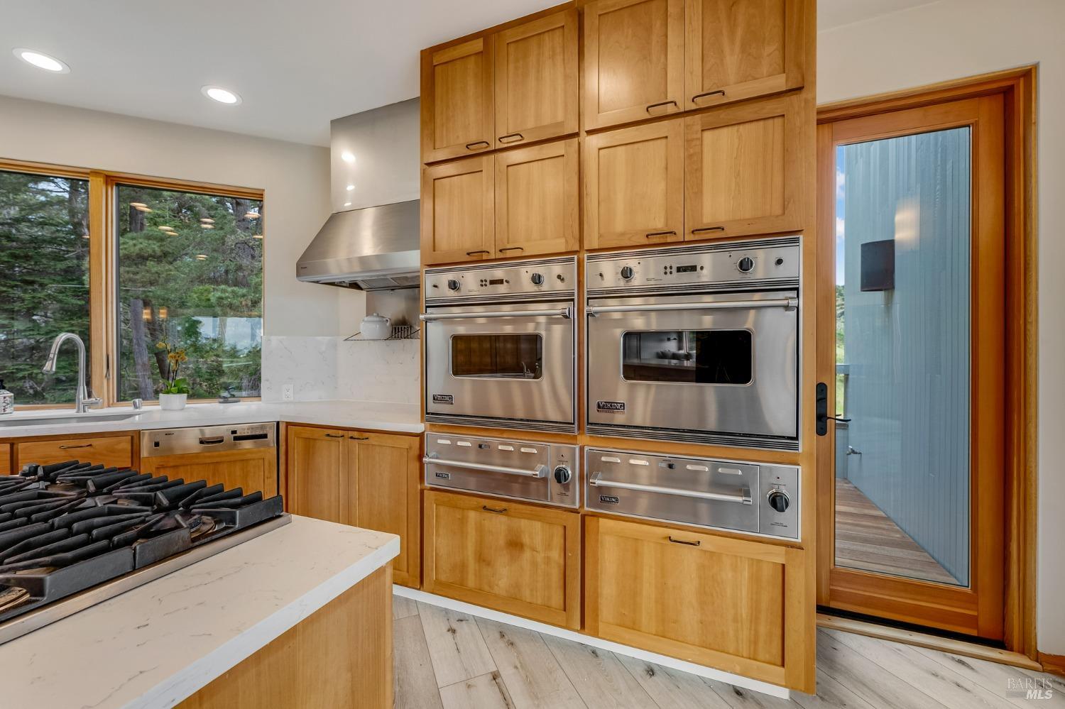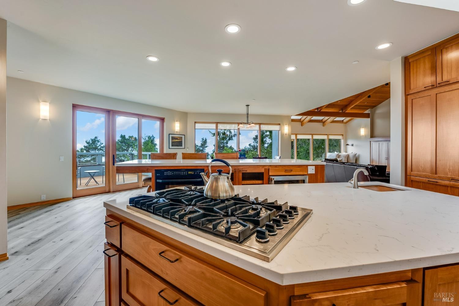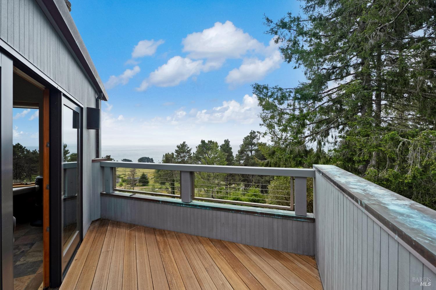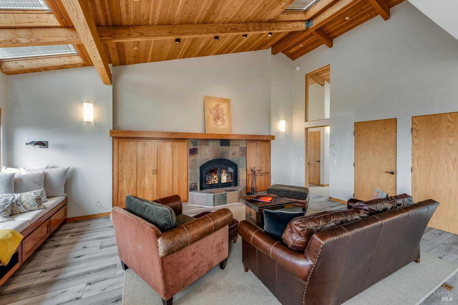 You'll feel right at home as soon as you experience the open concept design of this lovely 3 bedroom, 3.5 bath custom designed hillside ocean-view home. Across the threshold, nice touches include wide plank hardwood flooring in the foyer, kitchen & living spaces. A home office with custom cabinets & a garden room or media room complete the main level with 2 guest suites. The upper level offers natural light & stylish fixtures in a neutral decor. Enjoy crackling fireplaces in the living room, primary bedroom, library & garden room that radiates a welcoming ambiance & contribute a couple of choice spots for warming up during winter. Delectable notions become aromatic realities in the elegant, spacious gourmet kitchen, with natural light, premium appliances of Viking, Subzero, Bosch & Thermador, two ovens & wine refrigerator! Custom cabinets topped with beautiful granite counters in an attractive island layout. The calm primary bedroom includes 2 walk-in closets & a private bath with tub & a curb less shower. The other two bedrooms, conveniently accessible from the main floor, are quiet & rich with ample closet space. On the top floor is the lookout room with great ocean views, a library wall & wet bar. Socializing on 1 of the 4 ipe hardwood decks is ideal for grilling or relaxing.