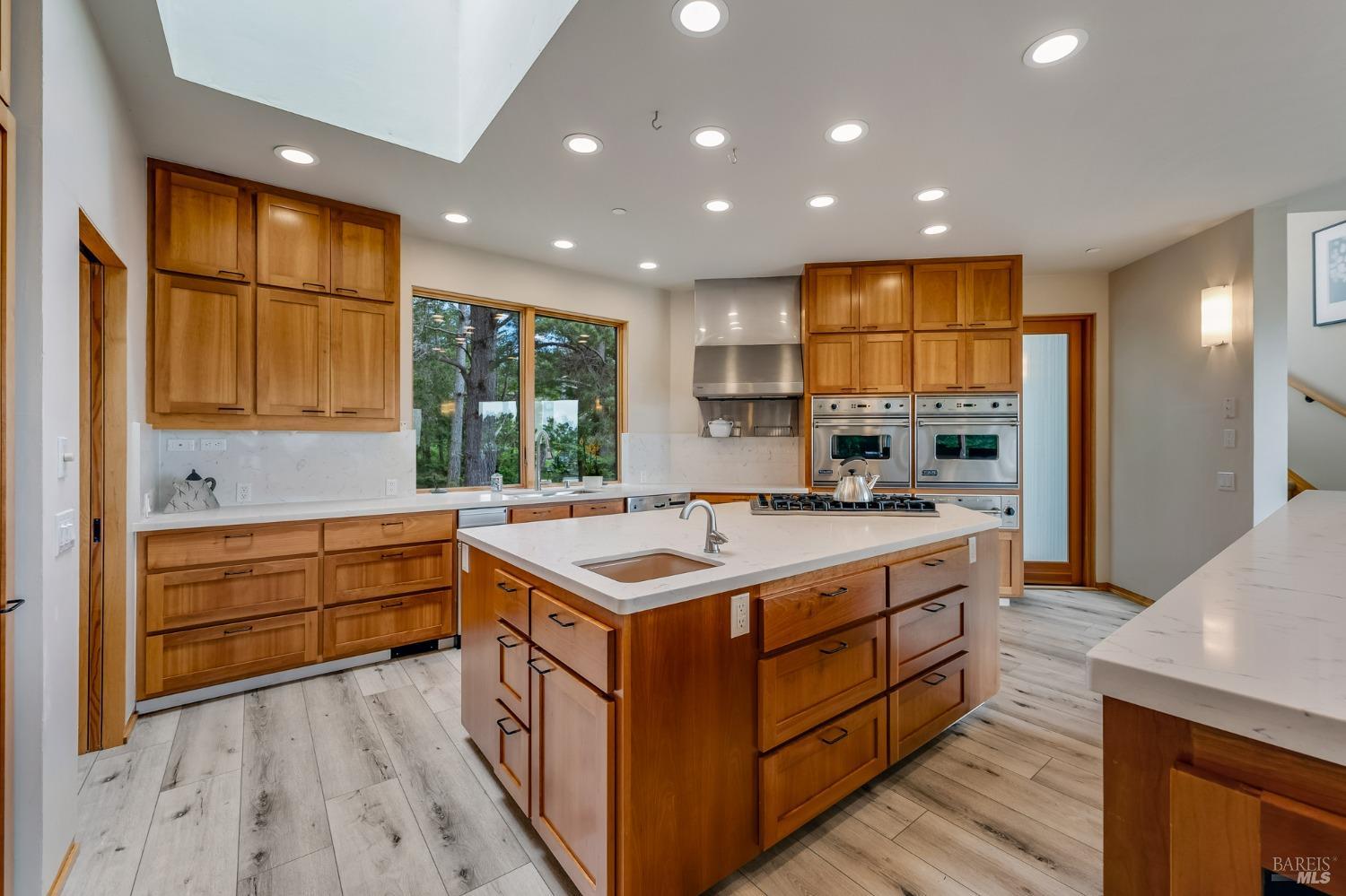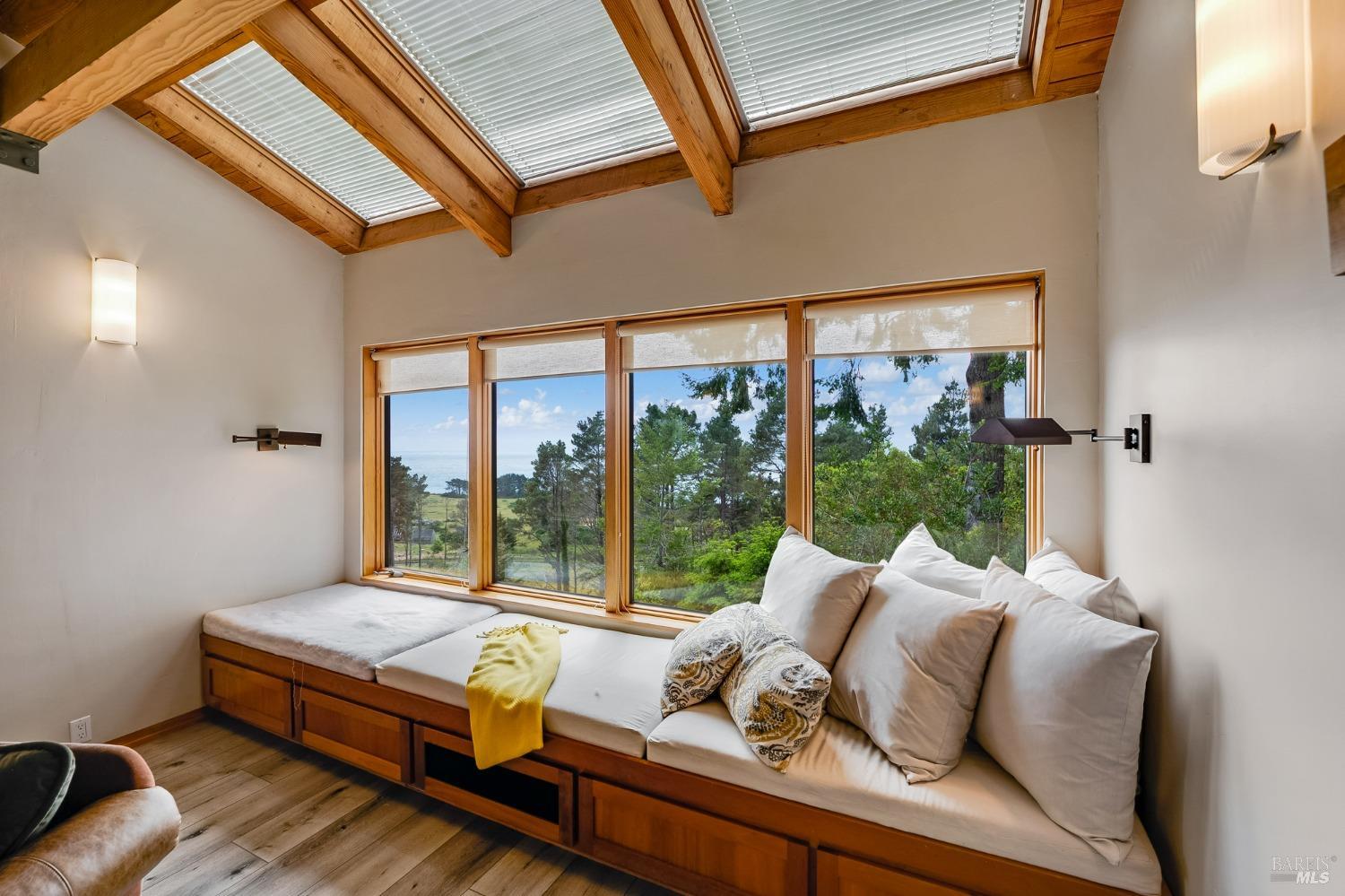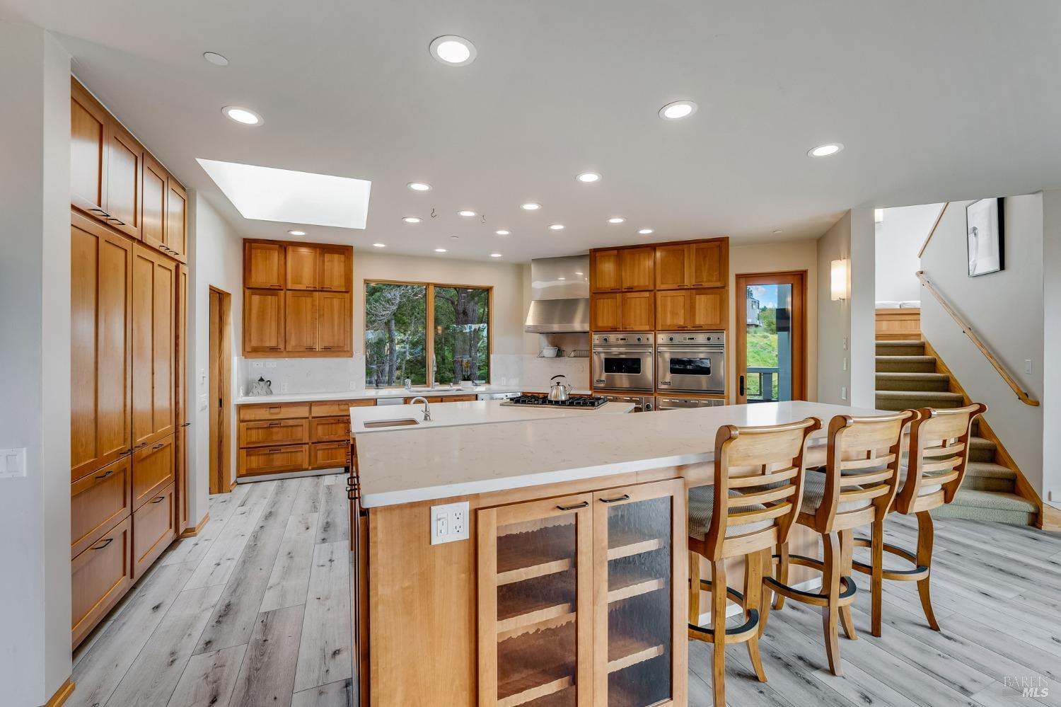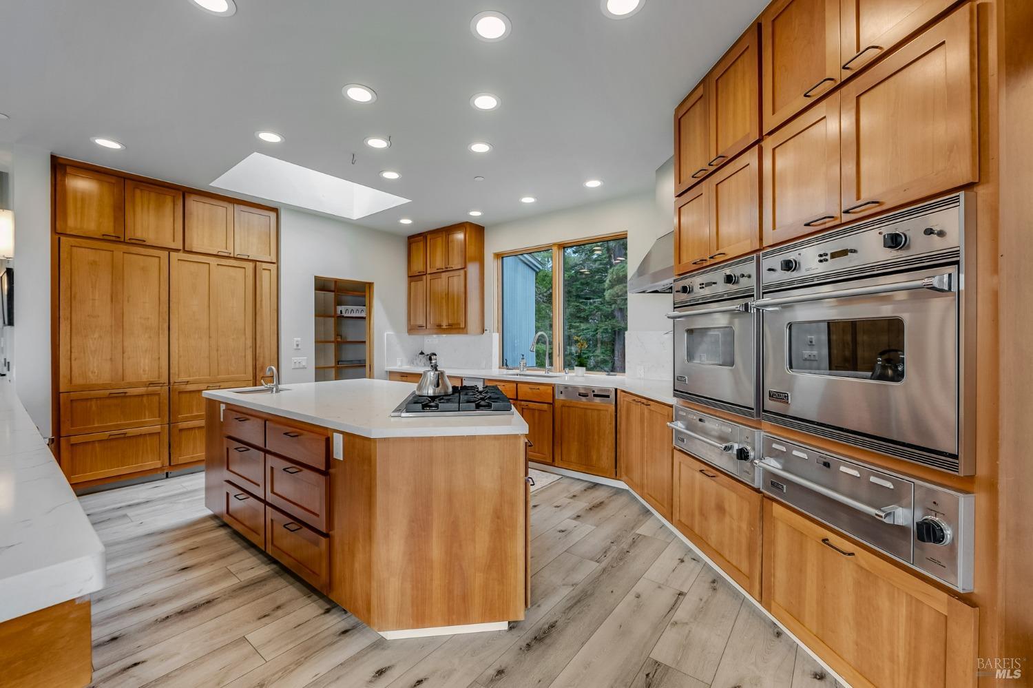 You'll feel right at home as soon as you experience the open concept design of this lovely 3 bedroom, 3.5 bath custom designed hillside ocean-view home. Across the threshold, nice touches include wide plank hardwood flooring in the foyer, kitchen & living spaces. A home office with custom cabinets & a garden room or media room complete the main level with 2 guest suites. The upper level offers natural light & stylish fixtures in a neutral decor. Enjoy crackling fireplaces in the living room, primary bedroom, library & garden room that radiates a welcoming ambiance & contribute a couple of choice spots for warming up during winter. Delectable notions become aromatic realities in the elegant, spacious gourmet kitchen, with natural light, premium appliances of Viking, Subzero, Bosch & Thermador, two ovens & wine refrigerator! Custom cabinets topped with beautiful granite counters in an attractive island layout. The calm primary bedroom includes 2 walk-in closets & a private bath with tub & a curb less shower. The other two bedrooms, conveniently accessible from the main floor, are quiet & rich with ample closet space. On the top floor is the lookout room with great ocean views, a library wall & wet bar. Socializing on 1 of the 4 ipe hardwood decks is ideal for grilling or relaxing.