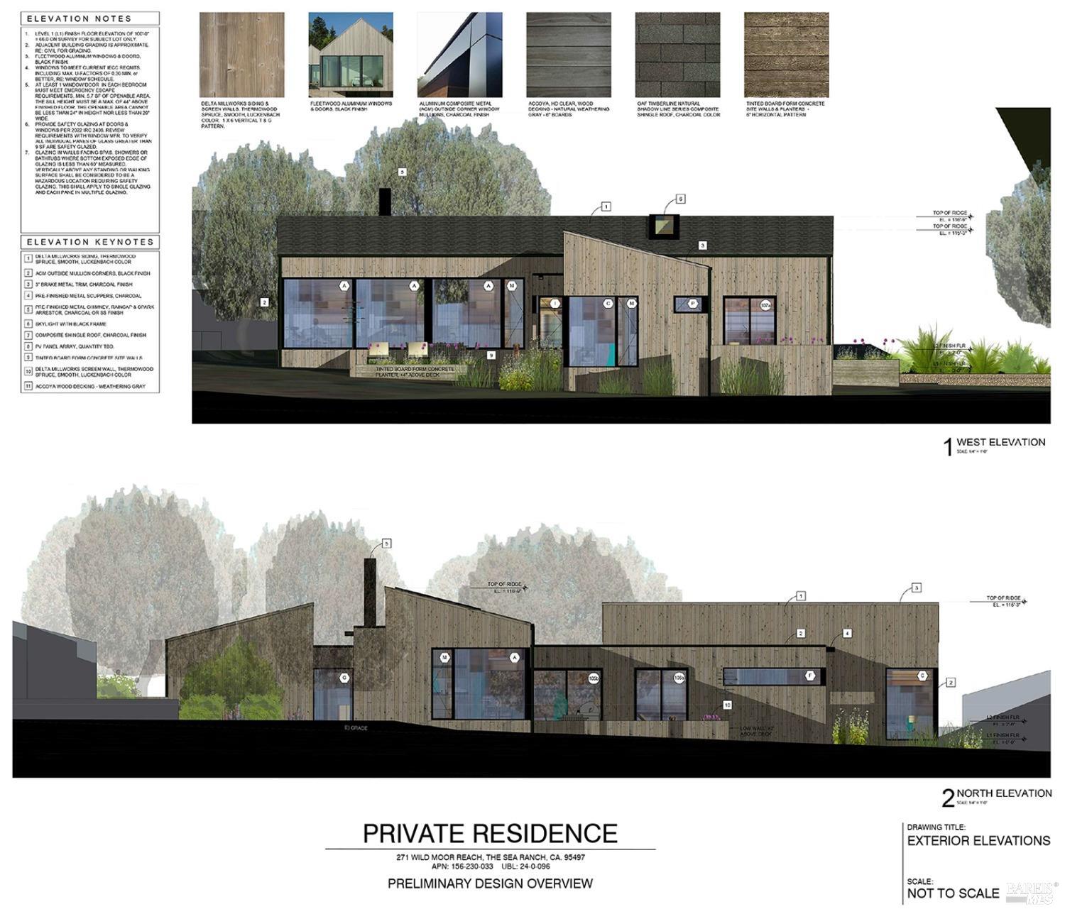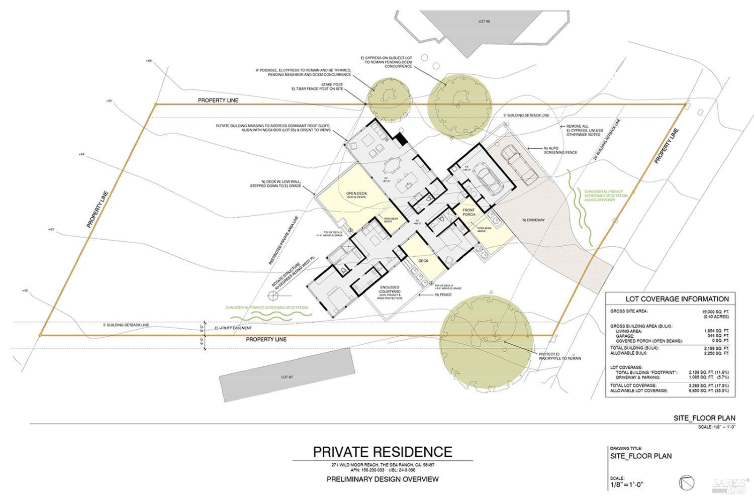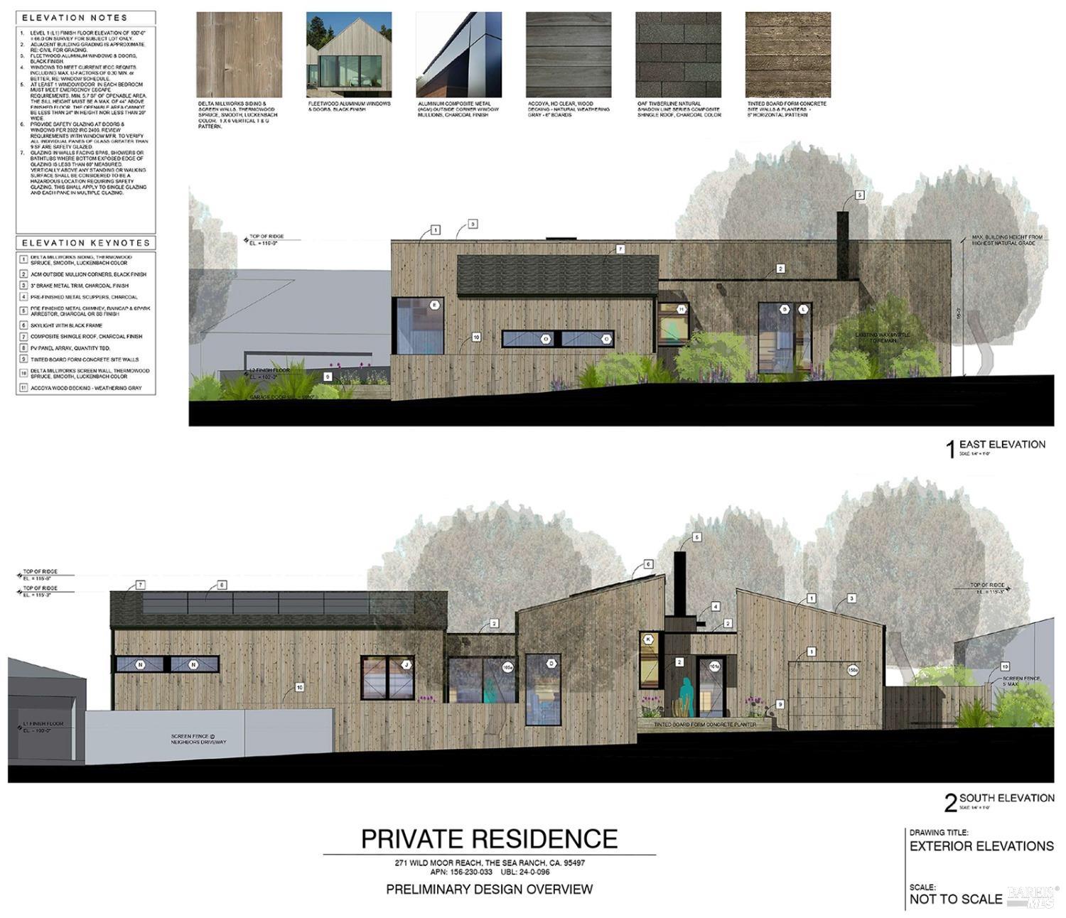This is your chance to build a stunning home on a sunny 0.43 acre lot located just steps from the bluff trail and breathtaking Shell Beach and Seal Rookery. Plans with preliminary approval by the Sea Ranch Design Committee are included for the design comprised of three shed roof parts connected by glass transitions and oriented to take full advantage of sweeping ocean, meadow and hillside views. Full height, corner windows blur the lines between inside and outside. The central feature of the 1854 sqft home is the open concept Kitchen / Dining / Great Room - lifted to enhance the unobstructed ocean views and anchored with a Morso fireplace. The extensive terrace facing the meadow provides a quiet respite to view wildlife and stunning sunsets. A private owner's suite, guest suite, flex room and single-car garage complete the design. Del Mar Rec Center to the north and Ohlson Rec Center to the south offer heated pools, tennis, sauna and more. One-Eyed Jack's playground and picnic area is just a short walk away. You are surrounded by nature and over 50 miles of trails throughout Sea Ranch that take you to the redwood forest, the river and the bluff. Even a private airstrip is amongst the amenities for HOA members. Utilities including fiber optic internet are underground.