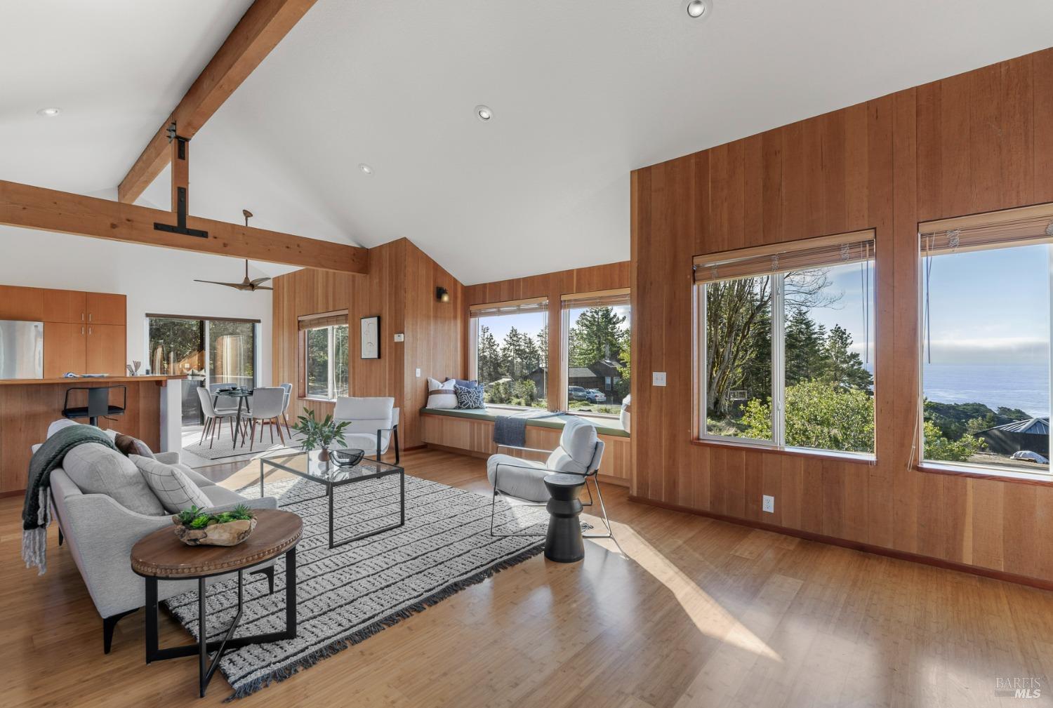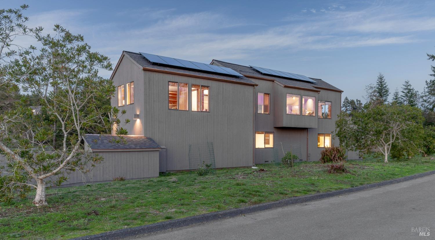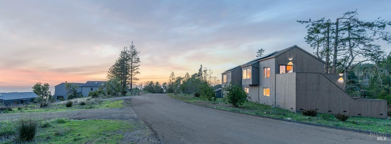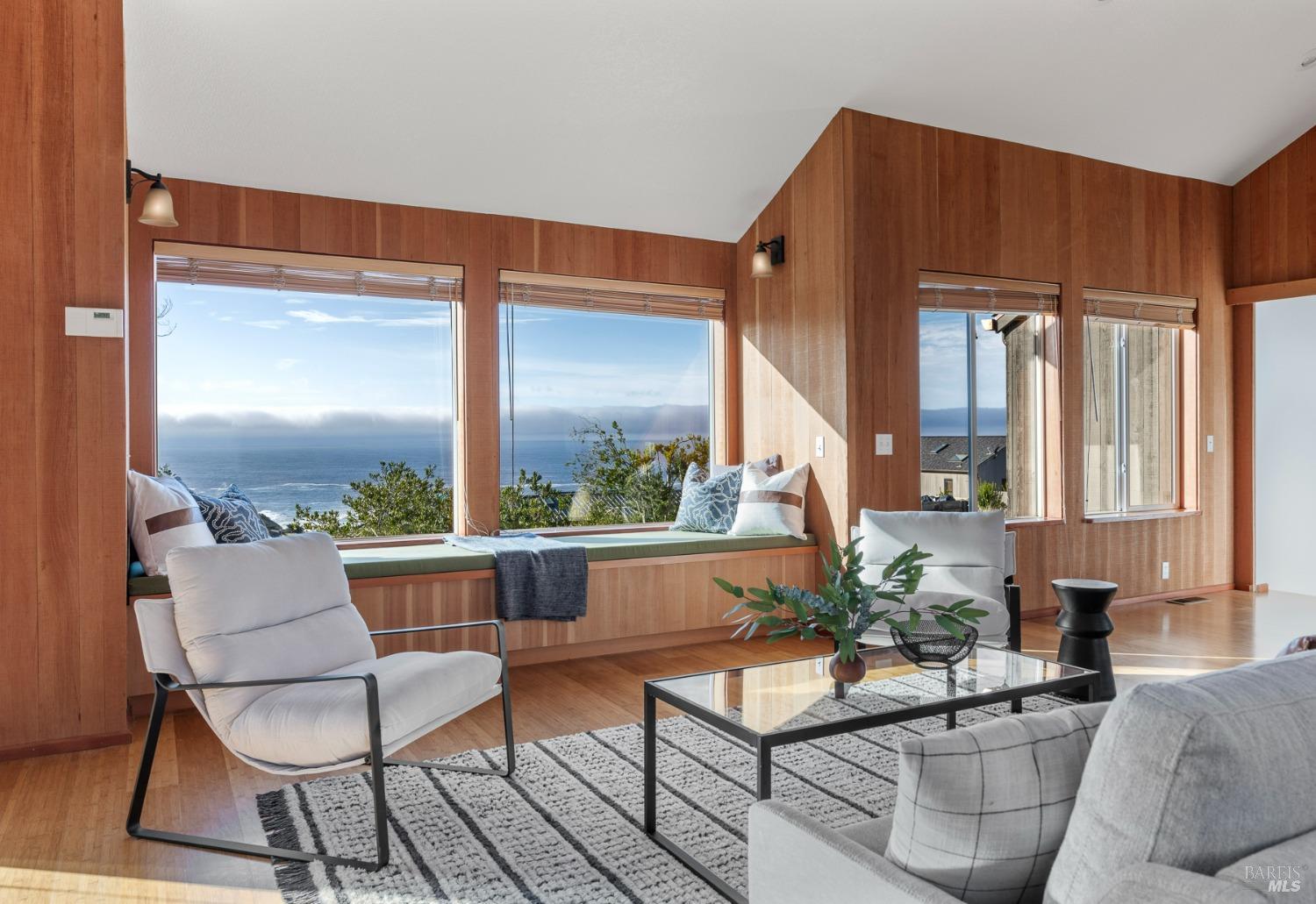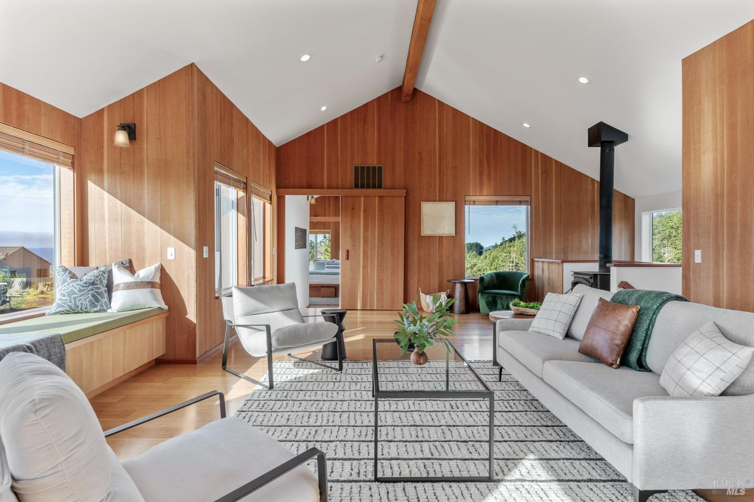 Welcome to 275 Pilot's Reach on the sunny, Sea Ranch hillside with a panoramic view of the ocean and hillside from the 2nd-floor great room, deck and primary bedroom suite w. office. A modern barn design by Architect Dan Levin and built by local contractor Tom Falk in year 2000. The interior finish is freshly painted sheetrock and warm VG fir wood paneling. The large gourmet kitchen features granite counters, newer stainless steel appliances, electric range, and views in every direction. This is a great fulltime home with 3 bedrooms and 3 full bathrooms. Large decks on 2-levels off the kitchen and dining room area with access to half an acre of property ready for your dream landscaping. Many recent 2024 upgrades incl. 50-year roof, solar panels, EV-charger, backup power, copper gutters, sheds + new power wash and exterior stain. A trail leads to a Sea Ranch favorite Pebble Beach in 10 minutes. The locals lap the Sea Ranch airstrip for an afternoon walk of 1.8 Miles or stroll to the business center with weekend Wine Shop and Shindig Art Cafe + professional offices. This house comes with all The Sea Ranch has to offer from the private airstrip, to 60 miles of private trails and roads, 3 recreation facilities and lots of open space. This is a property you must see to appreciate!