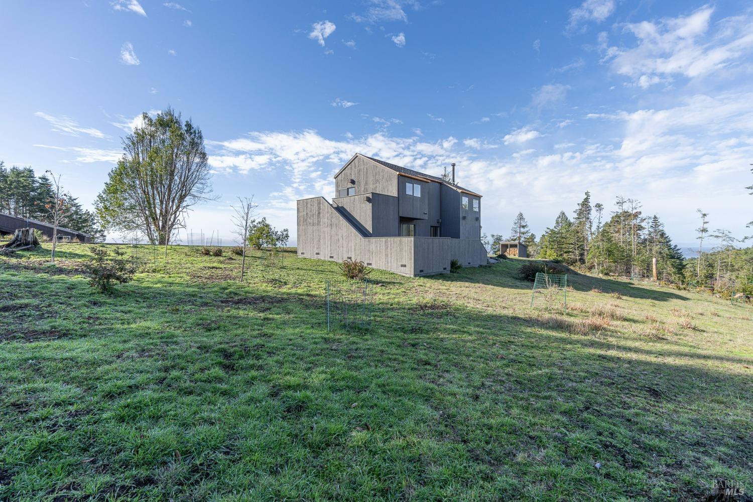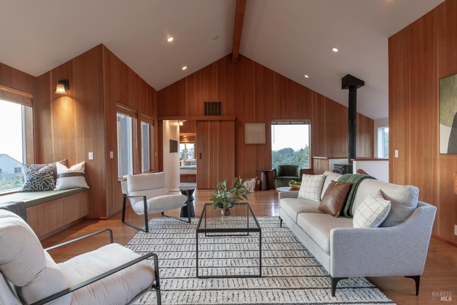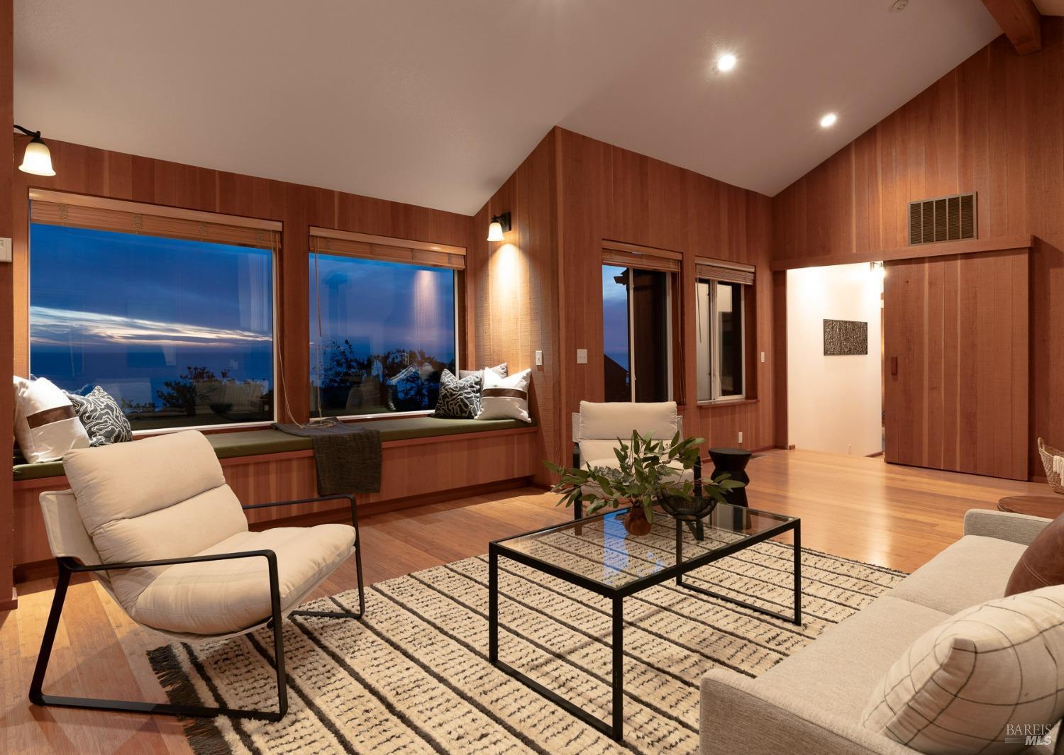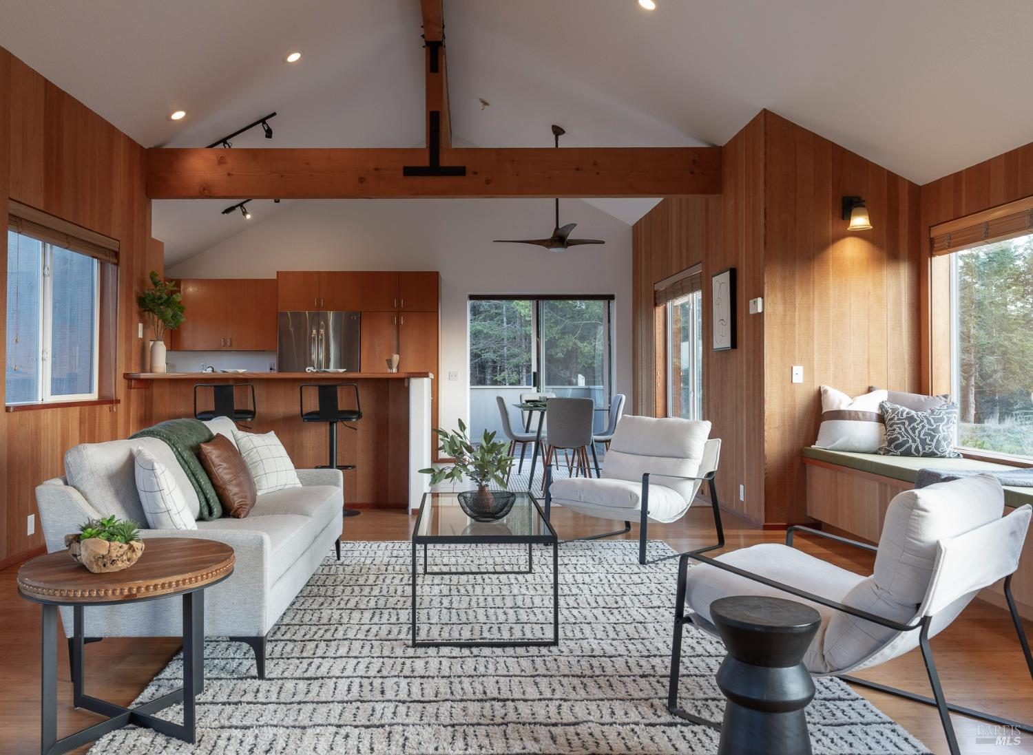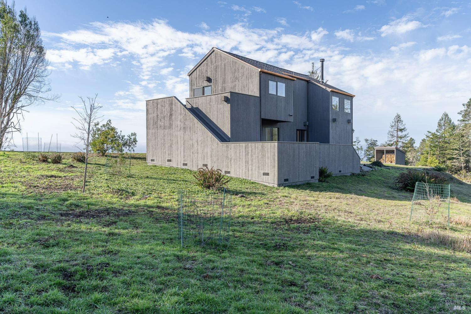 Welcome to 275 Pilot's Reach on the sunny, Sea Ranch hillside with a panoramic view of the ocean and hillside from the 2nd-floor great room, deck and primary bedroom suite w. office. A modern barn design by Architect Dan Levin and built by local contractor Tom Falk in year 2000. The interior finish is freshly painted sheetrock and warm VG fir wood paneling. The large gourmet kitchen features granite counters, newer stainless steel appliances, electric range, and views in every direction. This is a great fulltime home with 3 bedrooms and 3 full bathrooms. Large decks on 2-levels off the kitchen and dining room area with access to half an acre of property ready for your dream landscaping. Many recent 2024 upgrades incl. 50-year roof, solar panels, EV-charger, backup power, copper gutters, sheds + new power wash and exterior stain. A trail leads to a Sea Ranch favorite Pebble Beach in 10 minutes. The locals lap the Sea Ranch airstrip for an afternoon walk of 1.8 Miles or stroll to the business center with weekend Wine Shop and Shindig Art Cafe + professional offices. This house comes with all The Sea Ranch has to offer from the private airstrip, to 60 miles of private trails and roads, 3 recreation facilities and lots of open space. This is a property you must see to appreciate!