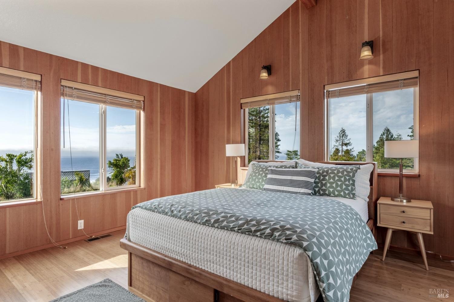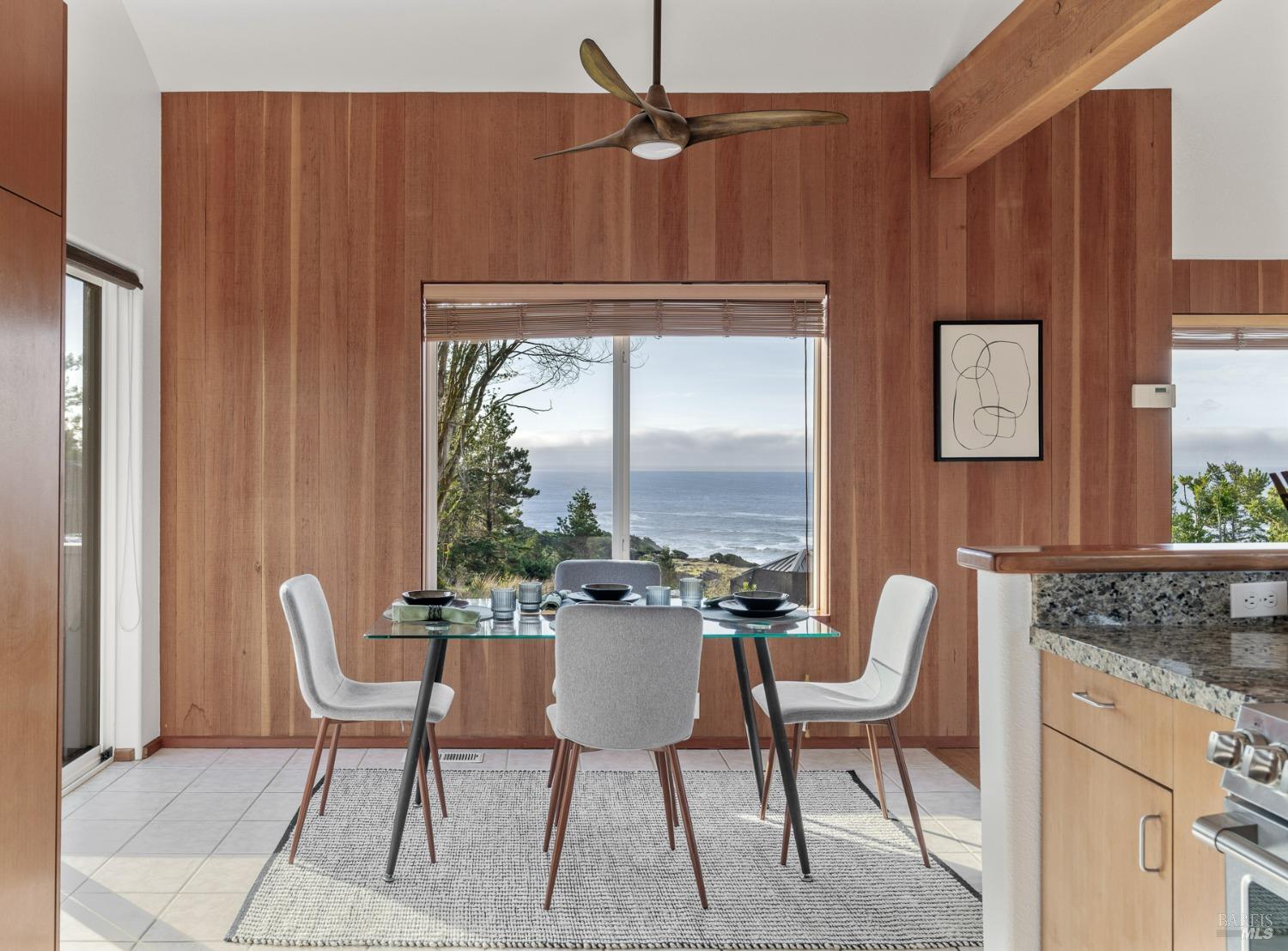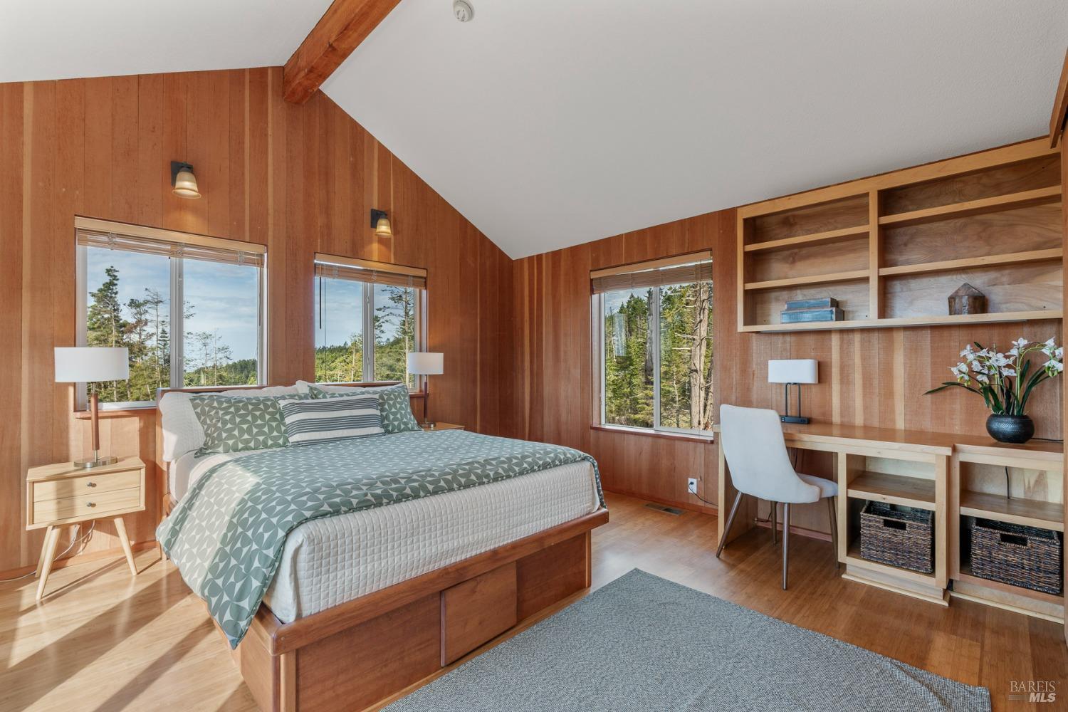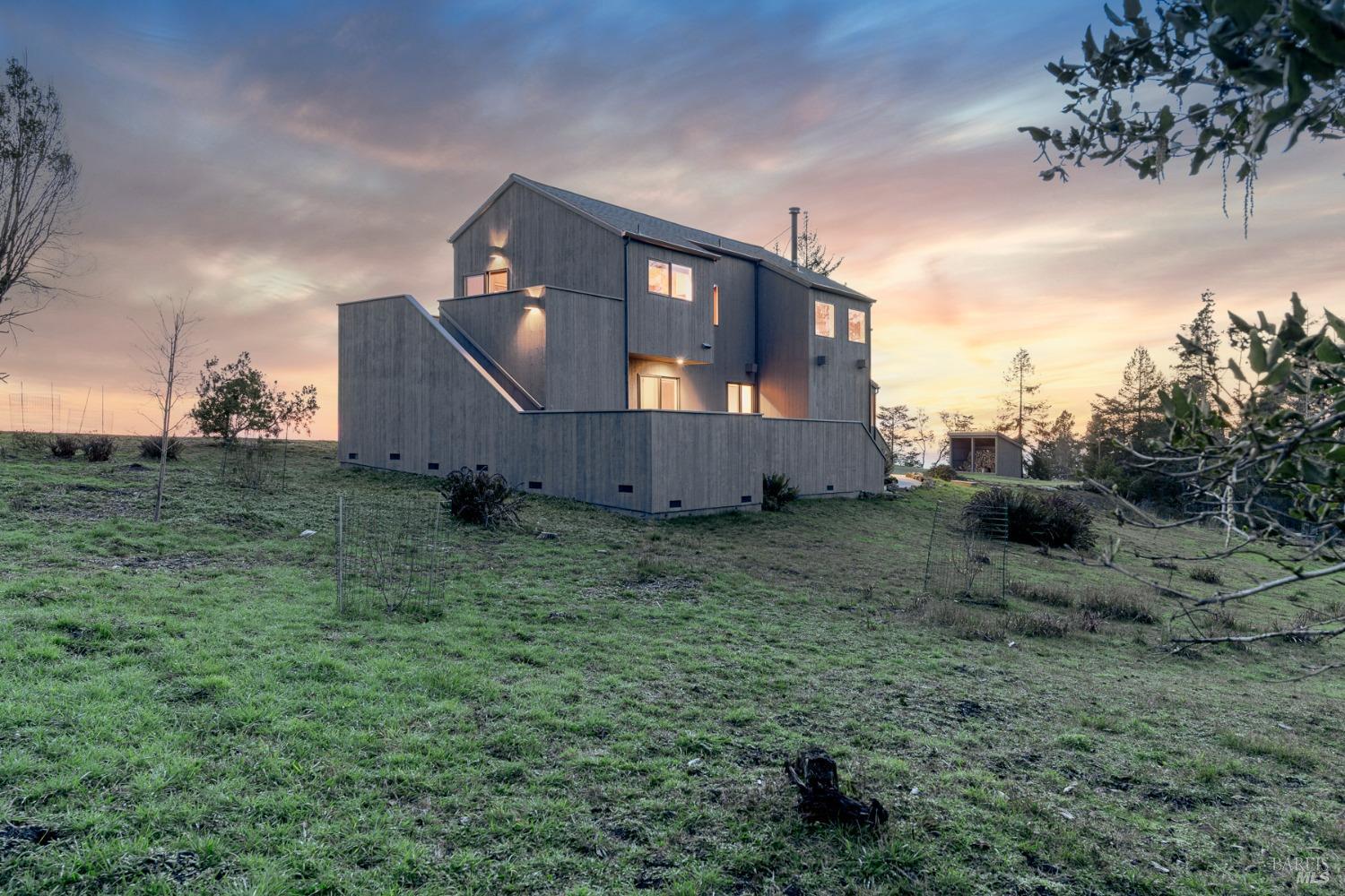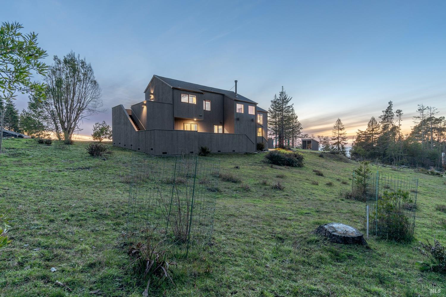 Welcome to 275 Pilot's Reach on the sunny, Sea Ranch hillside with a panoramic view of the ocean and hillside from the 2nd-floor great room, deck and primary bedroom suite w. office. A modern barn design by Architect Dan Levin and built by local contractor Tom Falk in year 2000. The interior finish is freshly painted sheetrock and warm VG fir wood paneling. The large gourmet kitchen features granite counters, newer stainless steel appliances, electric range, and views in every direction. This is a great fulltime home with 3 bedrooms and 3 full bathrooms. Large decks on 2-levels off the kitchen and dining room area with access to half an acre of property ready for your dream landscaping. Many recent 2024 upgrades incl. 50-year roof, solar panels, EV-charger, backup power, copper gutters, sheds + new power wash and exterior stain. A trail leads to a Sea Ranch favorite Pebble Beach in 10 minutes. The locals lap the Sea Ranch airstrip for an afternoon walk of 1.8 Miles or stroll to the business center with weekend Wine Shop and Shindig Art Cafe + professional offices. This house comes with all The Sea Ranch has to offer from the private airstrip, to 60 miles of private trails and roads, 3 recreation facilities and lots of open space. This is a property you must see to appreciate!