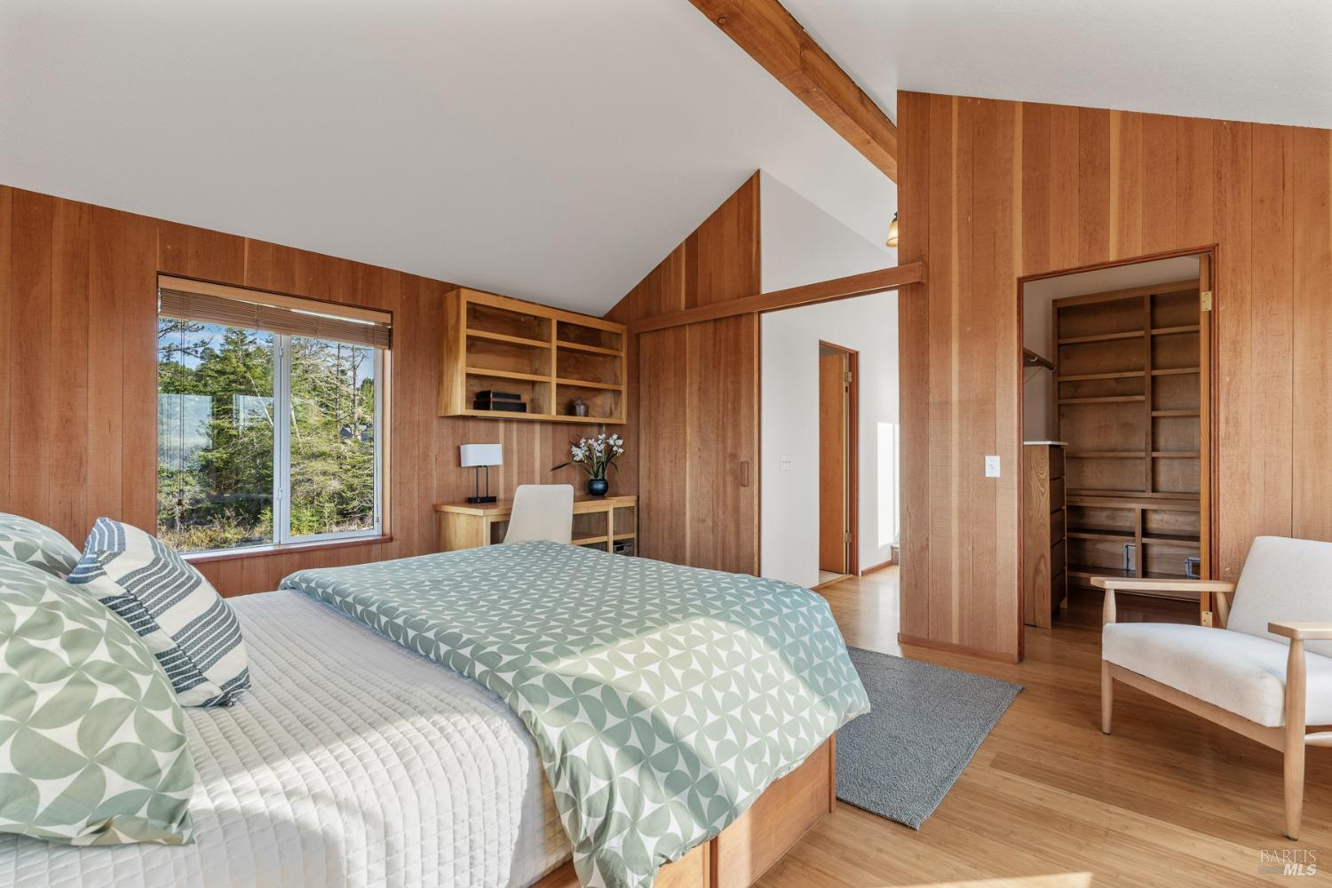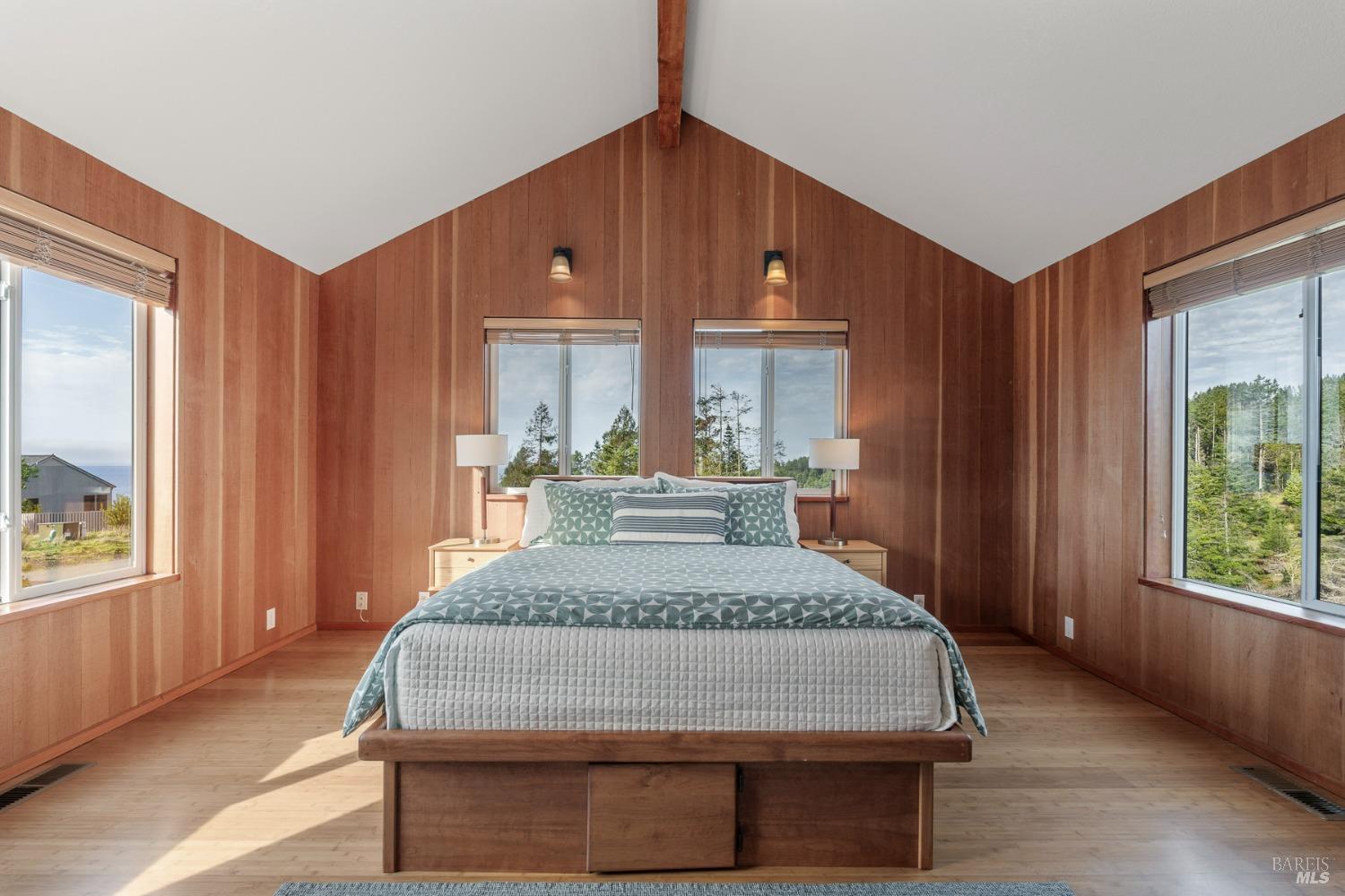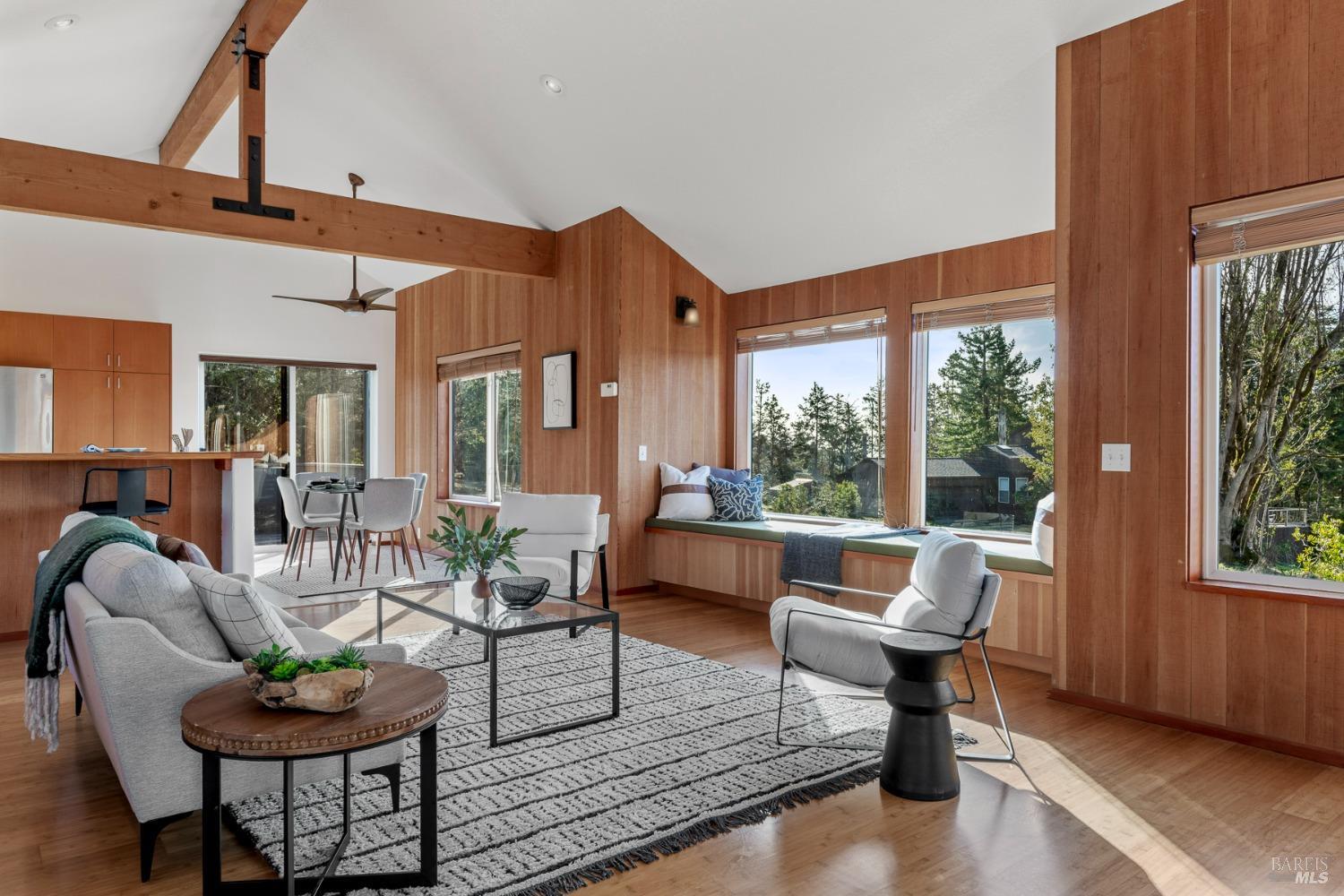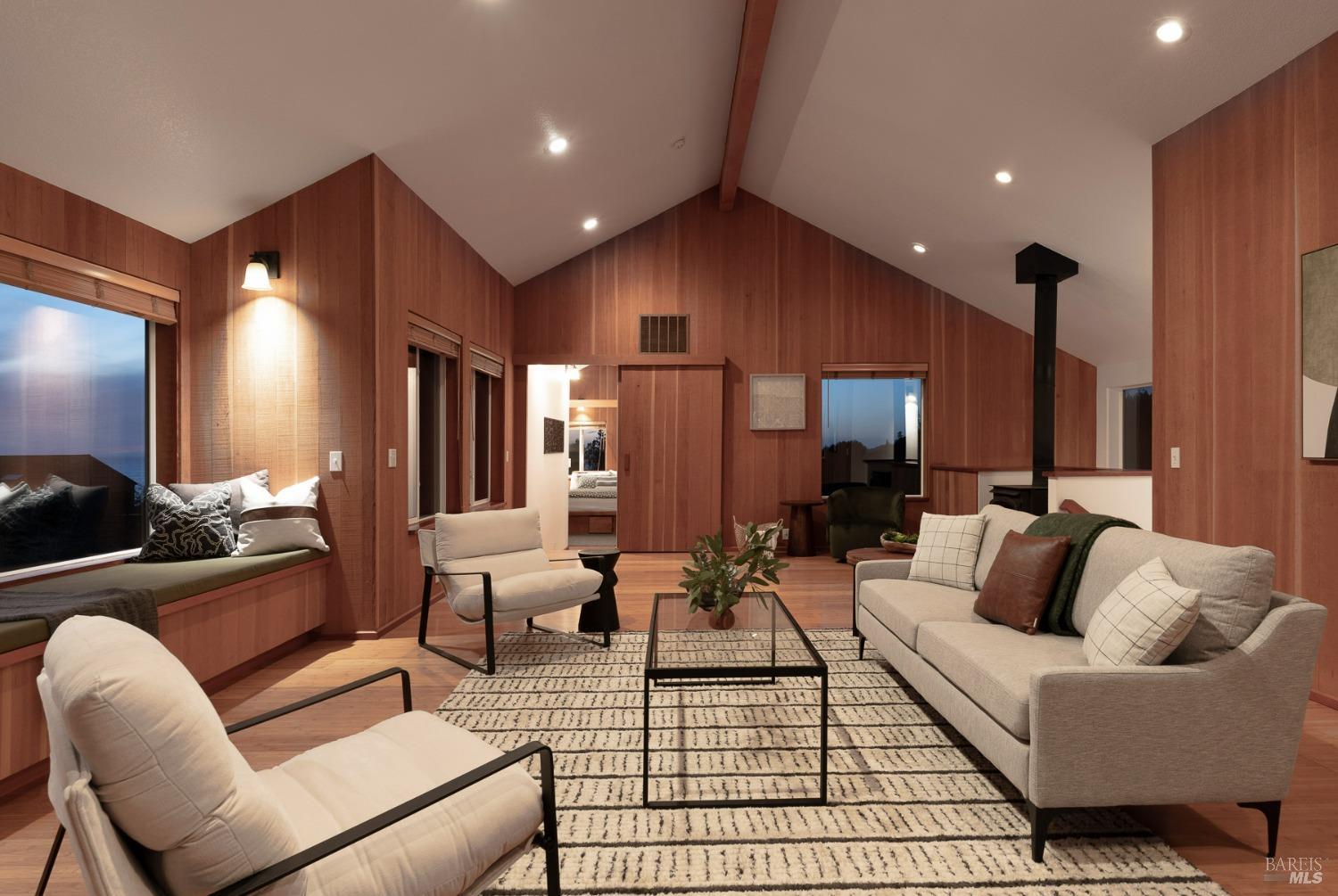 Welcome to 275 Pilot's Reach on the sunny, Sea Ranch hillside with a panoramic view of the ocean and hillside from the 2nd-floor great room, deck and primary bedroom suite w. office. A modern barn design by Architect Dan Levin and built by local contractor Tom Falk in year 2000. The interior finish is freshly painted sheetrock and warm VG fir wood paneling. The large gourmet kitchen features granite counters, newer stainless steel appliances, electric range, and views in every direction. This is a great fulltime home with 3 bedrooms and 3 full bathrooms. Large decks on 2-levels off the kitchen and dining room area with access to half an acre of property ready for your dream landscaping. Many recent 2024 upgrades incl. 50-year roof, solar panels, EV-charger, backup power, copper gutters, sheds + new power wash and exterior stain. A trail leads to a Sea Ranch favorite Pebble Beach in 10 minutes. The locals lap the Sea Ranch airstrip for an afternoon walk of 1.8 Miles or stroll to the business center with weekend Wine Shop and Shindig Art Cafe + professional offices. This house comes with all The Sea Ranch has to offer from the private airstrip, to 60 miles of private trails and roads, 3 recreation facilities and lots of open space. This is a property you must see to appreciate!