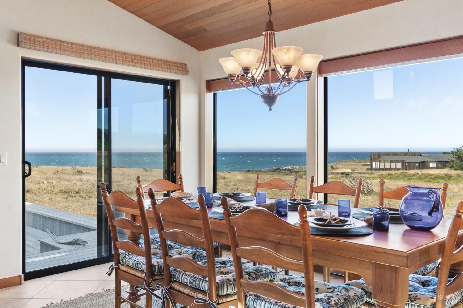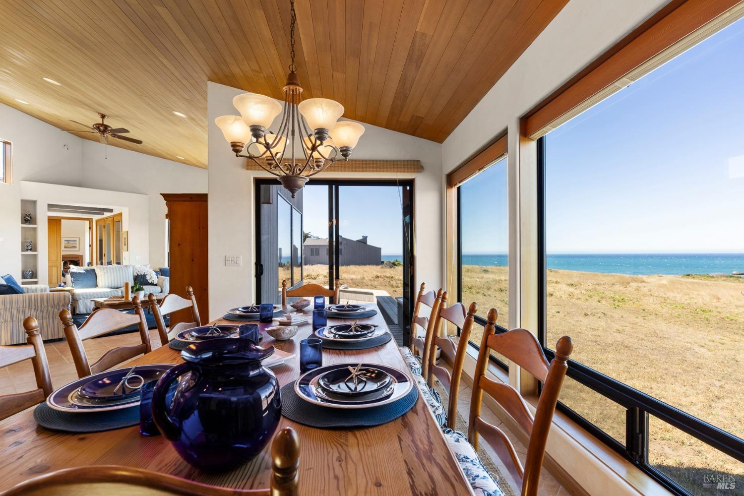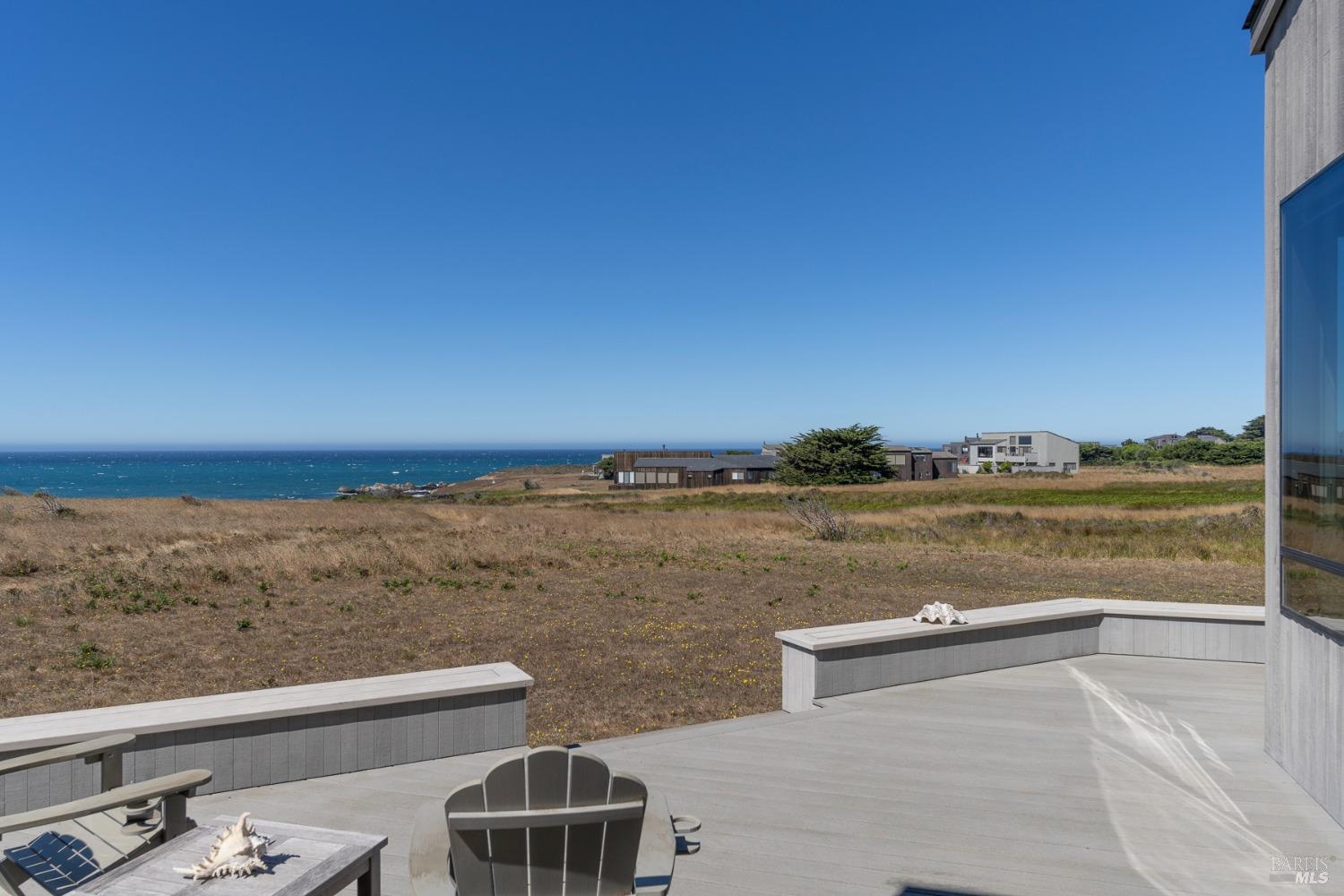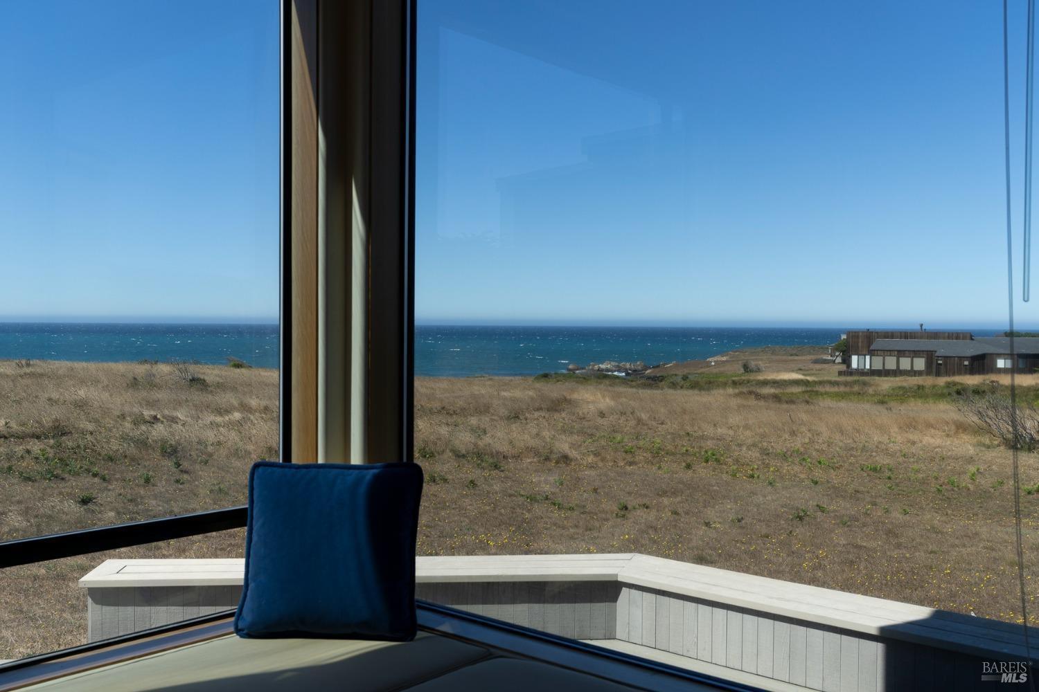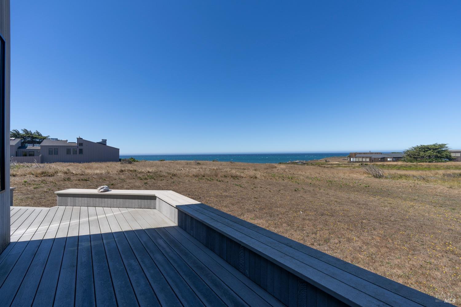This elegant, 3 bed/3 bath one-level custom home with dramatic ocean views just steps from the bluff, is on the market for the first time. Entering the private courtyard your eyes are drawn to the ocean view through the glass doors of the hallway, connecting the spacious primary suite with fireplace and hot tub deck on one side and the light filled great room on the other. The incredible white water views follow you throughout the vast living/dining/kitchen area lined by huge windows and opening up to the large ocean facing deck. A separate wing includes 2 guest bedrooms, baths, laundry room and access to the 2-car garage. Steve Carreiro designed and built this dream home for the owners in 2002 with exceptional craftsmanship. They created the perfect place to cook for family and friends in the open gourmet kitchen and enjoy quiet moments snuggled up on the window seats admiring the glorious views of the ocean and sky, whales and seals and other wildlife in the wide open meadow. The house is on sewer, near the Golf Links and Del Mar Rec Center with pool, sauna and tennis and you have 55+ miles of private trails connecting beaches and magnificent redwoods. Whether you enjoy the sunset or hike the trails, you will be captivated by the peace and quiet of this magical place.