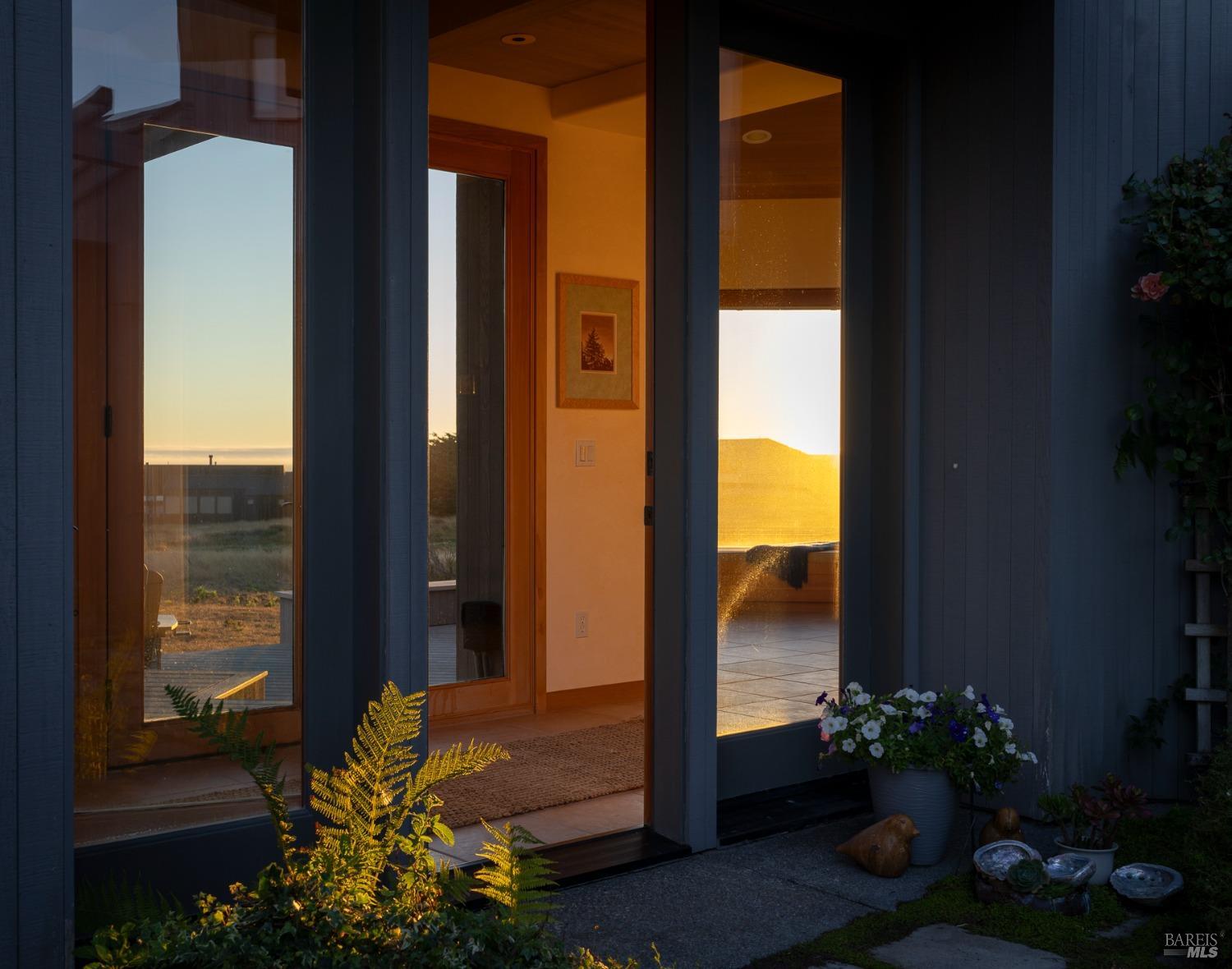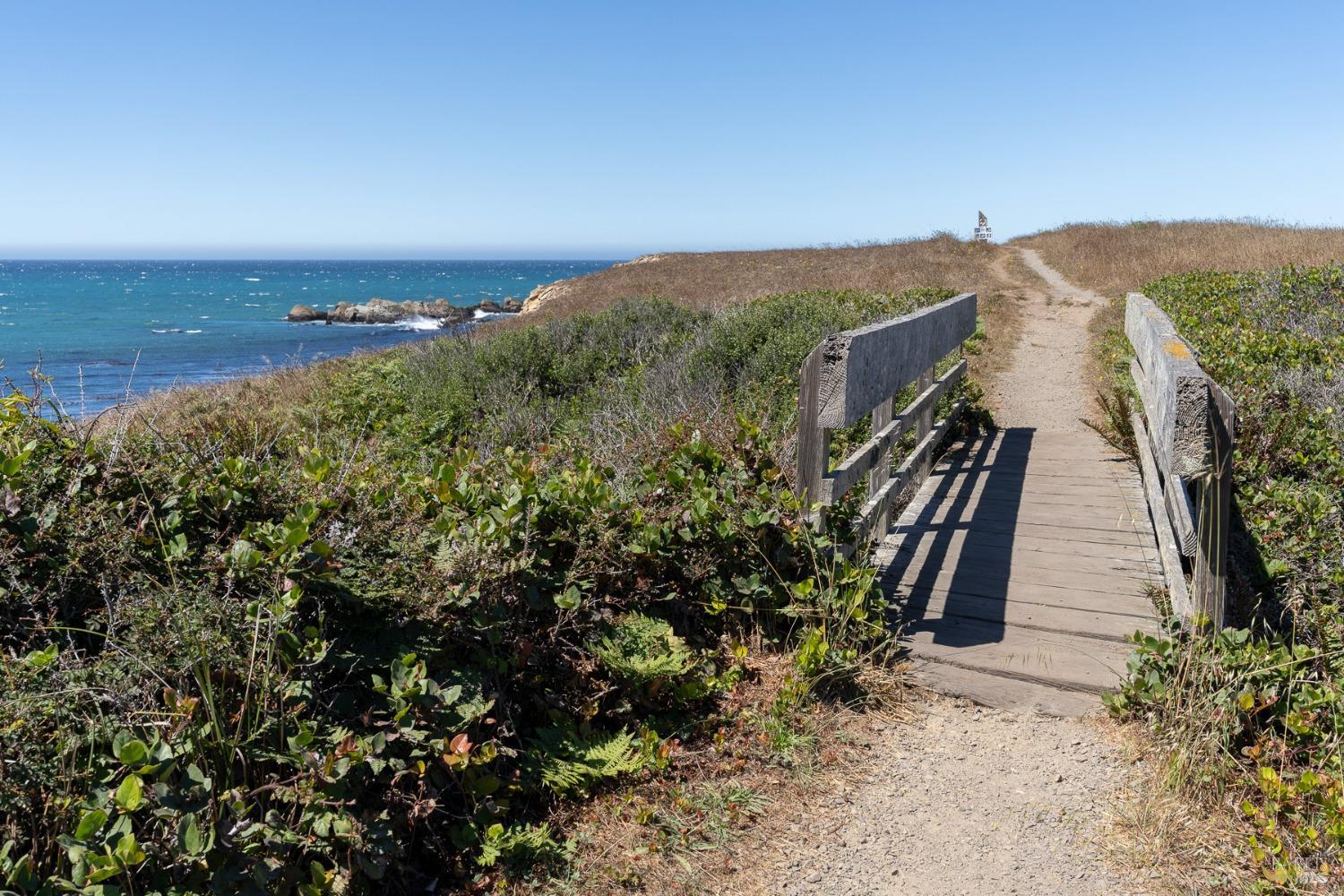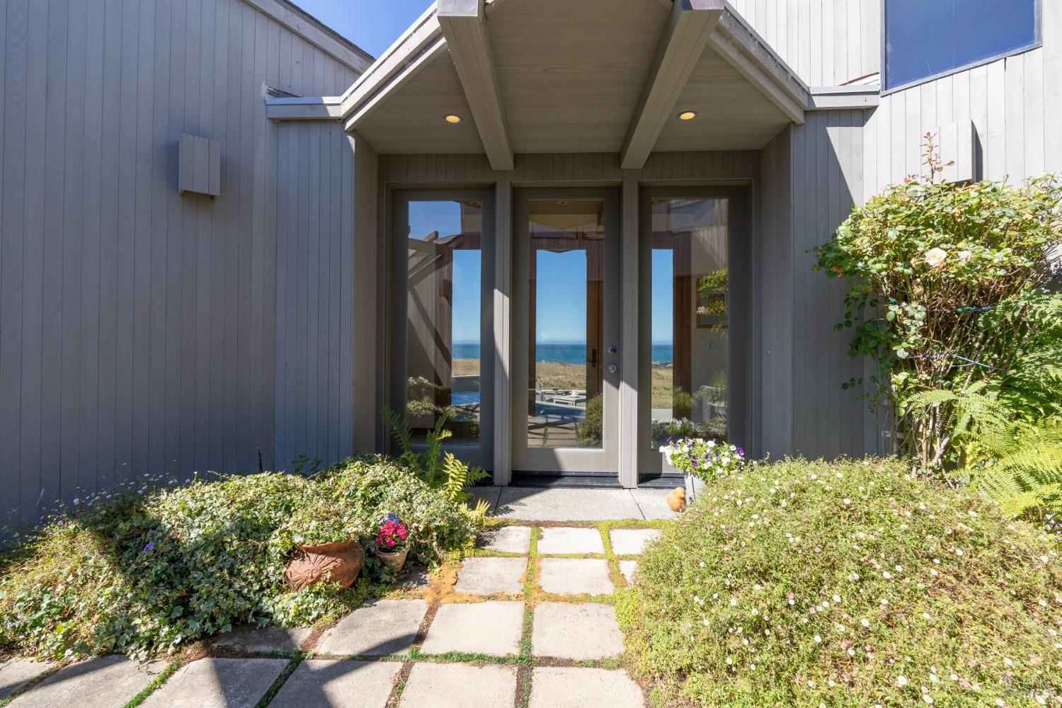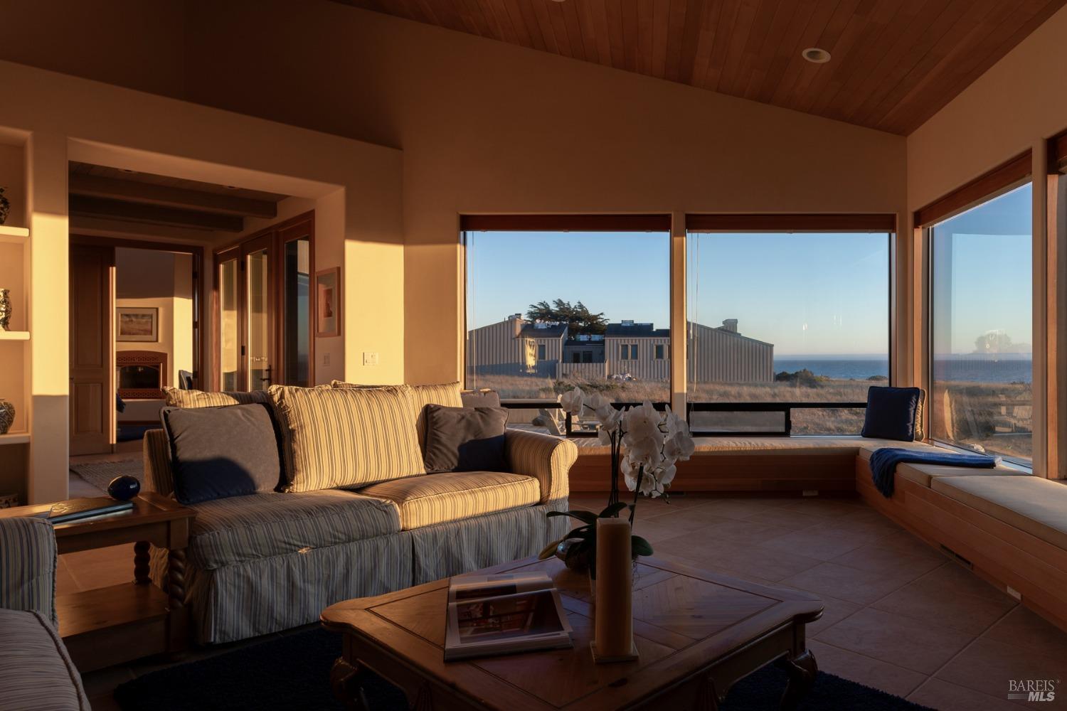 This elegant, 3 bed/3 bath one-level custom home with dramatic ocean views just steps from the bluff, is on the market for the first time. Entering the private courtyard your eyes are drawn to the ocean view through the glass doors of the hallway, connecting the spacious primary suite with fireplace and hot tub deck on one side and the light filled great room on the other. The incredible white water views follow you throughout the vast living/dining/kitchen area lined by huge windows and opening up to the large ocean facing deck. A separate wing includes 2 guest bedrooms, baths, laundry room and access to the 2-car garage. Steve Carreiro designed and built this dream home for the owners in 2002 with exceptional craftsmanship. They created the perfect place to cook for family and friends in the open gourmet kitchen and enjoy quiet moments snuggled up on the window seats admiring the glorious views of the ocean and sky, whales and seals and other wildlife in the wide open meadow. The house is on sewer, near the Golf Links and Del Mar Rec Center with pool, sauna and tennis and you have 55+ miles of private trails connecting beaches and magnificent redwoods. Whether you enjoy the sunset or hike the trails, you will be captivated by the peace and quiet of this magical place.