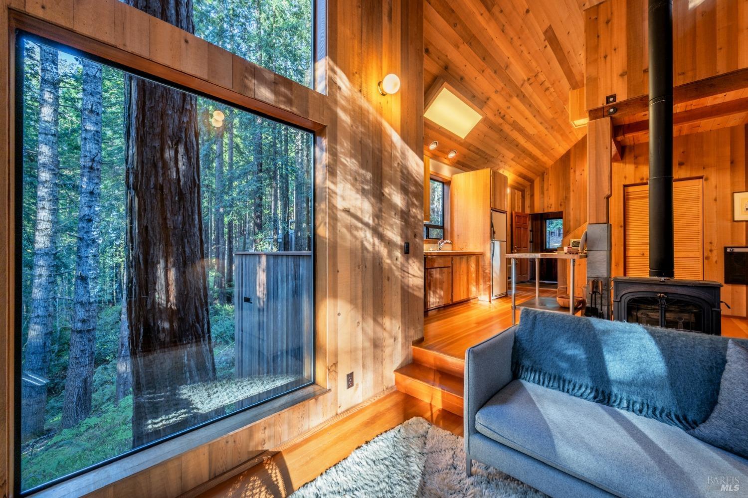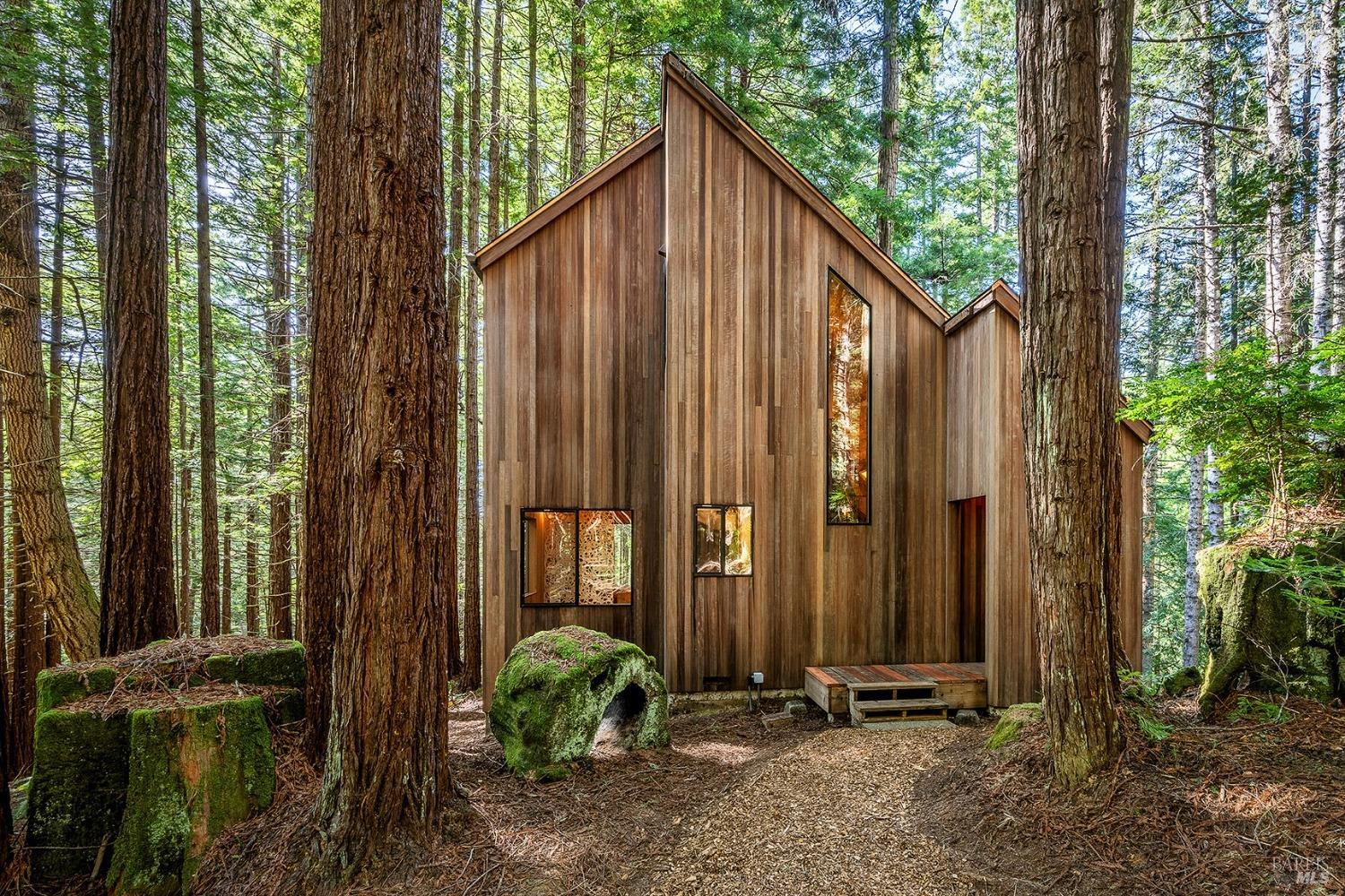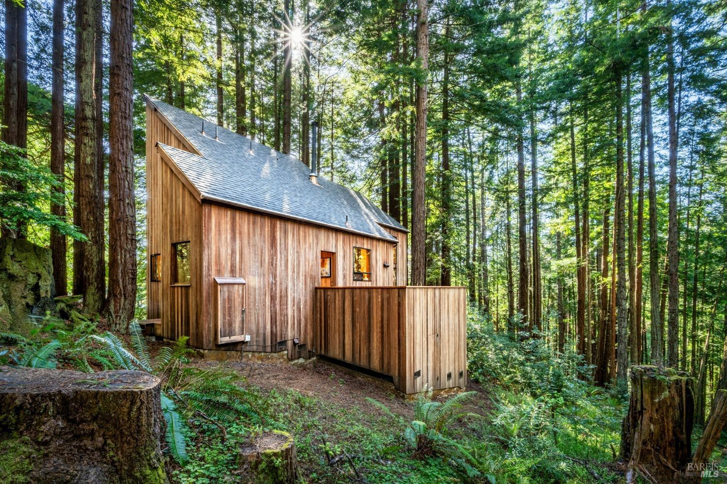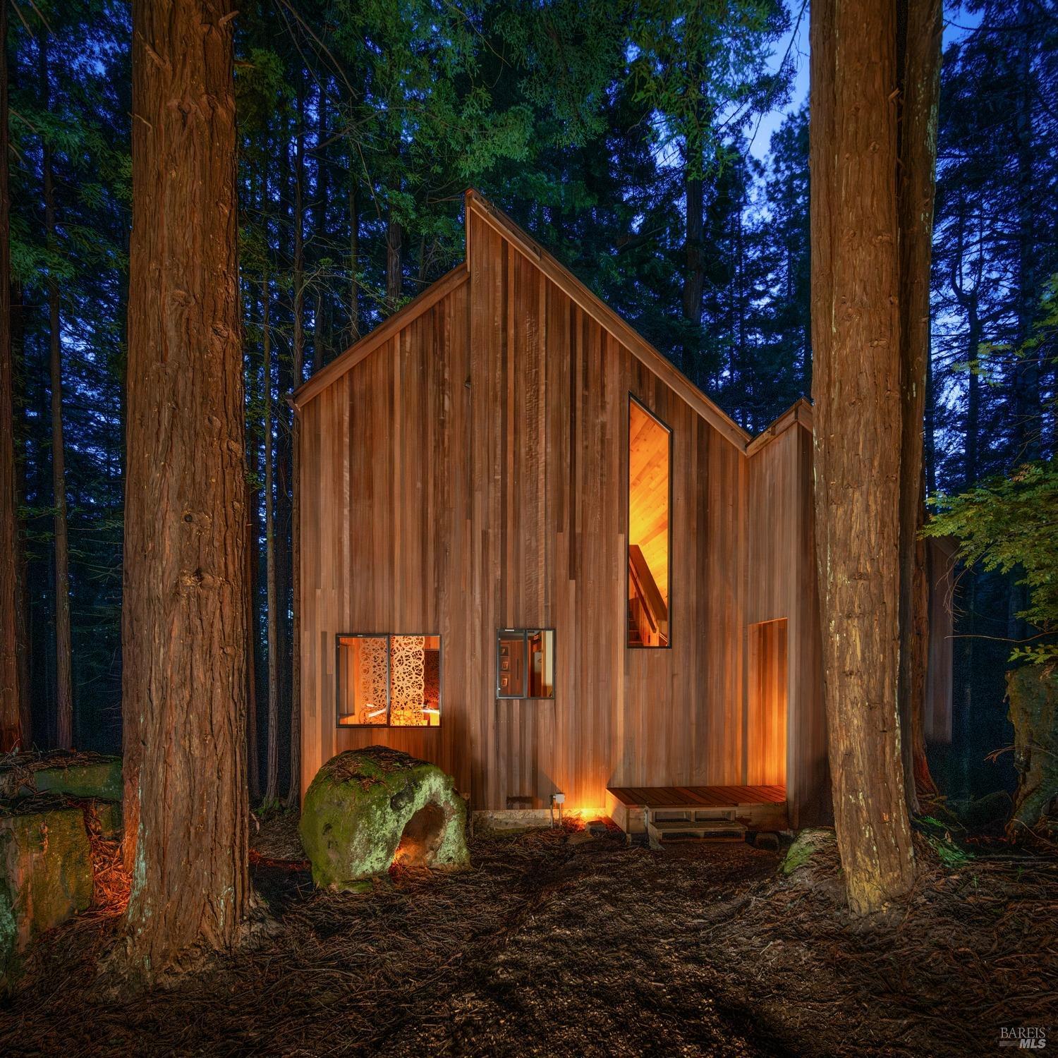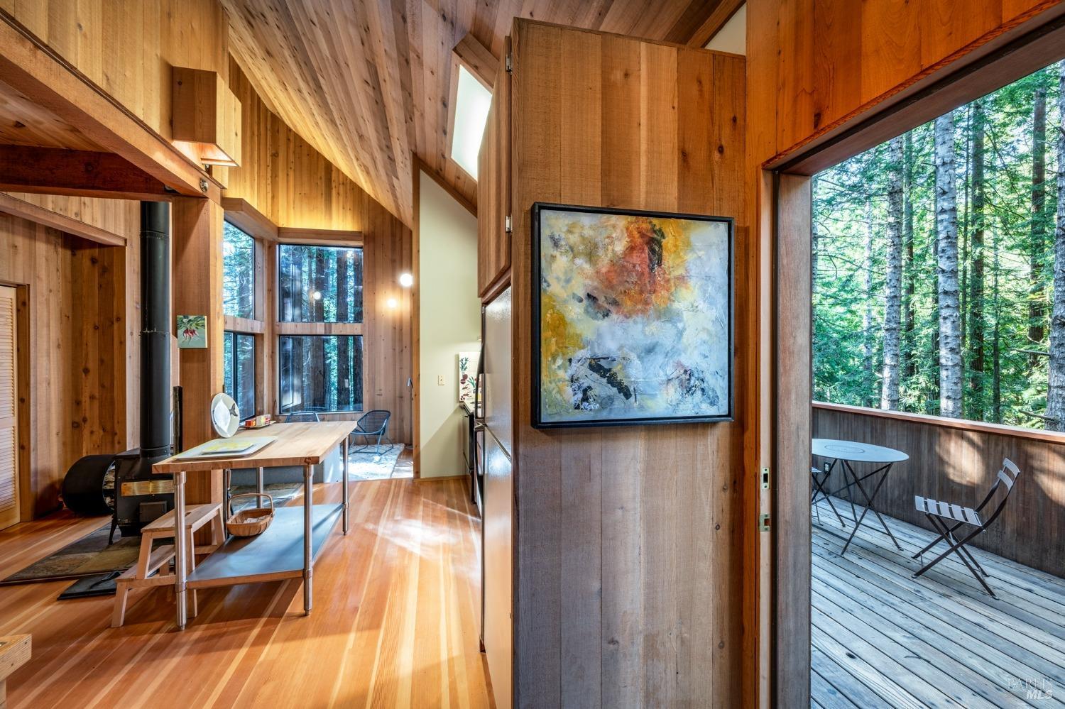 Clear air and calm surrounds the pristine setting of this small beautifully crafted cabin in the hills of The Sea Ranch. Young deer move through shafts of sunlight penetrating deeply into its stand of redwoods. The peace of forest bathing - the Japanese art of shinrin yoku - will be close at hand in this secluded cul de sac. Windows in the soaring 25-foot high cedar-lined living room offer views with no cabins in sight. A loft space, with bedroom and full bathroom, overlooks the downstairs. A galley kitchen with large butcher block table makes cooking simple and easy. The dining room looks out to a rare sweep of untouched forest. The scent and warmth of a crackling fire in a classic wood-burning stove brings comfort and coziness. A new 30-year roof and state of the art home wastewater treatment system, fully permitted and with an annual maintenance contract, are recent upgrades. High speed fiber optic brings work-at-home and streaming directly to the cabin. Follow the Hugel Ravine Trail, just steps from the cabin, down the hillside to the historic White Barn, to the sands of Ohlson Beach and to a recreation complex with pool and tennis courts. This perfectly situated holding provides a sought-after retreat for writers, artists and remote digital workers.
