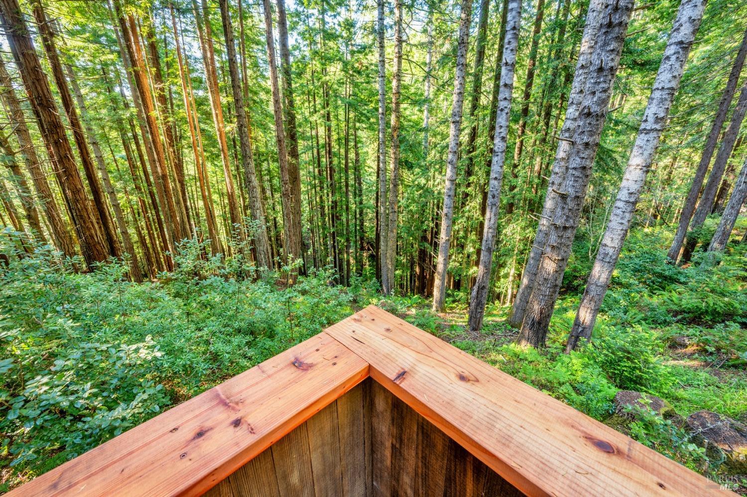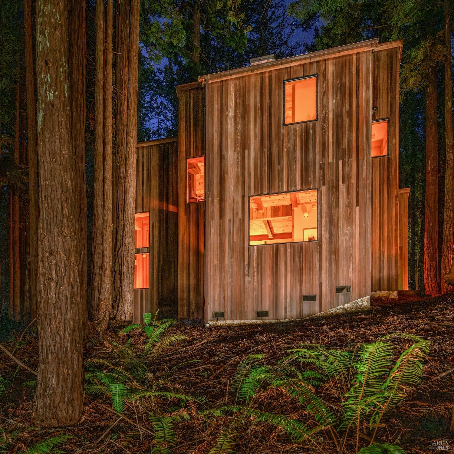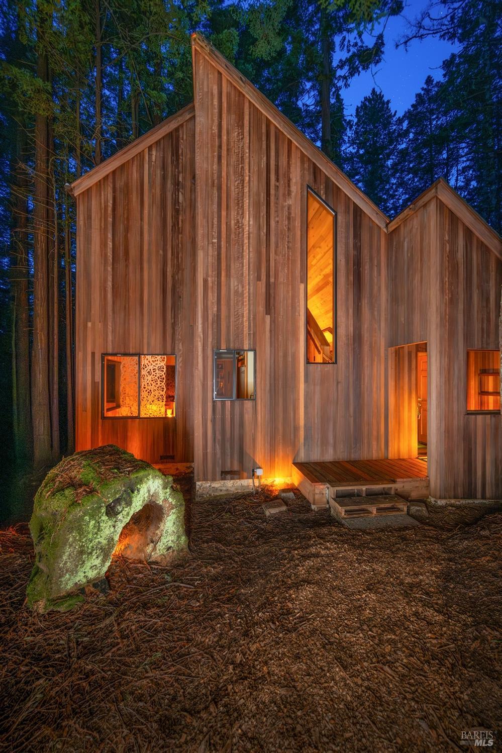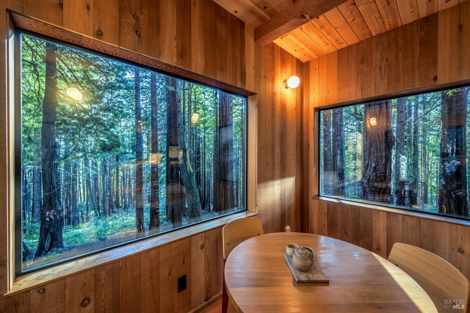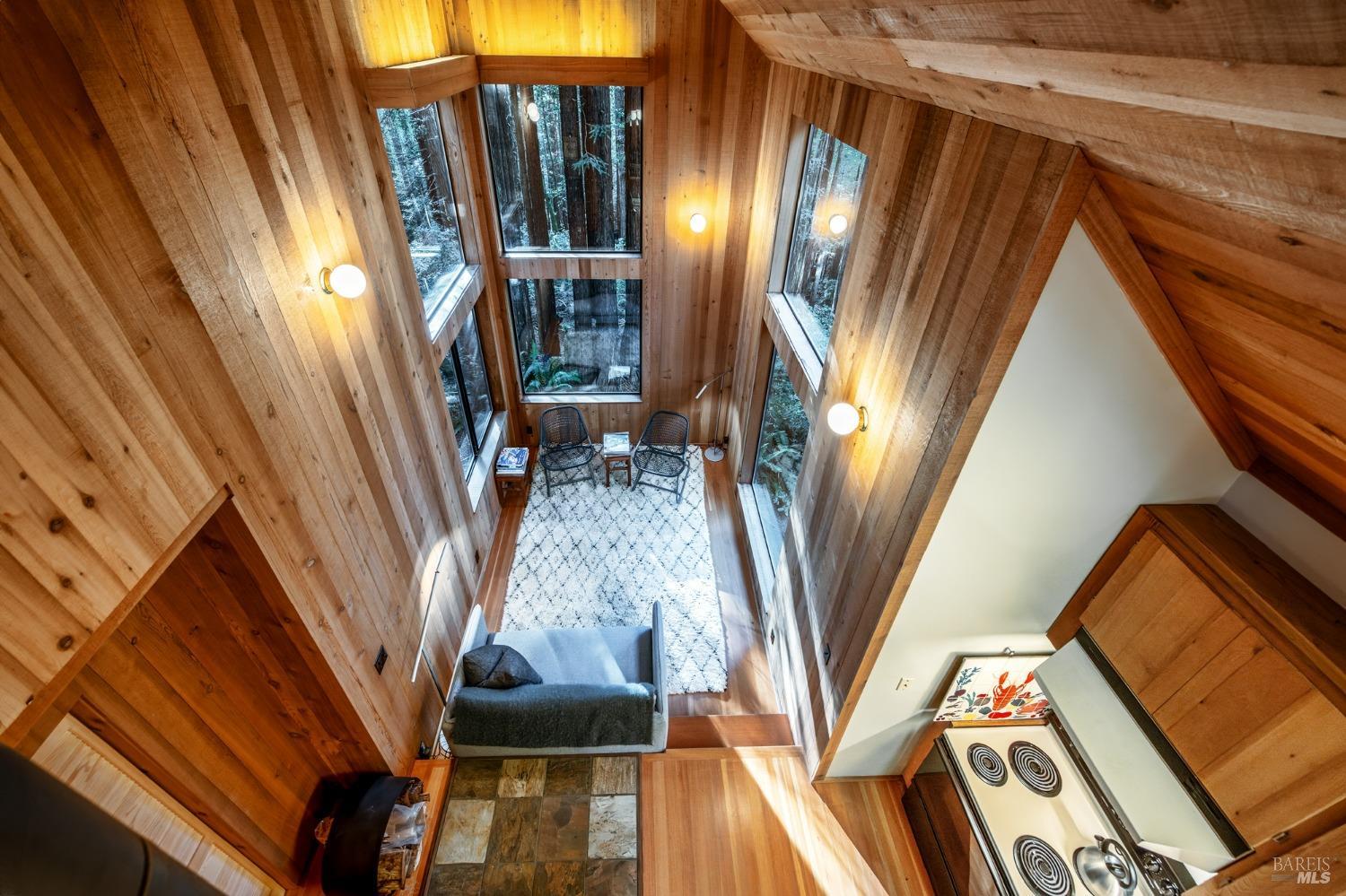Clear air and calm surrounds the pristine setting of this small beautifully crafted cabin in the hills of The Sea Ranch. Young deer move through shafts of sunlight penetrating deeply into its stand of redwoods. The peace of forest bathing - the Japanese art of shinrin yoku - will be close at hand in this secluded cul de sac. Windows in the soaring 25-foot high cedar-lined living room offer views with no cabins in sight. A loft space, with bedroom and full bathroom, overlooks the downstairs. A galley kitchen with large butcher block table makes cooking simple and easy. The dining room looks out to a rare sweep of untouched forest. The scent and warmth of a crackling fire in a classic wood-burning stove brings comfort and coziness. A new 30-year roof and state of the art home wastewater treatment system, fully permitted and with an annual maintenance contract, are recent upgrades. High speed fiber optic brings work-at-home and streaming directly to the cabin. Follow the Hugel Ravine Trail, just steps from the cabin, down the hillside to the historic White Barn, to the sands of Ohlson Beach and to a recreation complex with pool and tennis courts. This perfectly situated holding provides a sought-after retreat for writers, artists and remote digital workers.
