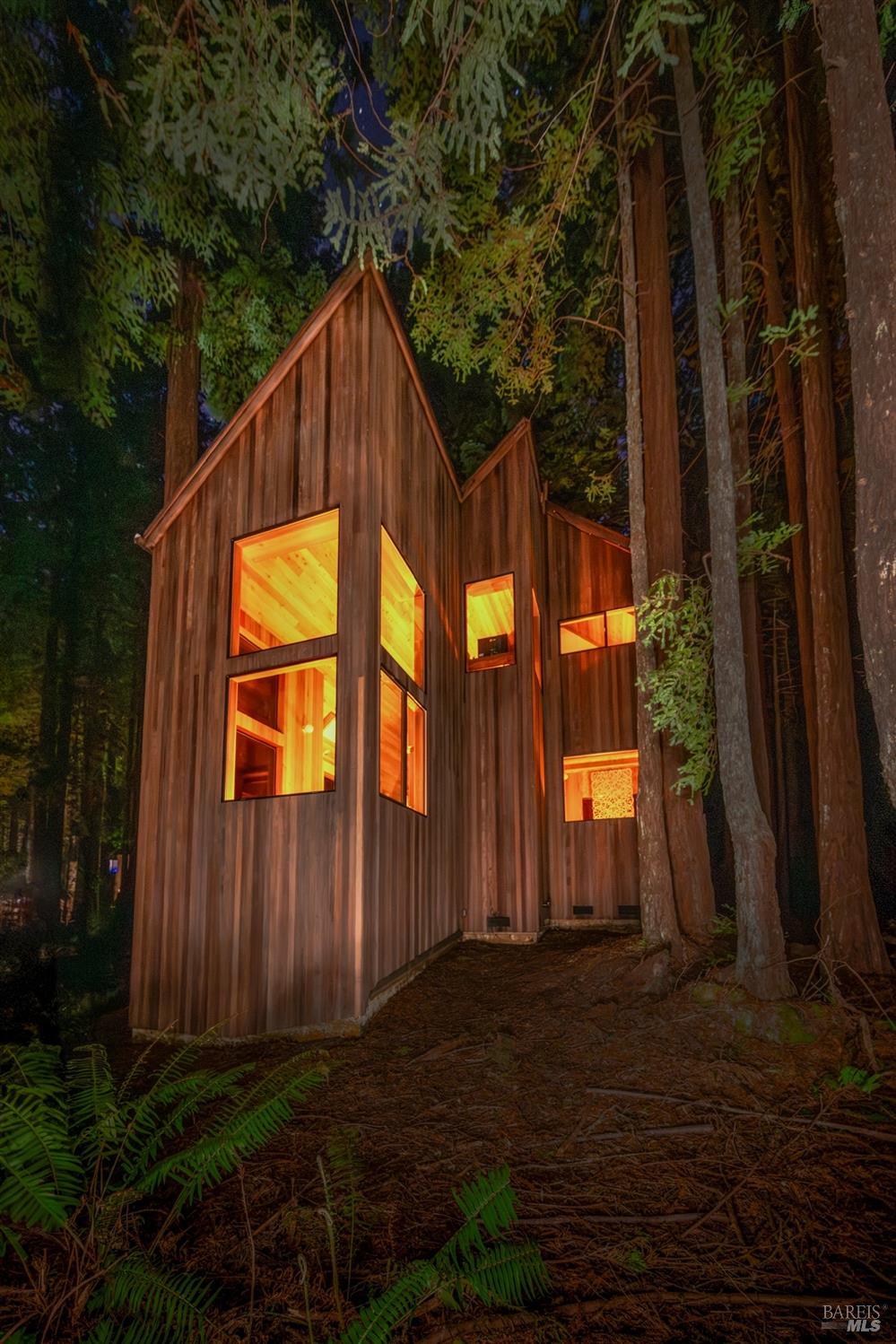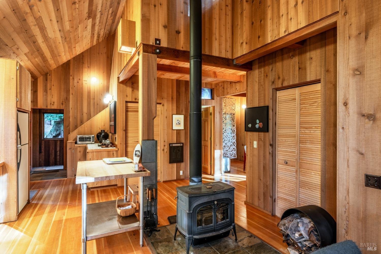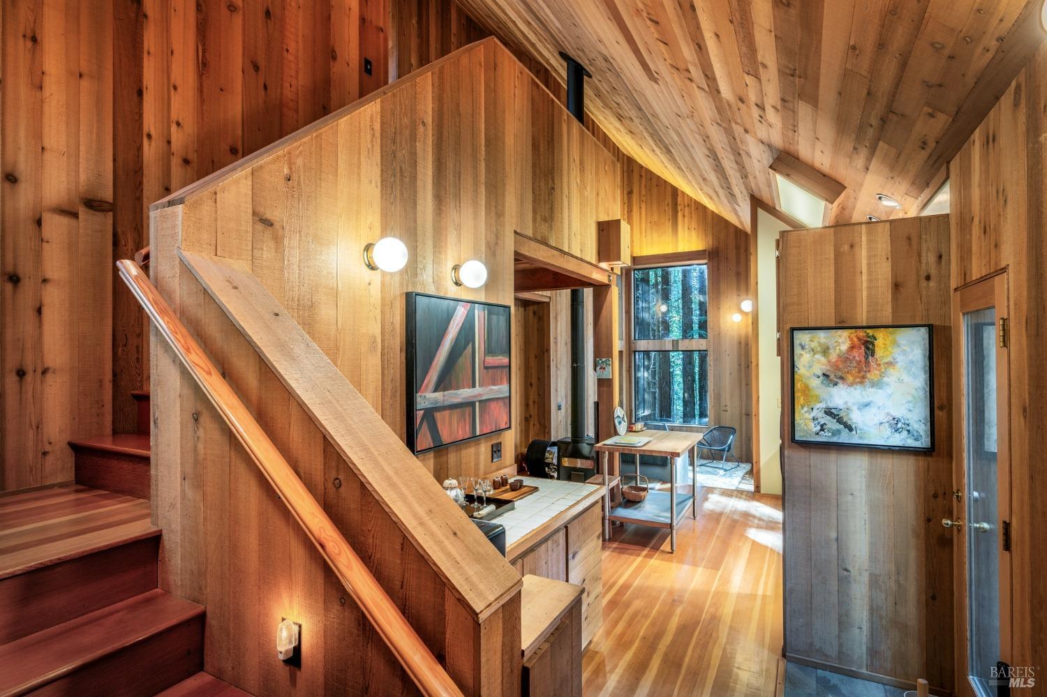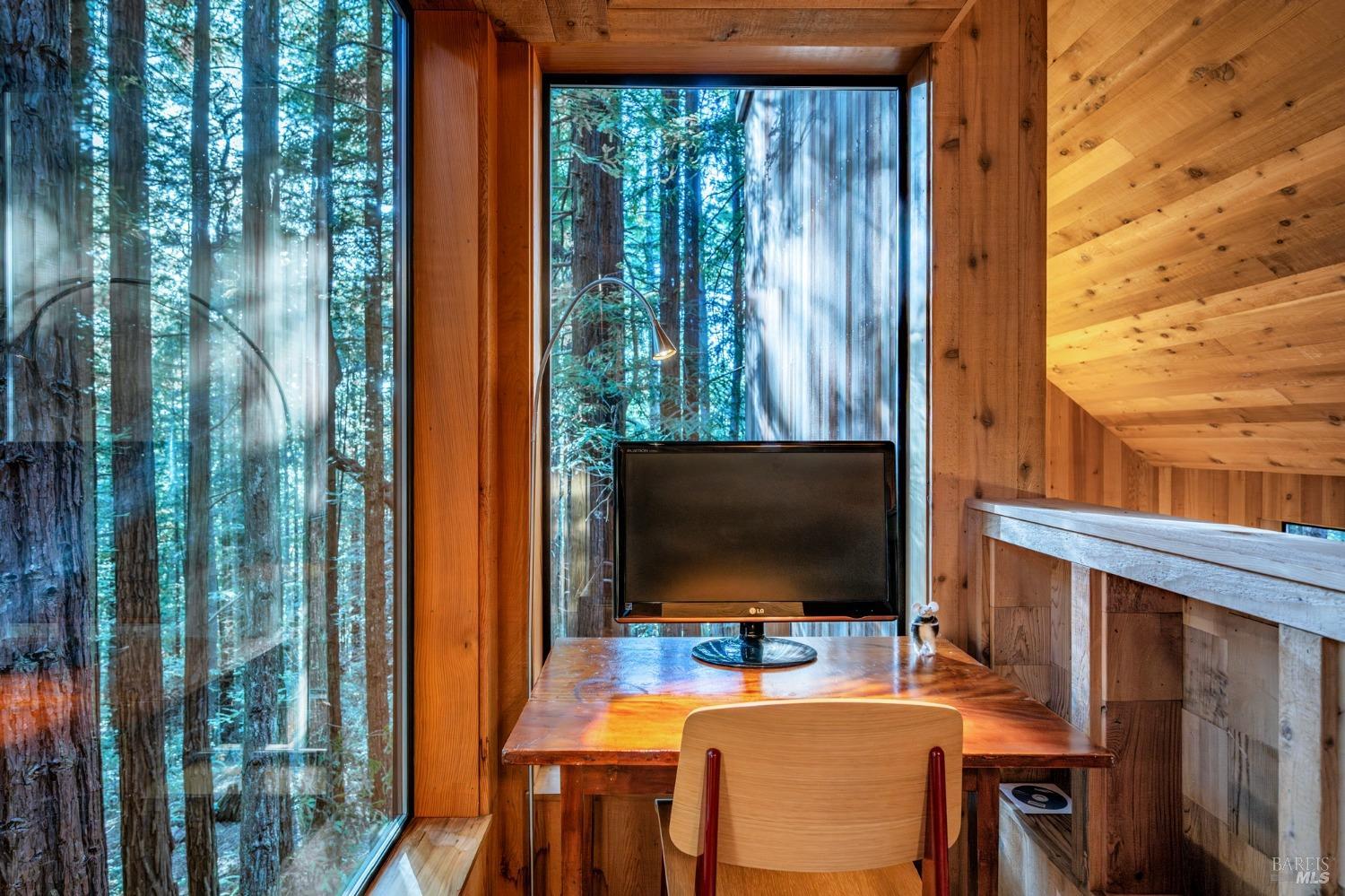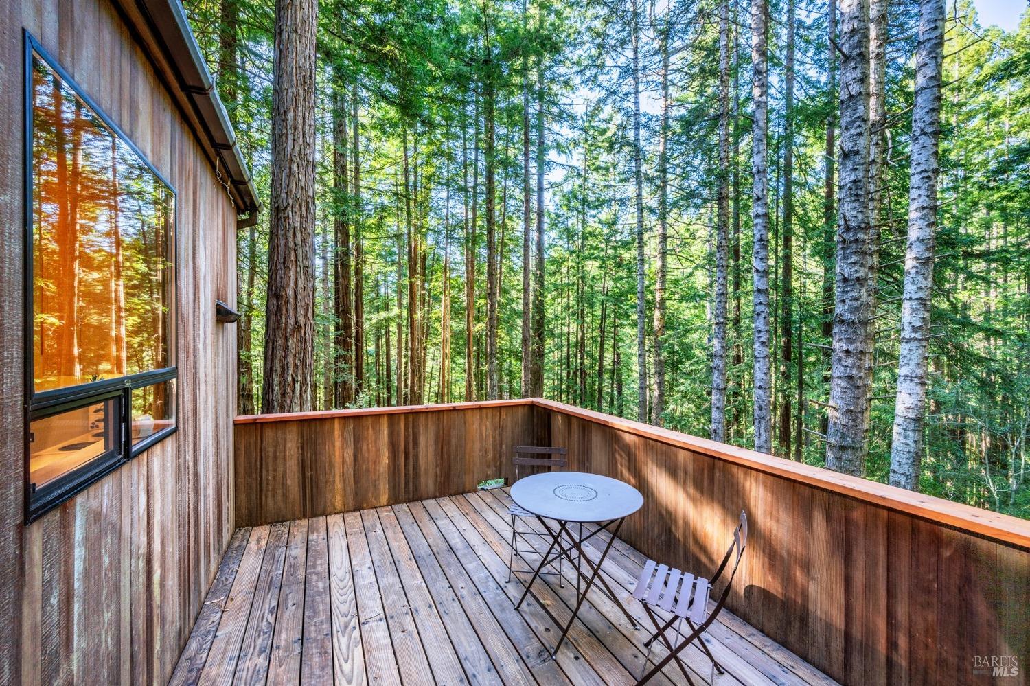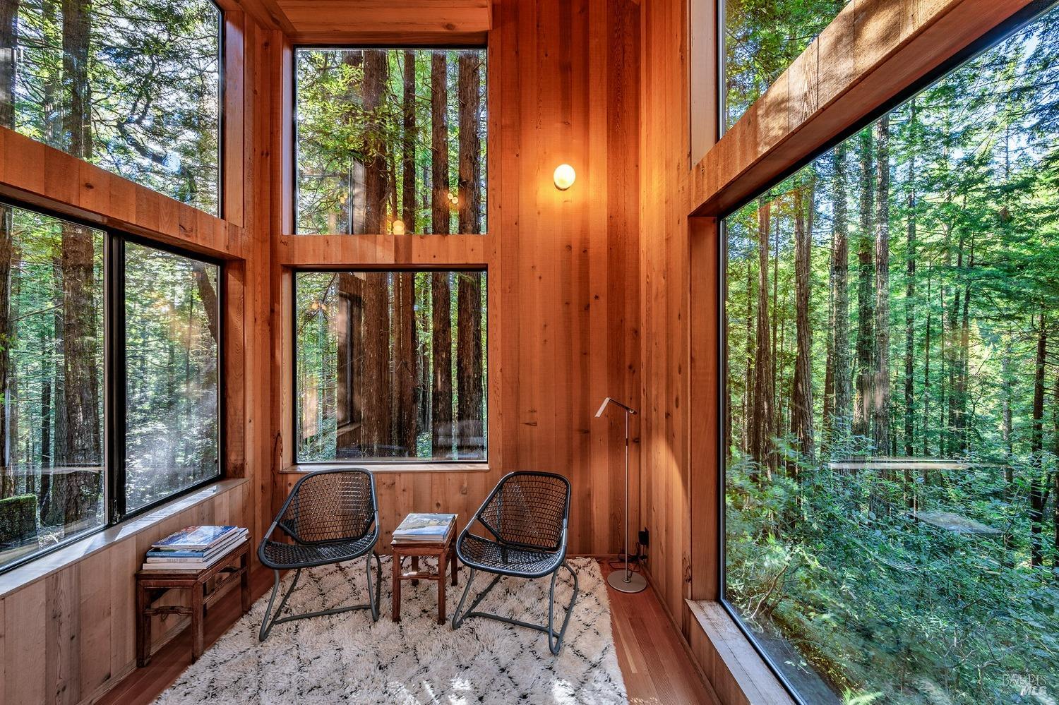 Clear air and calm surrounds the pristine setting of this small beautifully crafted cabin in the hills of The Sea Ranch. Young deer move through shafts of sunlight penetrating deeply into its stand of redwoods. The peace of forest bathing - the Japanese art of shinrin yoku - will be close at hand in this secluded cul de sac. Windows in the soaring 25-foot high cedar-lined living room offer views with no cabins in sight. A loft space, with bedroom and full bathroom, overlooks the downstairs. A galley kitchen with large butcher block table makes cooking simple and easy. The dining room looks out to a rare sweep of untouched forest. The scent and warmth of a crackling fire in a classic wood-burning stove brings comfort and coziness. A new 30-year roof and state of the art home wastewater treatment system, fully permitted and with an annual maintenance contract, are recent upgrades. High speed fiber optic brings work-at-home and streaming directly to the cabin. Follow the Hugel Ravine Trail, just steps from the cabin, down the hillside to the historic White Barn, to the sands of Ohlson Beach and to a recreation complex with pool and tennis courts. This perfectly situated holding provides a sought-after retreat for writers, artists and remote digital workers.