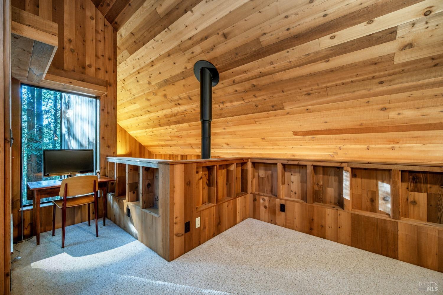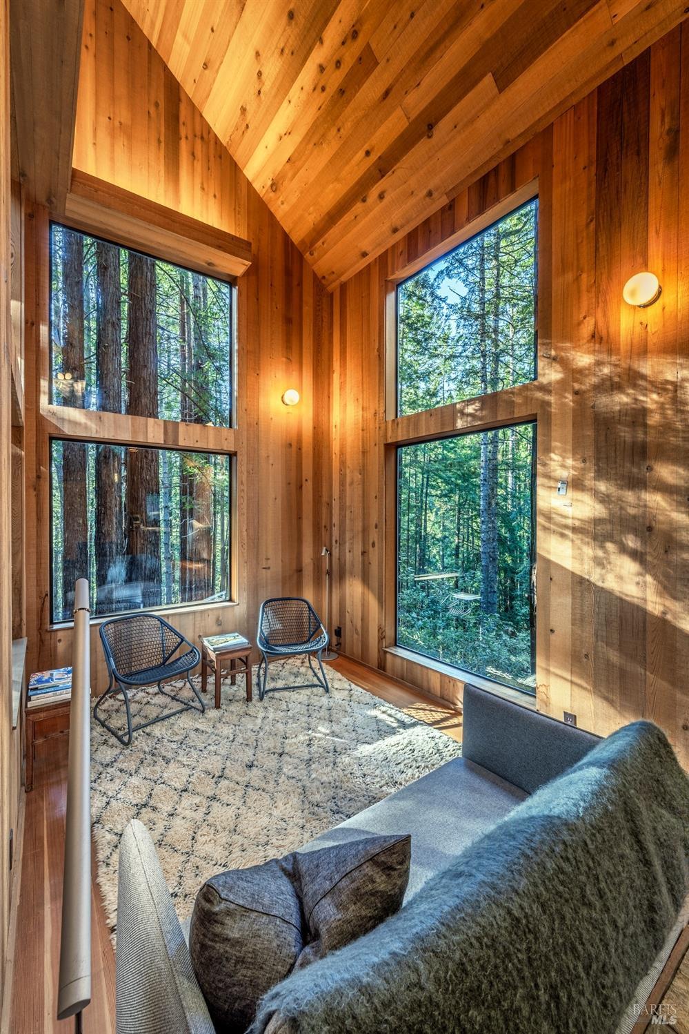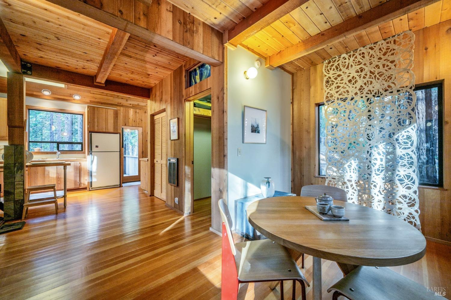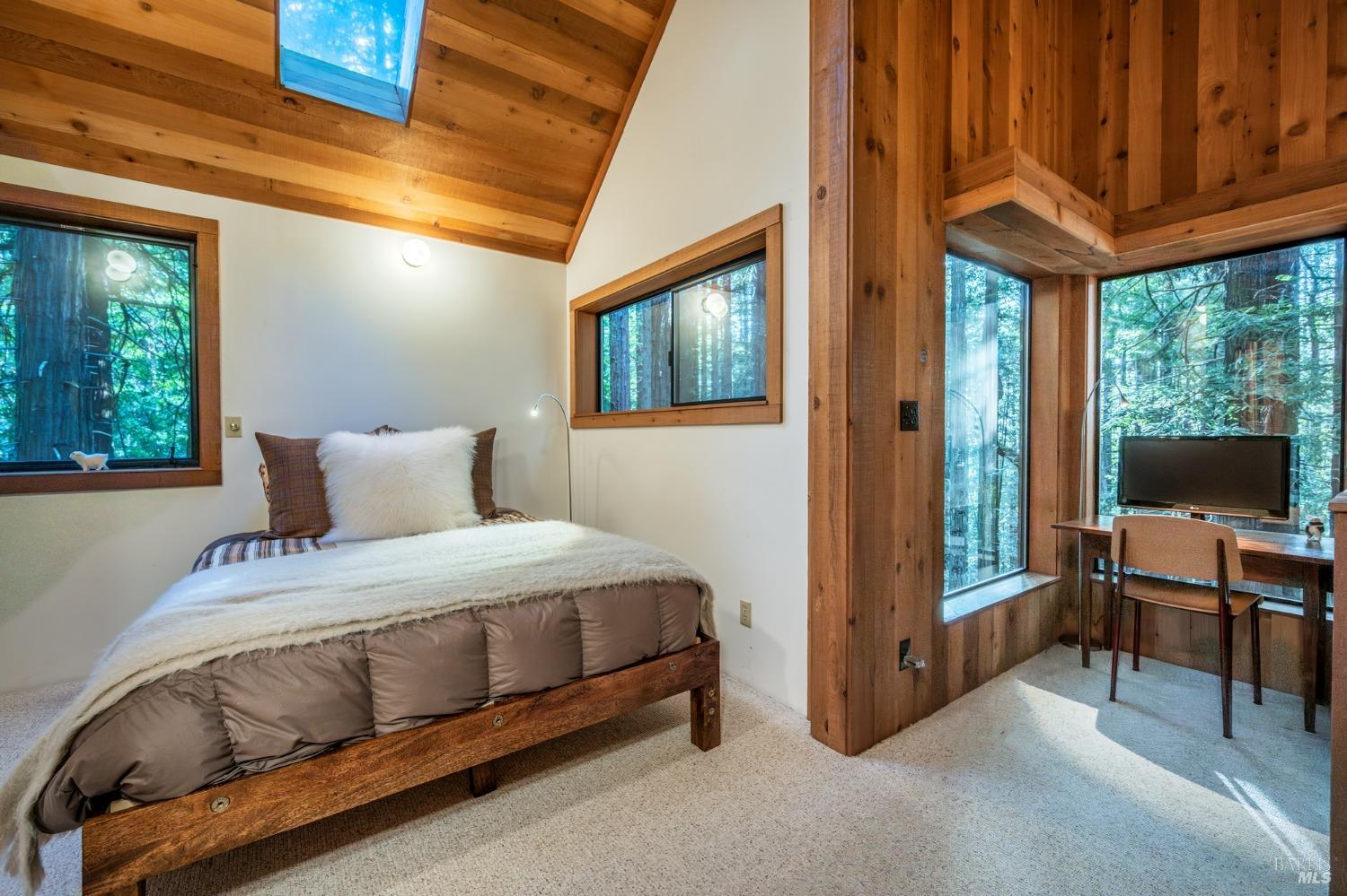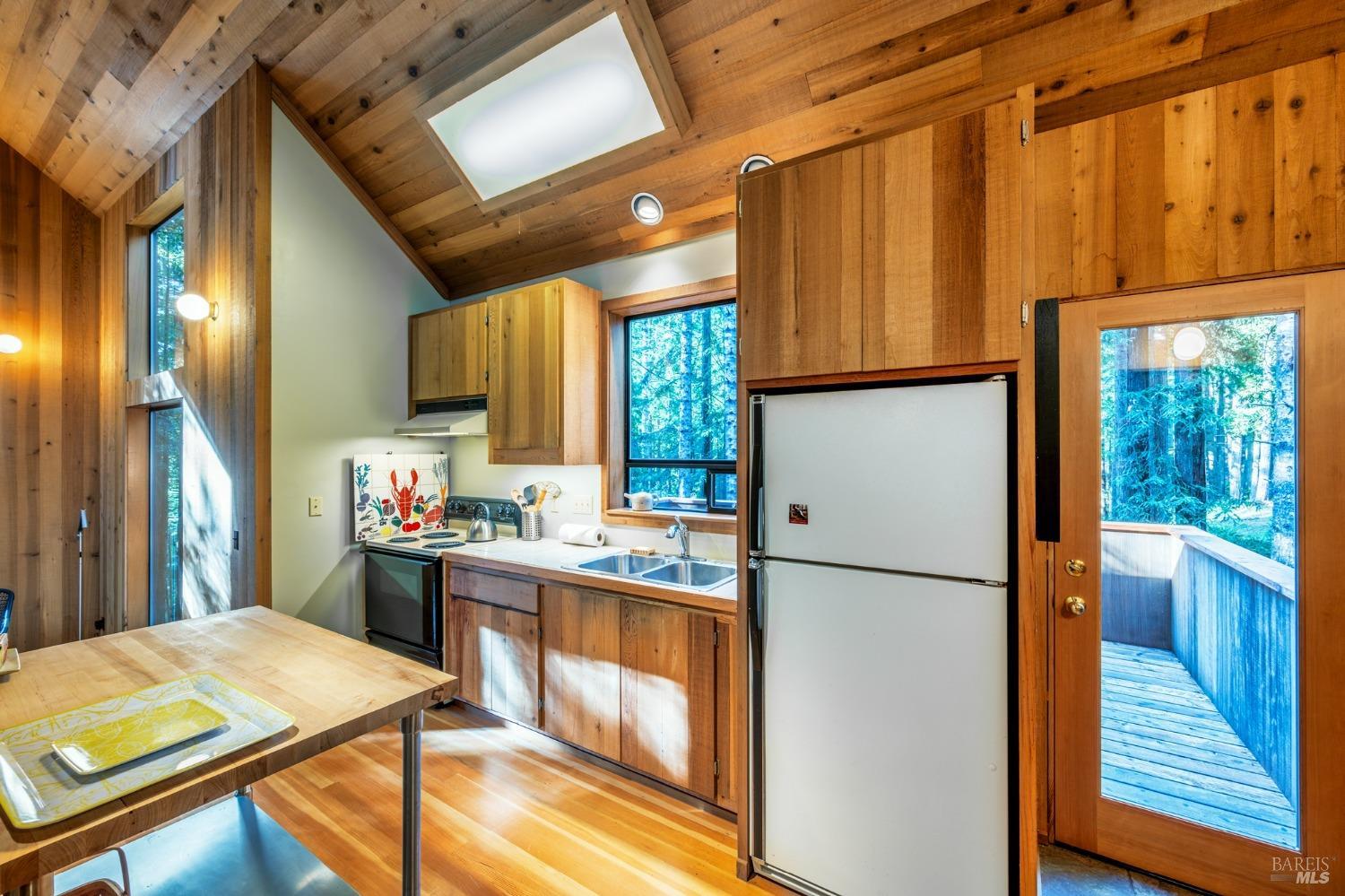 Clear air and calm surrounds the pristine setting of this small beautifully crafted cabin in the hills of The Sea Ranch. Young deer move through shafts of sunlight penetrating deeply into its stand of redwoods. The peace of forest bathing - the Japanese art of shinrin yoku - will be close at hand in this secluded cul de sac. Windows in the soaring 25-foot high cedar-lined living room offer views with no cabins in sight. A loft space, with bedroom and full bathroom, overlooks the downstairs. A galley kitchen with large butcher block table makes cooking simple and easy. The dining room looks out to a rare sweep of untouched forest. The scent and warmth of a crackling fire in a classic wood-burning stove brings comfort and coziness. A new 30-year roof and state of the art home wastewater treatment system, fully permitted and with an annual maintenance contract, are recent upgrades. High speed fiber optic brings work-at-home and streaming directly to the cabin. Follow the Hugel Ravine Trail, just steps from the cabin, down the hillside to the historic White Barn, to the sands of Ohlson Beach and to a recreation complex with pool and tennis courts. This perfectly situated holding provides a sought-after retreat for writers, artists and remote digital workers.