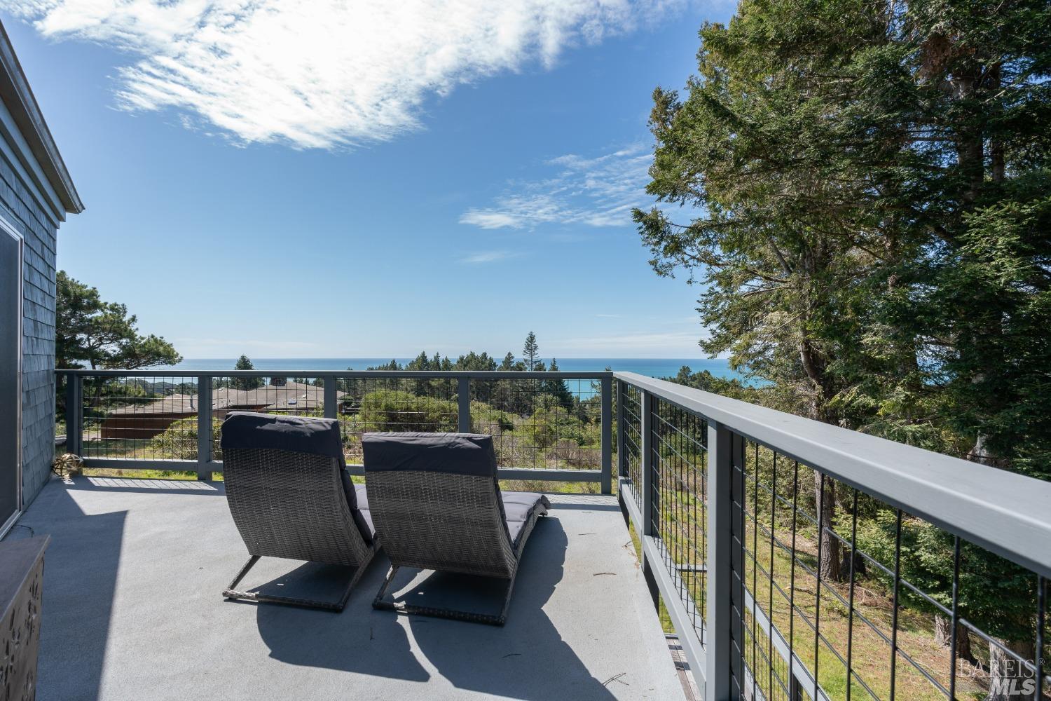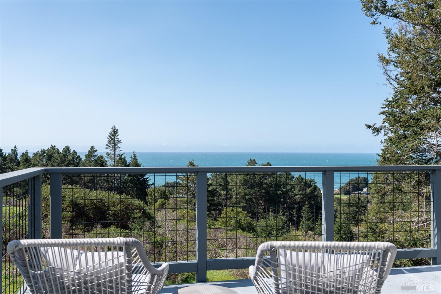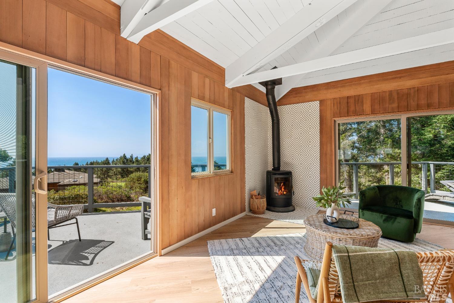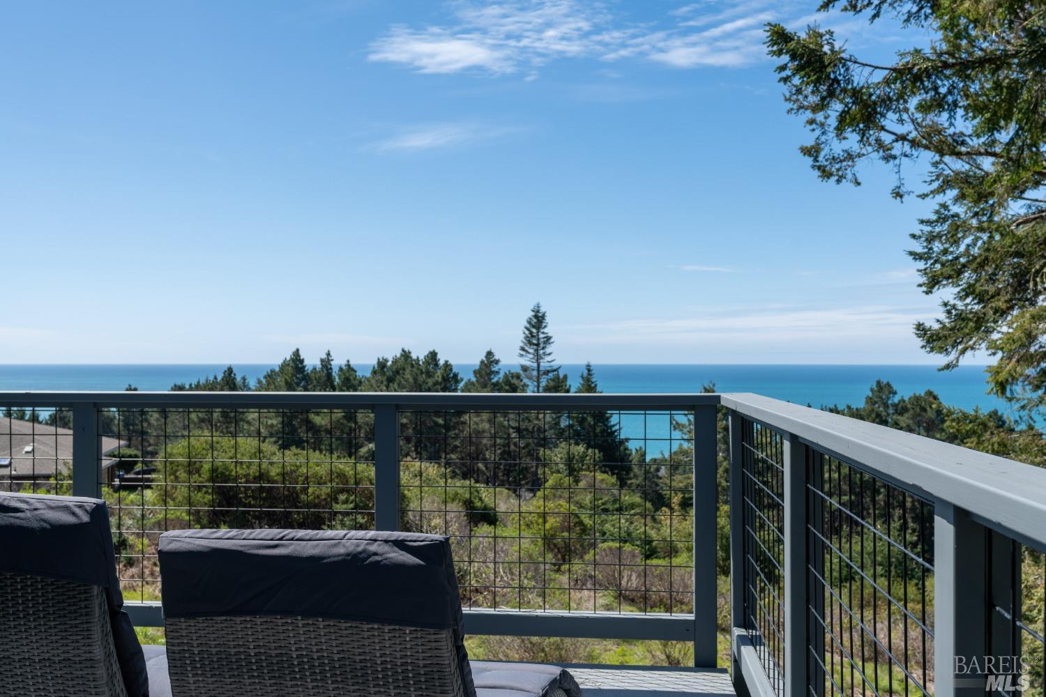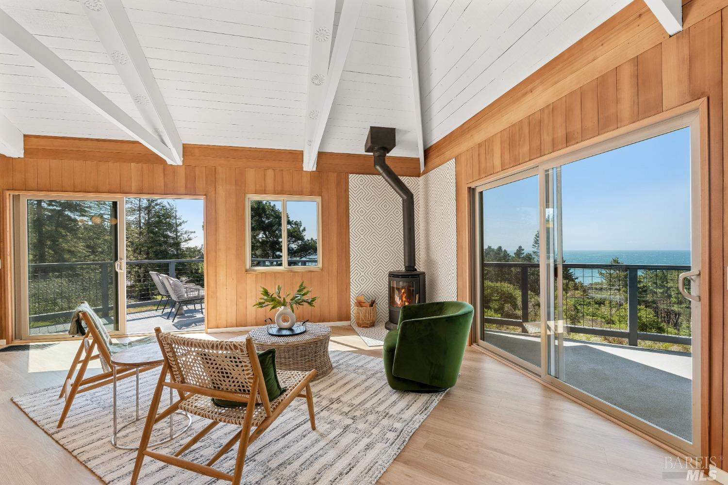 Panoramic white water Smuggler's Cove ocean views on a 0.67 acre double lot meets remodeled 2-bed/2-bath home with iconic Sea Ranch touches. The entire home features modern negative carbon footprint wood-look cork flooring. 1st floor boasts two heritage clear heart redwood-paneled bedrooms and updated en suites with ocean views. On this floor is a large open space for family gaming or media area, yoga, or creative space and (count em!) seven closets. Let your imagination run wild! The primary suite and bonus area have separate exterior access to walk the grounds. Grab the Donlyn Lyndon-inspired yellow hand rail and head upstairs to the eye-catching great room, which opens to three separate decks and features a remodeled kitchen boasting mid century-look vertically-placed Heath tile backsplash, two-tone oak base and matte white upper flat-front cabinets, cement look Caesarstone counters, a huge island for four, LG stainless steel appliances and a wine fridge and bar counter. Lots of mid-century details in the great room incl. Herman Miller lighting. Plenty of extra space with skylit workshop and att. 2-car garage with laundry. The setting on a large private lot invites to hikes North, East, West and South, bicycling and flying home to the airstrip in walking distance of house.