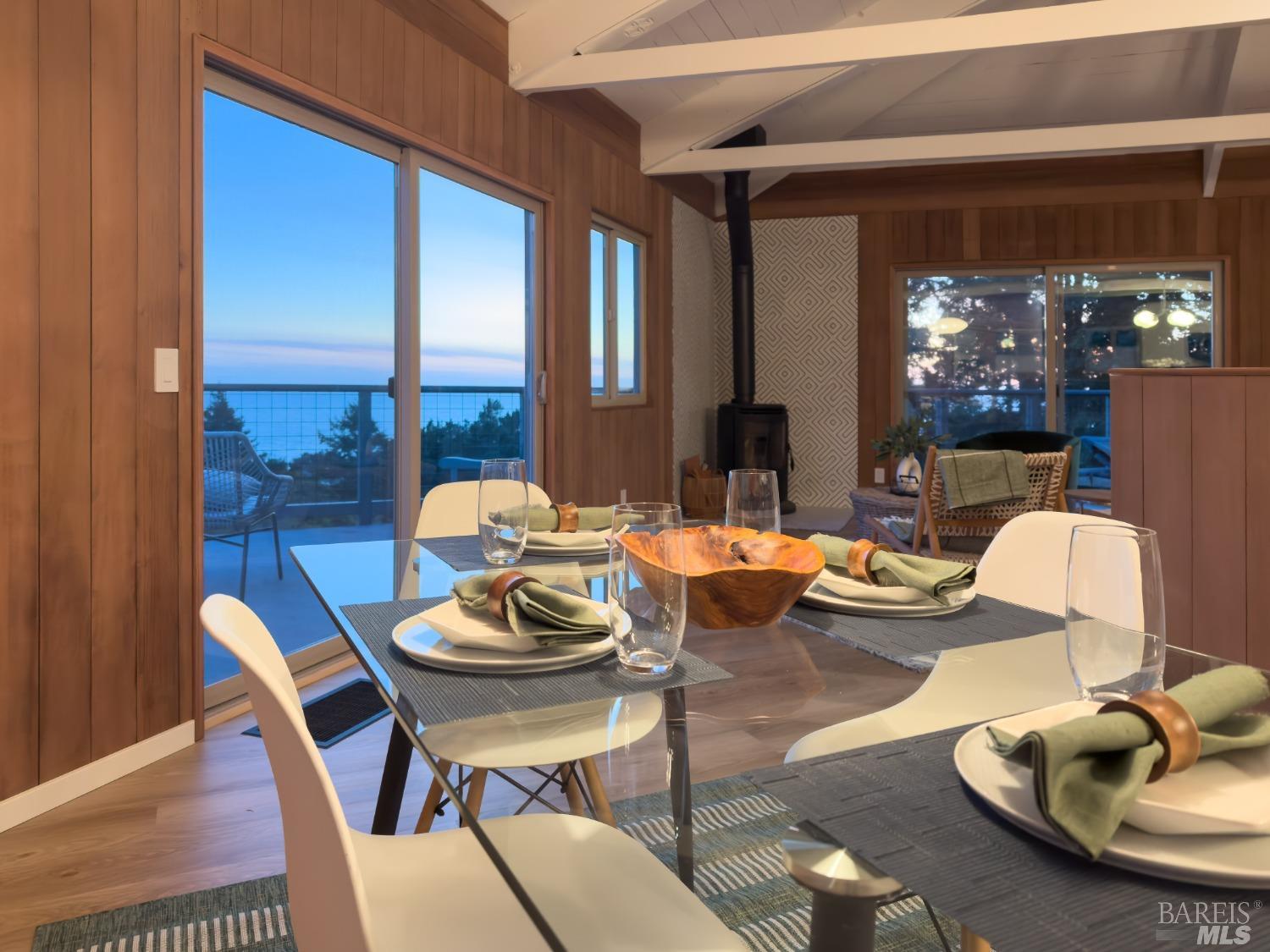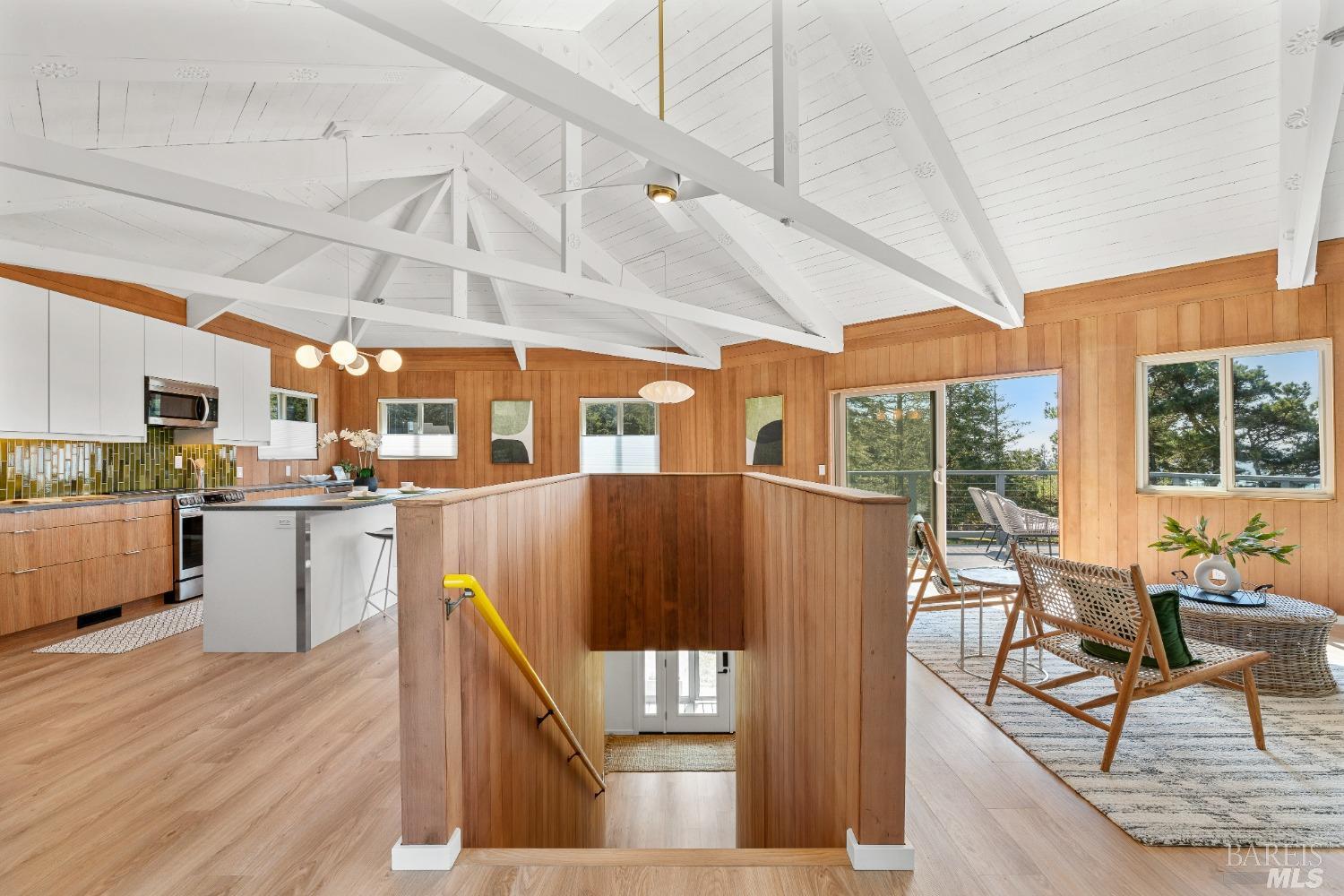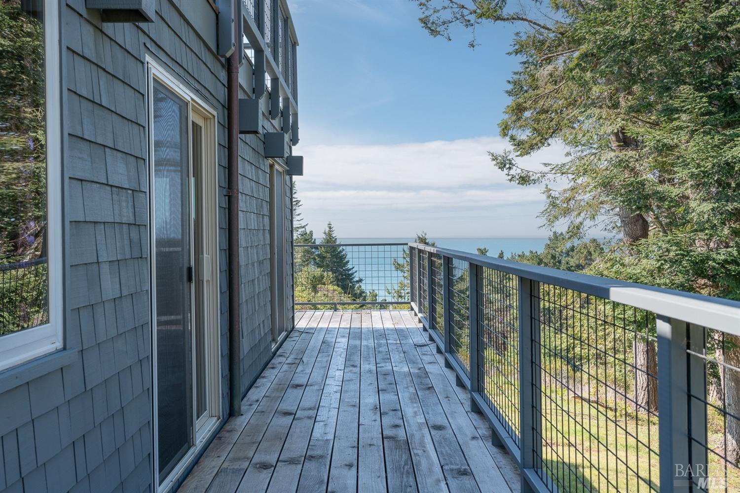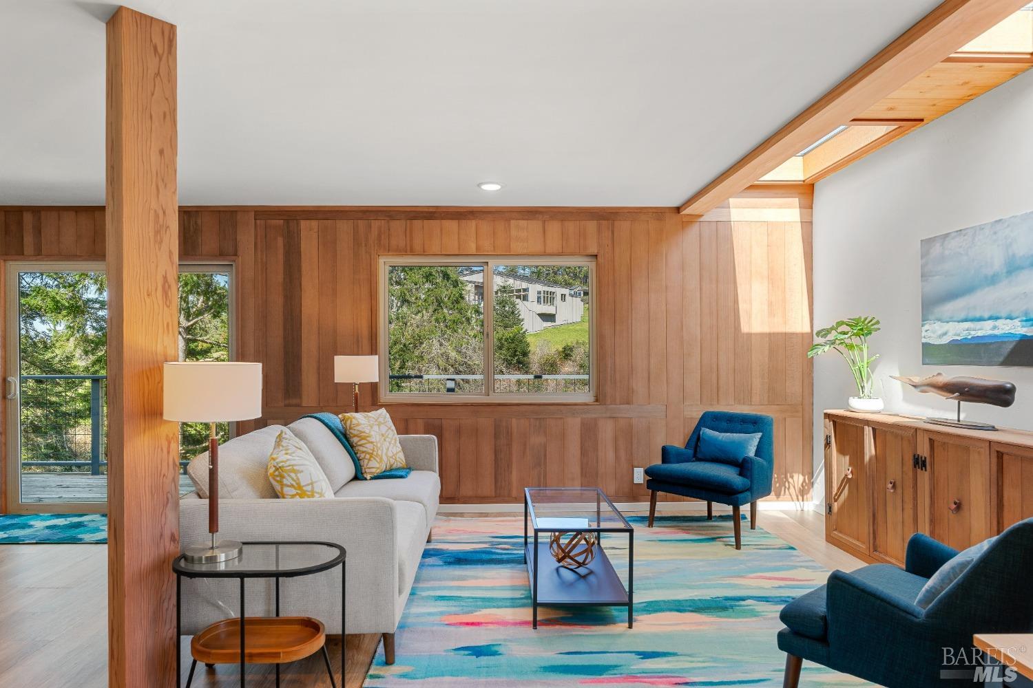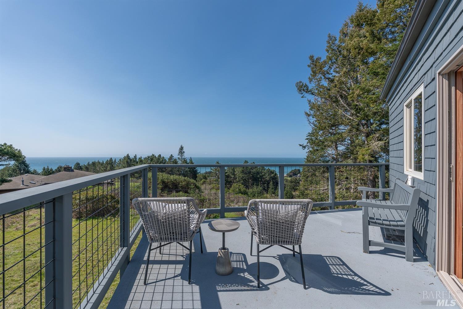 Panoramic white water Smuggler's Cove ocean views on a 0.67 acre double lot meets remodeled 2-bed/2-bath home with iconic Sea Ranch touches. The entire home features modern negative carbon footprint wood-look cork flooring. 1st floor boasts two heritage clear heart redwood-paneled bedrooms and updated en suites with ocean views. On this floor is a large open space for family gaming or media area, yoga, or creative space and (count em!) seven closets. Let your imagination run wild! The primary suite and bonus area have separate exterior access to walk the grounds. Grab the Donlyn Lyndon-inspired yellow hand rail and head upstairs to the eye-catching great room, which opens to three separate decks and features a remodeled kitchen boasting mid century-look vertically-placed Heath tile backsplash, two-tone oak base and matte white upper flat-front cabinets, cement look Caesarstone counters, a huge island for four, LG stainless steel appliances and a wine fridge and bar counter. Lots of mid-century details in the great room incl. Herman Miller lighting. Plenty of extra space with skylit workshop and att. 2-car garage with laundry. The setting on a large private lot invites to hikes North, East, West and South, bicycling and flying home to the airstrip in walking distance of house.