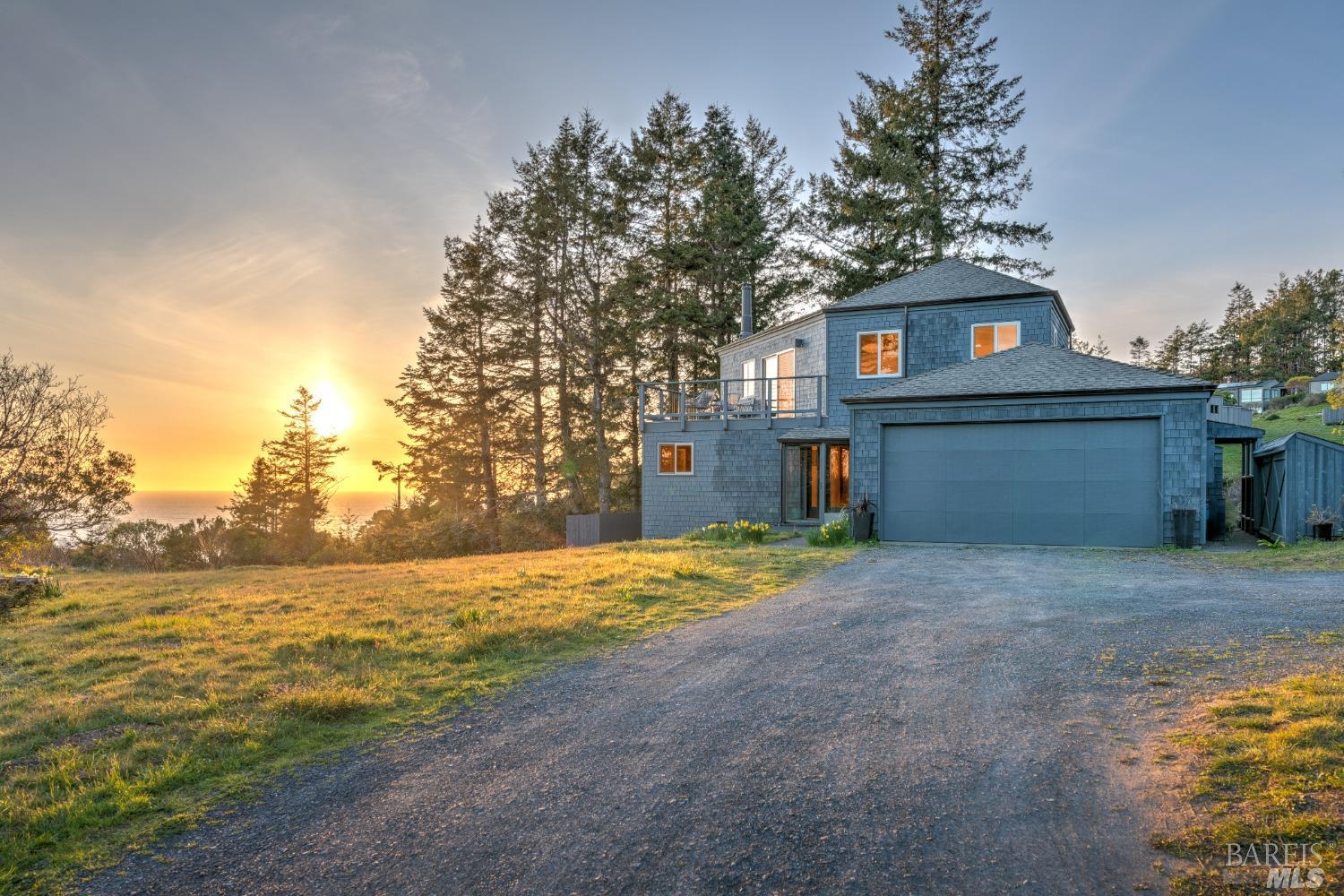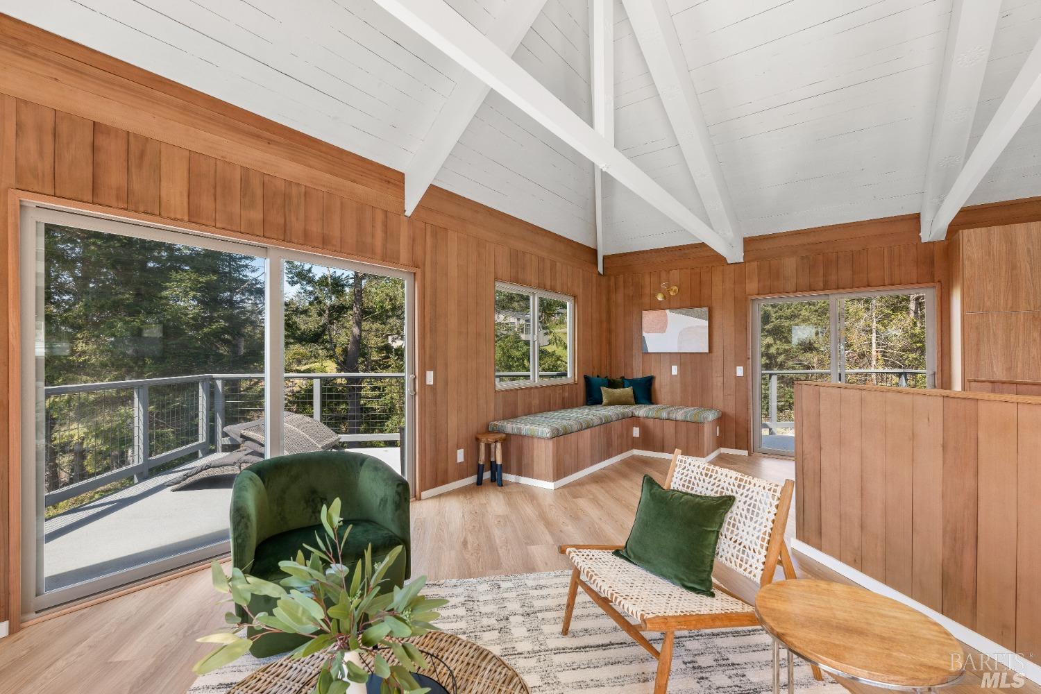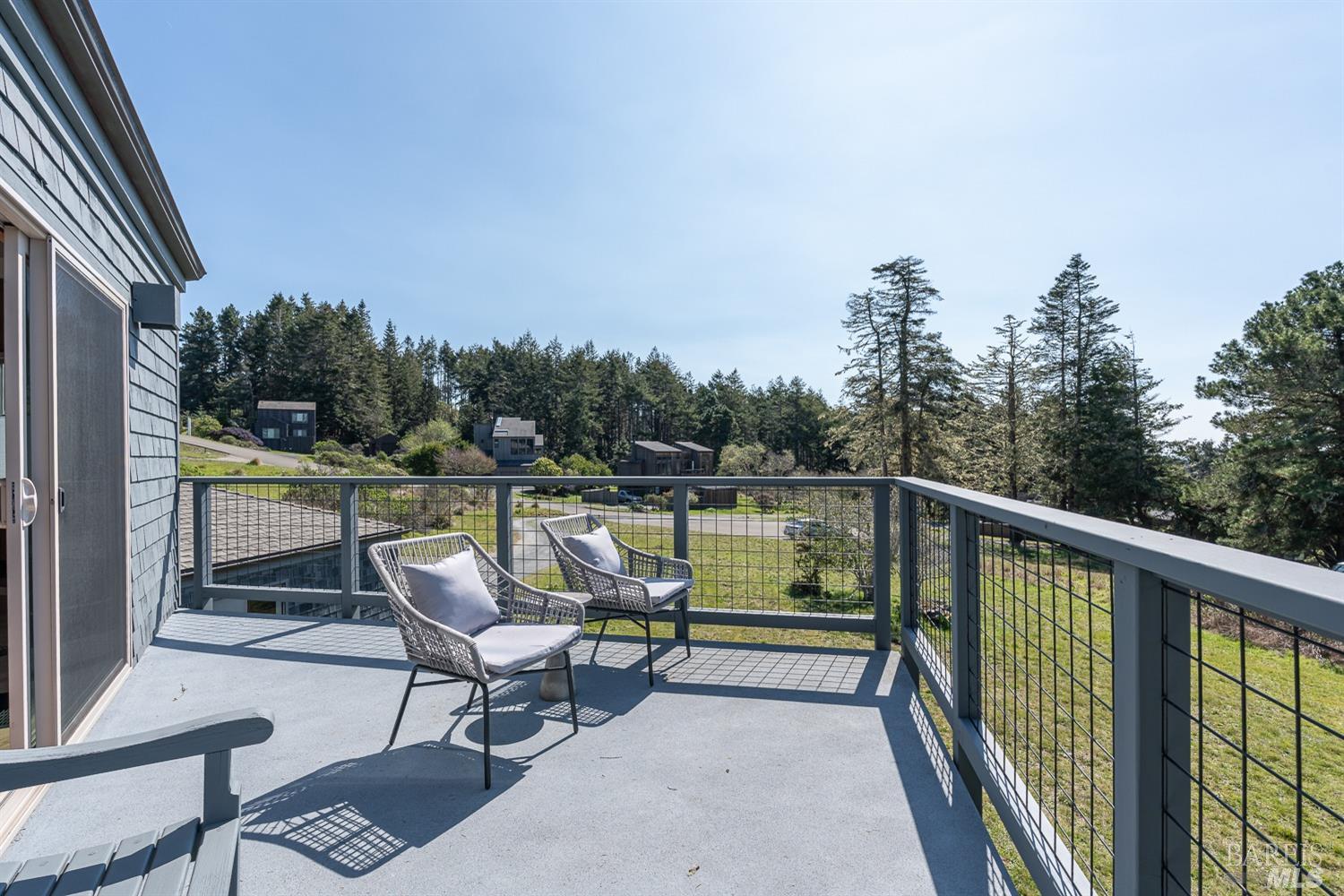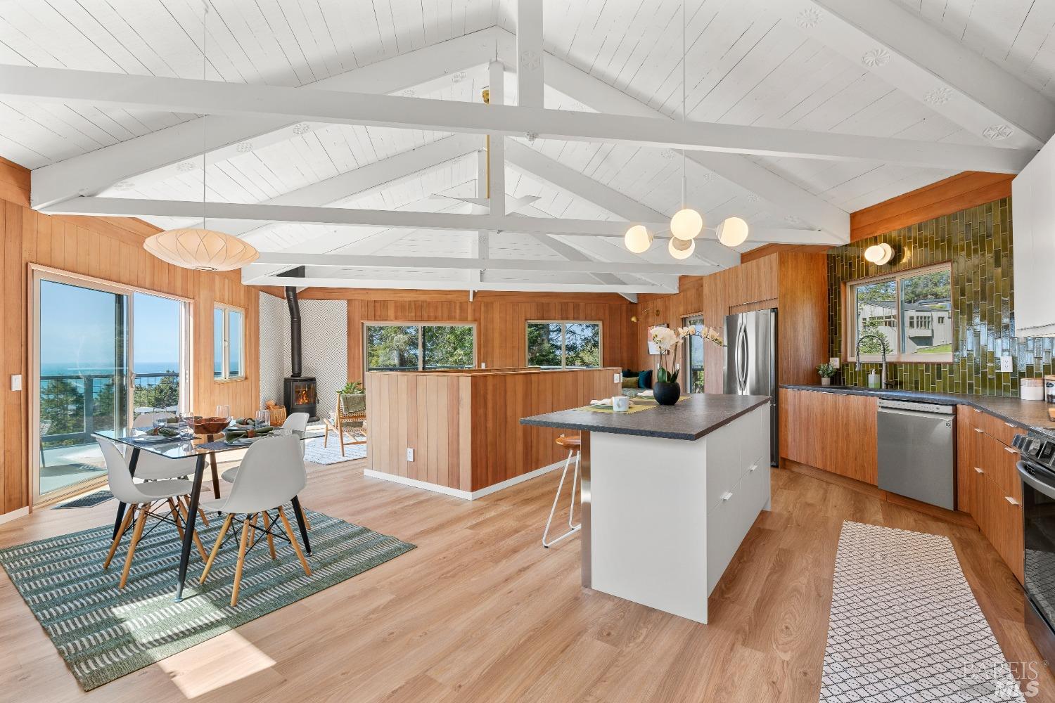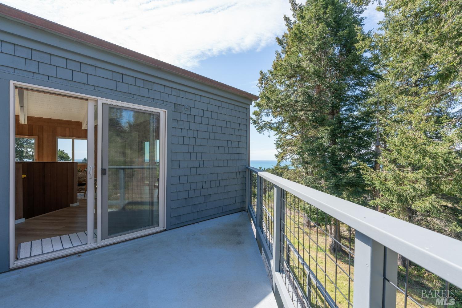 Panoramic white water Smuggler's Cove ocean views on a 0.67 acre double lot meets remodeled 2-bed/2-bath home with iconic Sea Ranch touches. The entire home features modern negative carbon footprint wood-look cork flooring. 1st floor boasts two heritage clear heart redwood-paneled bedrooms and updated en suites with ocean views. On this floor is a large open space for family gaming or media area, yoga, or creative space and (count em!) seven closets. Let your imagination run wild! The primary suite and bonus area have separate exterior access to walk the grounds. Grab the Donlyn Lyndon-inspired yellow hand rail and head upstairs to the eye-catching great room, which opens to three separate decks and features a remodeled kitchen boasting mid century-look vertically-placed Heath tile backsplash, two-tone oak base and matte white upper flat-front cabinets, cement look Caesarstone counters, a huge island for four, LG stainless steel appliances and a wine fridge and bar counter. Lots of mid-century details in the great room incl. Herman Miller lighting. Plenty of extra space with skylit workshop and att. 2-car garage with laundry. The setting on a large private lot invites to hikes North, East, West and South, bicycling and flying home to the airstrip in walking distance of house.