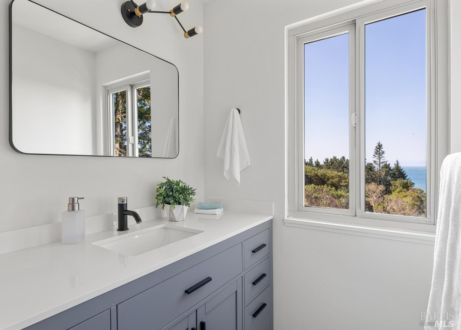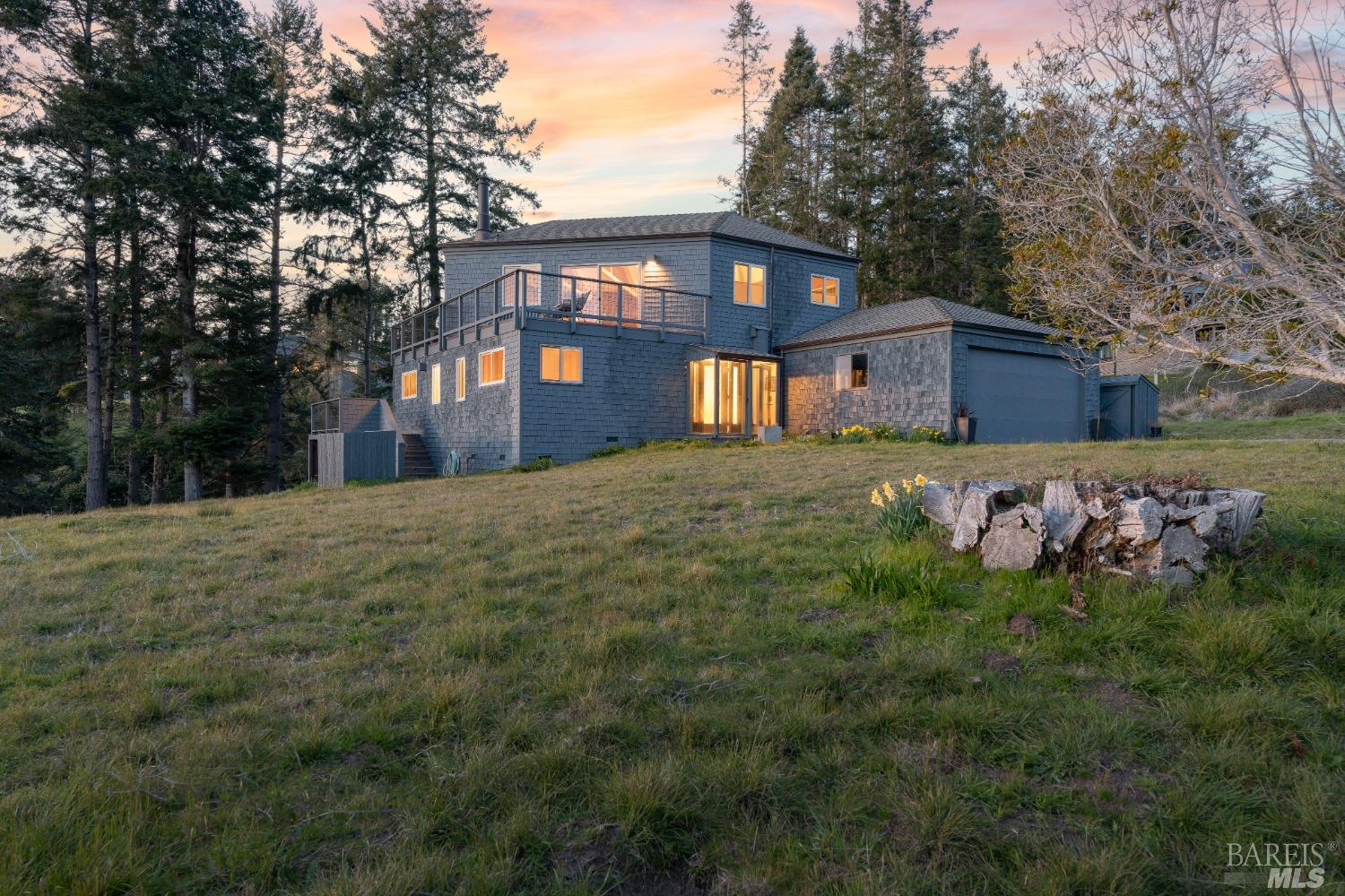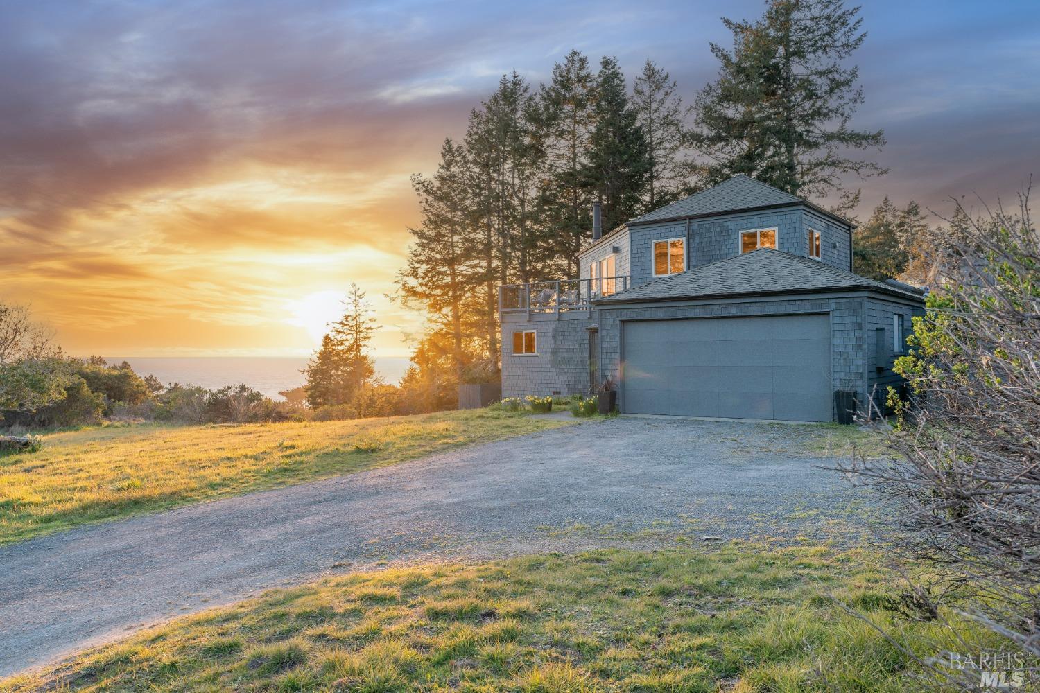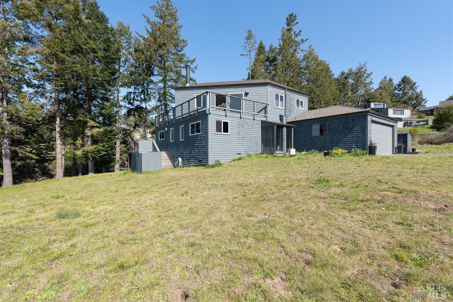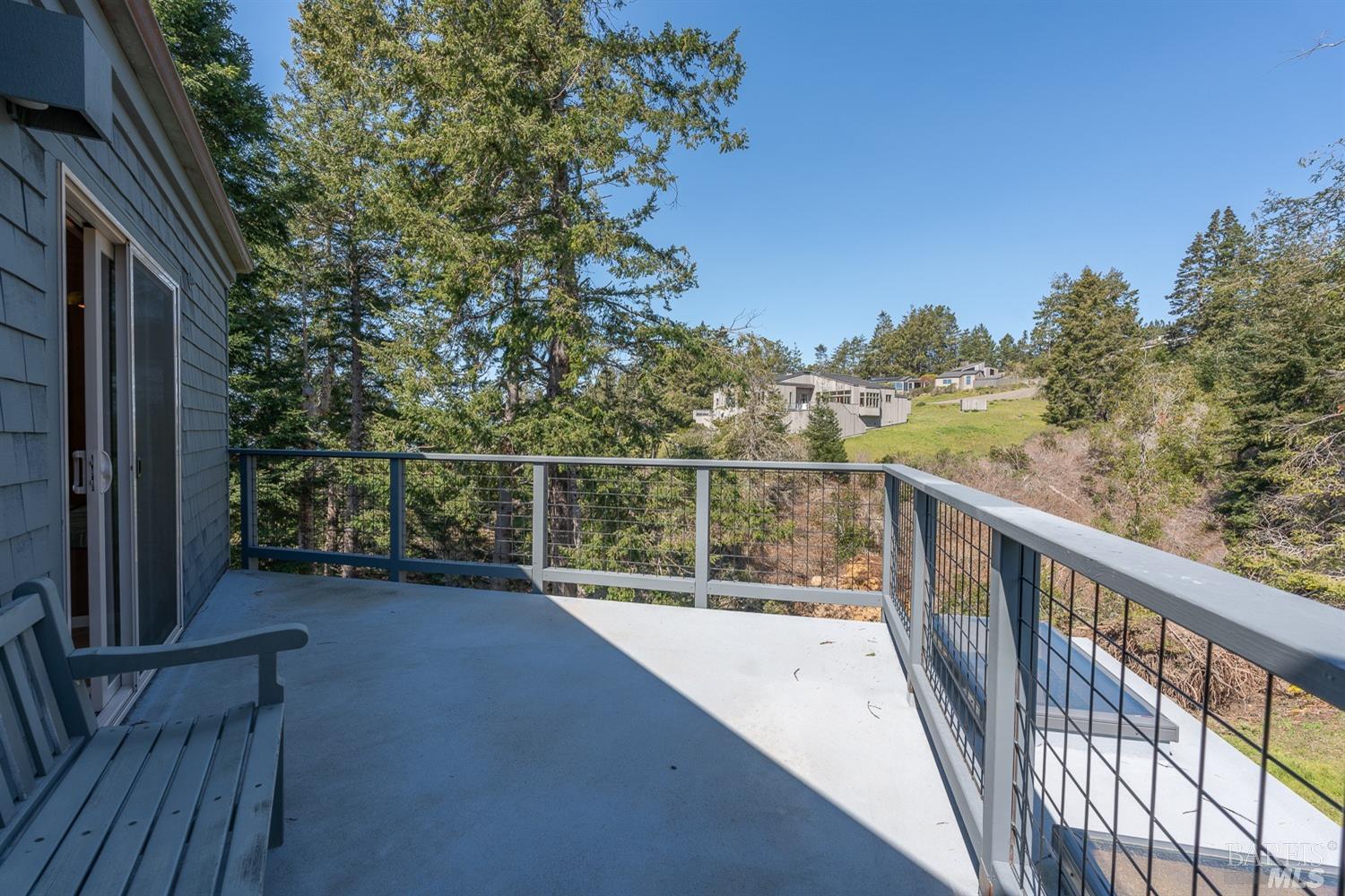 Panoramic white water Smuggler's Cove ocean views on a 0.67 acre double lot meets remodeled 2-bed/2-bath home with iconic Sea Ranch touches. The entire home features modern negative carbon footprint wood-look cork flooring. 1st floor boasts two heritage clear heart redwood-paneled bedrooms and updated en suites with ocean views. On this floor is a large open space for family gaming or media area, yoga, or creative space and (count em!) seven closets. Let your imagination run wild! The primary suite and bonus area have separate exterior access to walk the grounds. Grab the Donlyn Lyndon-inspired yellow hand rail and head upstairs to the eye-catching great room, which opens to three separate decks and features a remodeled kitchen boasting mid century-look vertically-placed Heath tile backsplash, two-tone oak base and matte white upper flat-front cabinets, cement look Caesarstone counters, a huge island for four, LG stainless steel appliances and a wine fridge and bar counter. Lots of mid-century details in the great room incl. Herman Miller lighting. Plenty of extra space with skylit workshop and att. 2-car garage with laundry. The setting on a large private lot invites to hikes North, East, West and South, bicycling and flying home to the airstrip in walking distance of house.