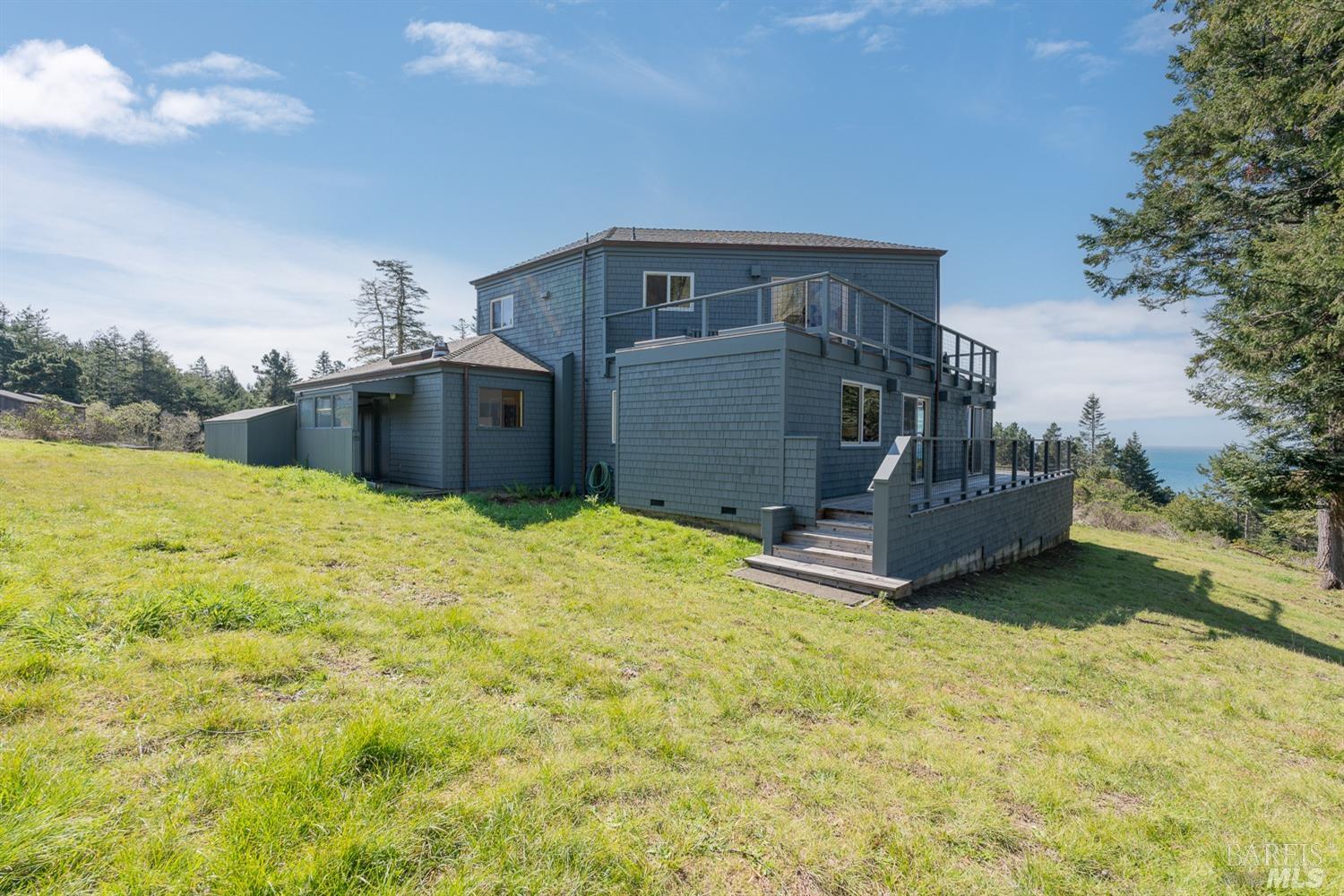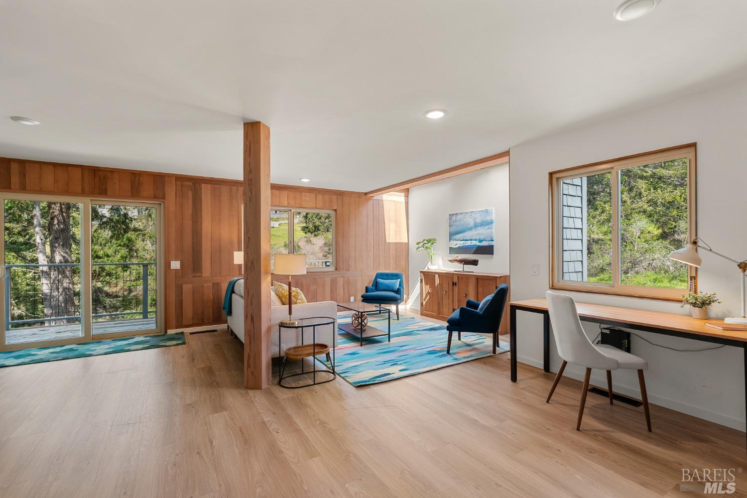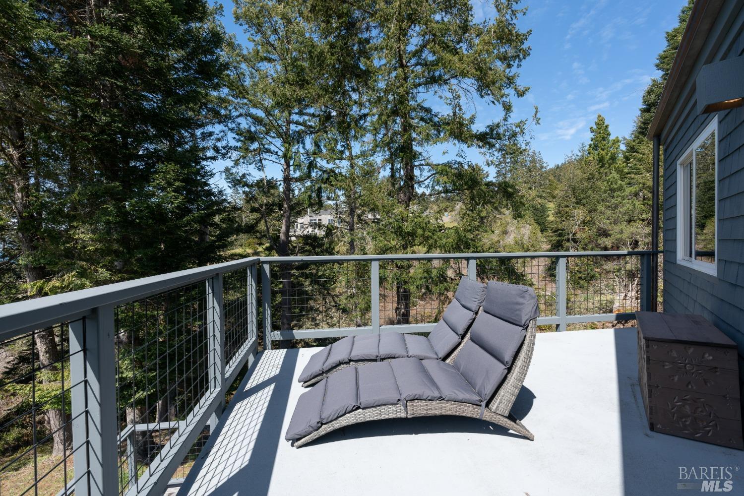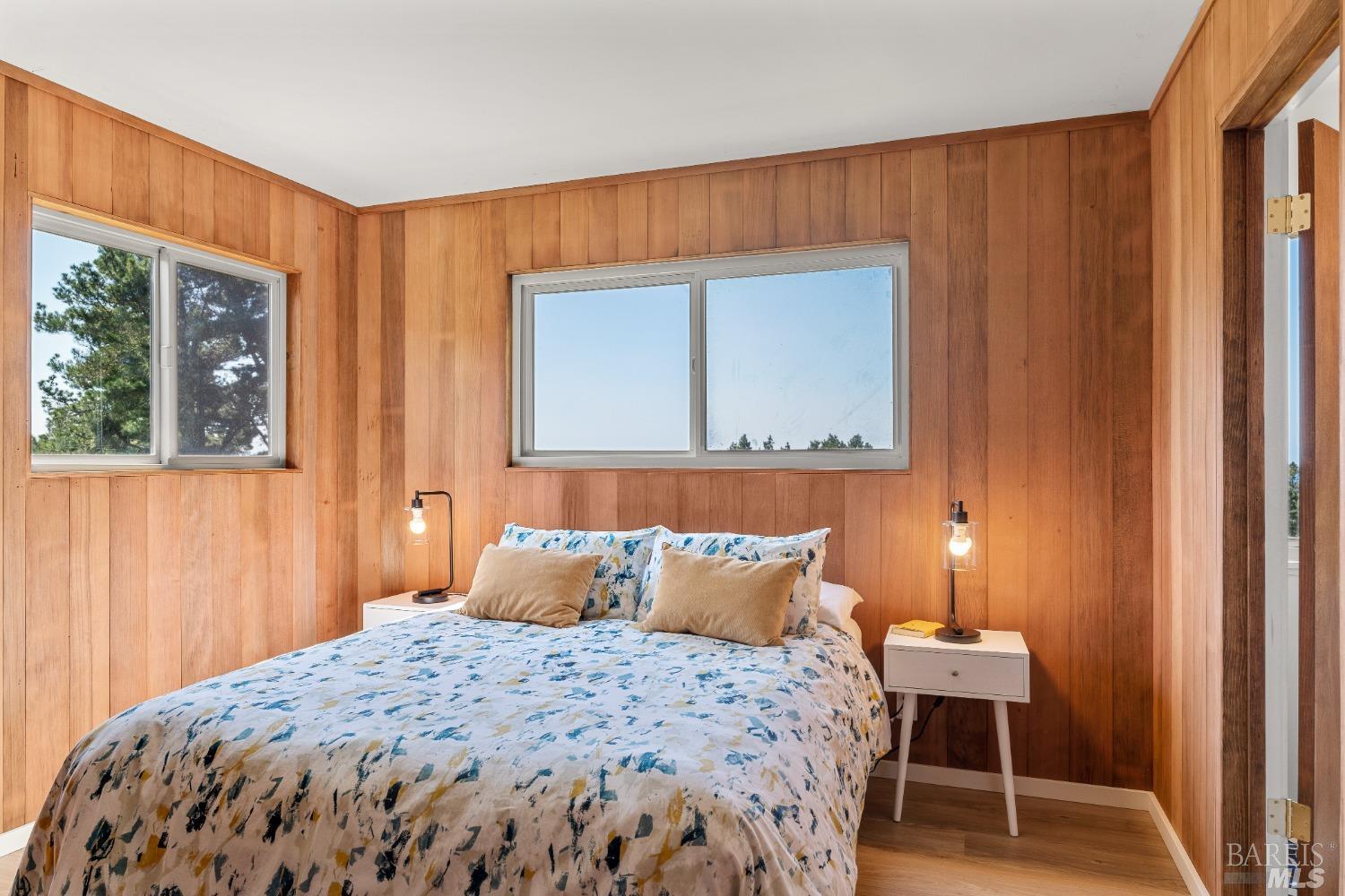 Panoramic white water Smuggler's Cove ocean views on a 0.67 acre double lot meets remodeled 2-bed/2-bath home with iconic Sea Ranch touches. The entire home features modern negative carbon footprint wood-look cork flooring. 1st floor boasts two heritage clear heart redwood-paneled bedrooms and updated en suites with ocean views. On this floor is a large open space for family gaming or media area, yoga, or creative space and (count em!) seven closets. Let your imagination run wild! The primary suite and bonus area have separate exterior access to walk the grounds. Grab the Donlyn Lyndon-inspired yellow hand rail and head upstairs to the eye-catching great room, which opens to three separate decks and features a remodeled kitchen boasting mid century-look vertically-placed Heath tile backsplash, two-tone oak base and matte white upper flat-front cabinets, cement look Caesarstone counters, a huge island for four, LG stainless steel appliances and a wine fridge and bar counter. Lots of mid-century details in the great room incl. Herman Miller lighting. Plenty of extra space with skylit workshop and att. 2-car garage with laundry. The setting on a large private lot invites to hikes North, East, West and South, bicycling and flying home to the airstrip in walking distance of house.