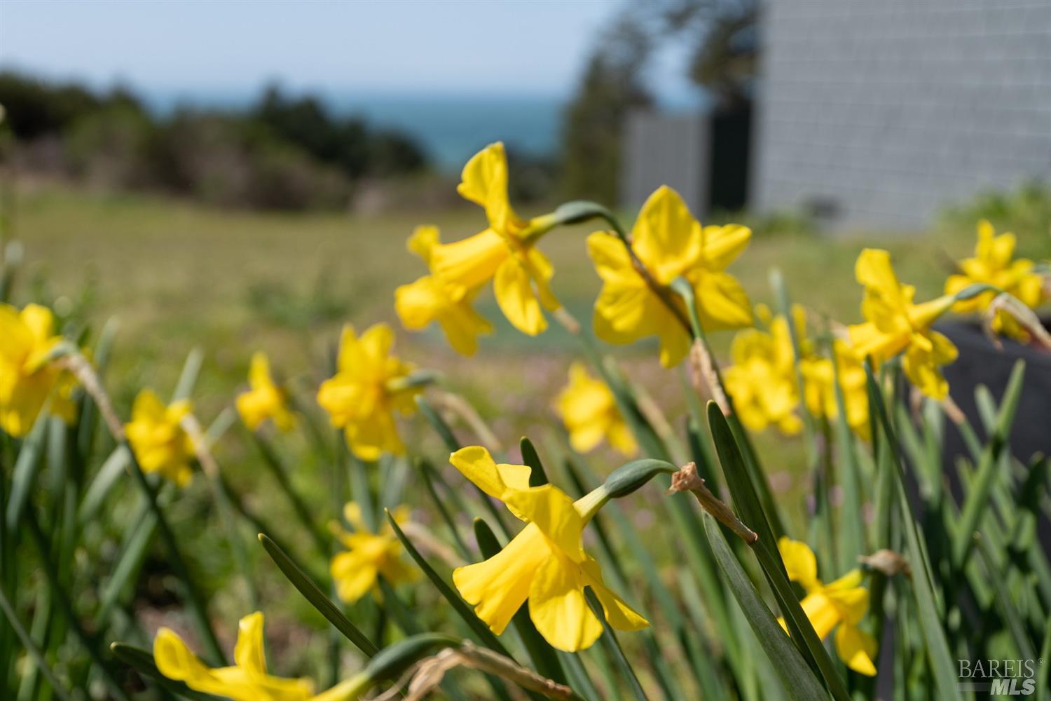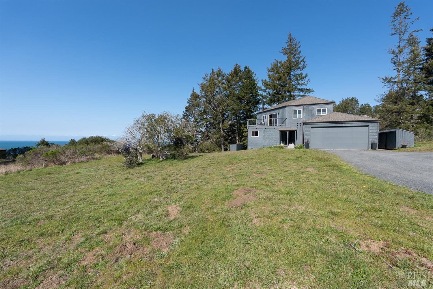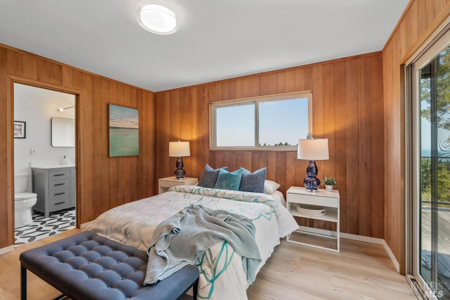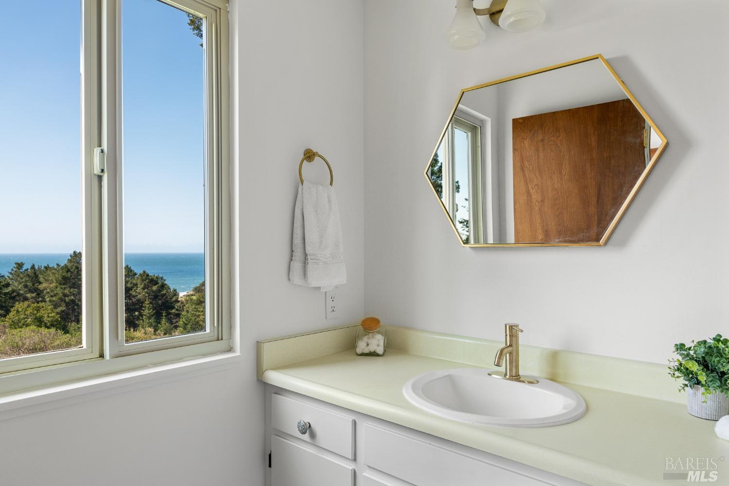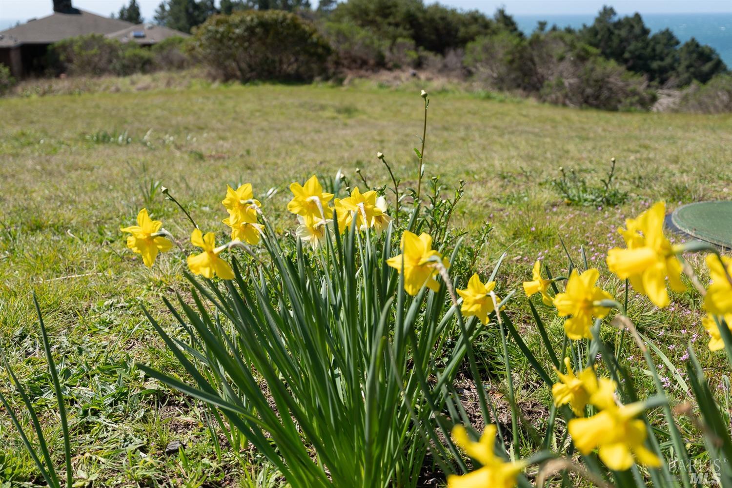 Panoramic white water Smuggler's Cove ocean views on a 0.67 acre double lot meets remodeled 2-bed/2-bath home with iconic Sea Ranch touches. The entire home features modern negative carbon footprint wood-look cork flooring. 1st floor boasts two heritage clear heart redwood-paneled bedrooms and updated en suites with ocean views. On this floor is a large open space for family gaming or media area, yoga, or creative space and (count em!) seven closets. Let your imagination run wild! The primary suite and bonus area have separate exterior access to walk the grounds. Grab the Donlyn Lyndon-inspired yellow hand rail and head upstairs to the eye-catching great room, which opens to three separate decks and features a remodeled kitchen boasting mid century-look vertically-placed Heath tile backsplash, two-tone oak base and matte white upper flat-front cabinets, cement look Caesarstone counters, a huge island for four, LG stainless steel appliances and a wine fridge and bar counter. Lots of mid-century details in the great room incl. Herman Miller lighting. Plenty of extra space with skylit workshop and att. 2-car garage with laundry. The setting on a large private lot invites to hikes North, East, West and South, bicycling and flying home to the airstrip in walking distance of house.