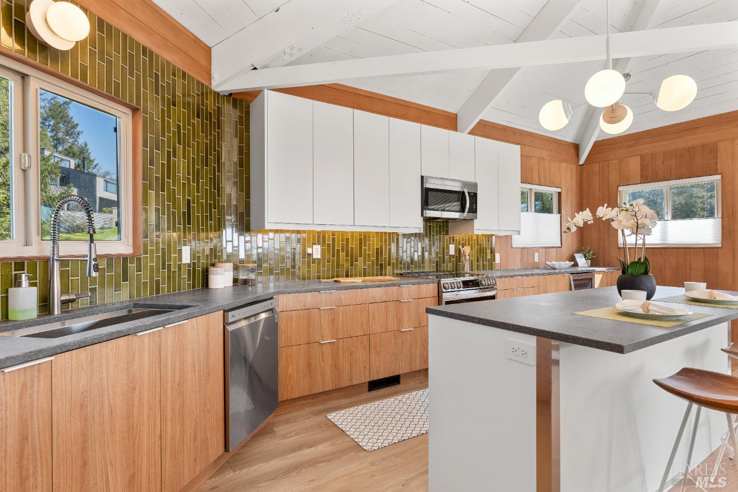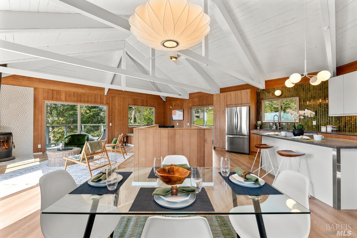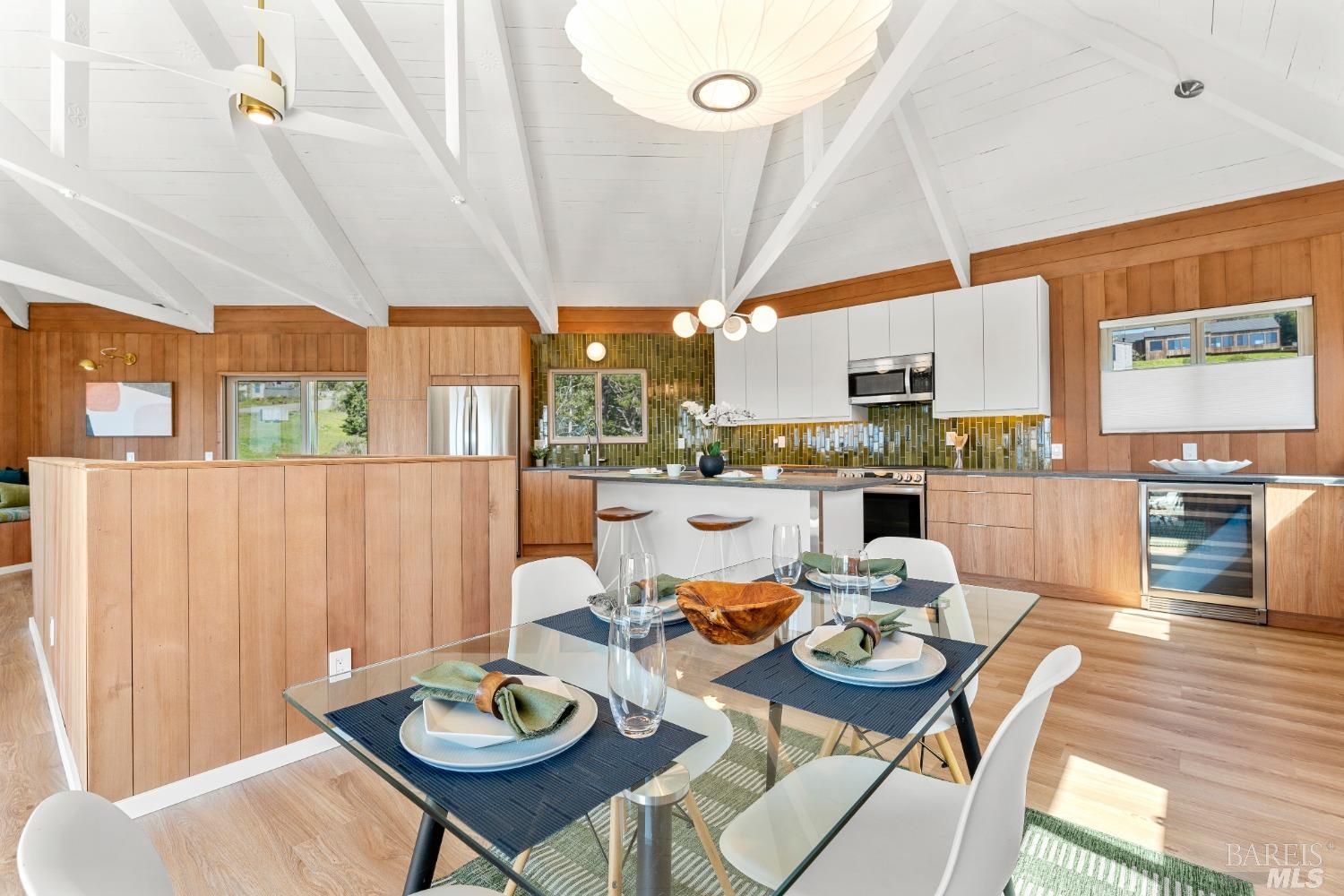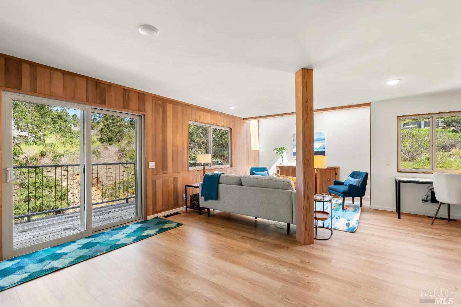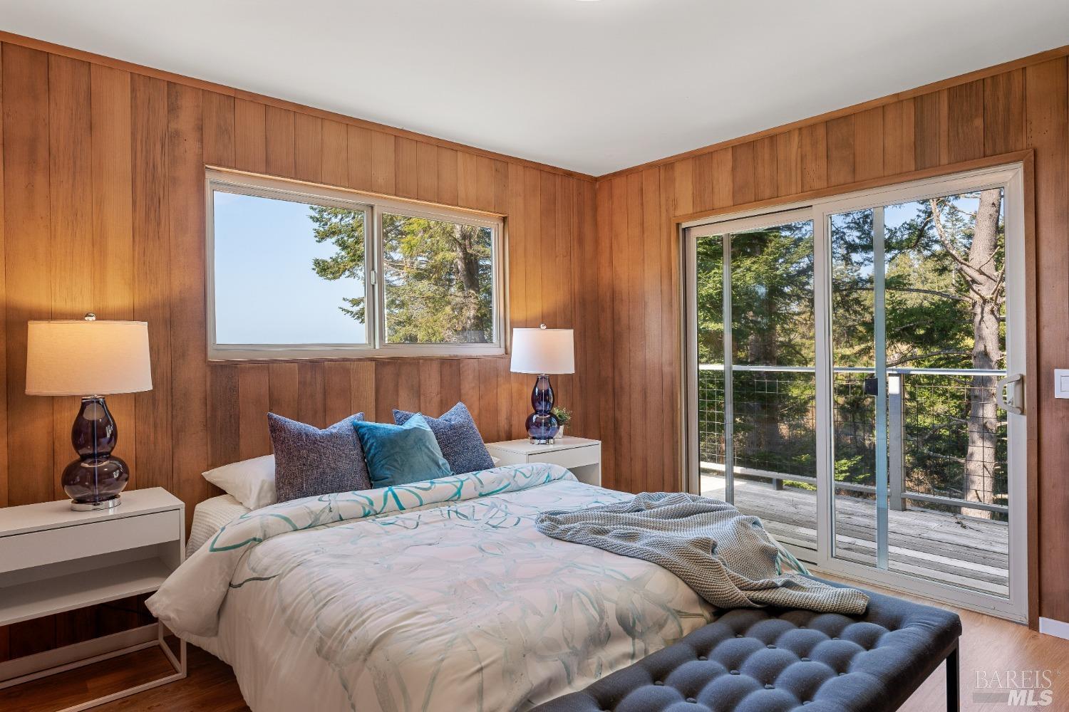 Panoramic white water Smuggler's Cove ocean views on a 0.67 acre double lot meets remodeled 2-bed/2-bath home with iconic Sea Ranch touches. The entire home features modern negative carbon footprint wood-look cork flooring. 1st floor boasts two heritage clear heart redwood-paneled bedrooms and updated en suites with ocean views. On this floor is a large open space for family gaming or media area, yoga, or creative space and (count em!) seven closets. Let your imagination run wild! The primary suite and bonus area have separate exterior access to walk the grounds. Grab the Donlyn Lyndon-inspired yellow hand rail and head upstairs to the eye-catching great room, which opens to three separate decks and features a remodeled kitchen boasting mid century-look vertically-placed Heath tile backsplash, two-tone oak base and matte white upper flat-front cabinets, cement look Caesarstone counters, a huge island for four, LG stainless steel appliances and a wine fridge and bar counter. Lots of mid-century details in the great room incl. Herman Miller lighting. Plenty of extra space with skylit workshop and att. 2-car garage with laundry. The setting on a large private lot invites to hikes North, East, West and South, bicycling and flying home to the airstrip in walking distance of house.