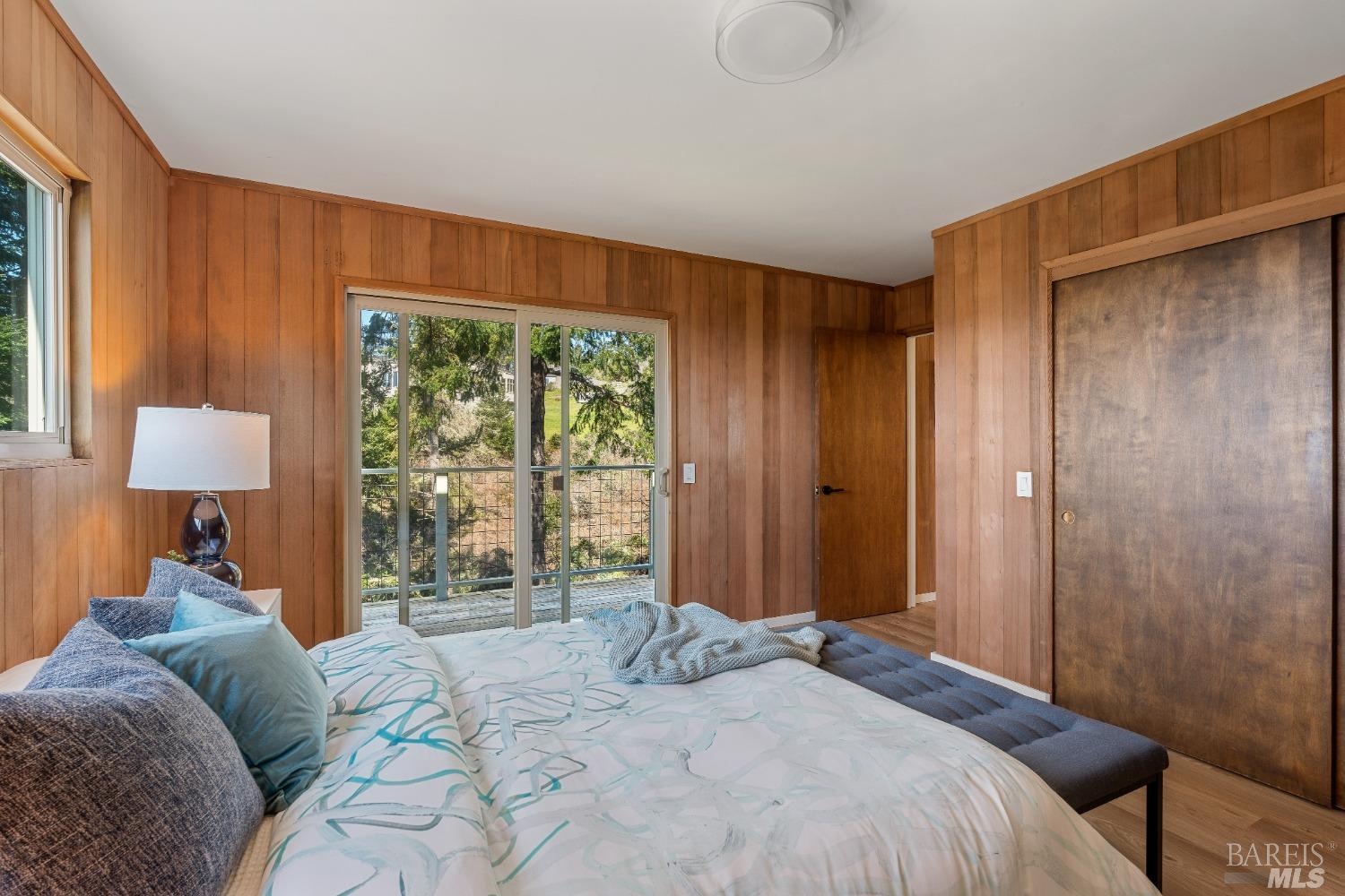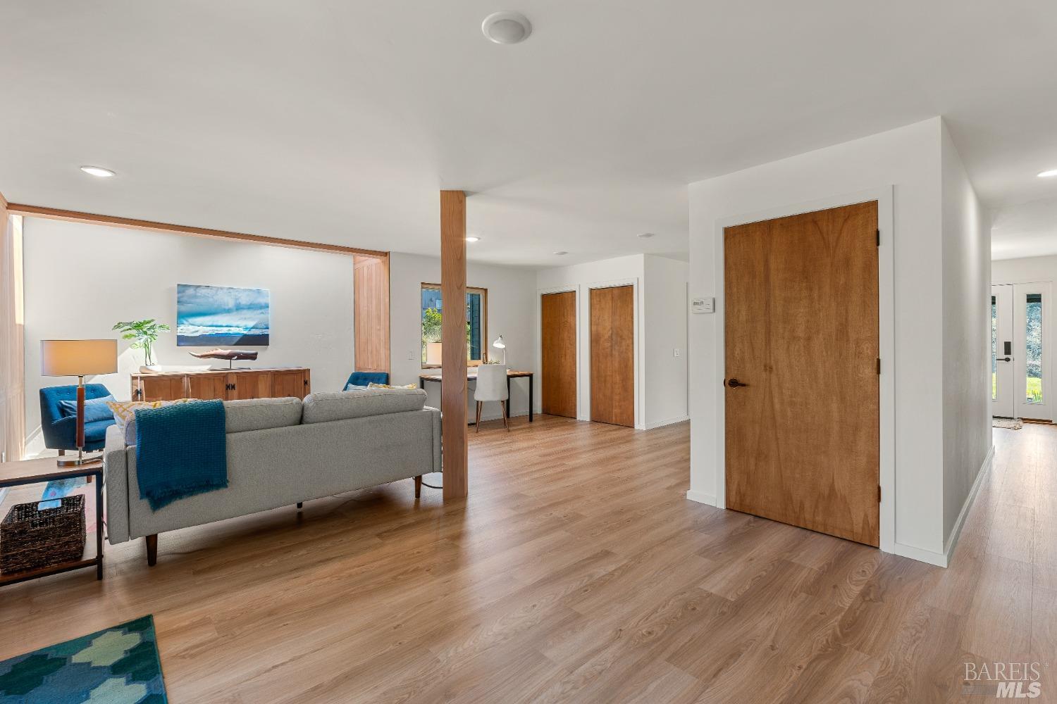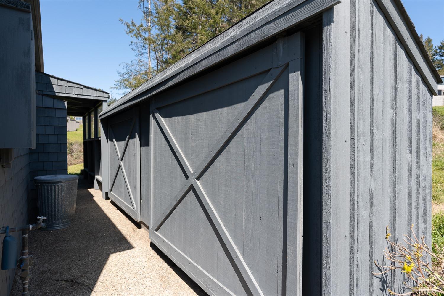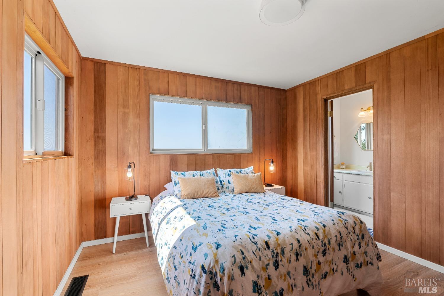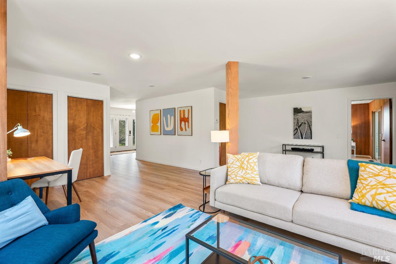 Panoramic white water Smuggler's Cove ocean views on a 0.67 acre double lot meets remodeled 2-bed/2-bath home with iconic Sea Ranch touches. The entire home features modern negative carbon footprint wood-look cork flooring. 1st floor boasts two heritage clear heart redwood-paneled bedrooms and updated en suites with ocean views. On this floor is a large open space for family gaming or media area, yoga, or creative space and (count em!) seven closets. Let your imagination run wild! The primary suite and bonus area have separate exterior access to walk the grounds. Grab the Donlyn Lyndon-inspired yellow hand rail and head upstairs to the eye-catching great room, which opens to three separate decks and features a remodeled kitchen boasting mid century-look vertically-placed Heath tile backsplash, two-tone oak base and matte white upper flat-front cabinets, cement look Caesarstone counters, a huge island for four, LG stainless steel appliances and a wine fridge and bar counter. Lots of mid-century details in the great room incl. Herman Miller lighting. Plenty of extra space with skylit workshop and att. 2-car garage with laundry. The setting on a large private lot invites to hikes North, East, West and South, bicycling and flying home to the airstrip in walking distance of house.