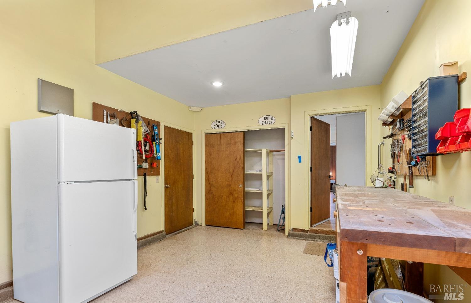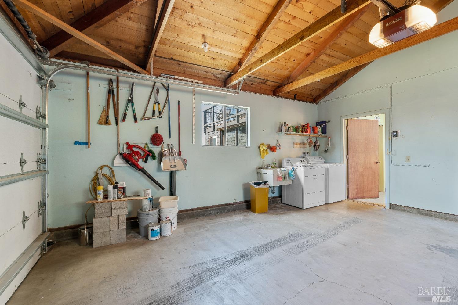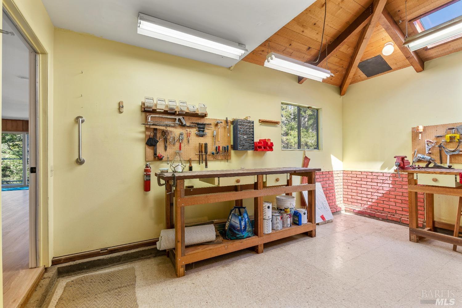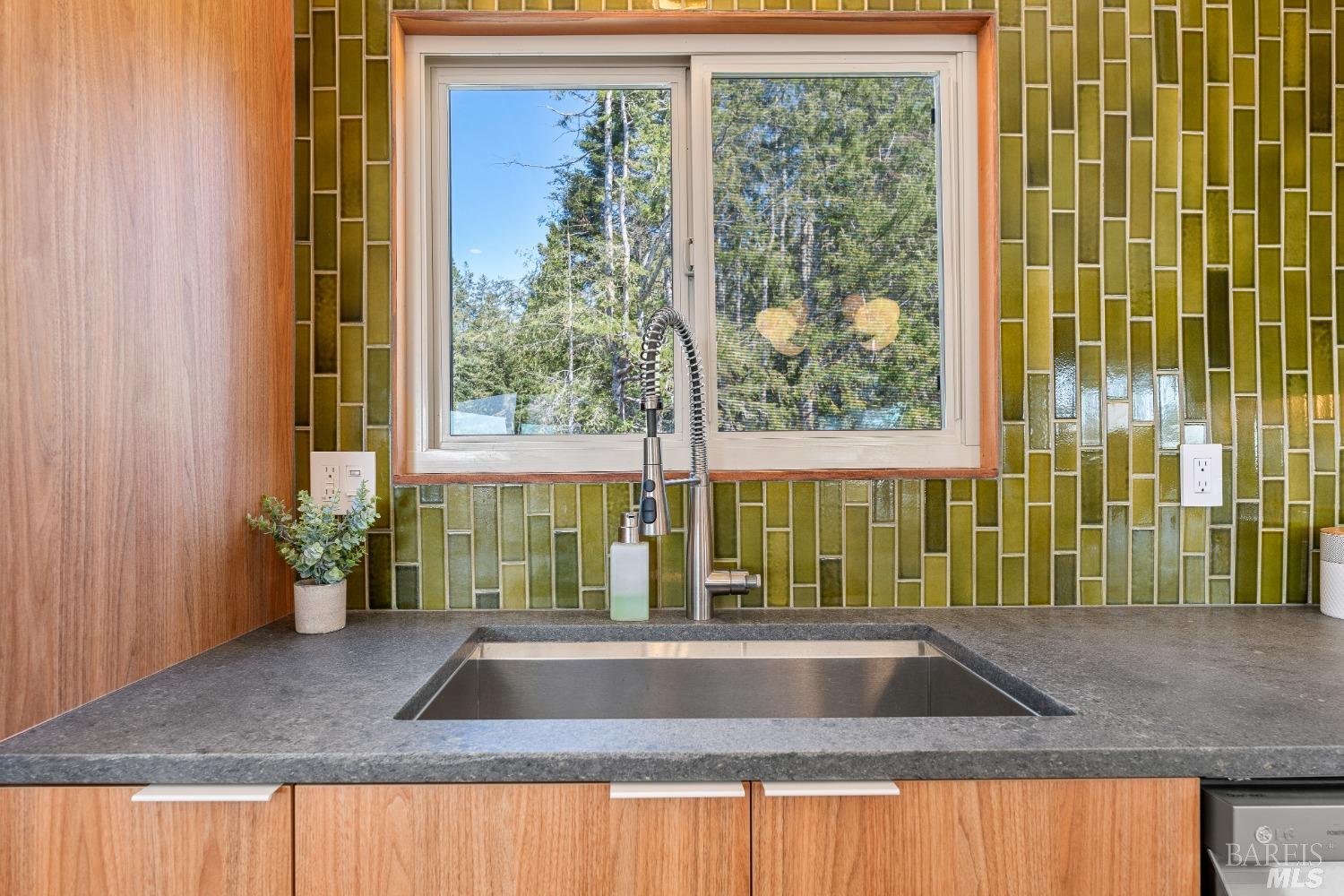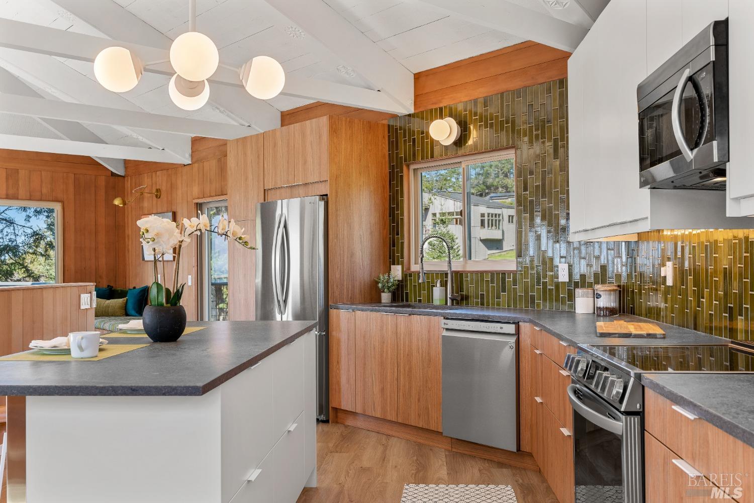 Panoramic white water Smuggler's Cove ocean views on a 0.67 acre double lot meets remodeled 2-bed/2-bath home with iconic Sea Ranch touches. The entire home features modern negative carbon footprint wood-look cork flooring. 1st floor boasts two heritage clear heart redwood-paneled bedrooms and updated en suites with ocean views. On this floor is a large open space for family gaming or media area, yoga, or creative space and (count em!) seven closets. Let your imagination run wild! The primary suite and bonus area have separate exterior access to walk the grounds. Grab the Donlyn Lyndon-inspired yellow hand rail and head upstairs to the eye-catching great room, which opens to three separate decks and features a remodeled kitchen boasting mid century-look vertically-placed Heath tile backsplash, two-tone oak base and matte white upper flat-front cabinets, cement look Caesarstone counters, a huge island for four, LG stainless steel appliances and a wine fridge and bar counter. Lots of mid-century details in the great room incl. Herman Miller lighting. Plenty of extra space with skylit workshop and att. 2-car garage with laundry. The setting on a large private lot invites to hikes North, East, West and South, bicycling and flying home to the airstrip in walking distance of house.