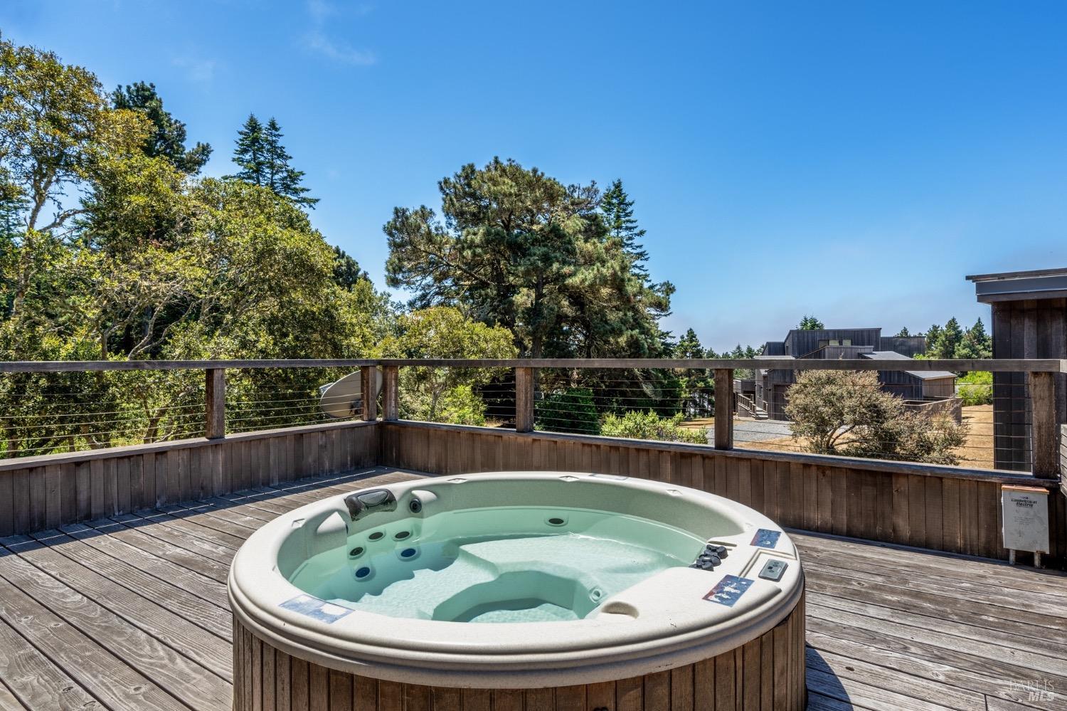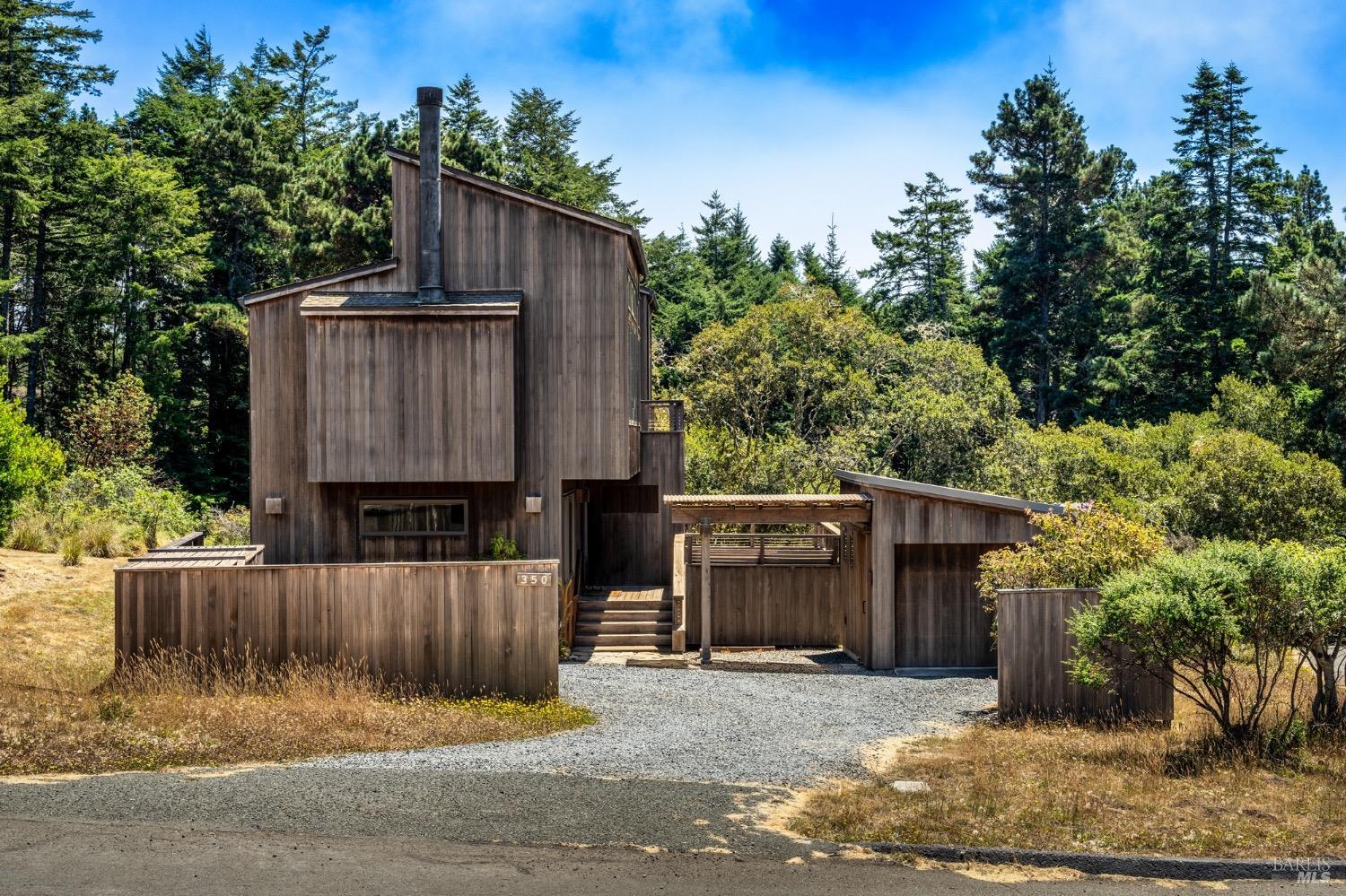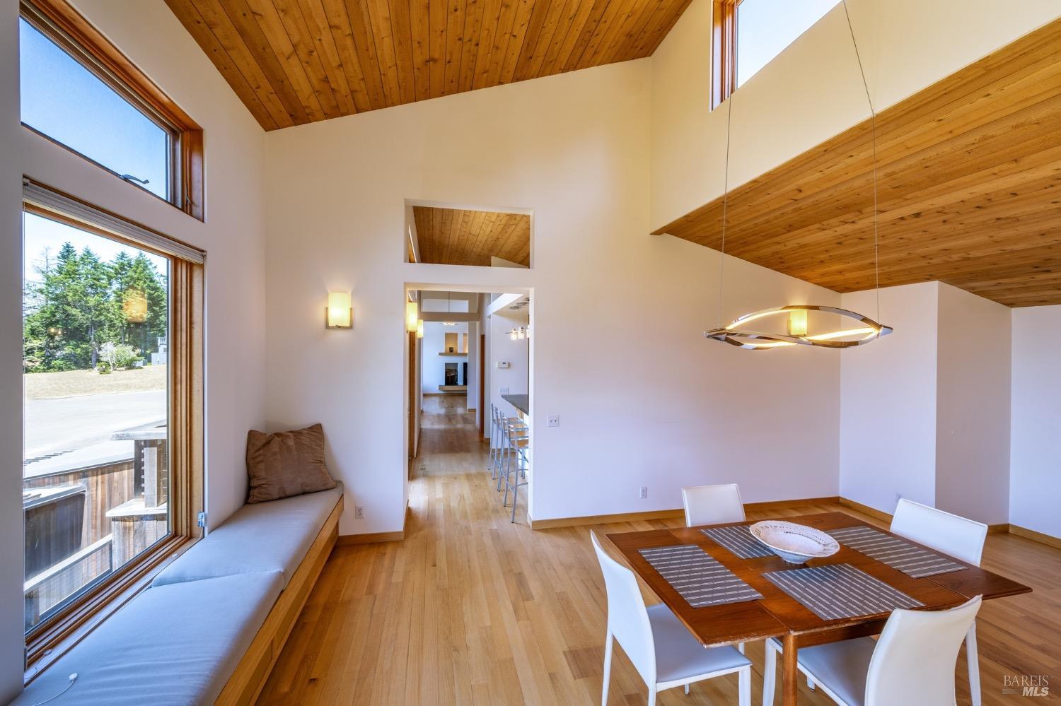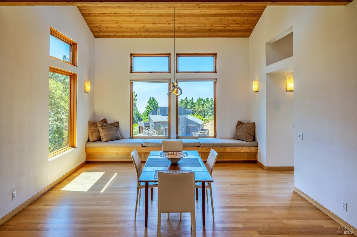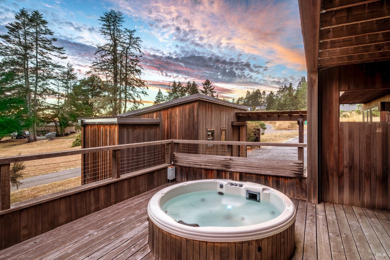 Cross the threshold into this light, bright and contemporary Sea Ranch home with ocean views, inviting interior and plenty of natural light. Stylish living room with open beam ceiling, wood flooring, wood burning fireplace and built-in-window seat for added seating and comfort. Spacious dining room with high ceilings lends itself to formal dining occasions or casual meals anytime of the day or night. Kitchen with views features stainless steel appliances, gas range and double sink. Breakfast bar accommodates 4 stools. Half bathroom conveniently located close to LR/DR/Kitchen. Sliding glass door adjacent to kitchen leads to outdoor deck making it an ideal spot to take in the view or barbeque. Primary bedroom with tastefully appointed ensuite primary bathroom has windows for natural light, closet, dual sinks and tiled walk-in shower stall with glass door. Walk-in-closet allows for extra storage. Guest bedroom offers privacy and includes a built-in window seat to recline and unwind. Guest bathroom has dual vanity and shower over tub. Deck with hot tub will ease your cares away. Detached garage with storage and partially fenced enclosure allows for extra parking. Cul-de-sac location. Must be seen to be appreciated!