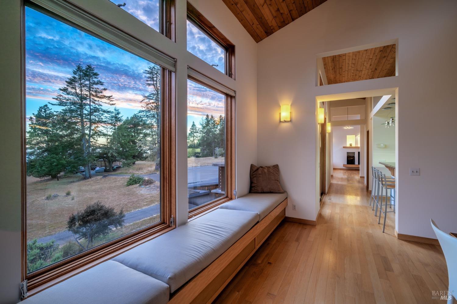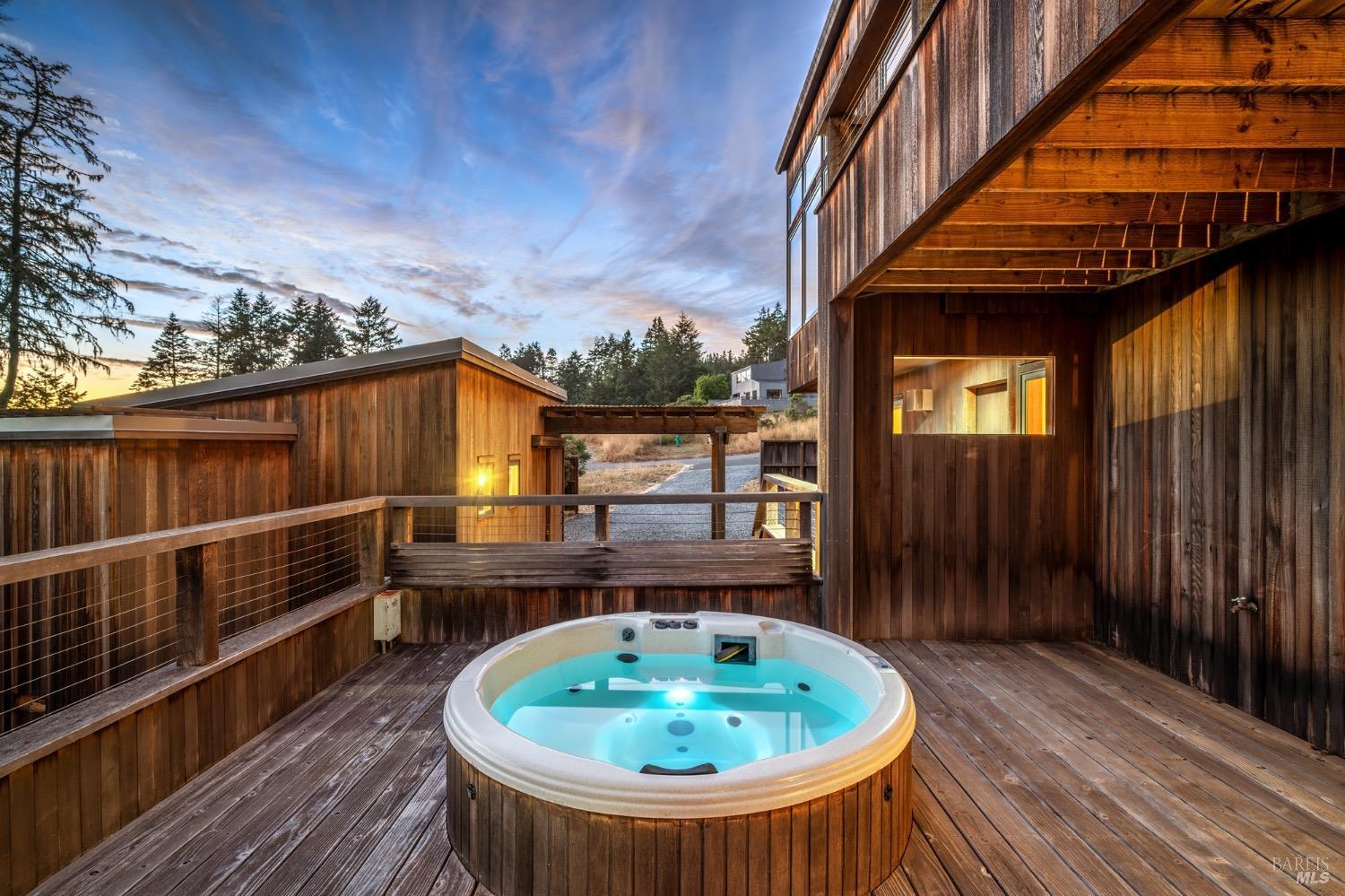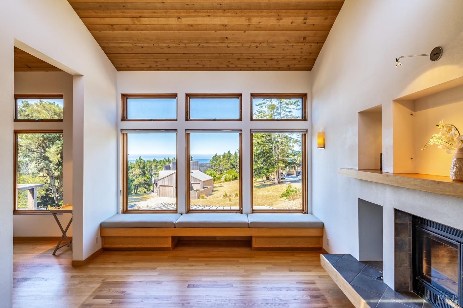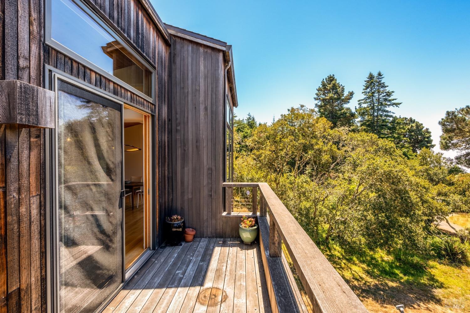 Cross the threshold into this light, bright and contemporary Sea Ranch home with ocean views, inviting interior and plenty of natural light. Stylish living room with open beam ceiling, wood flooring, wood burning fireplace and built-in-window seat for added seating and comfort. Spacious dining room with high ceilings lends itself to formal dining occasions or casual meals anytime of the day or night. Kitchen with views features stainless steel appliances, gas range and double sink. Breakfast bar accommodates 4 stools. Half bathroom conveniently located close to LR/DR/Kitchen. Sliding glass door adjacent to kitchen leads to outdoor deck making it an ideal spot to take in the view or barbeque. Primary bedroom with tastefully appointed ensuite primary bathroom has windows for natural light, closet, dual sinks and tiled walk-in shower stall with glass door. Walk-in-closet allows for extra storage. Guest bedroom offers privacy and includes a built-in window seat to recline and unwind. Guest bathroom has dual vanity and shower over tub. Deck with hot tub will ease your cares away. Detached garage with storage and partially fenced enclosure allows for extra parking. Cul-de-sac location. Must be seen to be appreciated!