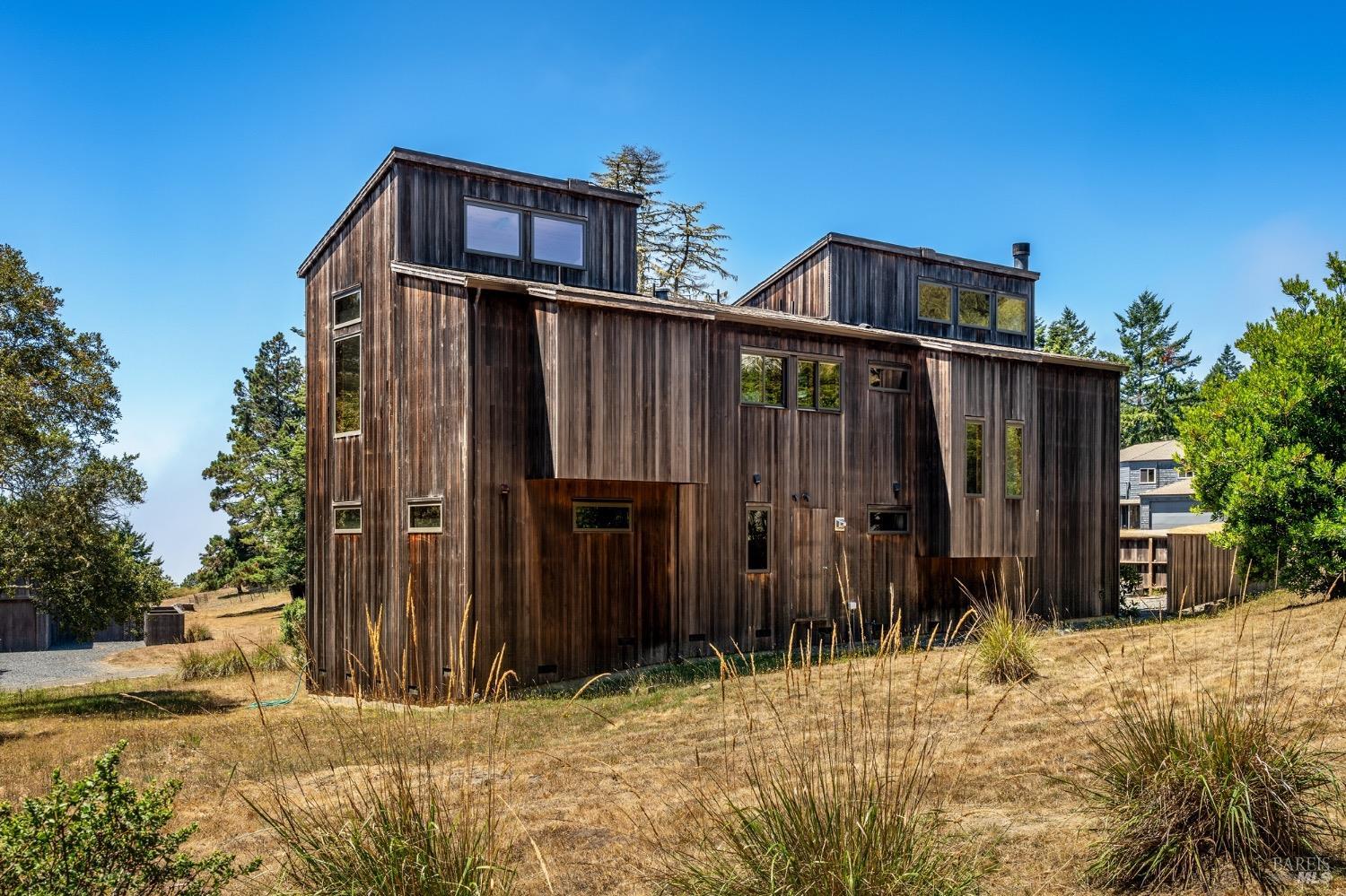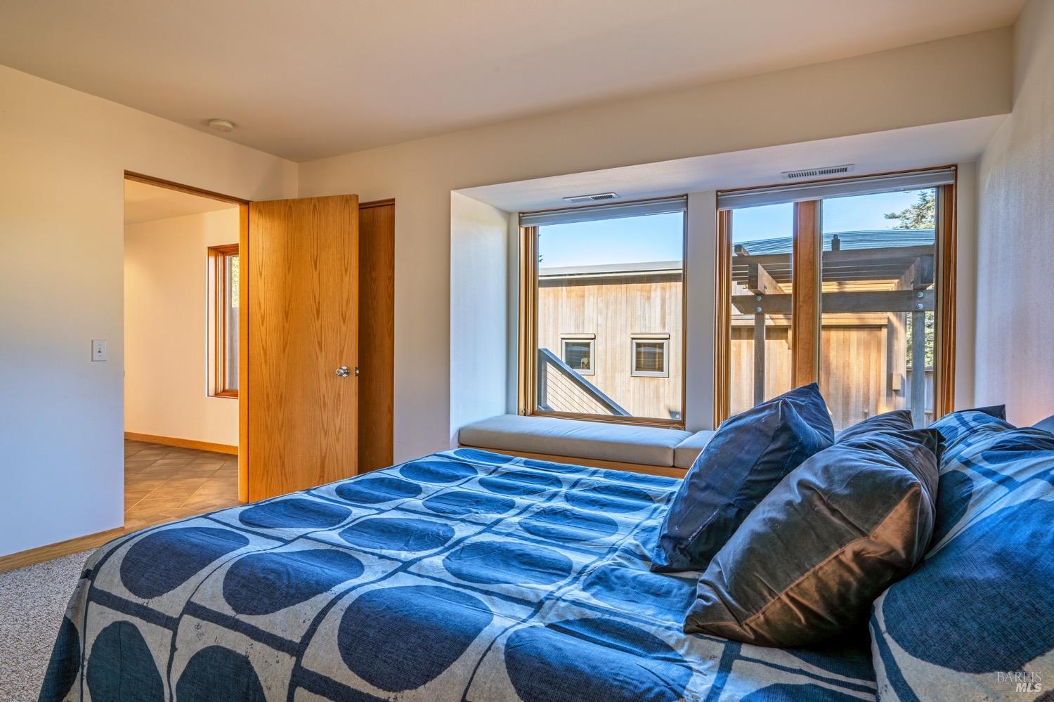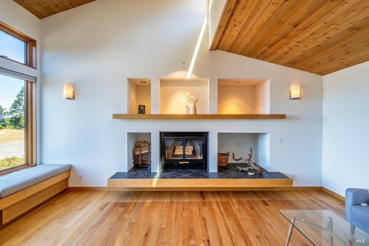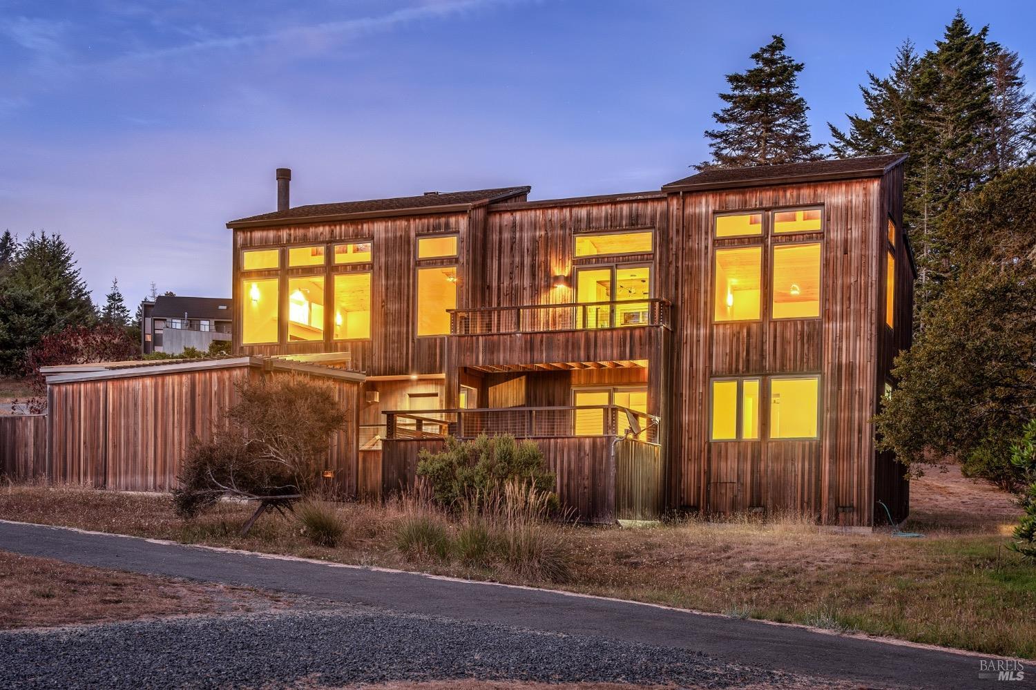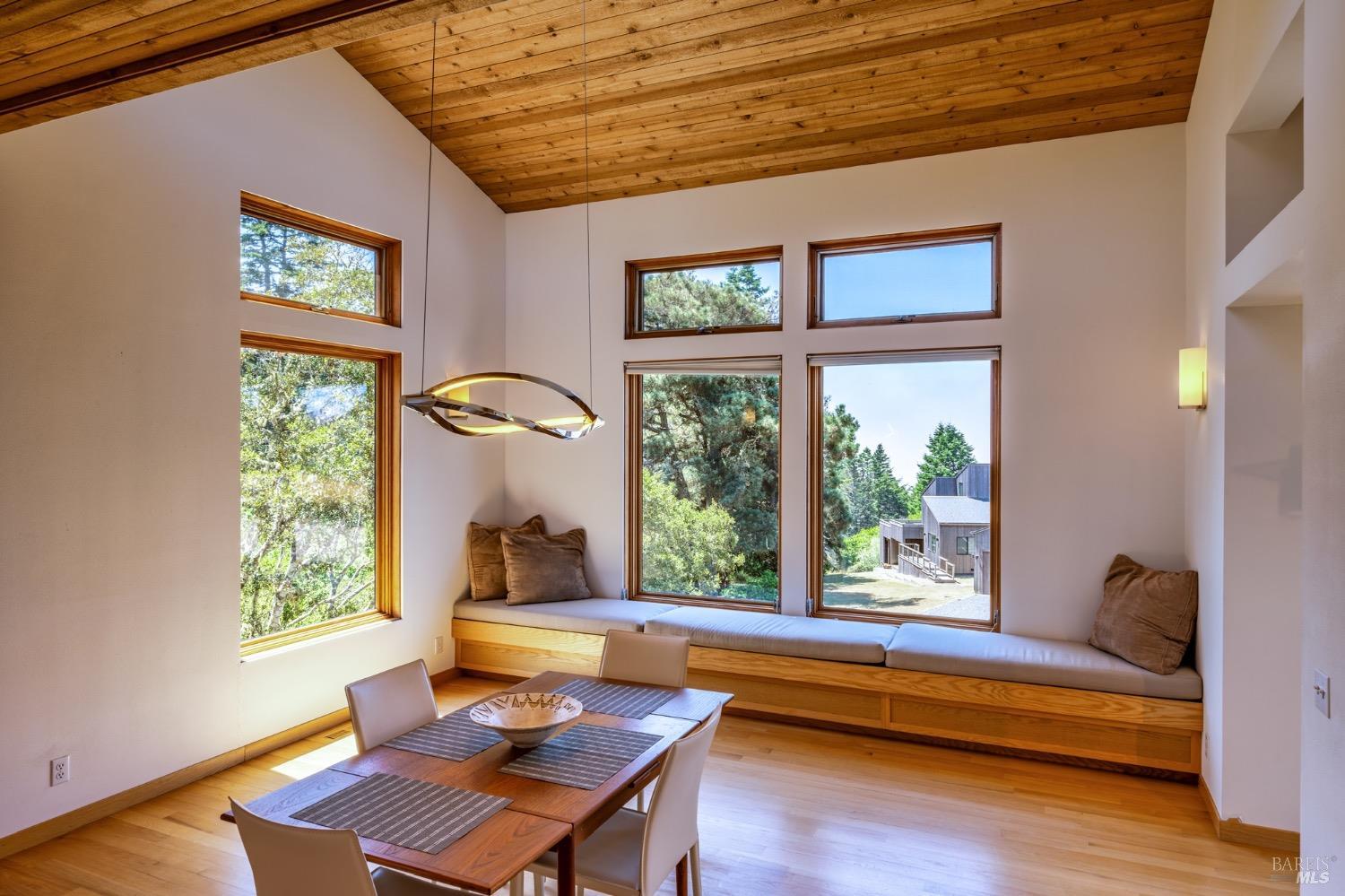 Cross the threshold into this light, bright and contemporary Sea Ranch home with ocean views, inviting interior and plenty of natural light. Stylish living room with open beam ceiling, wood flooring, wood burning fireplace and built-in-window seat for added seating and comfort. Spacious dining room with high ceilings lends itself to formal dining occasions or casual meals anytime of the day or night. Kitchen with views features stainless steel appliances, gas range and double sink. Breakfast bar accommodates 4 stools. Half bathroom conveniently located close to LR/DR/Kitchen. Sliding glass door adjacent to kitchen leads to outdoor deck making it an ideal spot to take in the view or barbeque. Primary bedroom with tastefully appointed ensuite primary bathroom has windows for natural light, closet, dual sinks and tiled walk-in shower stall with glass door. Walk-in-closet allows for extra storage. Guest bedroom offers privacy and includes a built-in window seat to recline and unwind. Guest bathroom has dual vanity and shower over tub. Deck with hot tub will ease your cares away. Detached garage with storage and partially fenced enclosure allows for extra parking. Cul-de-sac location. Must be seen to be appreciated!