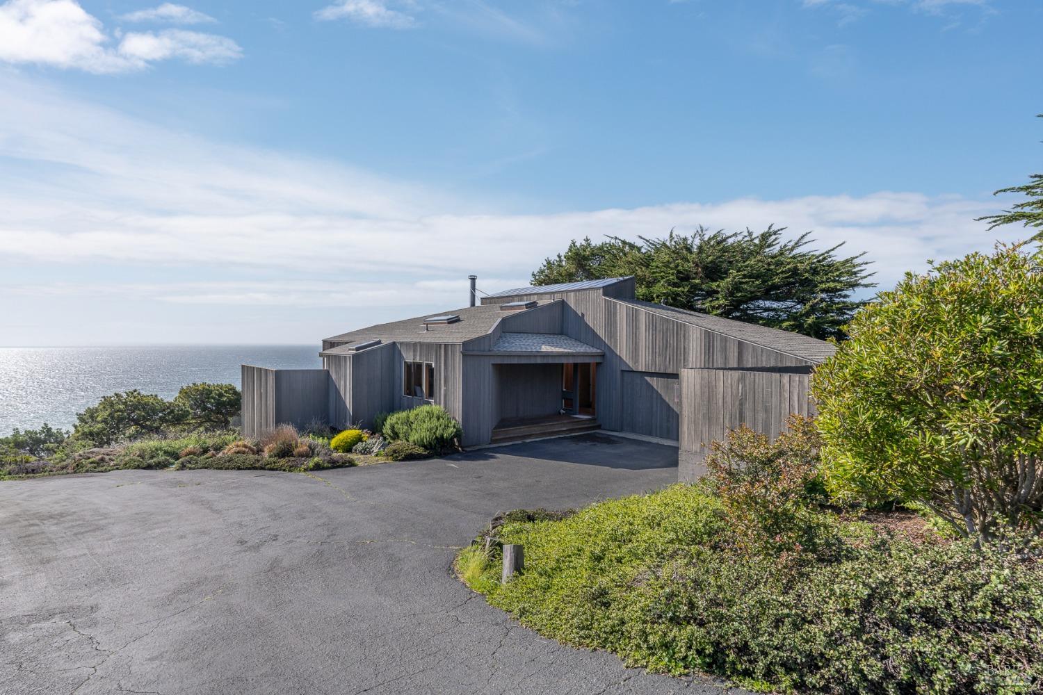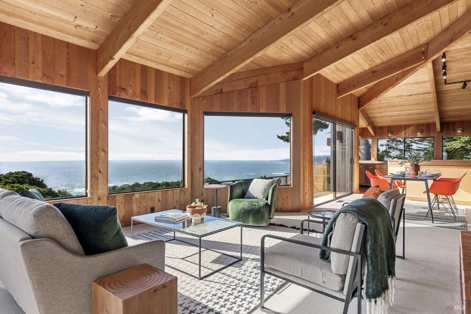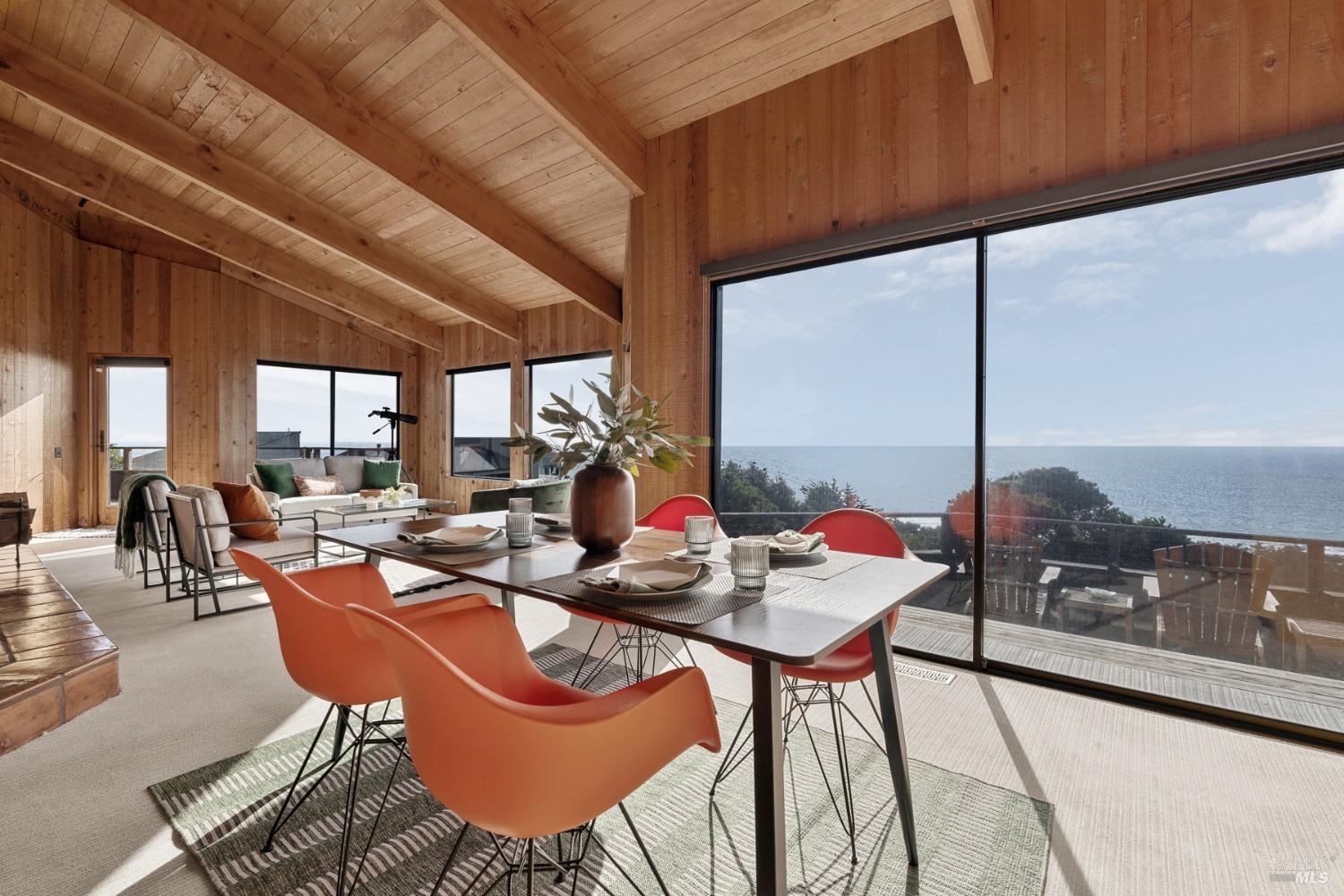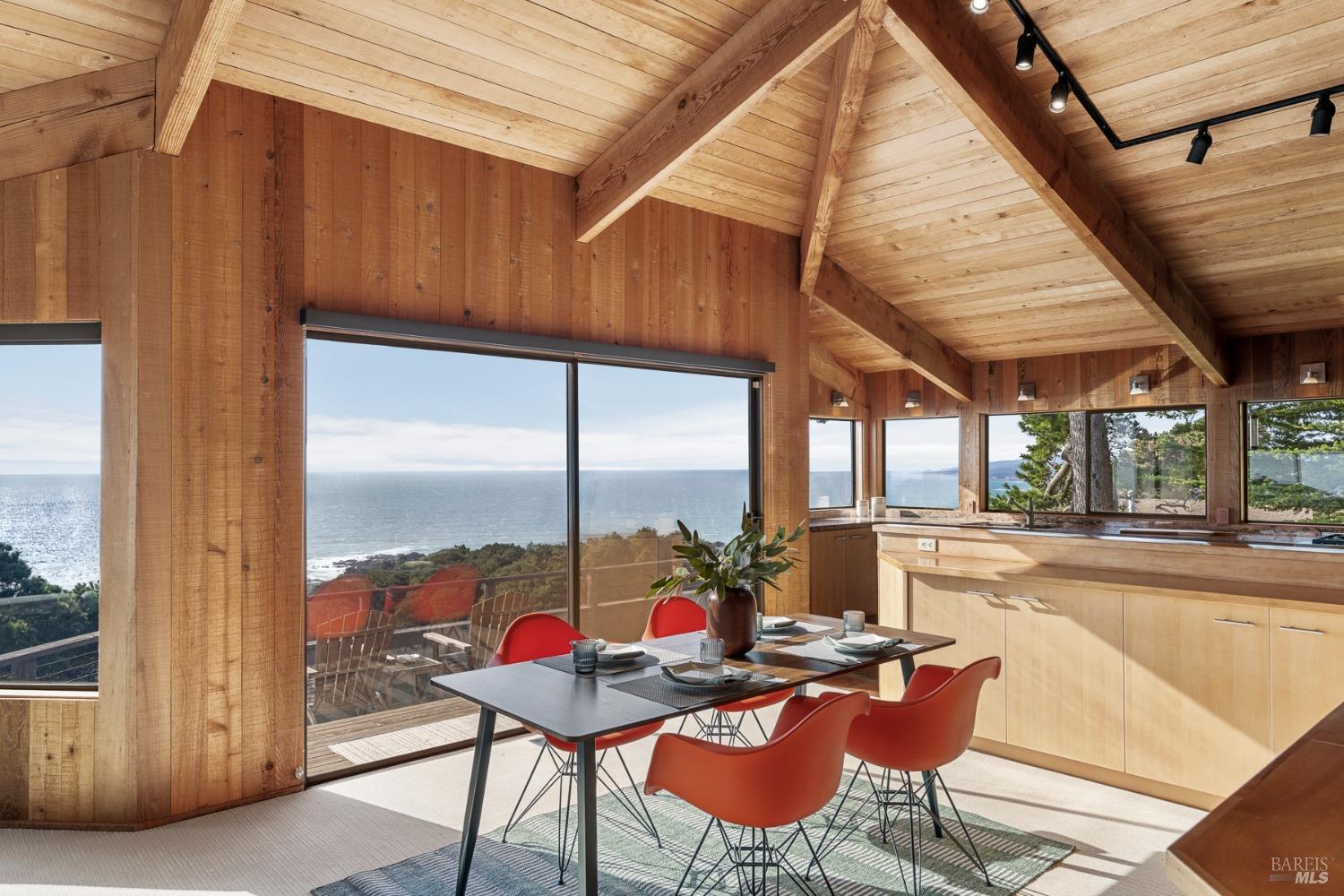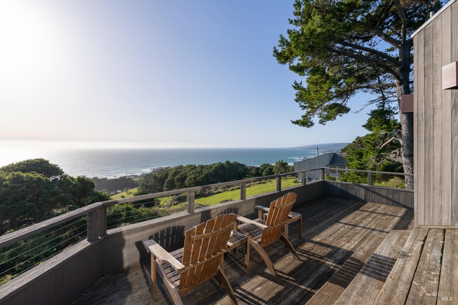 This is your opportunity to buy a classic Sea Ranch home in a fantastic location designed by renowned architect Don Jacobs. Admire the exceptional detail and the craftsmanship by legendary original contractor Matt Sylvia, who built Condo 1, the Lodge, Moonraker Center, and many iconic homes in this unique community. Walking through the sunlit hallway covered with skylights you enter the extensive living/dining/kitchen area with breathtaking panoramic white water views towards Black Point and down the northern coastline all the way to Fish Rock at Anchor Bay. Step down onto the deck and feel like you're on top of the world. The spacious kitchen with high end appliances and built-ins is open to the dining area and a perfect space to entertain family and friends. Off the hallway are two bedrooms and a 12'x 20' Studio. The master bedroom has an updated ensuite bathroom with access to the hot tub deck with ocean view. There is a two-car garage and plenty of guest parking. You are just minutes away from beautiful Black Point Beach, the Sea Ranch Lodge for dining and Moonraker Rec Center with heated pool, sauna and pickle ball court. Whether you enjoy the sunset from your deck or hike the nearby trails, you will be captivated by the peace and quiet of this magical place.