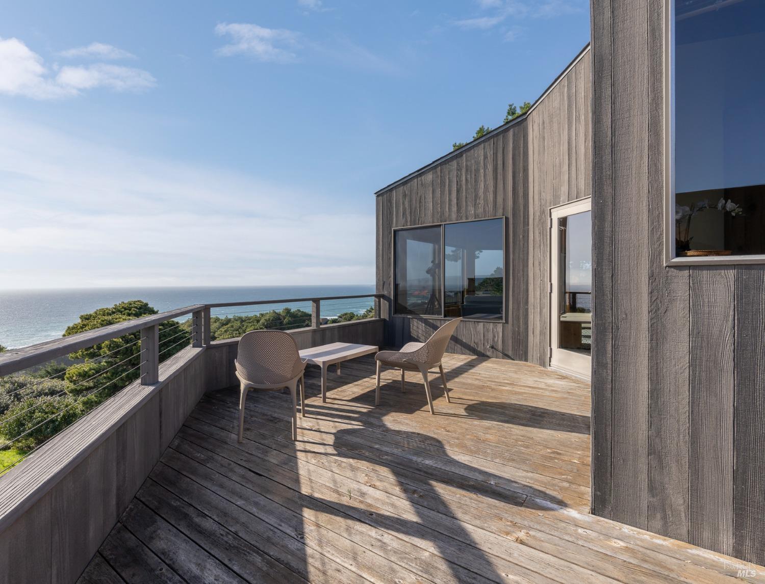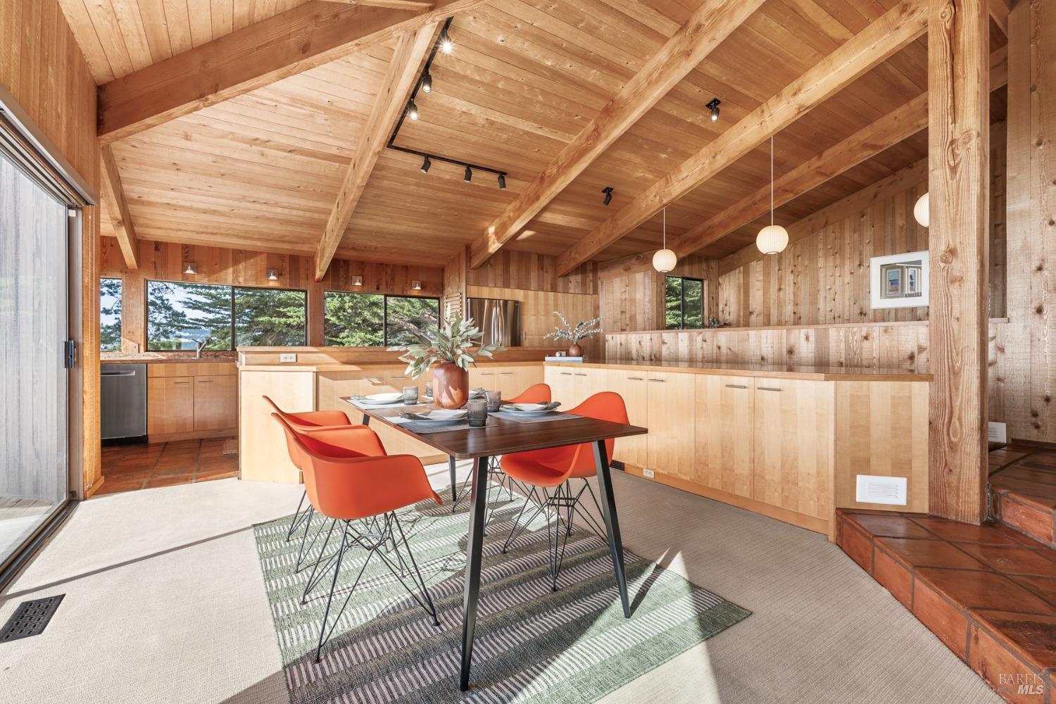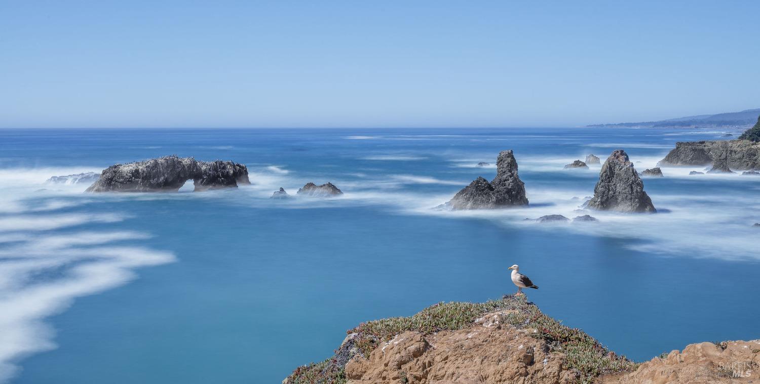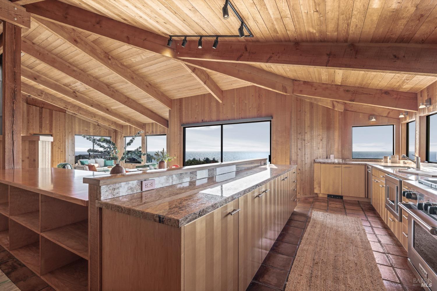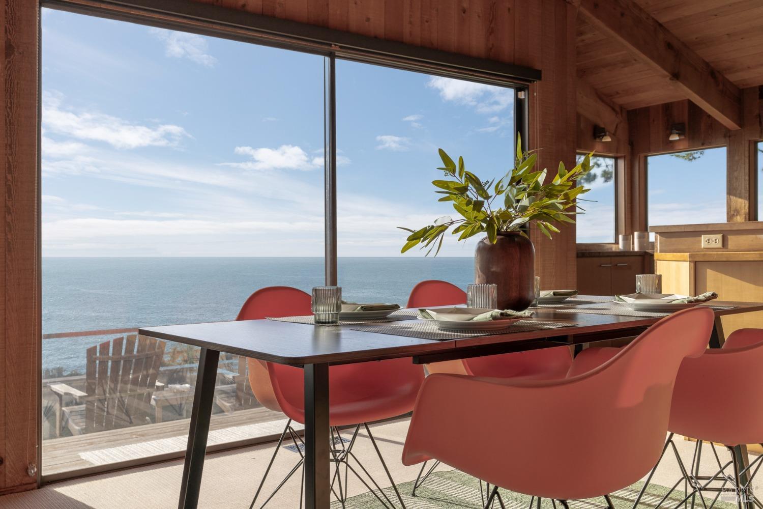 This is your opportunity to buy a classic Sea Ranch home in a fantastic location designed by renowned architect Don Jacobs. Admire the exceptional detail and the craftsmanship by legendary original contractor Matt Sylvia, who built Condo 1, the Lodge, Moonraker Center, and many iconic homes in this unique community. Walking through the sunlit hallway covered with skylights you enter the extensive living/dining/kitchen area with breathtaking panoramic white water views towards Black Point and down the northern coastline all the way to Fish Rock at Anchor Bay. Step down onto the deck and feel like you're on top of the world. The spacious kitchen with high end appliances and built-ins is open to the dining area and a perfect space to entertain family and friends. Off the hallway are two bedrooms and a 12'x 20' Studio. The master bedroom has an updated ensuite bathroom with access to the hot tub deck with ocean view. There is a two-car garage and plenty of guest parking. You are just minutes away from beautiful Black Point Beach, the Sea Ranch Lodge for dining and Moonraker Rec Center with heated pool, sauna and pickle ball court. Whether you enjoy the sunset from your deck or hike the nearby trails, you will be captivated by the peace and quiet of this magical place.