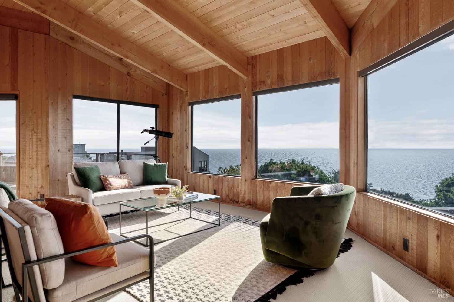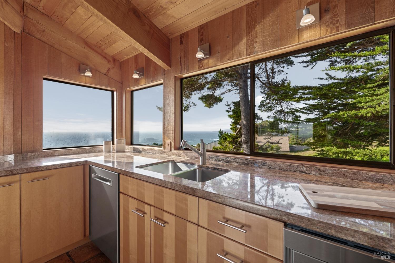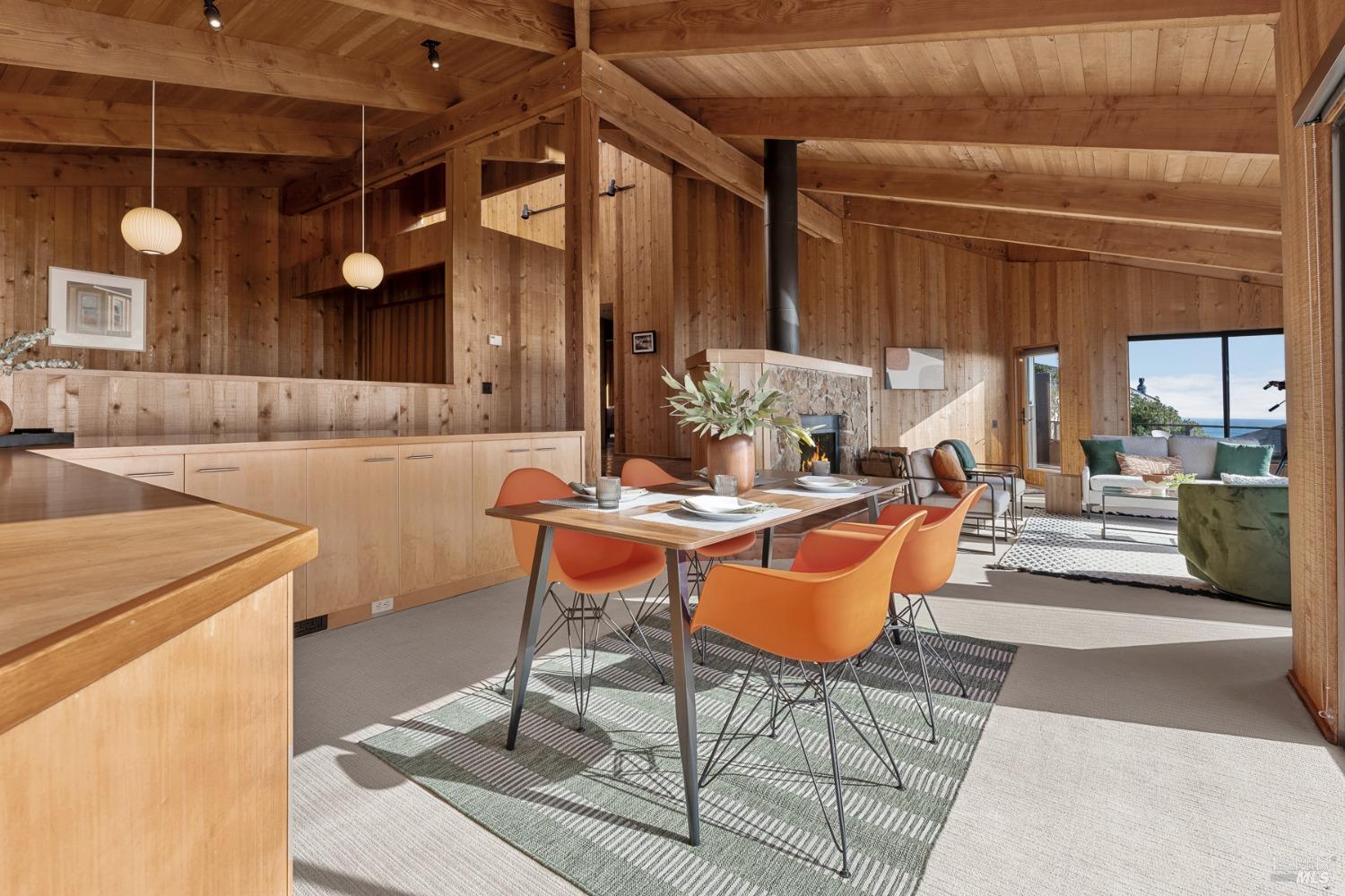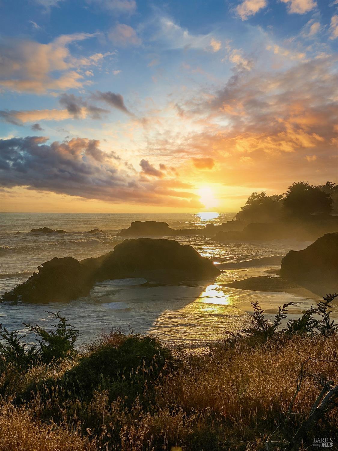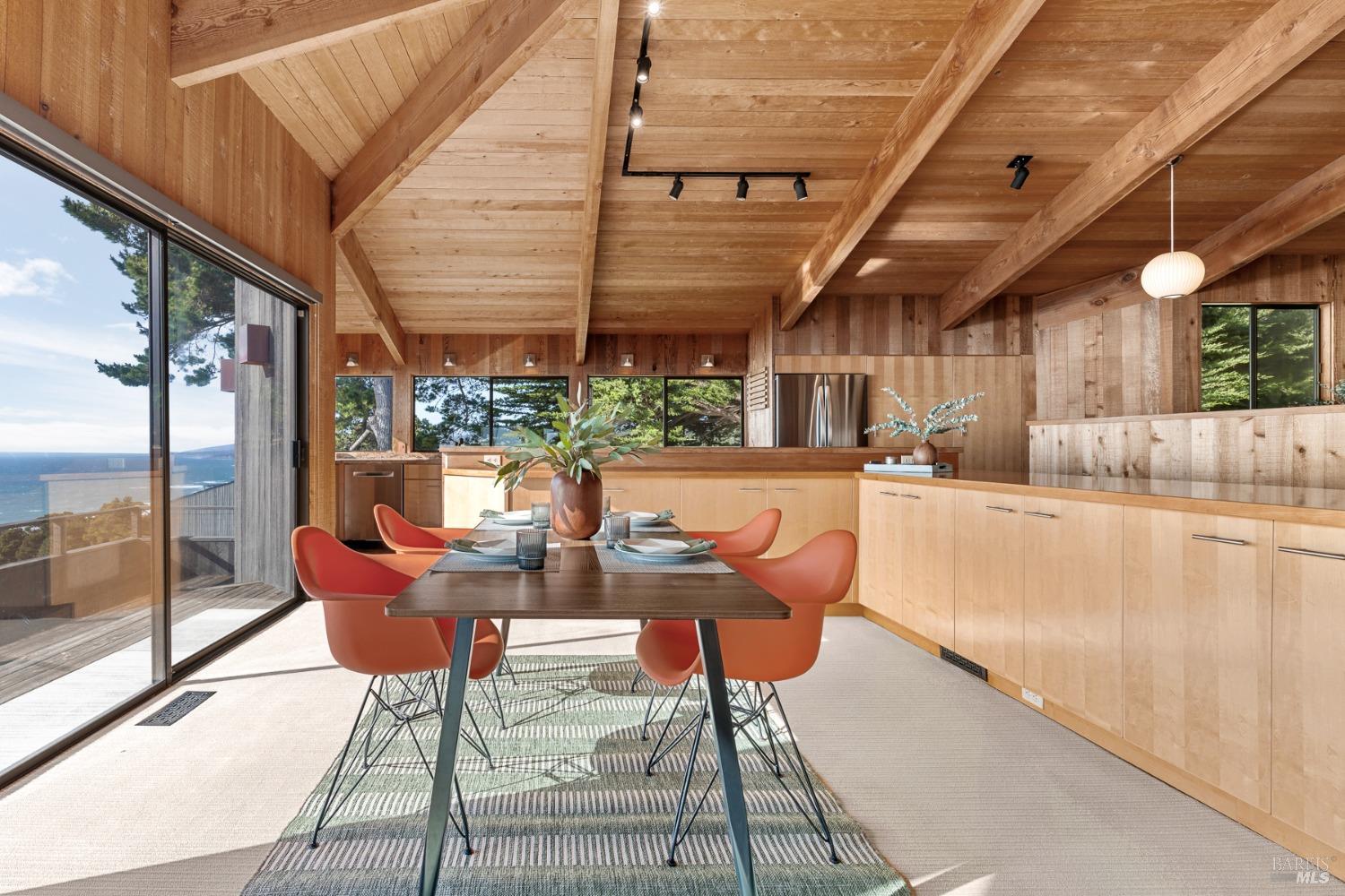 This is your opportunity to buy a classic Sea Ranch home in a fantastic location designed by renowned architect Don Jacobs. Admire the exceptional detail and the craftsmanship by legendary original contractor Matt Sylvia, who built Condo 1, the Lodge, Moonraker Center, and many iconic homes in this unique community. Walking through the sunlit hallway covered with skylights you enter the extensive living/dining/kitchen area with breathtaking panoramic white water views towards Black Point and down the northern coastline all the way to Fish Rock at Anchor Bay. Step down onto the deck and feel like you're on top of the world. The spacious kitchen with high end appliances and built-ins is open to the dining area and a perfect space to entertain family and friends. Off the hallway are two bedrooms and a 12'x 20' Studio. The master bedroom has an updated ensuite bathroom with access to the hot tub deck with ocean view. There is a two-car garage and plenty of guest parking. You are just minutes away from beautiful Black Point Beach, the Sea Ranch Lodge for dining and Moonraker Rec Center with heated pool, sauna and pickle ball court. Whether you enjoy the sunset from your deck or hike the nearby trails, you will be captivated by the peace and quiet of this magical place.