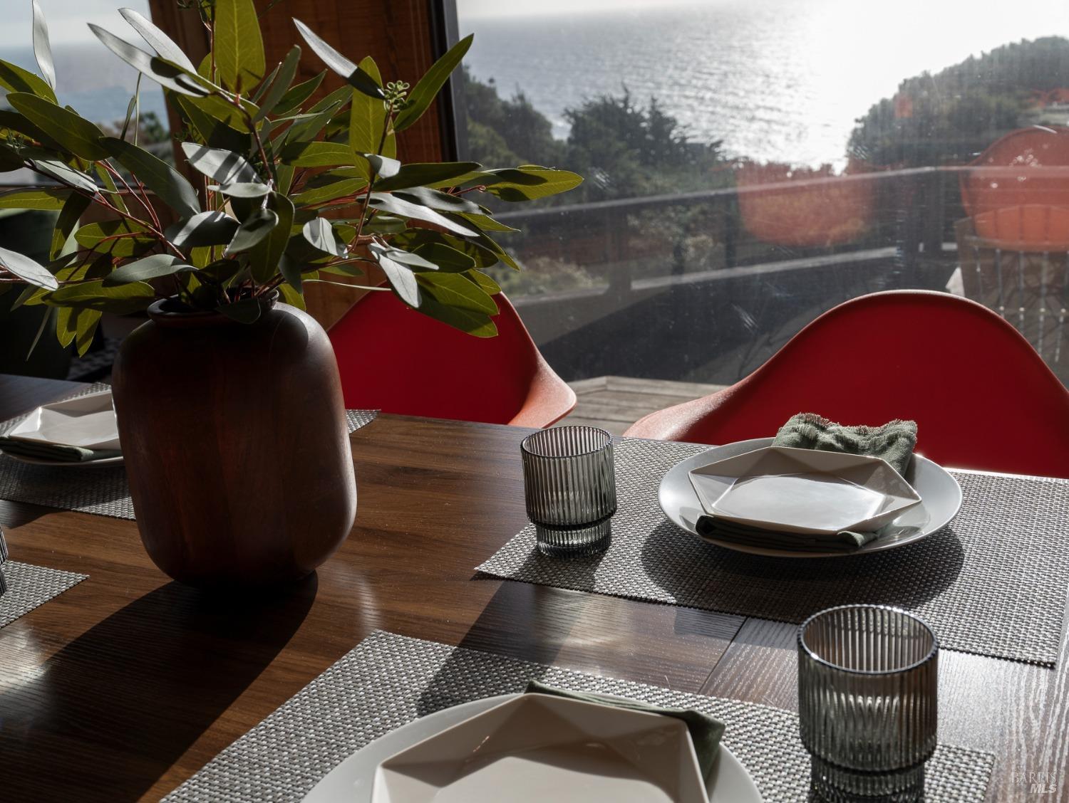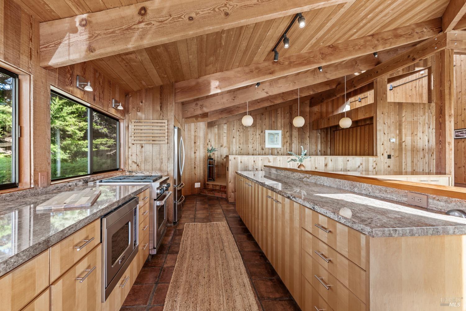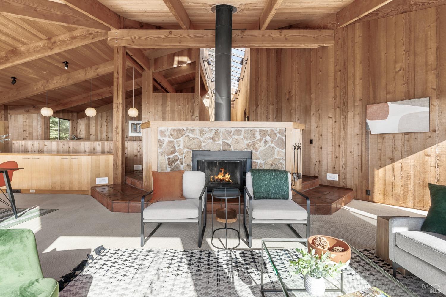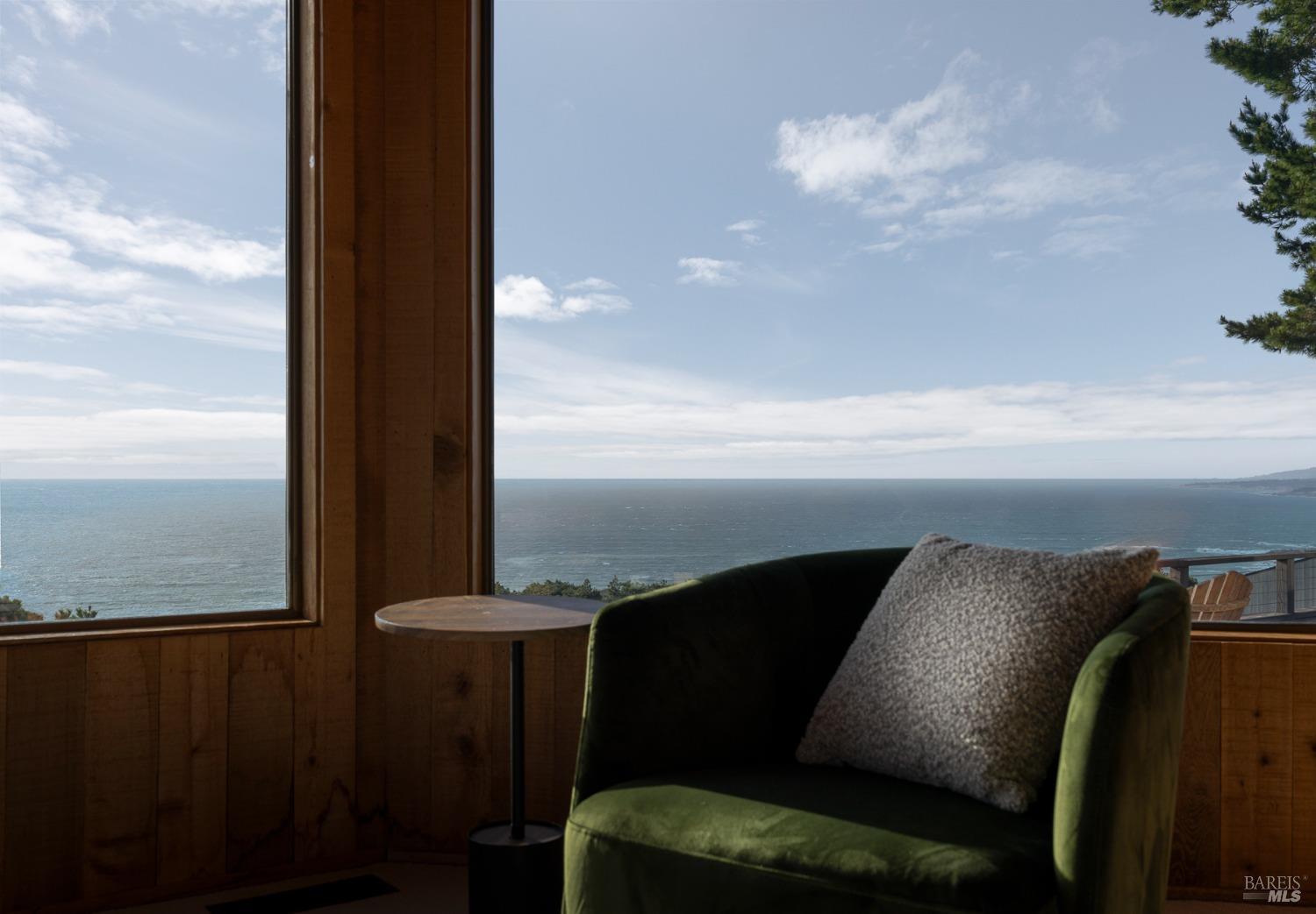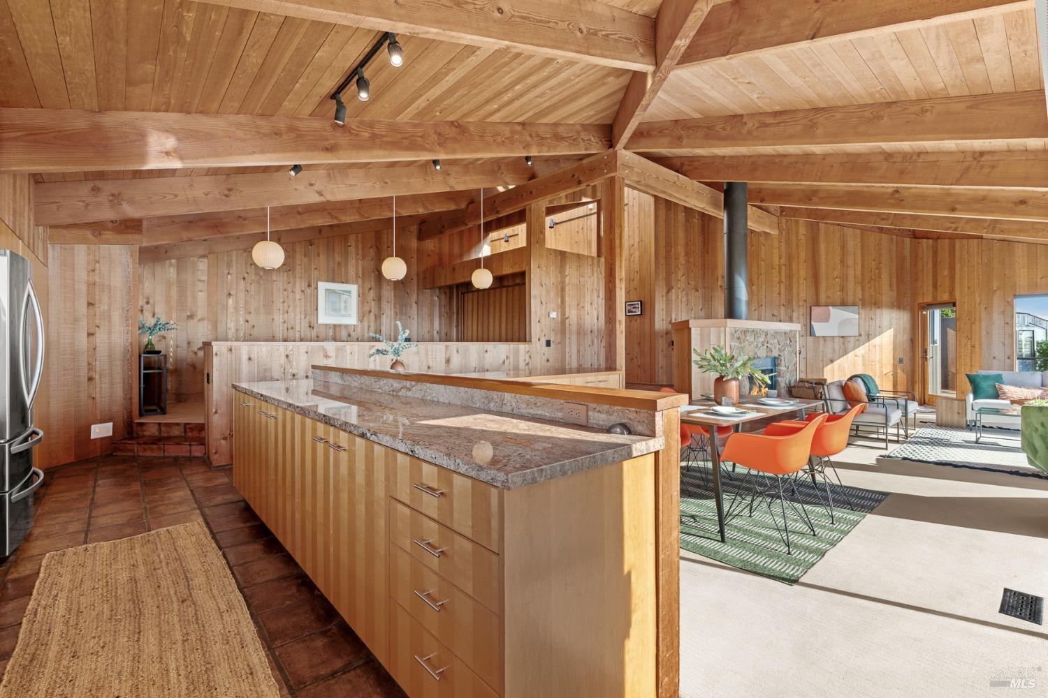 This is your opportunity to buy a classic Sea Ranch home in a fantastic location designed by renowned architect Don Jacobs. Admire the exceptional detail and the craftsmanship by legendary original contractor Matt Sylvia, who built Condo 1, the Lodge, Moonraker Center, and many iconic homes in this unique community. Walking through the sunlit hallway covered with skylights you enter the extensive living/dining/kitchen area with breathtaking panoramic white water views towards Black Point and down the northern coastline all the way to Fish Rock at Anchor Bay. Step down onto the deck and feel like you're on top of the world. The spacious kitchen with high end appliances and built-ins is open to the dining area and a perfect space to entertain family and friends. Off the hallway are two bedrooms and a 12'x 20' Studio. The master bedroom has an updated ensuite bathroom with access to the hot tub deck with ocean view. There is a two-car garage and plenty of guest parking. You are just minutes away from beautiful Black Point Beach, the Sea Ranch Lodge for dining and Moonraker Rec Center with heated pool, sauna and pickle ball court. Whether you enjoy the sunset from your deck or hike the nearby trails, you will be captivated by the peace and quiet of this magical place.
