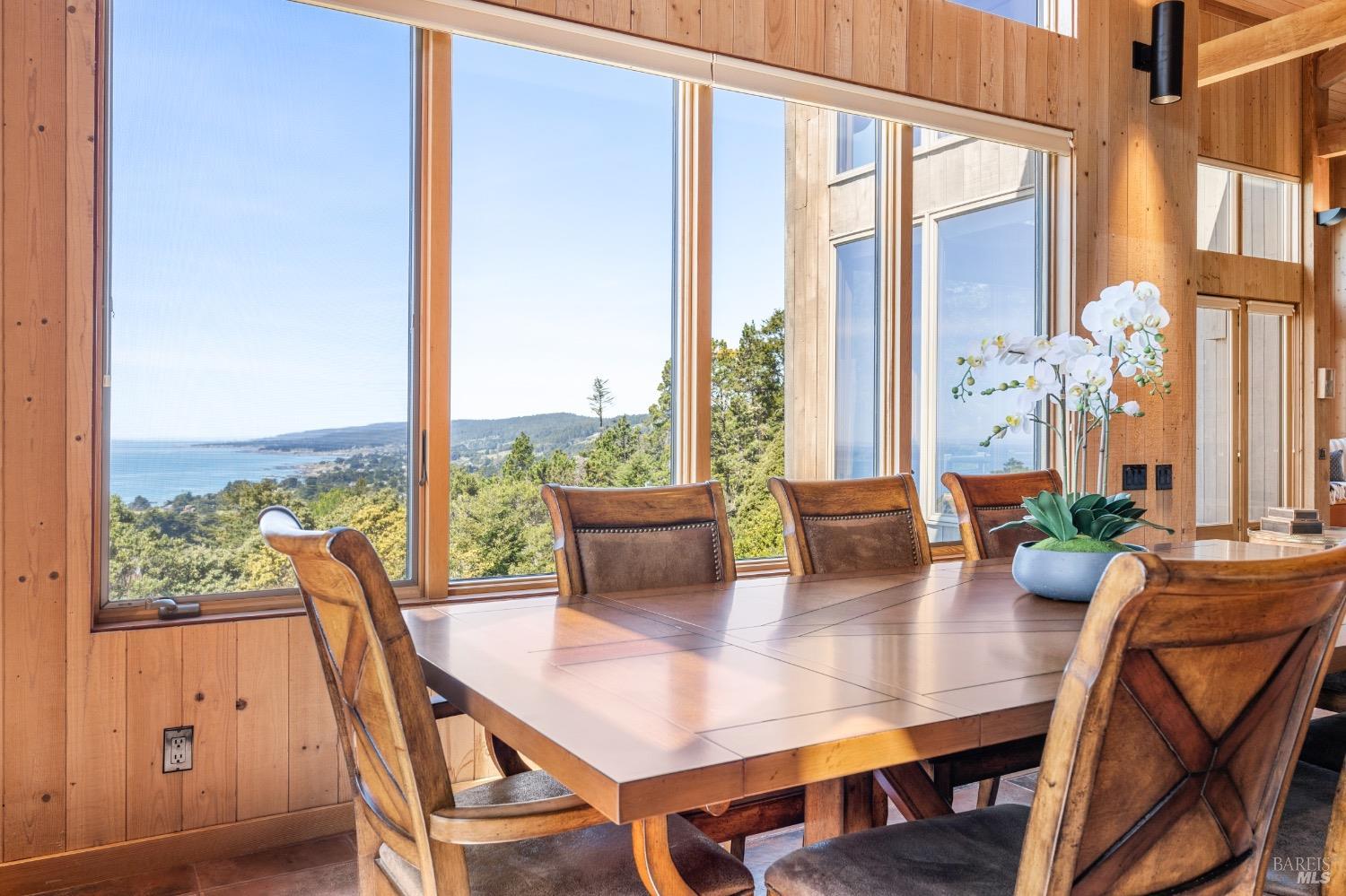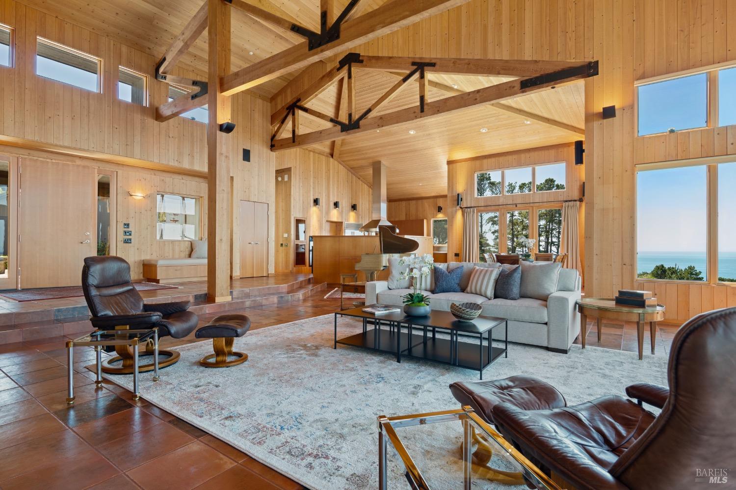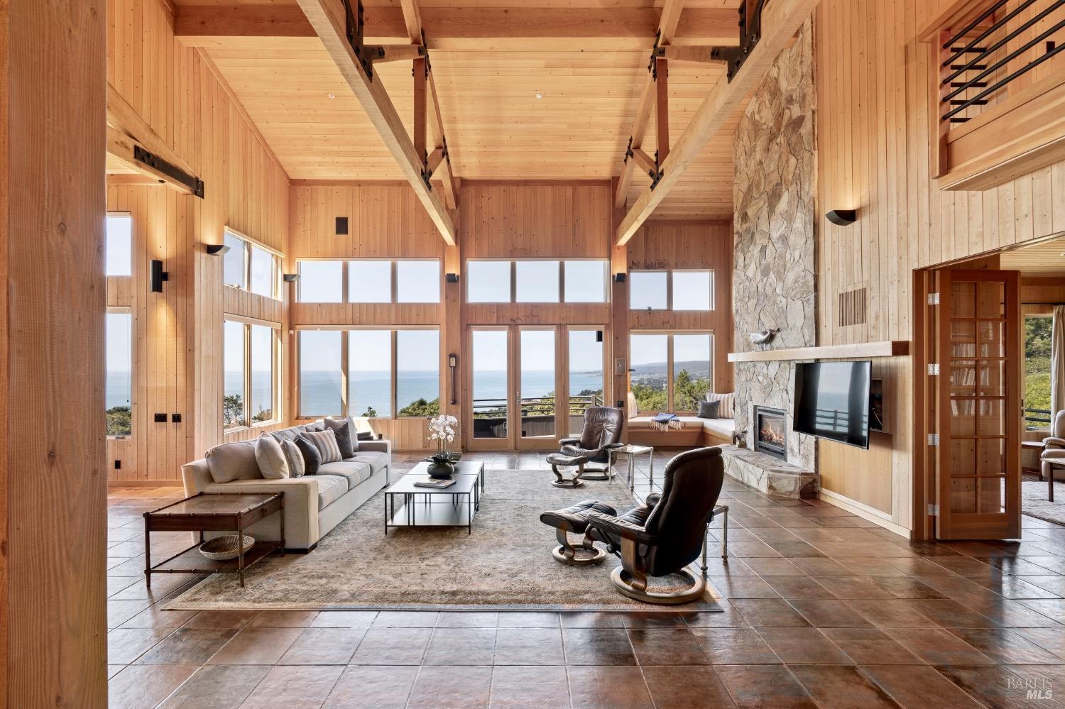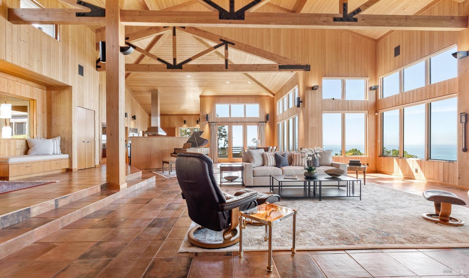 This desirable hillside location, situated at the south end of The Sea Ranch, sits high above Black Point Beach, overlooking the breathtaking Sonoma Coast. Inspiring architecture with captivating ocean views and coastal vistas greet you from the moment you enter. This remarkable 3-bedroom, 3-bathroom residence features an impressive floor plan, exceptional craftsmanship, and meticulous attention to detail throughout. The vertical volume of warm wood finishes and open beam ceilings will amaze you. While grand in space, there are intimate niches throughout the home. The spacious kitchen is filled with natural light and equipped with a Subzero refrigerator/freezer, double ovens, built-in microwave, Thermador warming drawer, double Fisher & Paykel dishwasher drawers, and a Thermador 6-burner gas cooktop with grill, complimented by stainless steel countertop surfaces. The primary bedroom, with an ocean view, evokes calmness and tranquility. The primary bathroom includes a walk-in shower, double vanity countertops on opposite ends, and two walk-in closets. Throughout the home, there are incredible ocean views. Whether craving quiet and calm or entertaining family and friends, 35124 Crow's Nest is the ideal property.
