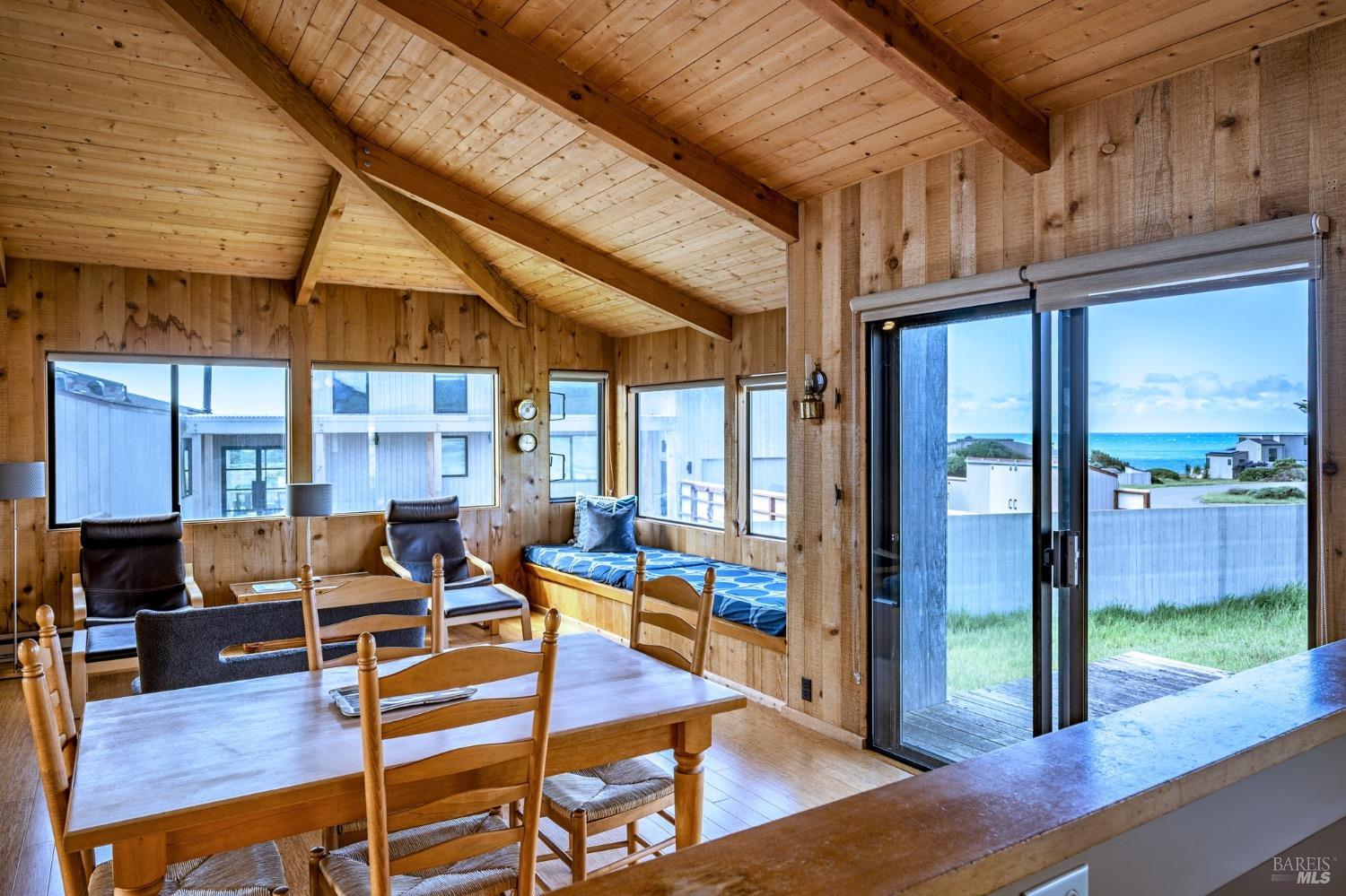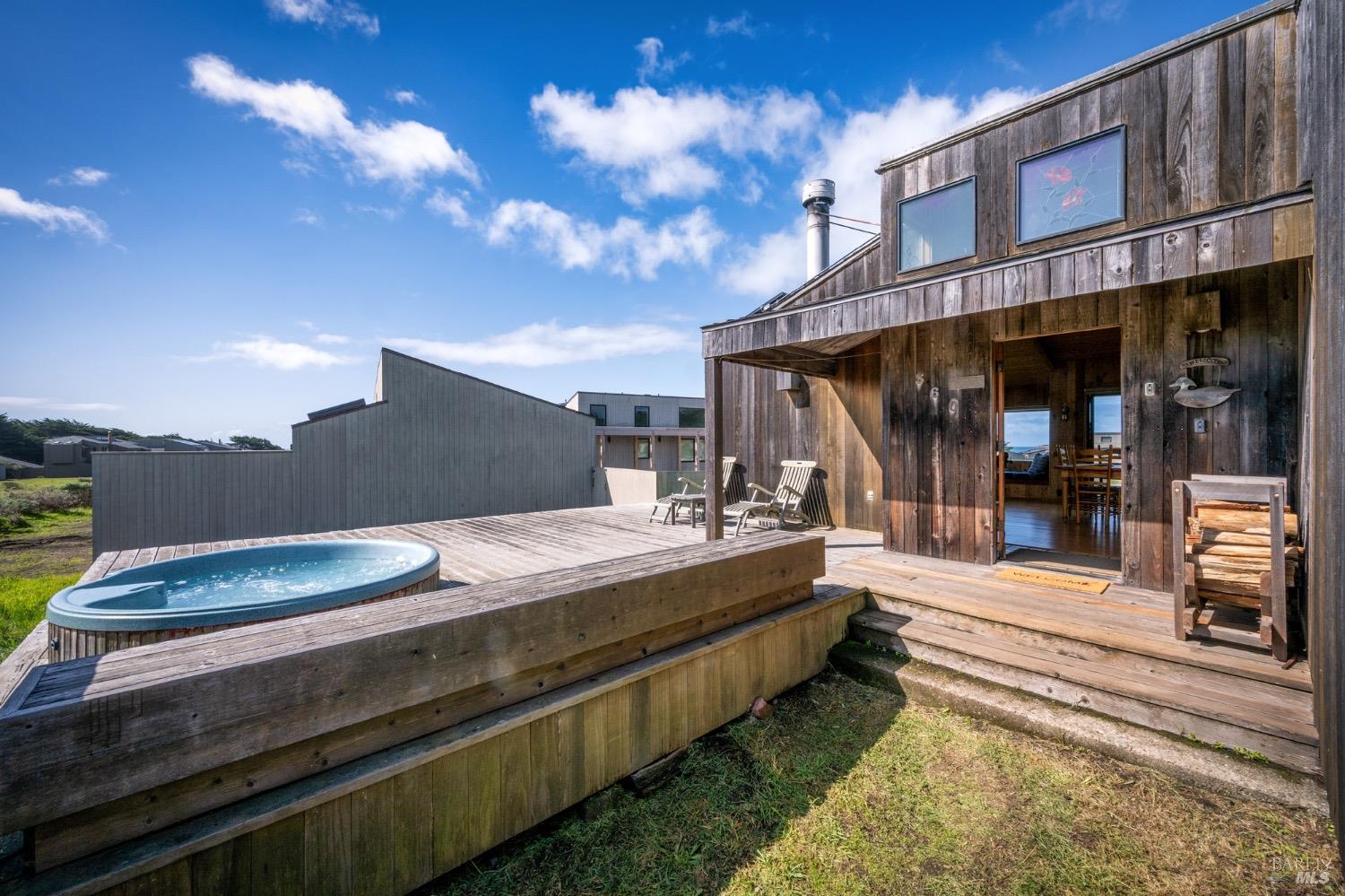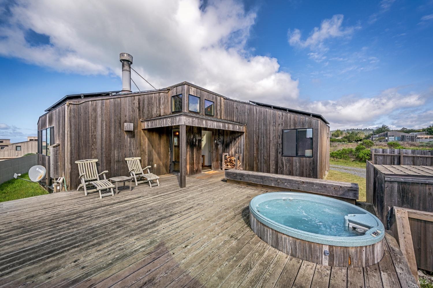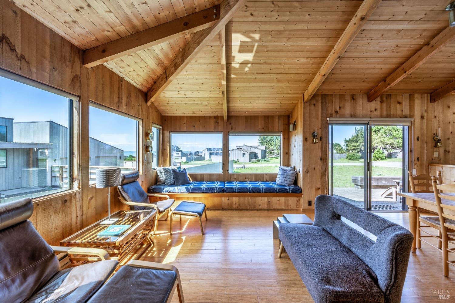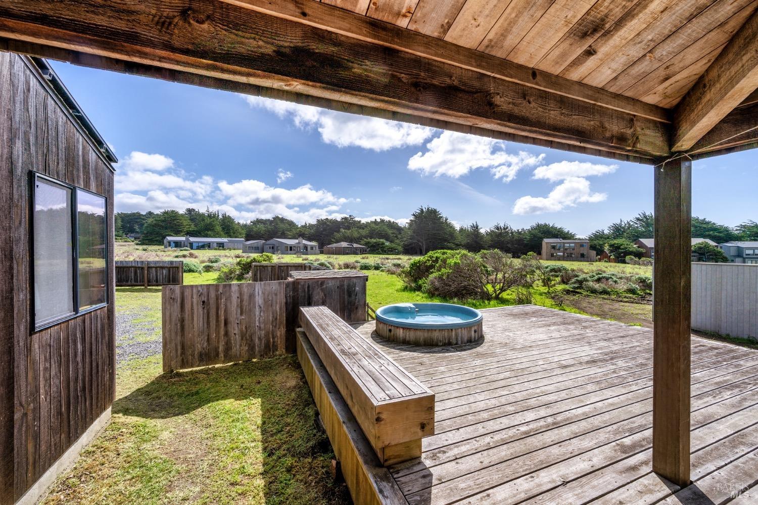 Adorable, West Meadow, 2 bed/ 2 bath, one-level home designed by Don Jacobs, FAIA, with close proximity to ocean bluff trail. Cozy living room features warm wood walls, open beam ceiling, fireplace, built-in shelving and a window seat. Dining area opens to outdoor deck with ocean view. Kitchen has wood cabinetry, window over sink and closet pantry. Down the hall you'll find the guest bathroom, guest bedroom and ensuite primary bedroom with a sliding glass door that opens to an outdoor deck with ocean view. The back deck with a hot tub makes for a great place to relax by day or by night. Roof mount solar electric system. Enjoy all the amenities The Sea Ranch has to offer including 40+ miles of trails, beaches, three recreation centers with pools, pickleball/tennis courts. Close to town of Gualala for shopping, services and dining. Sold turnkey. Bring your imagination and ideas to make this home your very own.