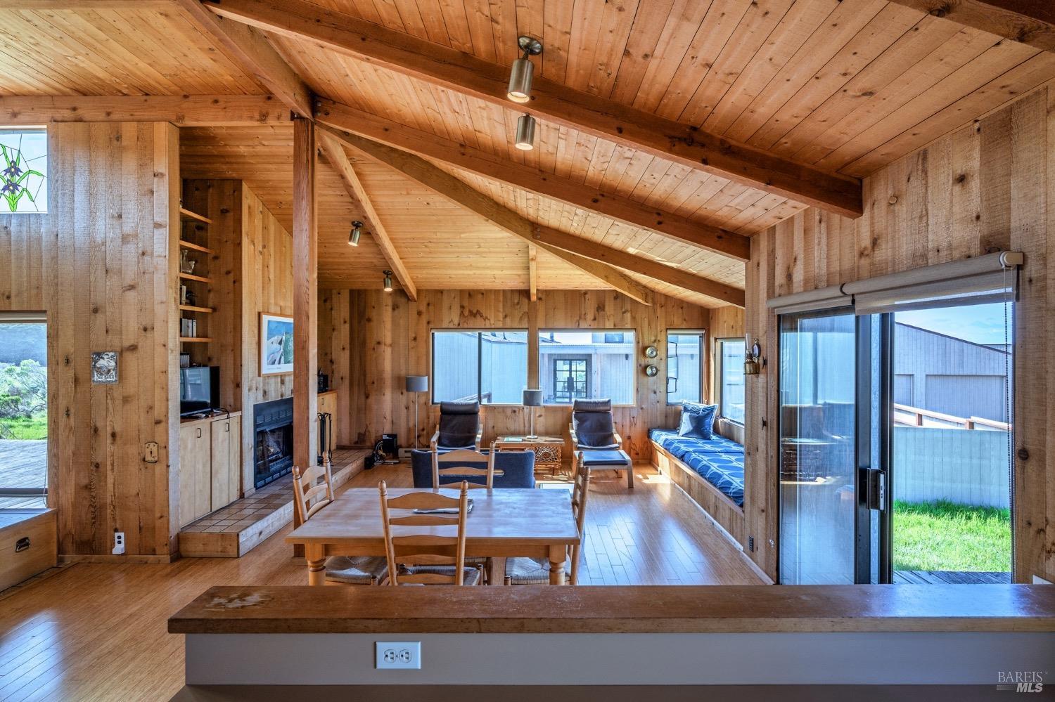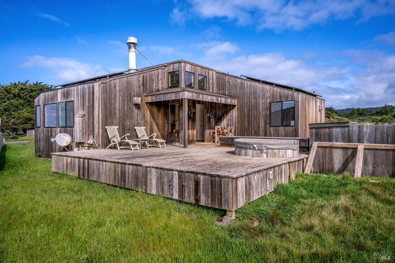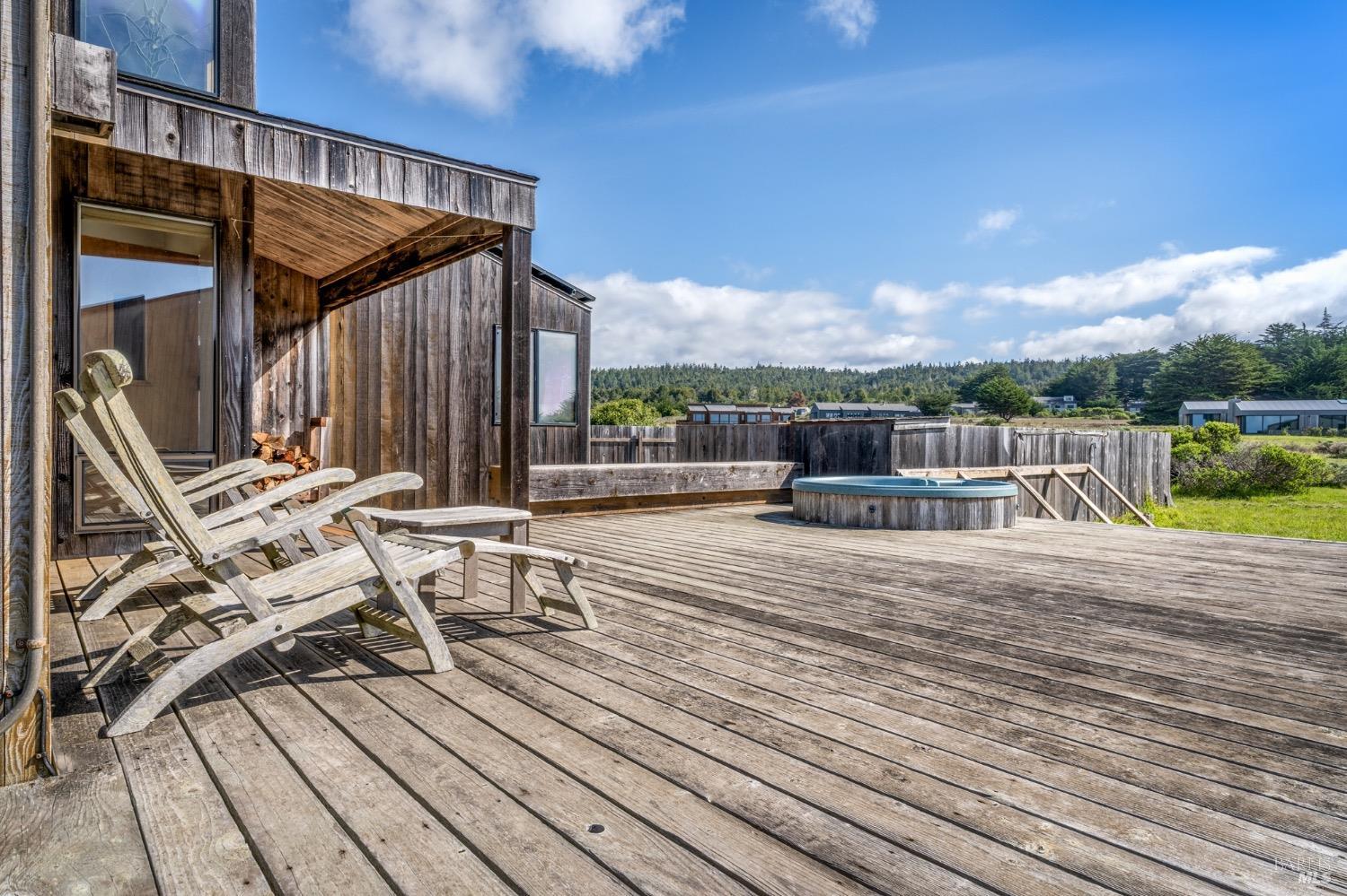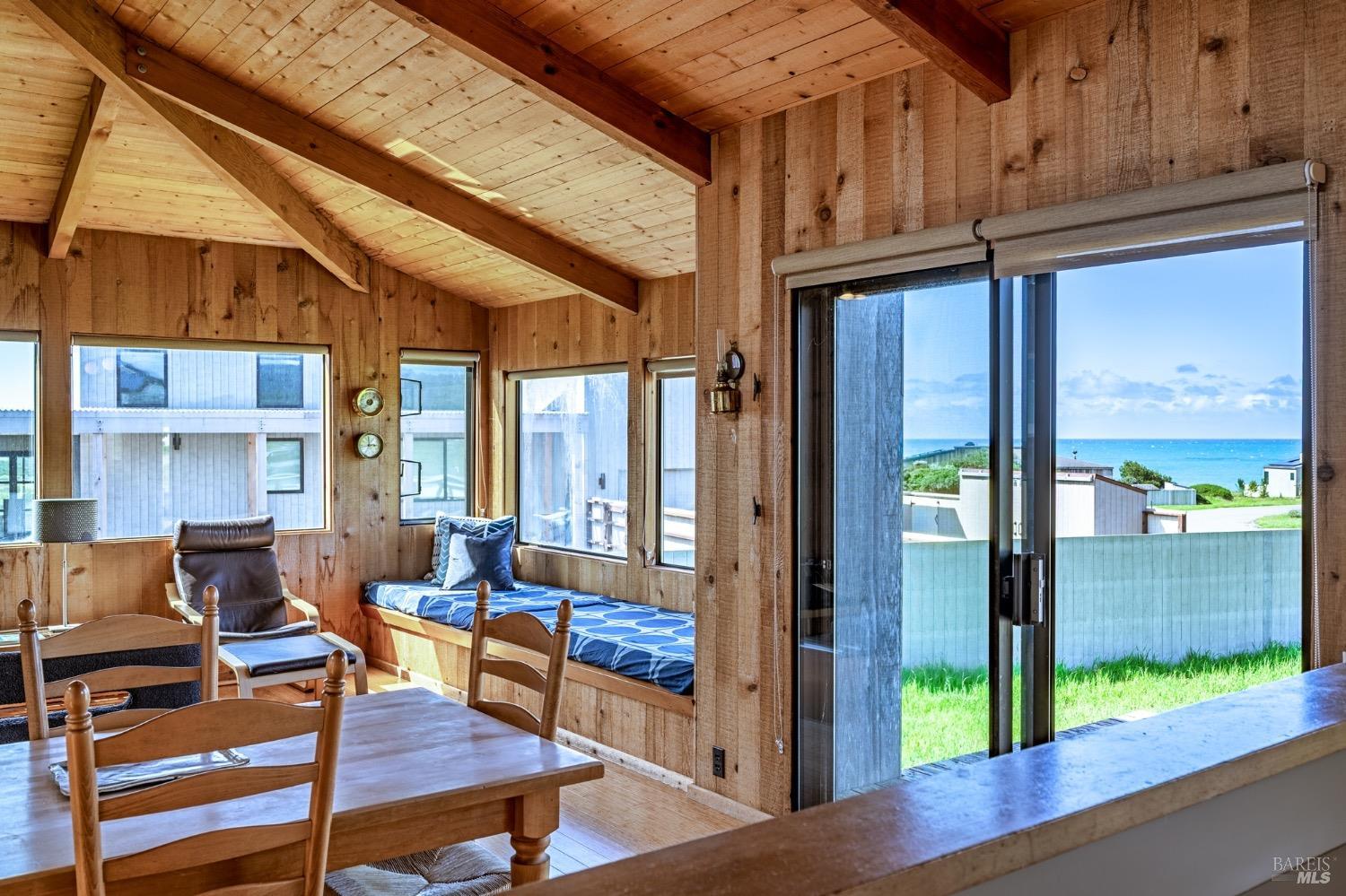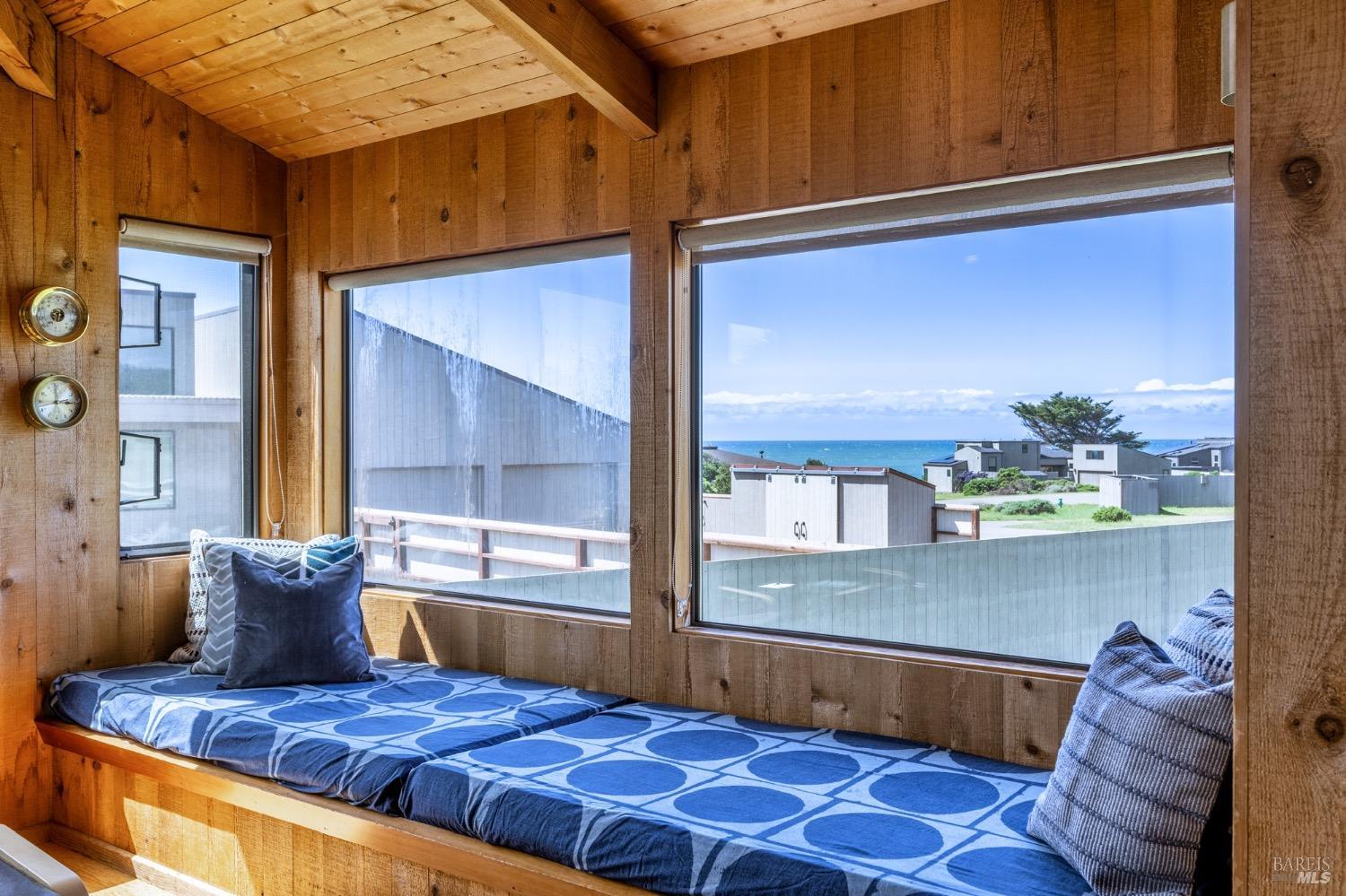 Adorable, West Meadow, 2 bed/ 2 bath, one-level home designed by Don Jacobs, FAIA, with close proximity to ocean bluff trail. Cozy living room features warm wood walls, open beam ceiling, fireplace, built-in shelving and a window seat. Dining area opens to outdoor deck with ocean view. Kitchen has wood cabinetry, window over sink and closet pantry. Down the hall you'll find the guest bathroom, guest bedroom and ensuite primary bedroom with a sliding glass door that opens to an outdoor deck with ocean view. The back deck with a hot tub makes for a great place to relax by day or by night. Roof mount solar electric system. Enjoy all the amenities The Sea Ranch has to offer including 40+ miles of trails, beaches, three recreation centers with pools, pickleball/tennis courts. Close to town of Gualala for shopping, services and dining. Sold turnkey. Bring your imagination and ideas to make this home your very own.