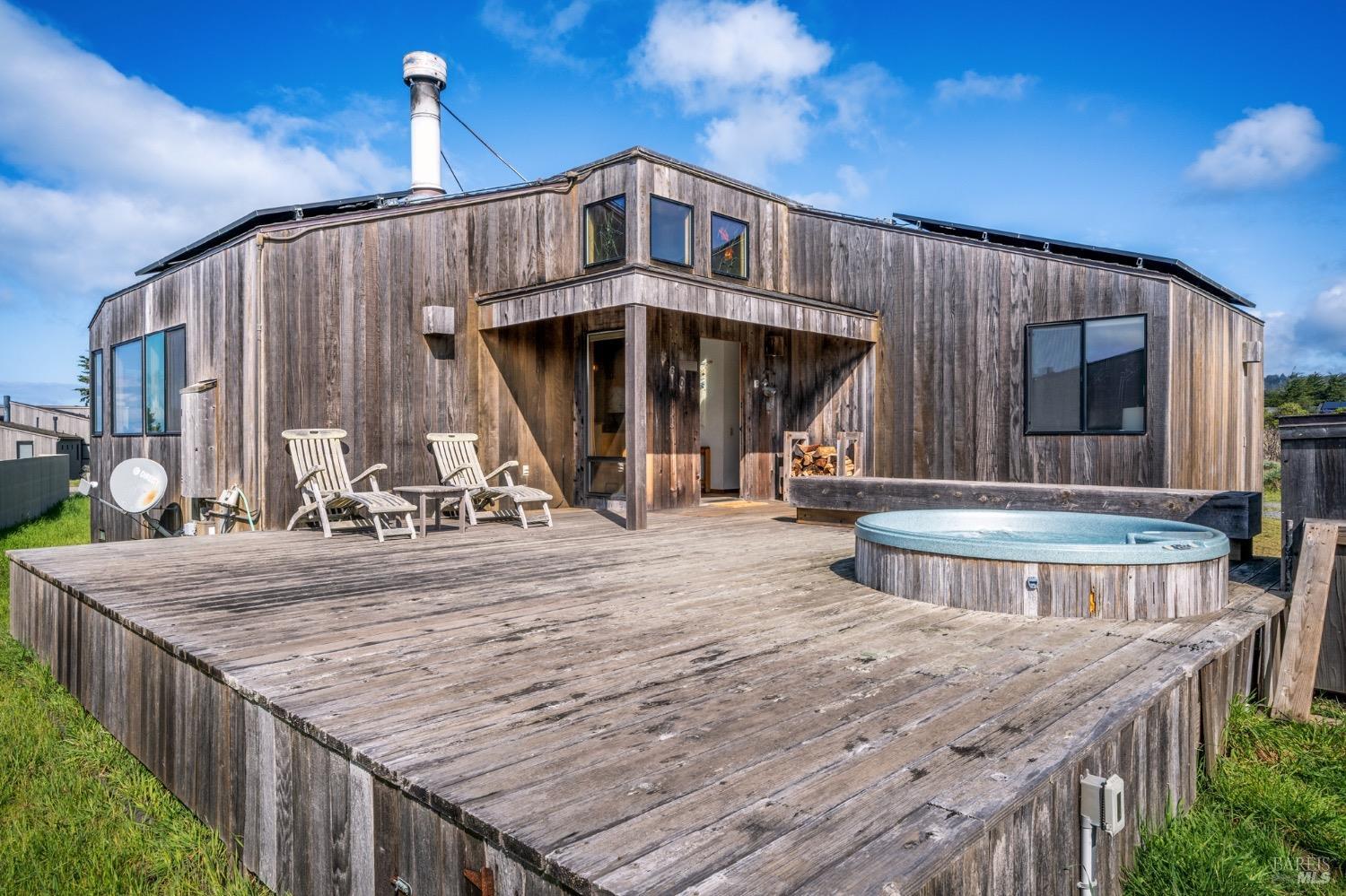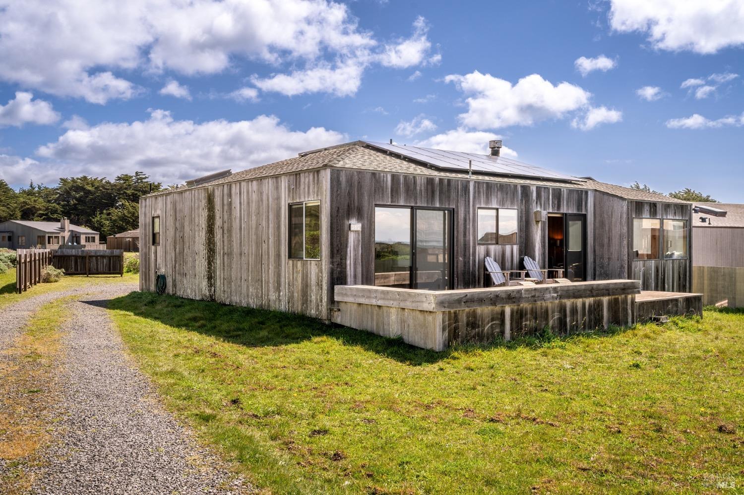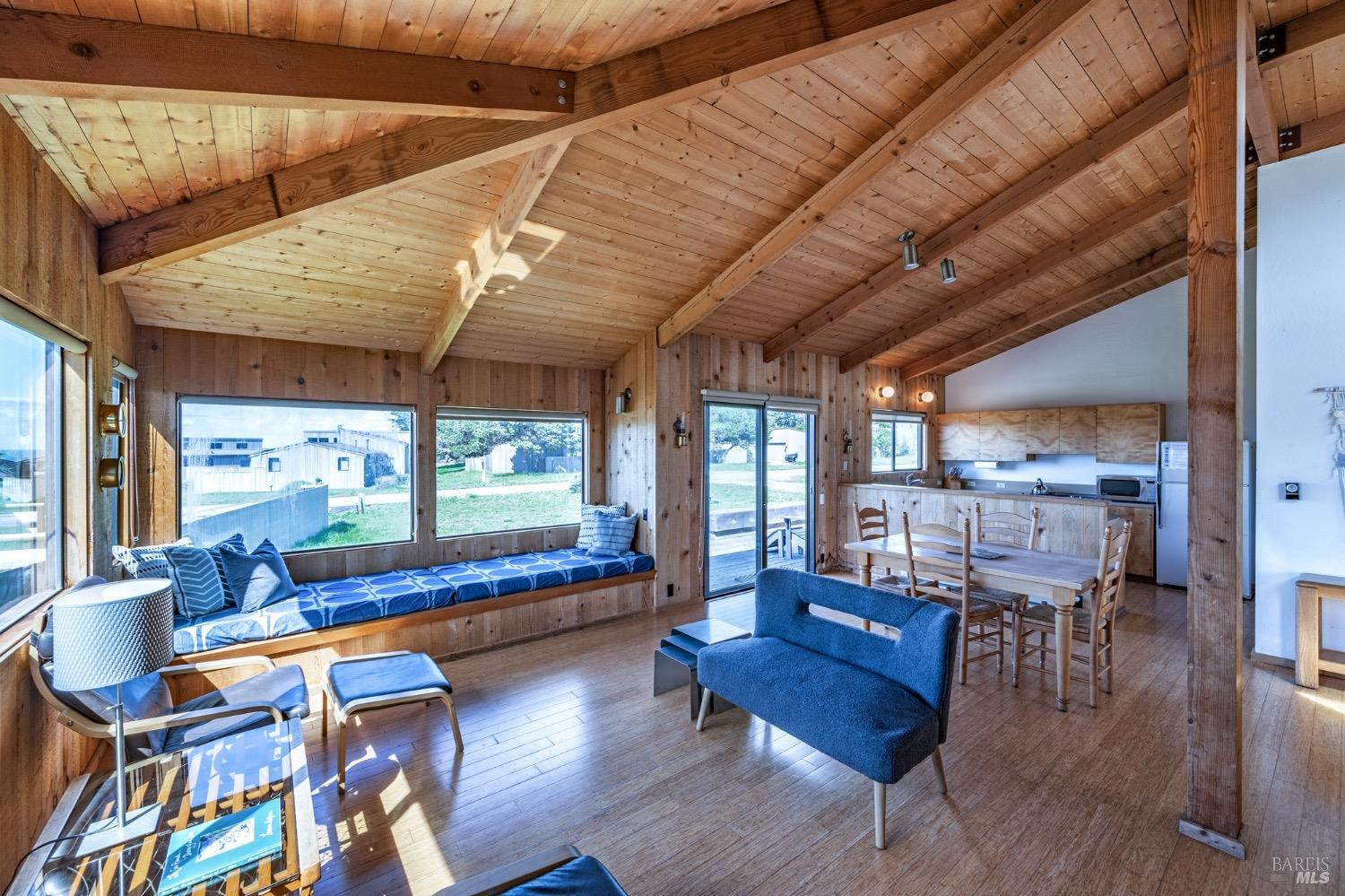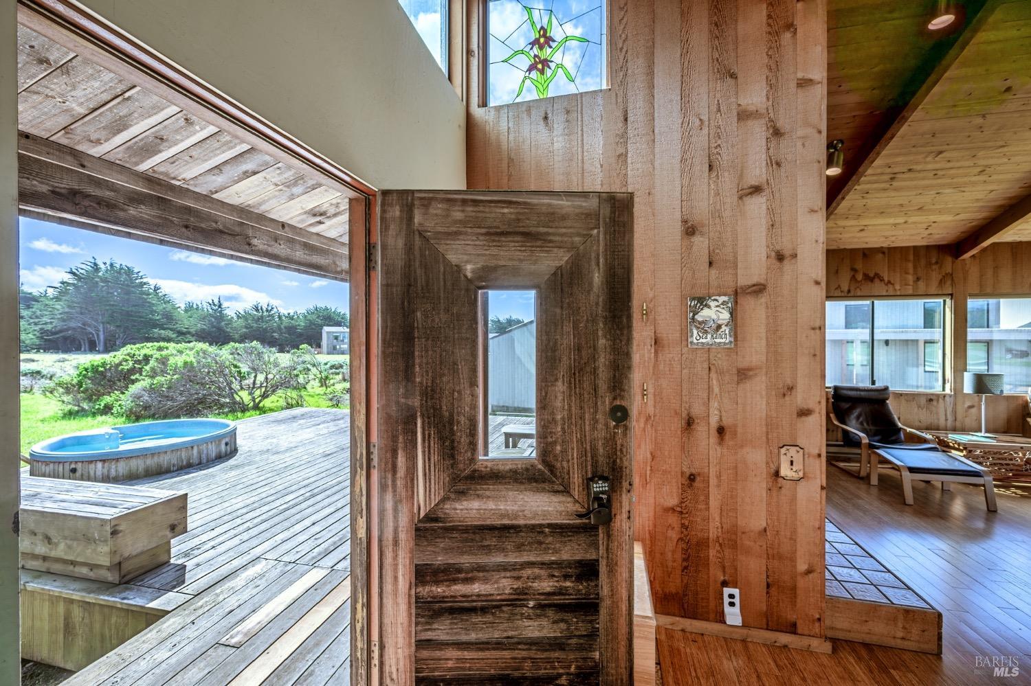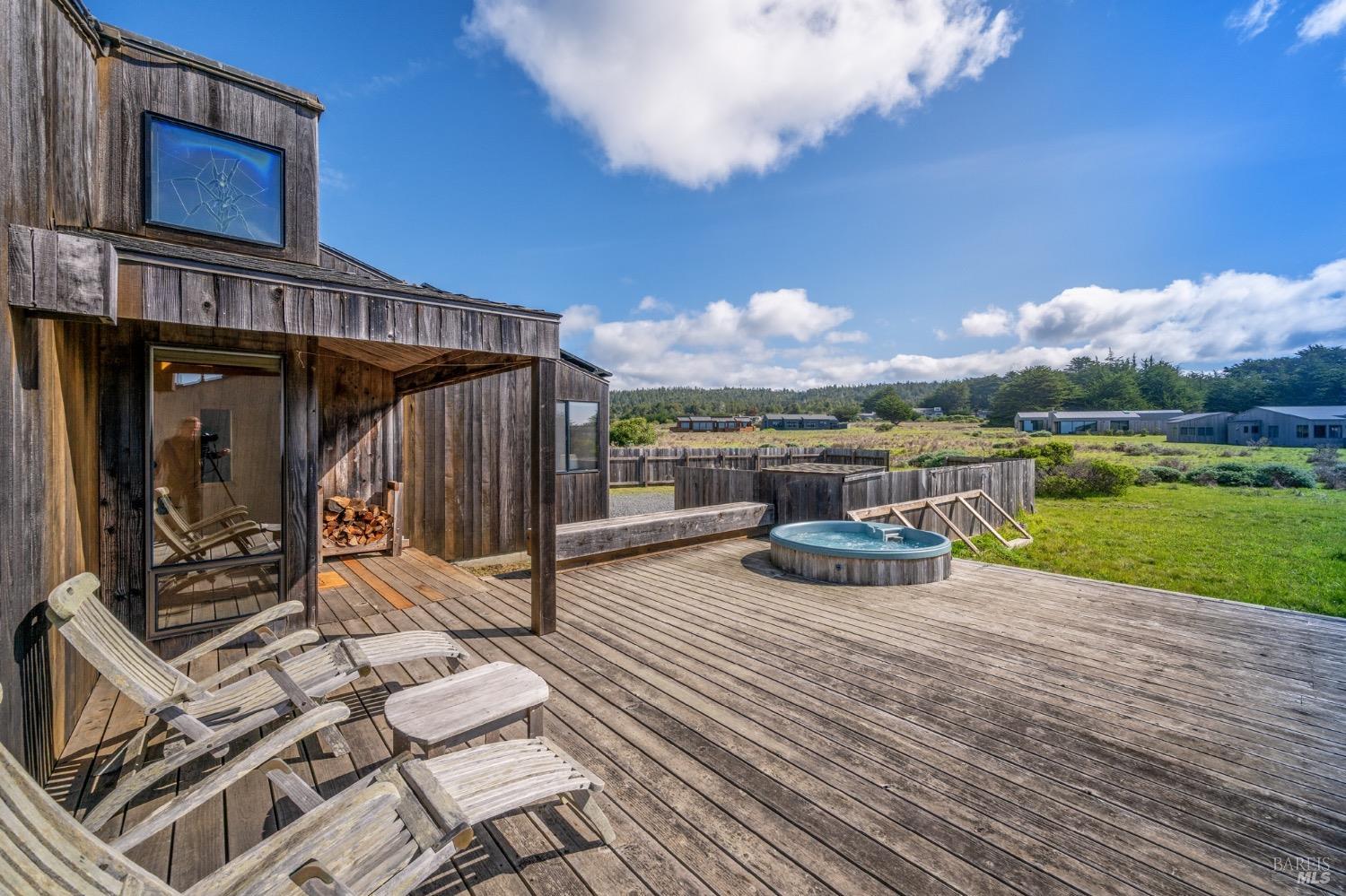Adorable, West Meadow, 2 bed/ 2 bath, one-level home designed by Don Jacobs, FAIA, with close proximity to ocean bluff trail. Cozy living room features warm wood walls, open beam ceiling, fireplace, built-in shelving and a window seat. Dining area opens to outdoor deck with ocean view. Kitchen has wood cabinetry, window over sink and closet pantry. Down the hall you'll find the guest bathroom, guest bedroom and ensuite primary bedroom with a sliding glass door that opens to an outdoor deck with ocean view. The back deck with a hot tub makes for a great place to relax by day or by night. Roof mount solar electric system. Enjoy all the amenities The Sea Ranch has to offer including 40+ miles of trails, beaches, three recreation centers with pools, pickleball/tennis courts. Close to town of Gualala for shopping, services and dining. Sold turnkey. Bring your imagination and ideas to make this home your very own.