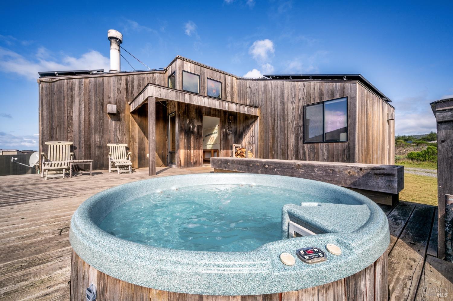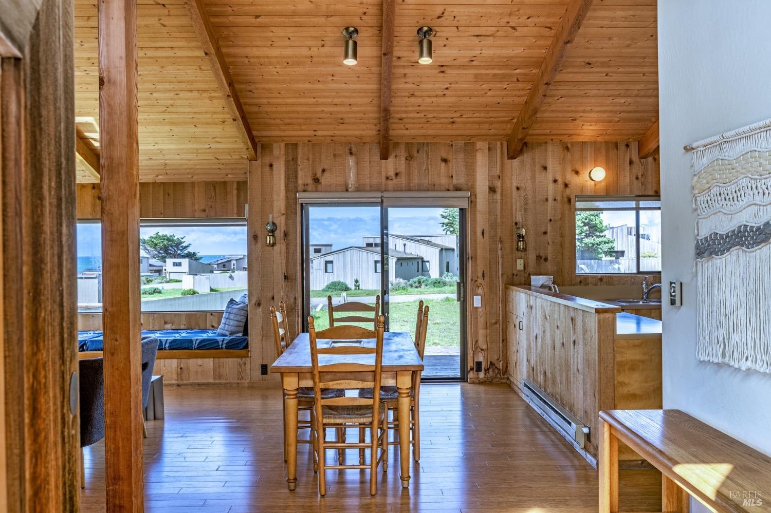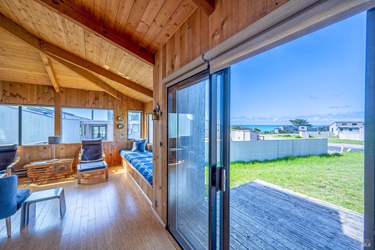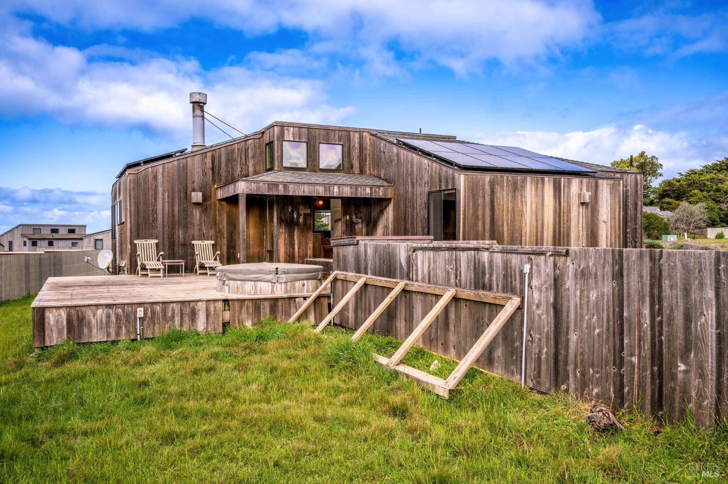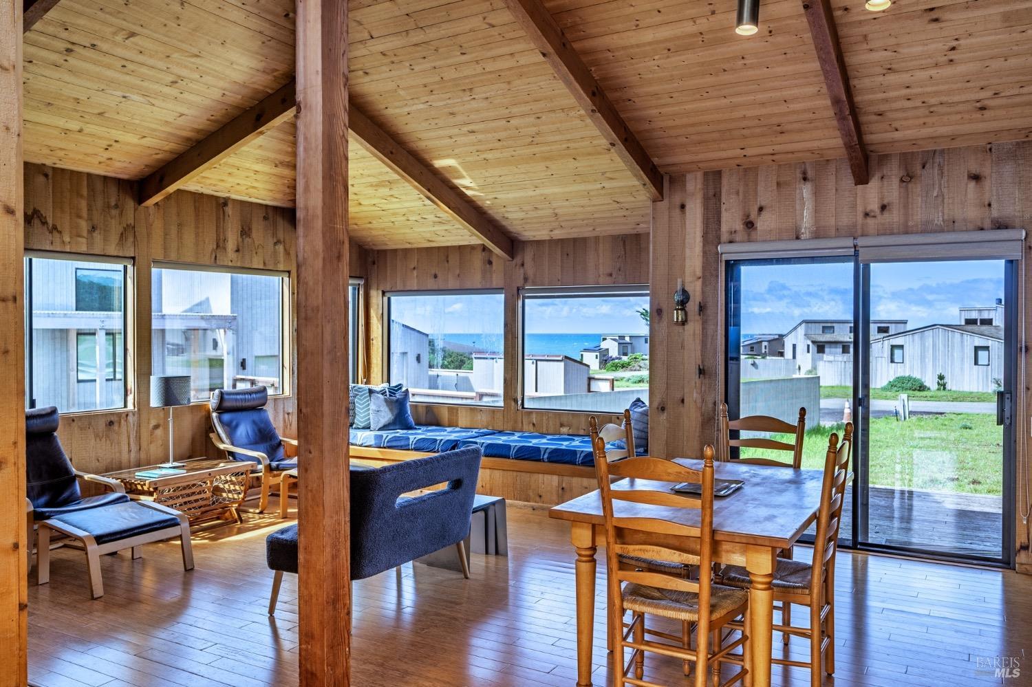 Adorable, West Meadow, 2 bed/ 2 bath, one-level home designed by Don Jacobs, FAIA, with close proximity to ocean bluff trail. Cozy living room features warm wood walls, open beam ceiling, fireplace, built-in shelving and a window seat. Dining area opens to outdoor deck with ocean view. Kitchen has wood cabinetry, window over sink and closet pantry. Down the hall you'll find the guest bathroom, guest bedroom and ensuite primary bedroom with a sliding glass door that opens to an outdoor deck with ocean view. The back deck with a hot tub makes for a great place to relax by day or by night. Roof mount solar electric system. Enjoy all the amenities The Sea Ranch has to offer including 40+ miles of trails, beaches, three recreation centers with pools, pickleball/tennis courts. Close to town of Gualala for shopping, services and dining. Sold turnkey. Bring your imagination and ideas to make this home your very own.