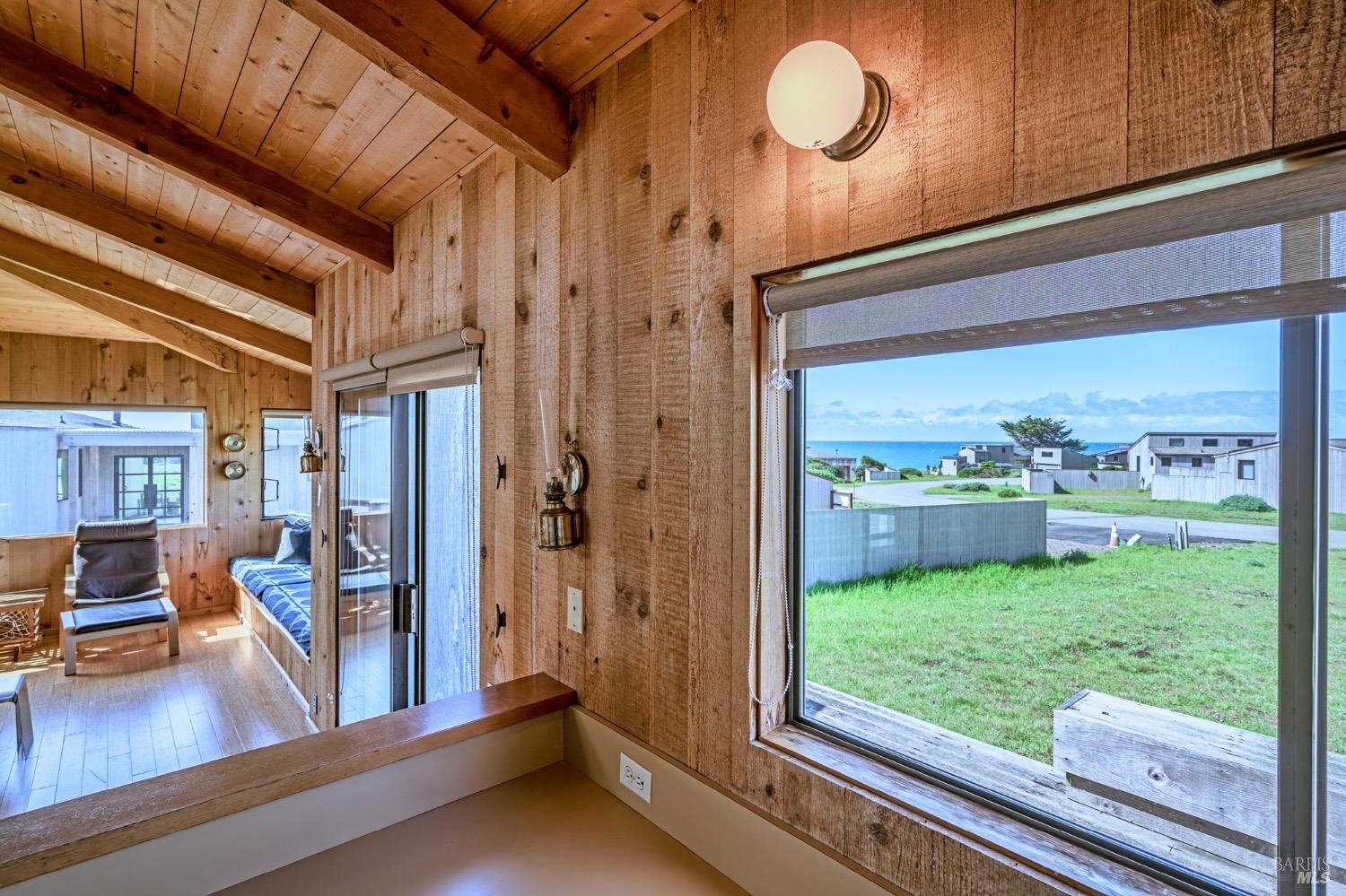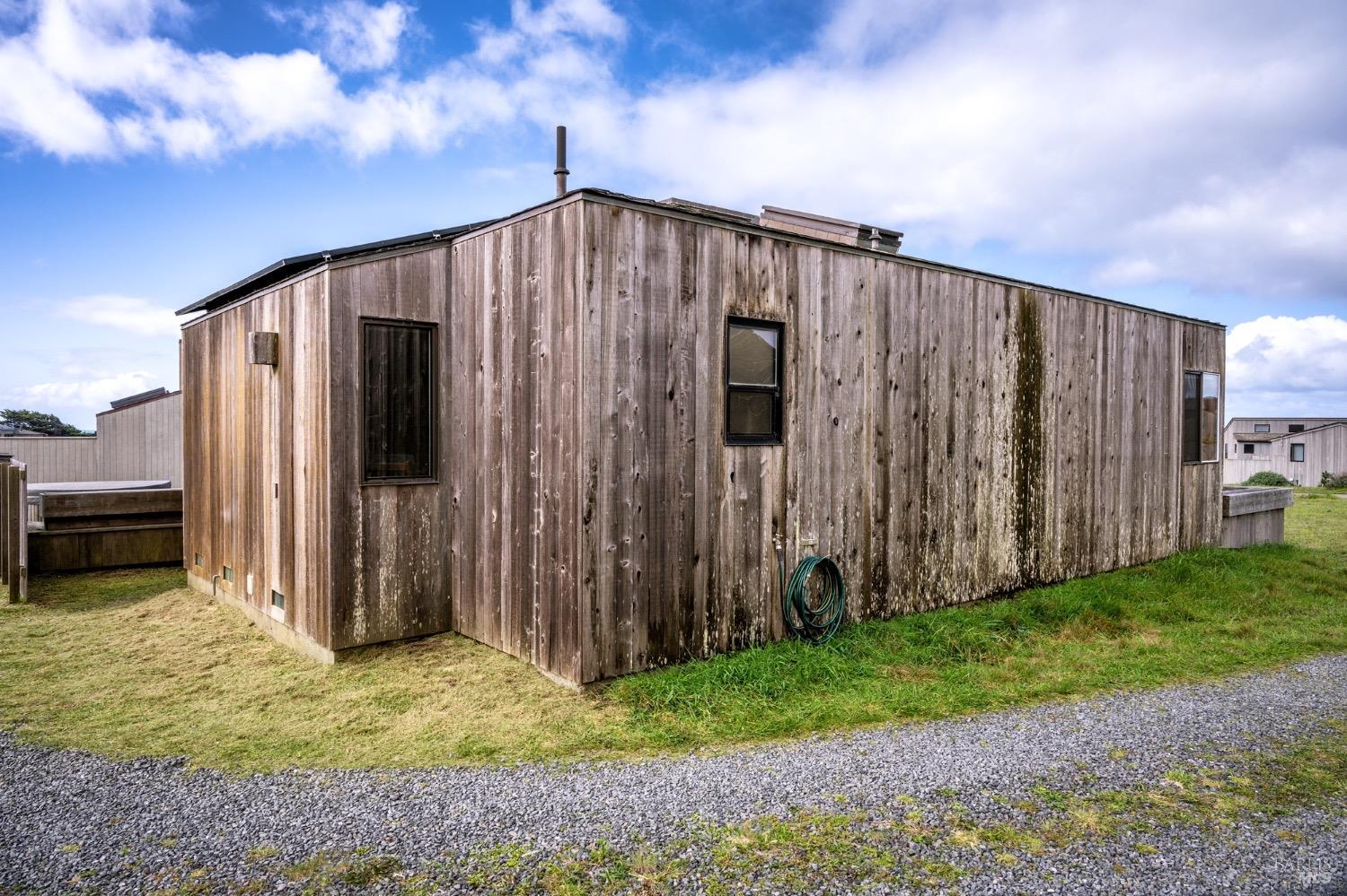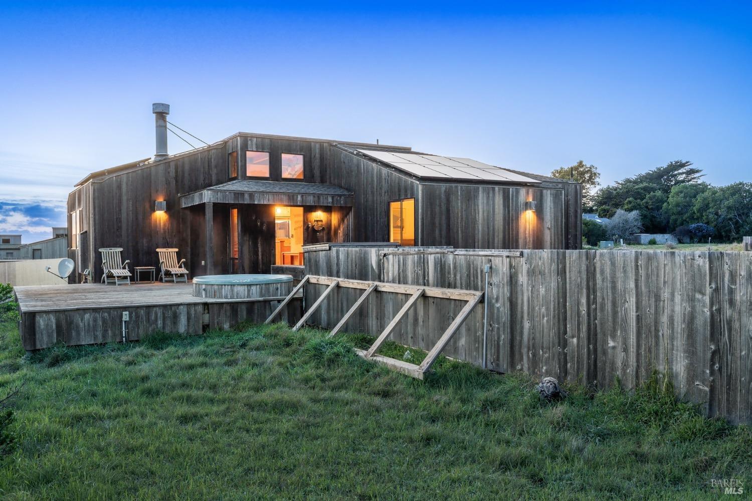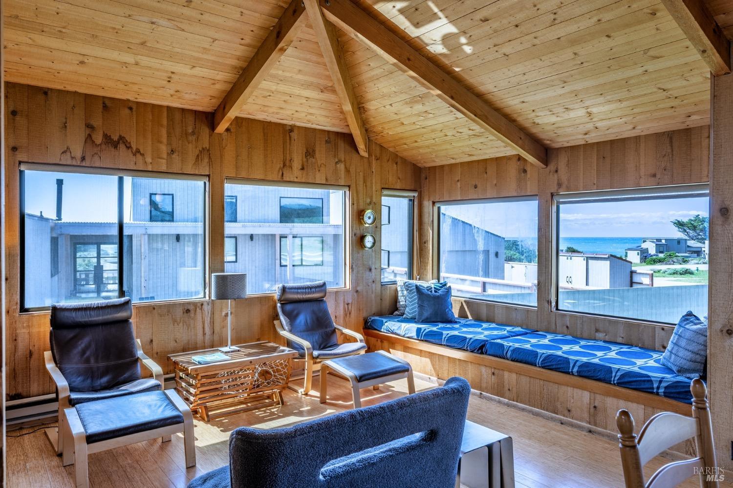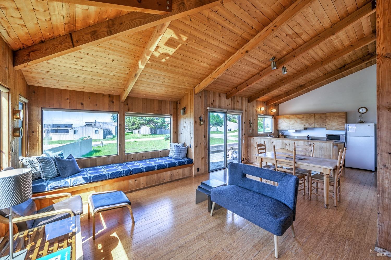 Adorable, West Meadow, 2 bed/ 2 bath, one-level home designed by Don Jacobs, FAIA, with close proximity to ocean bluff trail. Cozy living room features warm wood walls, open beam ceiling, fireplace, built-in shelving and a window seat. Dining area opens to outdoor deck with ocean view. Kitchen has wood cabinetry, window over sink and closet pantry. Down the hall you'll find the guest bathroom, guest bedroom and ensuite primary bedroom with a sliding glass door that opens to an outdoor deck with ocean view. The back deck with a hot tub makes for a great place to relax by day or by night. Roof mount solar electric system. Enjoy all the amenities The Sea Ranch has to offer including 40+ miles of trails, beaches, three recreation centers with pools, pickleball/tennis courts. Close to town of Gualala for shopping, services and dining. Sold turnkey. Bring your imagination and ideas to make this home your very own.