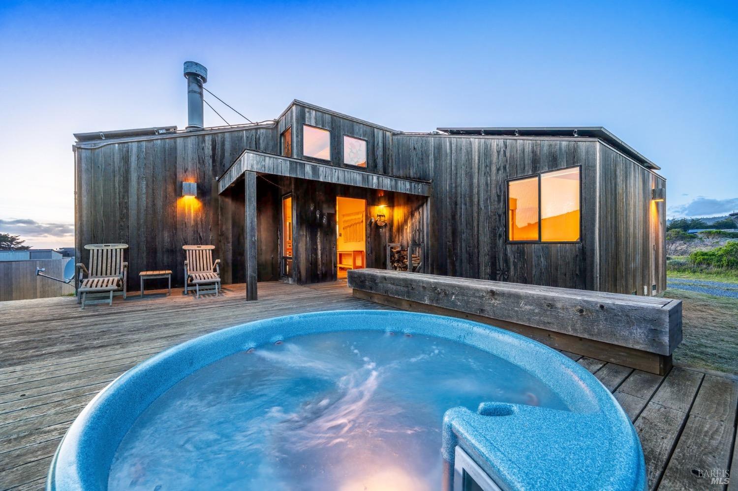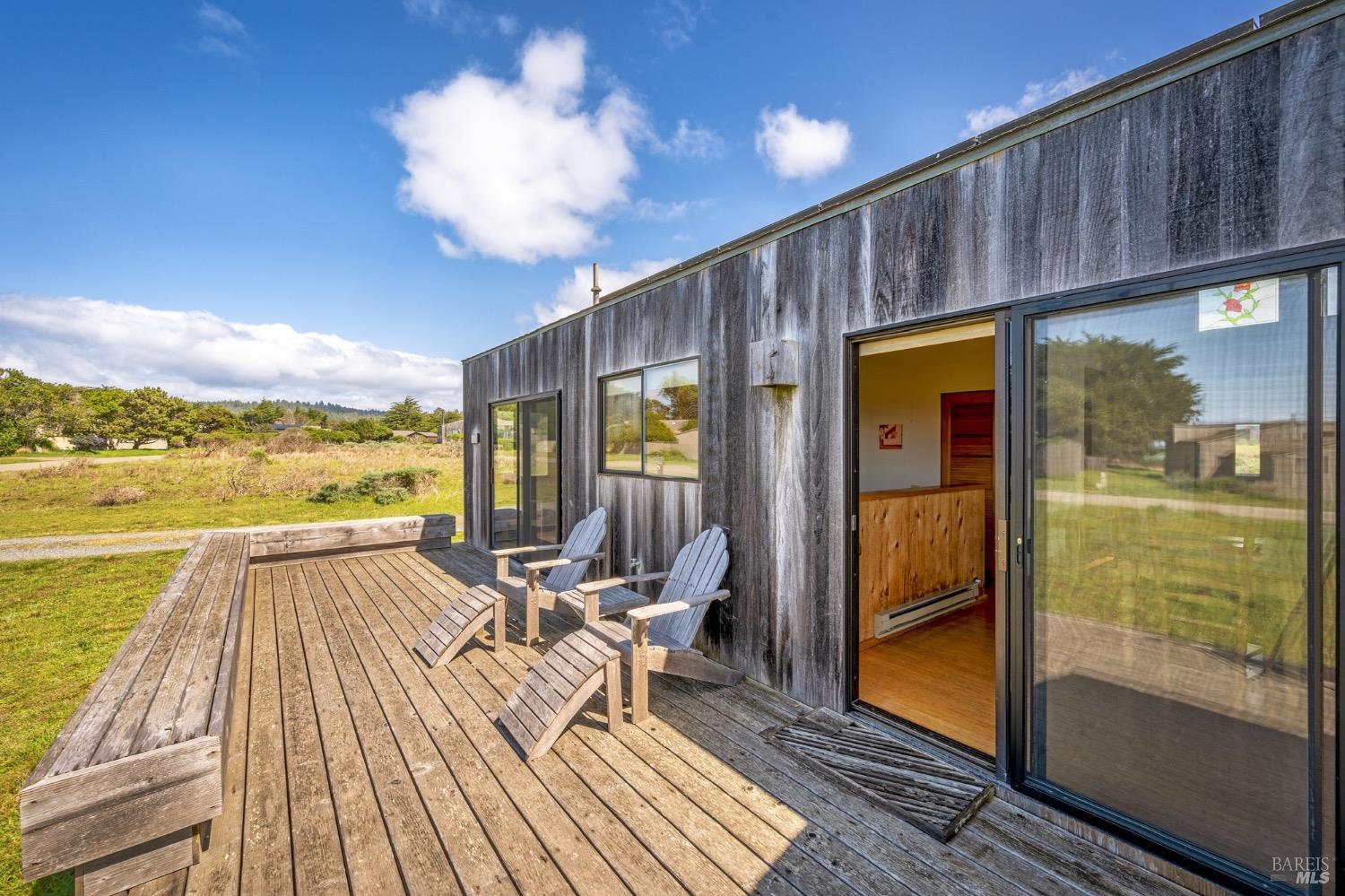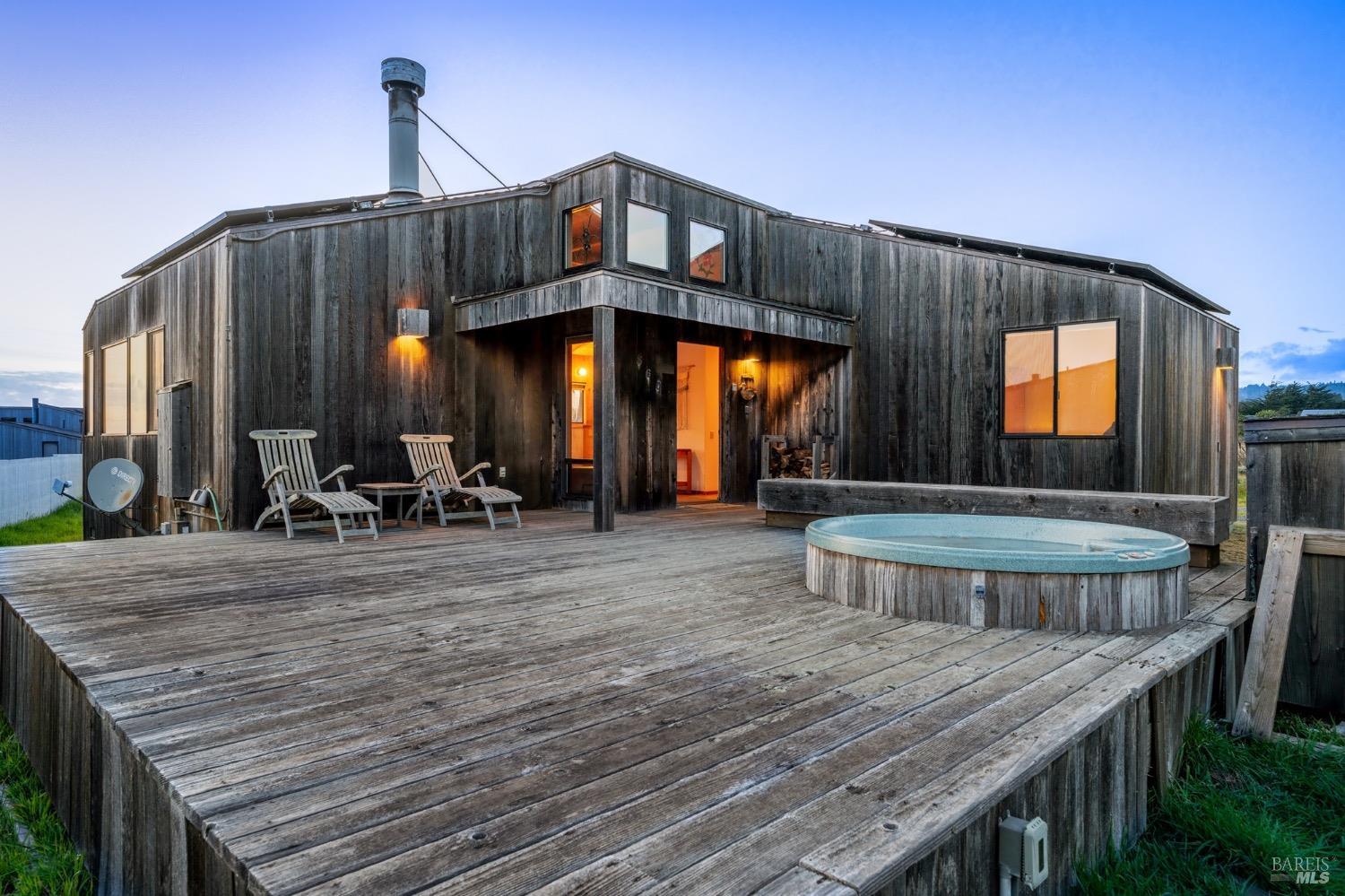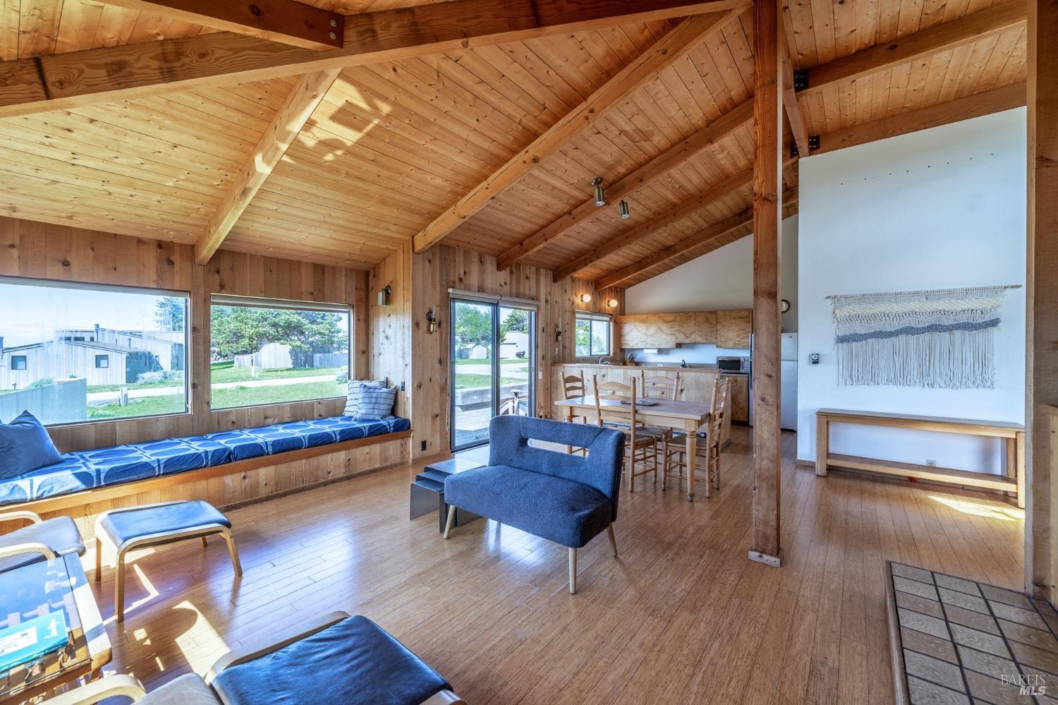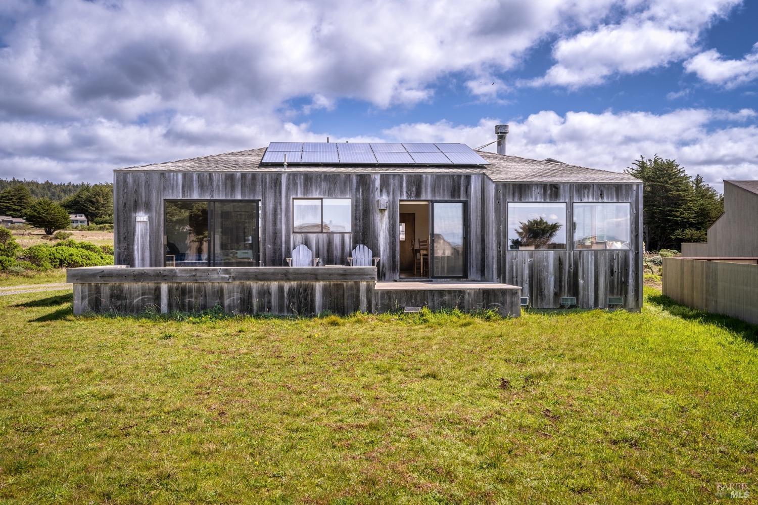 Adorable, West Meadow, 2 bed/ 2 bath, one-level home designed by Don Jacobs, FAIA, with close proximity to ocean bluff trail. Cozy living room features warm wood walls, open beam ceiling, fireplace, built-in shelving and a window seat. Dining area opens to outdoor deck with ocean view. Kitchen has wood cabinetry, window over sink and closet pantry. Down the hall you'll find the guest bathroom, guest bedroom and ensuite primary bedroom with a sliding glass door that opens to an outdoor deck with ocean view. The back deck with a hot tub makes for a great place to relax by day or by night. Roof mount solar electric system. Enjoy all the amenities The Sea Ranch has to offer including 40+ miles of trails, beaches, three recreation centers with pools, pickleball/tennis courts. Close to town of Gualala for shopping, services and dining. Sold turnkey. Bring your imagination and ideas to make this home your very own.