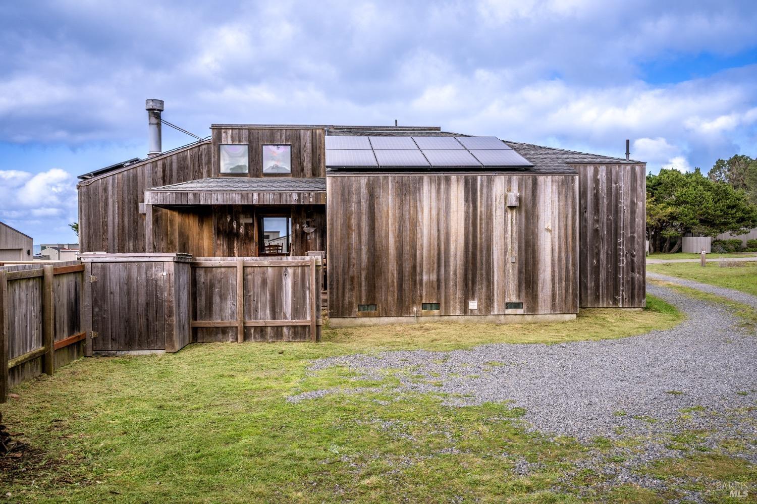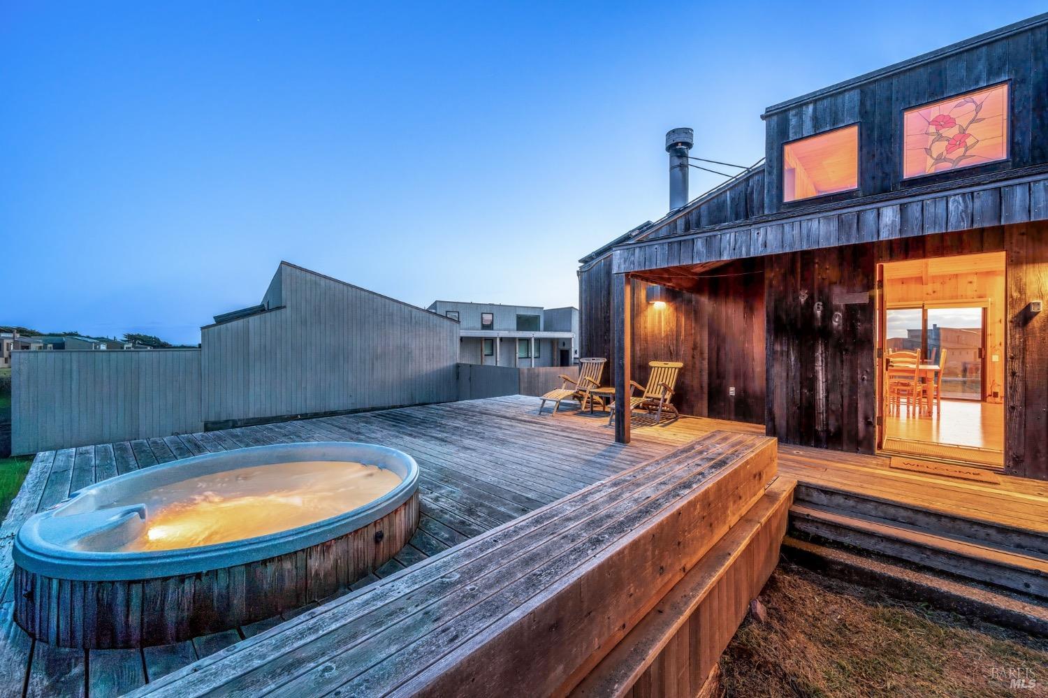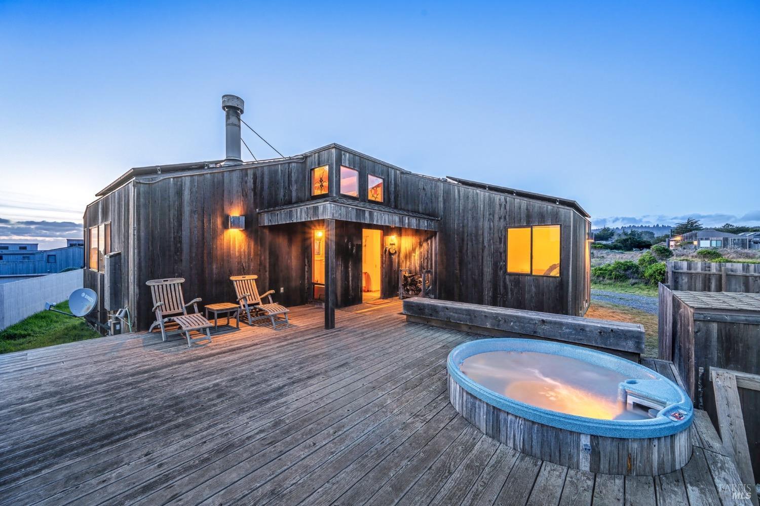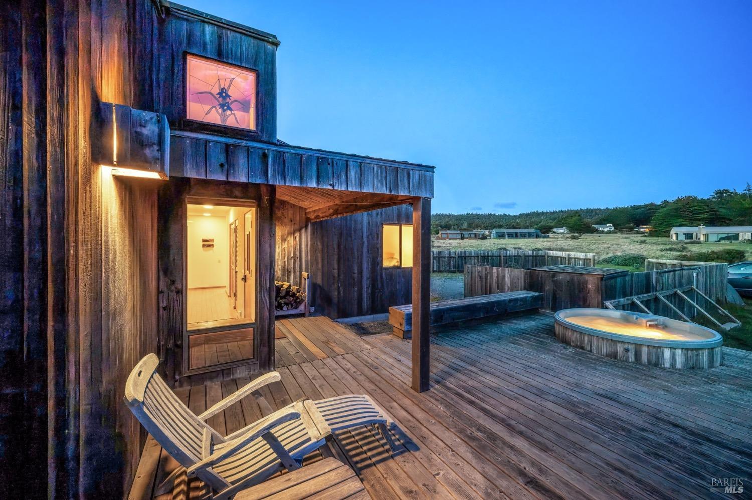 Adorable, West Meadow, 2 bed/ 2 bath, one-level home designed by Don Jacobs, FAIA, with close proximity to ocean bluff trail. Cozy living room features warm wood walls, open beam ceiling, fireplace, built-in shelving and a window seat. Dining area opens to outdoor deck with ocean view. Kitchen has wood cabinetry, window over sink and closet pantry. Down the hall you'll find the guest bathroom, guest bedroom and ensuite primary bedroom with a sliding glass door that opens to an outdoor deck with ocean view. The back deck with a hot tub makes for a great place to relax by day or by night. Roof mount solar electric system. Enjoy all the amenities The Sea Ranch has to offer including 40+ miles of trails, beaches, three recreation centers with pools, pickleball/tennis courts. Close to town of Gualala for shopping, services and dining. Sold turnkey. Bring your imagination and ideas to make this home your very own.