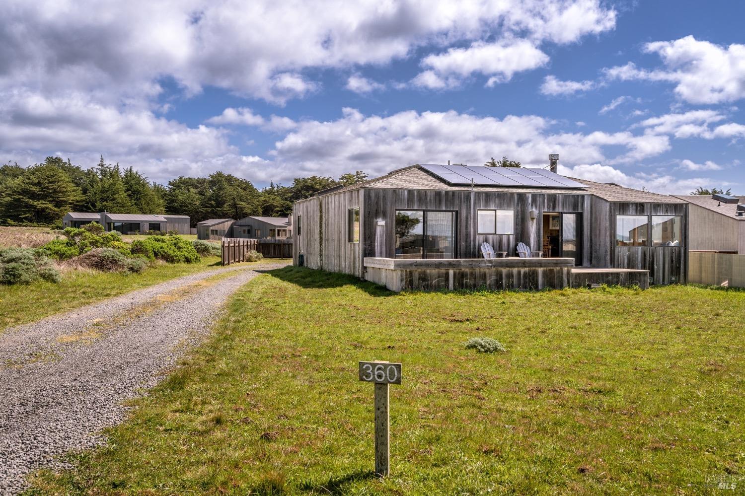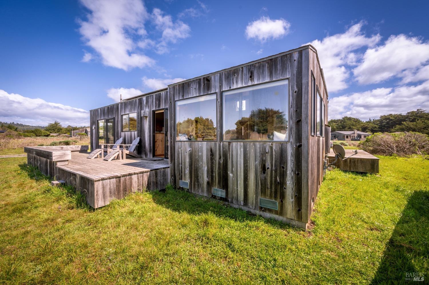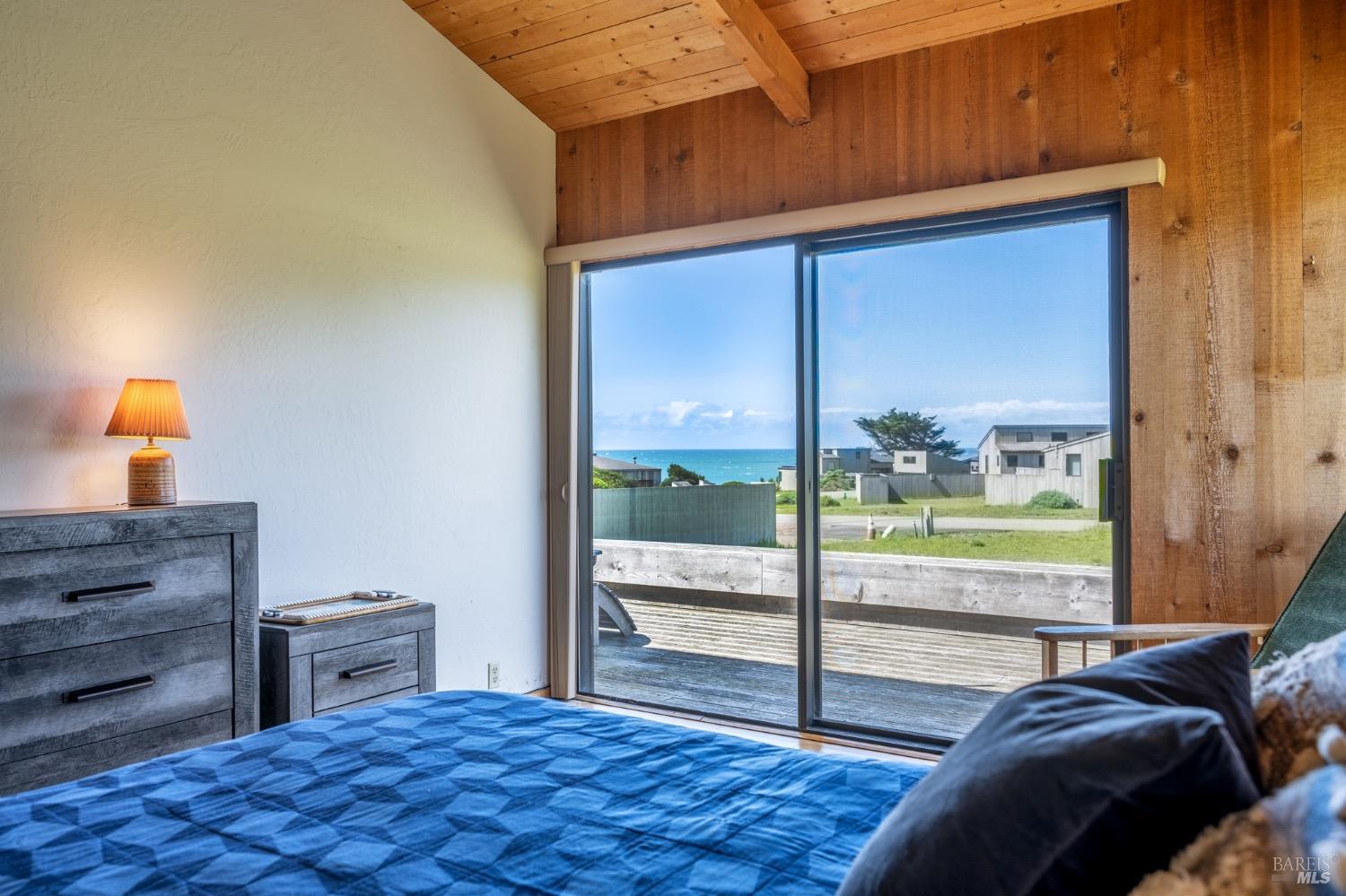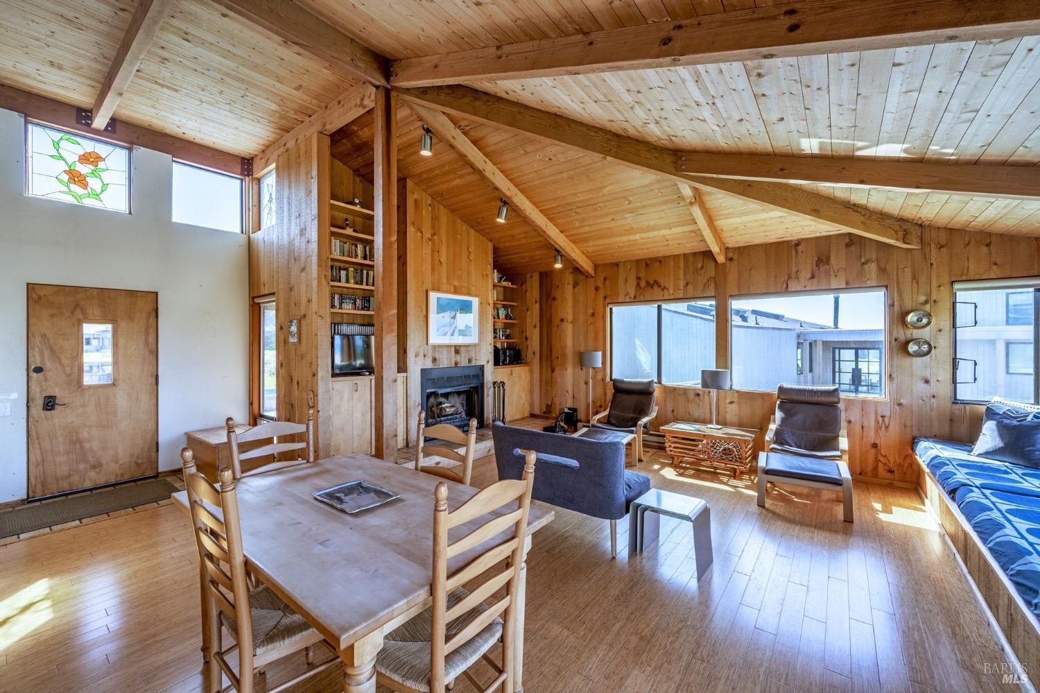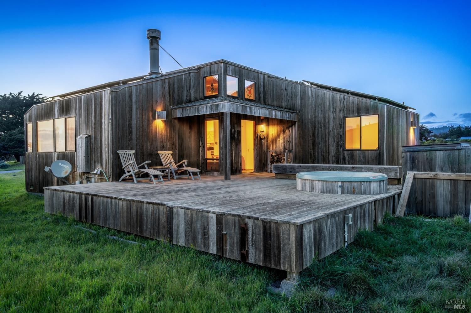 Adorable, West Meadow, 2 bed/ 2 bath, one-level home designed by Don Jacobs, FAIA, with close proximity to ocean bluff trail. Cozy living room features warm wood walls, open beam ceiling, fireplace, built-in shelving and a window seat. Dining area opens to outdoor deck with ocean view. Kitchen has wood cabinetry, window over sink and closet pantry. Down the hall you'll find the guest bathroom, guest bedroom and ensuite primary bedroom with a sliding glass door that opens to an outdoor deck with ocean view. The back deck with a hot tub makes for a great place to relax by day or by night. Roof mount solar electric system. Enjoy all the amenities The Sea Ranch has to offer including 40+ miles of trails, beaches, three recreation centers with pools, pickleball/tennis courts. Close to town of Gualala for shopping, services and dining. Sold turnkey. Bring your imagination and ideas to make this home your very own.