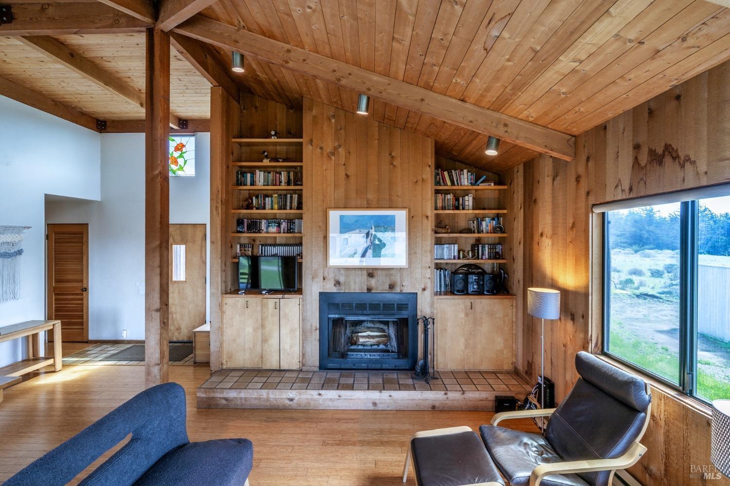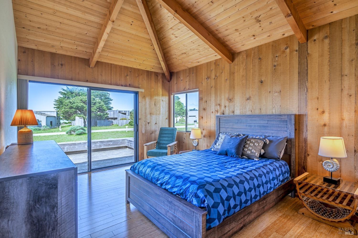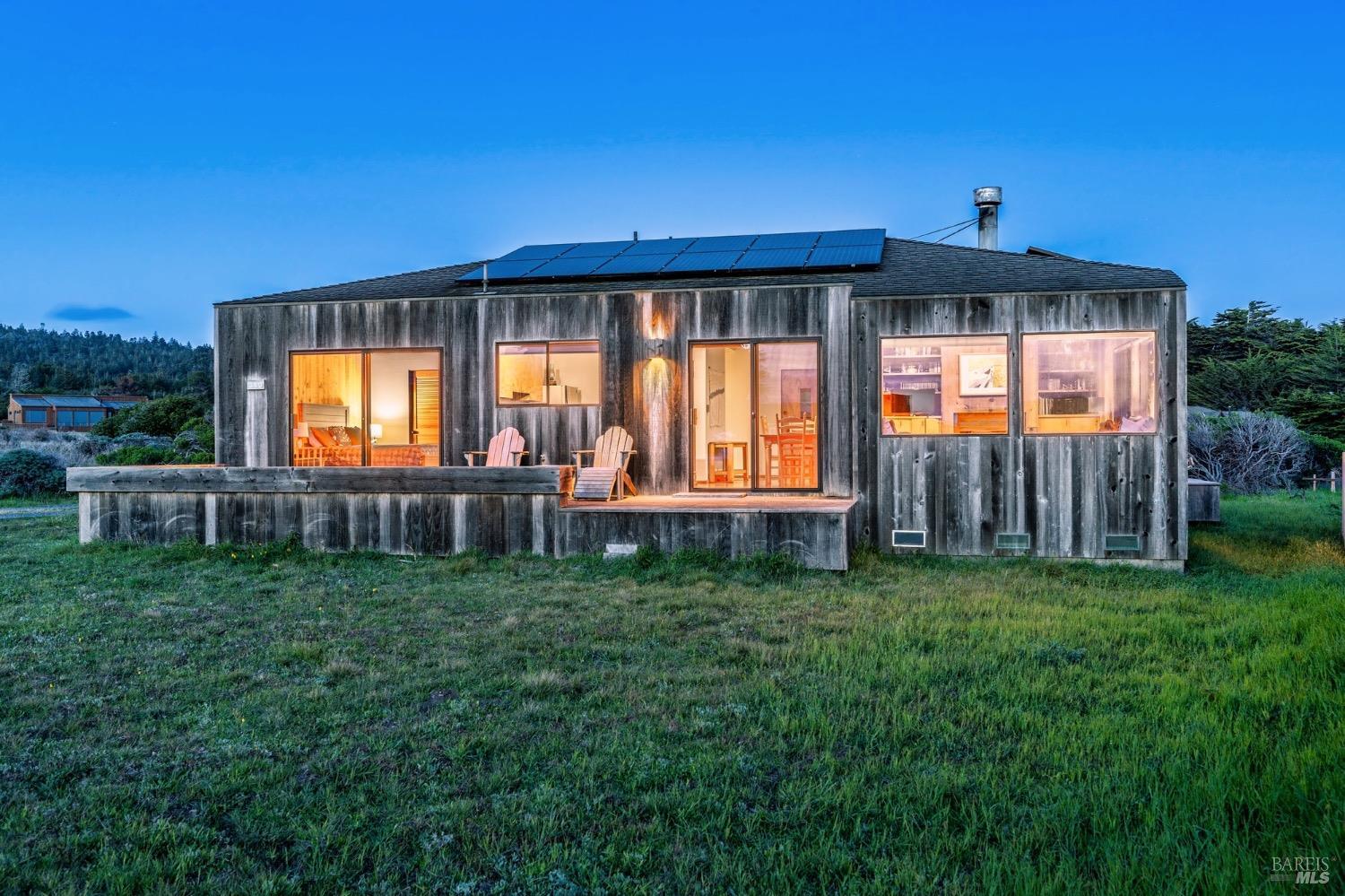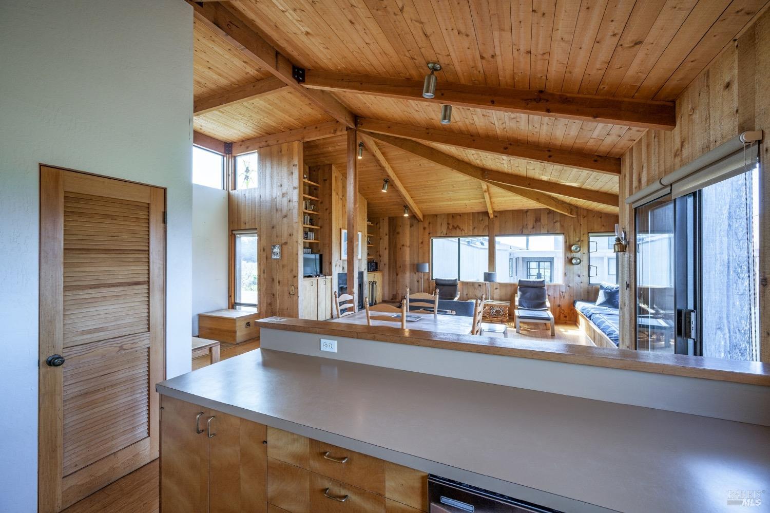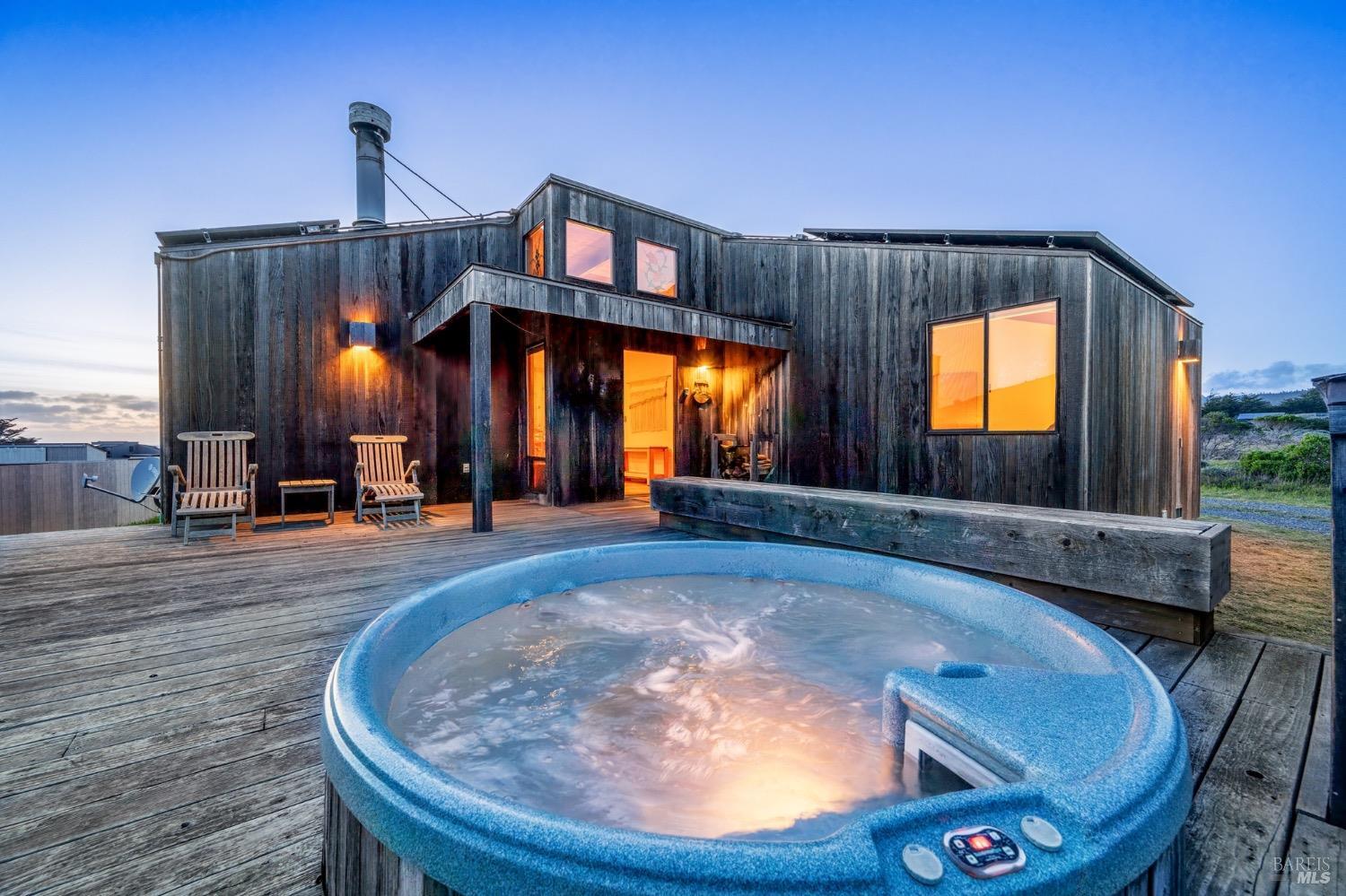 Adorable, West Meadow, 2 bed/ 2 bath, one-level home designed by Don Jacobs, FAIA, with close proximity to ocean bluff trail. Cozy living room features warm wood walls, open beam ceiling, fireplace, built-in shelving and a window seat. Dining area opens to outdoor deck with ocean view. Kitchen has wood cabinetry, window over sink and closet pantry. Down the hall you'll find the guest bathroom, guest bedroom and ensuite primary bedroom with a sliding glass door that opens to an outdoor deck with ocean view. The back deck with a hot tub makes for a great place to relax by day or by night. Roof mount solar electric system. Enjoy all the amenities The Sea Ranch has to offer including 40+ miles of trails, beaches, three recreation centers with pools, pickleball/tennis courts. Close to town of Gualala for shopping, services and dining. Sold turnkey. Bring your imagination and ideas to make this home your very own.