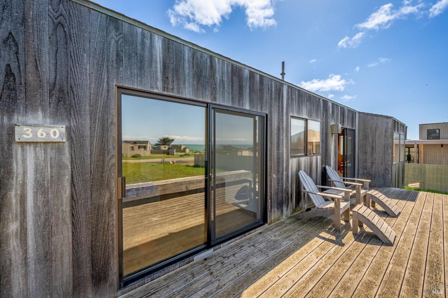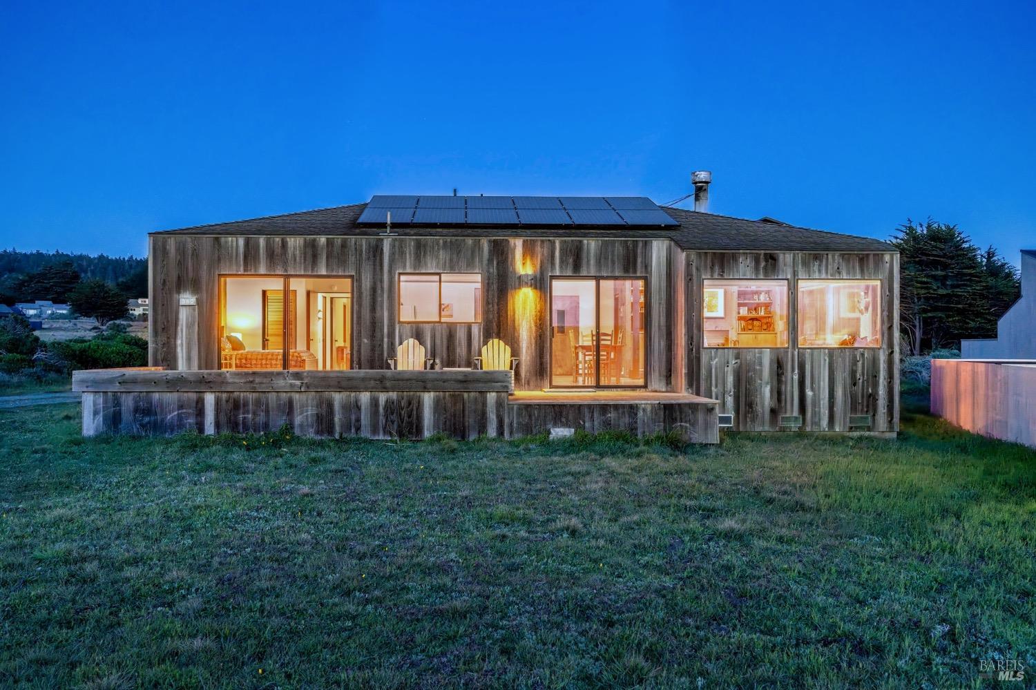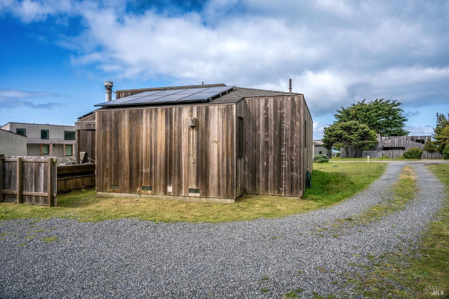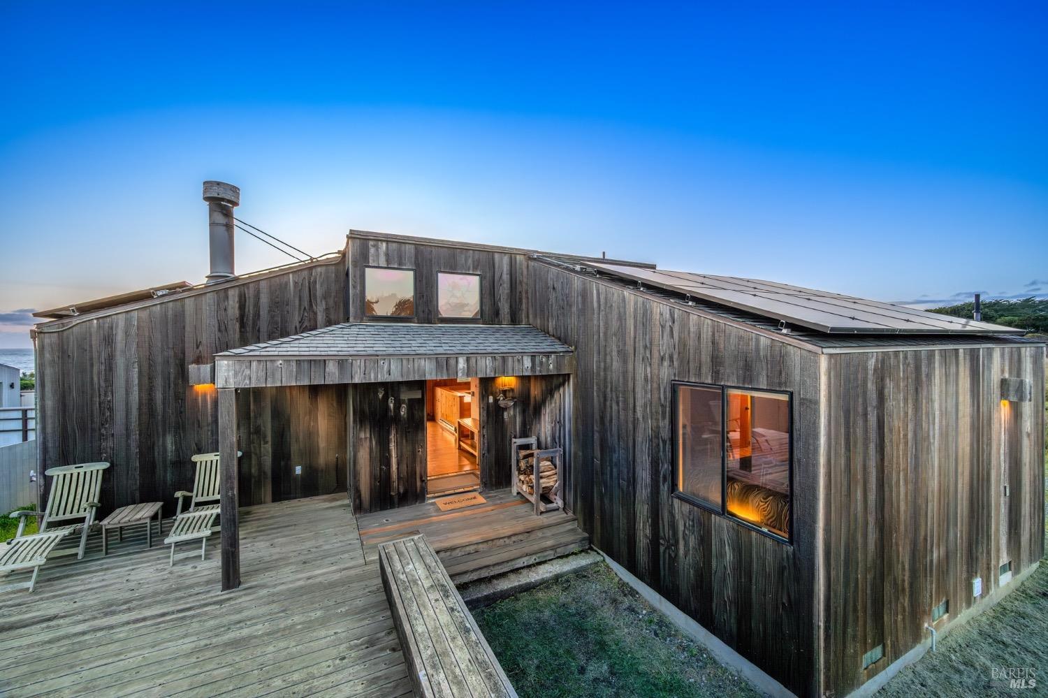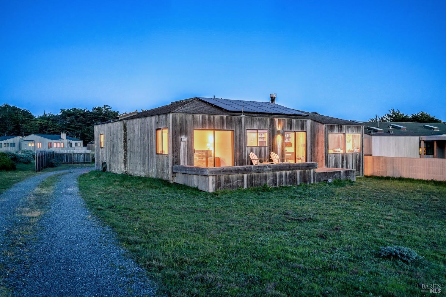 Adorable, West Meadow, 2 bed/ 2 bath, one-level home designed by Don Jacobs, FAIA, with close proximity to ocean bluff trail. Cozy living room features warm wood walls, open beam ceiling, fireplace, built-in shelving and a window seat. Dining area opens to outdoor deck with ocean view. Kitchen has wood cabinetry, window over sink and closet pantry. Down the hall you'll find the guest bathroom, guest bedroom and ensuite primary bedroom with a sliding glass door that opens to an outdoor deck with ocean view. The back deck with a hot tub makes for a great place to relax by day or by night. Roof mount solar electric system. Enjoy all the amenities The Sea Ranch has to offer including 40+ miles of trails, beaches, three recreation centers with pools, pickleball/tennis courts. Close to town of Gualala for shopping, services and dining. Sold turnkey. Bring your imagination and ideas to make this home your very own.