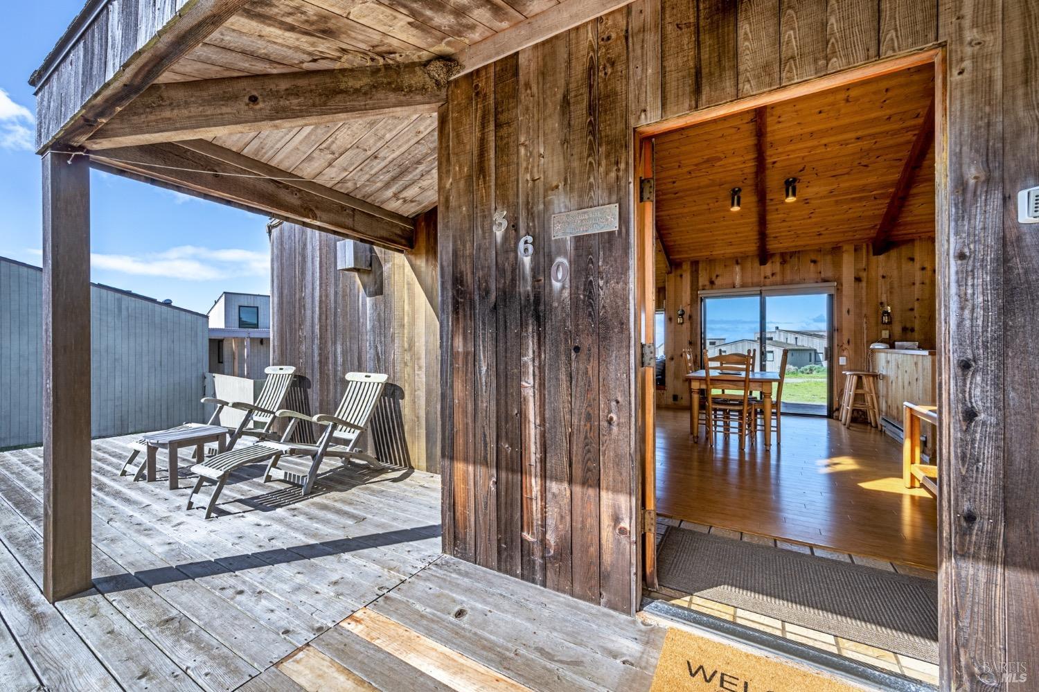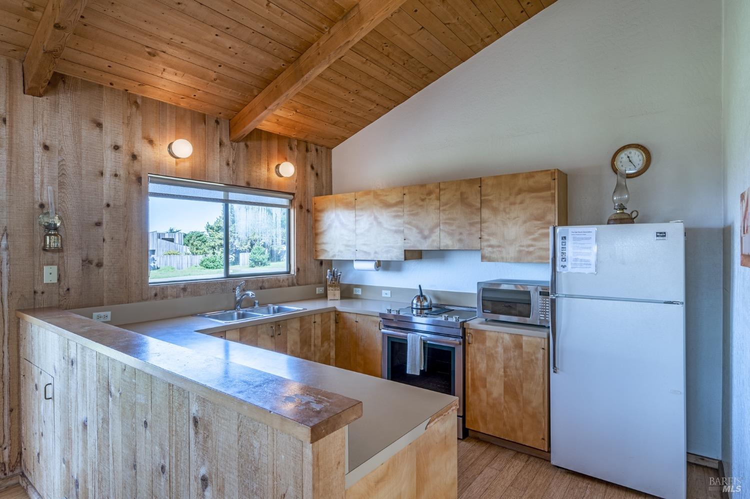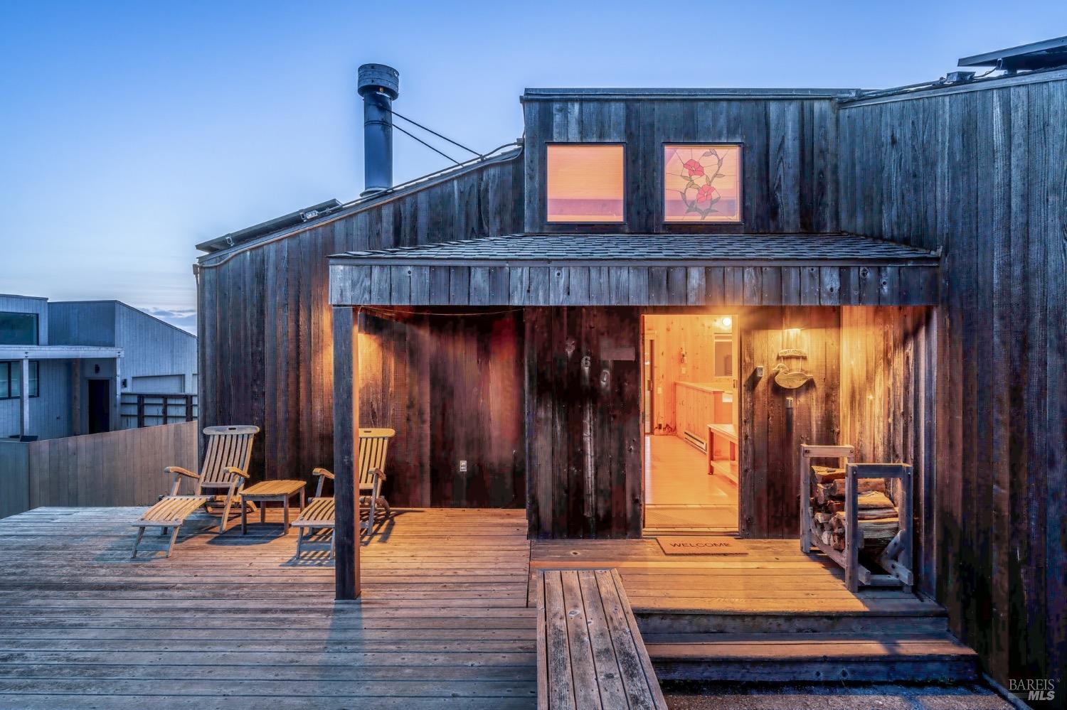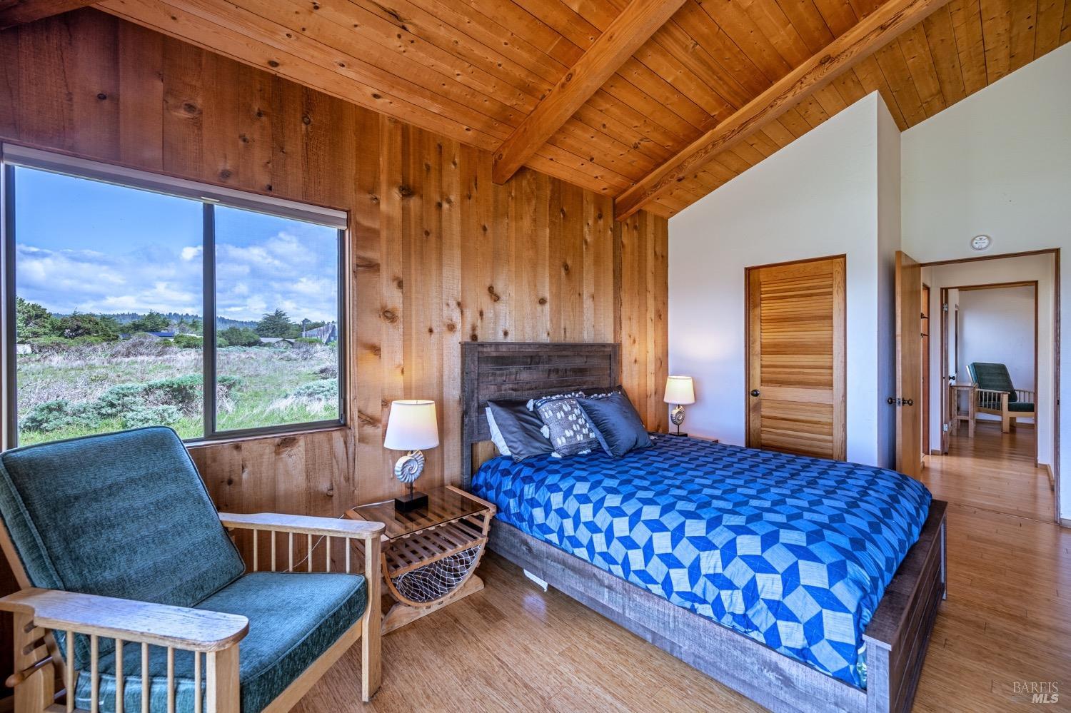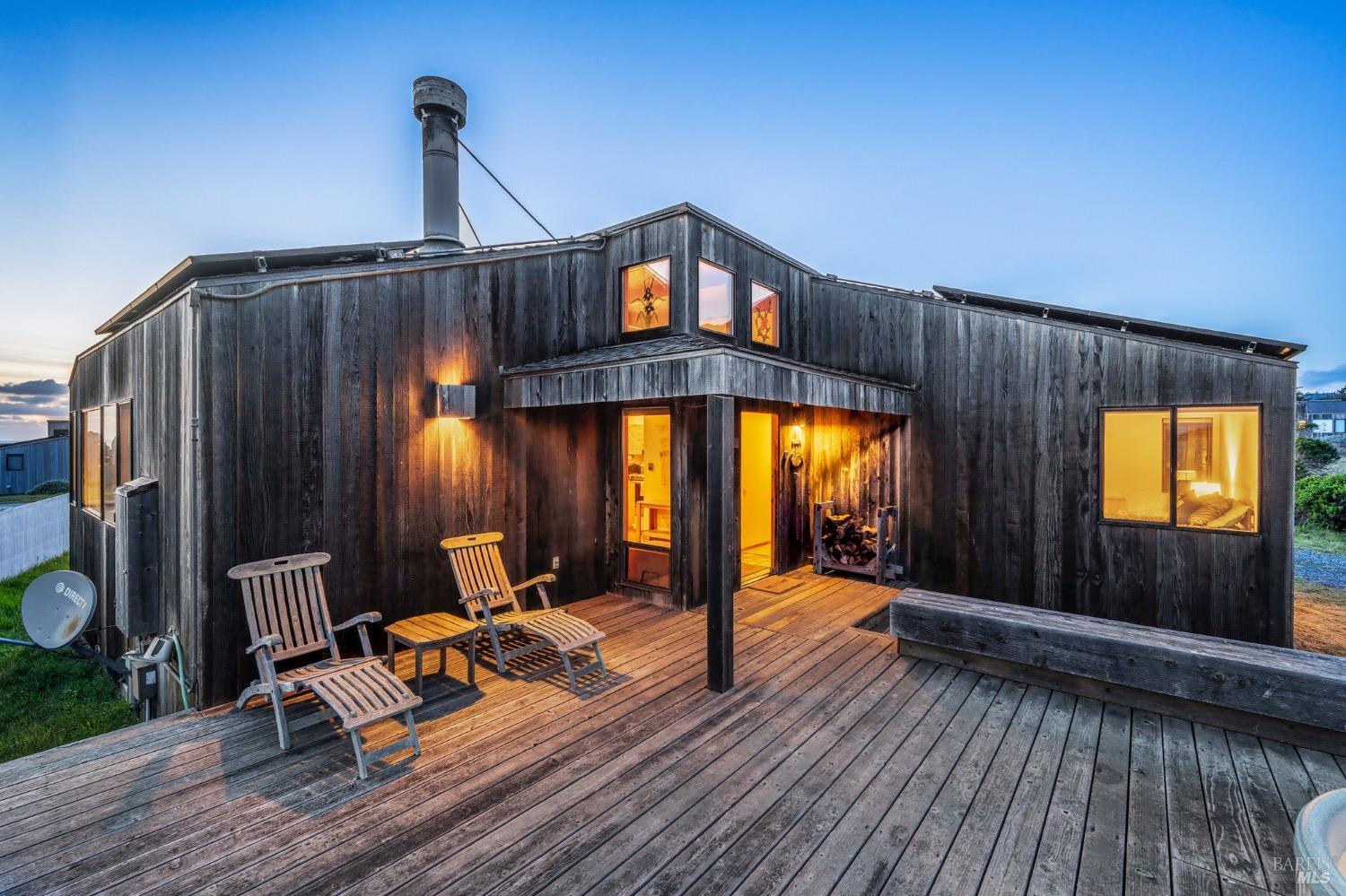 Adorable, West Meadow, 2 bed/ 2 bath, one-level home designed by Don Jacobs, FAIA, with close proximity to ocean bluff trail. Cozy living room features warm wood walls, open beam ceiling, fireplace, built-in shelving and a window seat. Dining area opens to outdoor deck with ocean view. Kitchen has wood cabinetry, window over sink and closet pantry. Down the hall you'll find the guest bathroom, guest bedroom and ensuite primary bedroom with a sliding glass door that opens to an outdoor deck with ocean view. The back deck with a hot tub makes for a great place to relax by day or by night. Roof mount solar electric system. Enjoy all the amenities The Sea Ranch has to offer including 40+ miles of trails, beaches, three recreation centers with pools, pickleball/tennis courts. Close to town of Gualala for shopping, services and dining. Sold turnkey. Bring your imagination and ideas to make this home your very own.