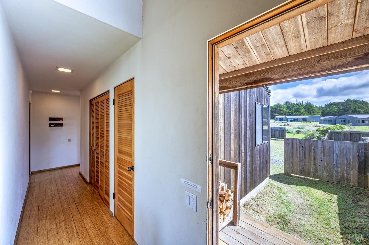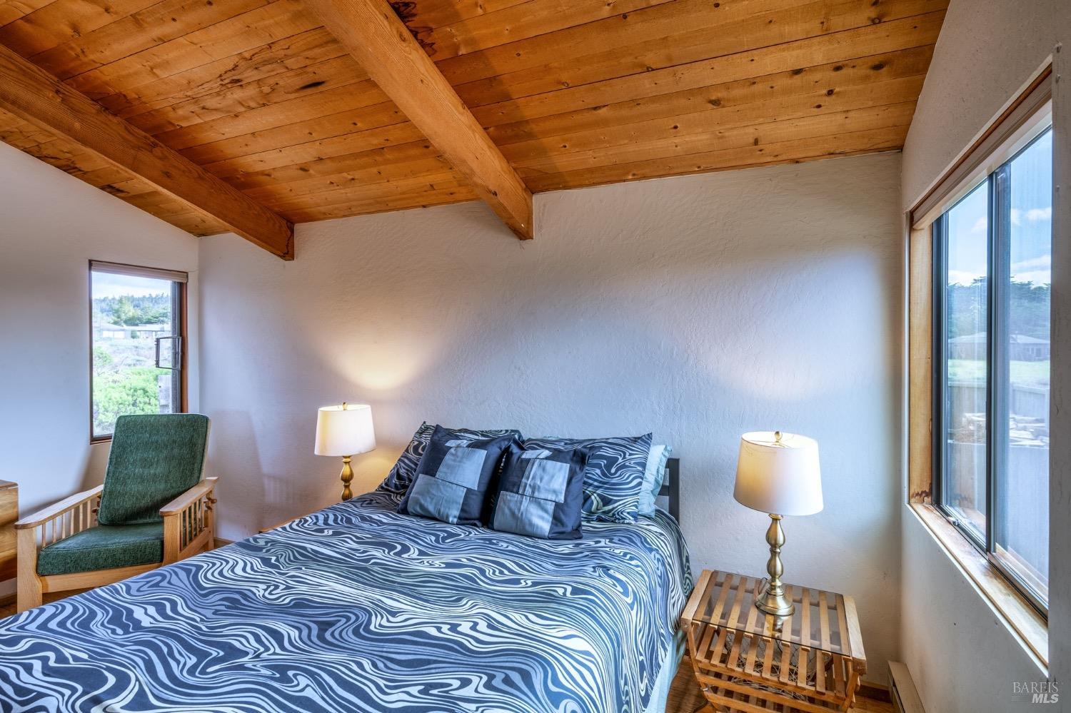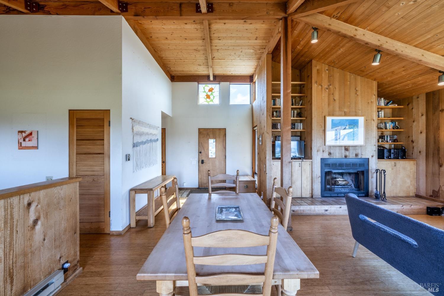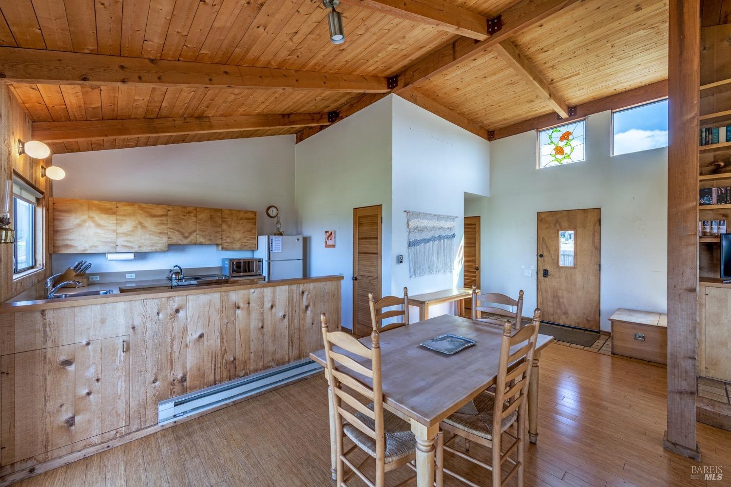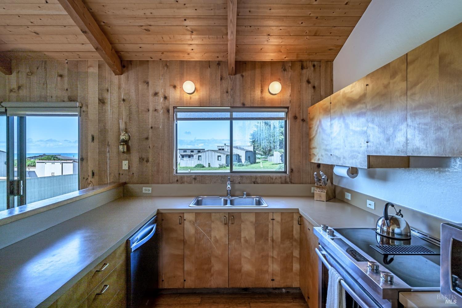 Adorable, West Meadow, 2 bed/ 2 bath, one-level home designed by Don Jacobs, FAIA, with close proximity to ocean bluff trail. Cozy living room features warm wood walls, open beam ceiling, fireplace, built-in shelving and a window seat. Dining area opens to outdoor deck with ocean view. Kitchen has wood cabinetry, window over sink and closet pantry. Down the hall you'll find the guest bathroom, guest bedroom and ensuite primary bedroom with a sliding glass door that opens to an outdoor deck with ocean view. The back deck with a hot tub makes for a great place to relax by day or by night. Roof mount solar electric system. Enjoy all the amenities The Sea Ranch has to offer including 40+ miles of trails, beaches, three recreation centers with pools, pickleball/tennis courts. Close to town of Gualala for shopping, services and dining. Sold turnkey. Bring your imagination and ideas to make this home your very own.