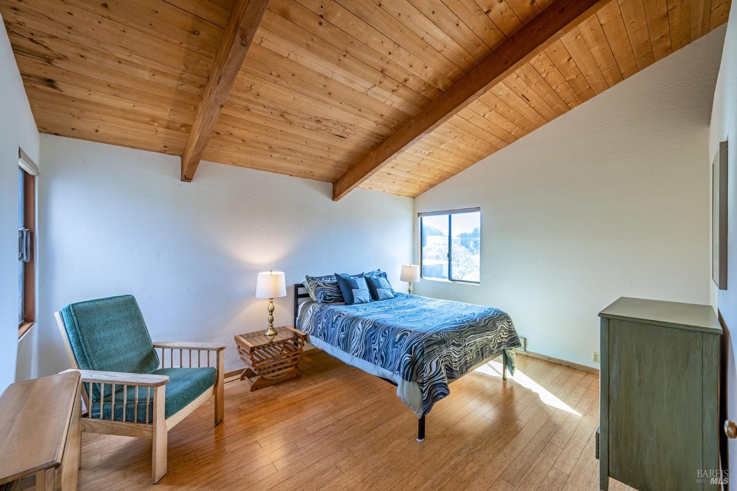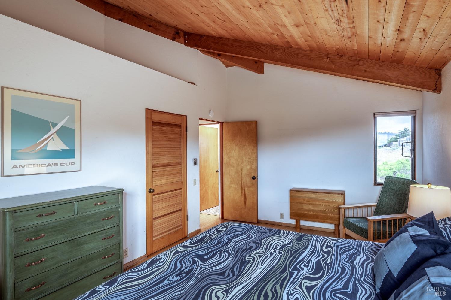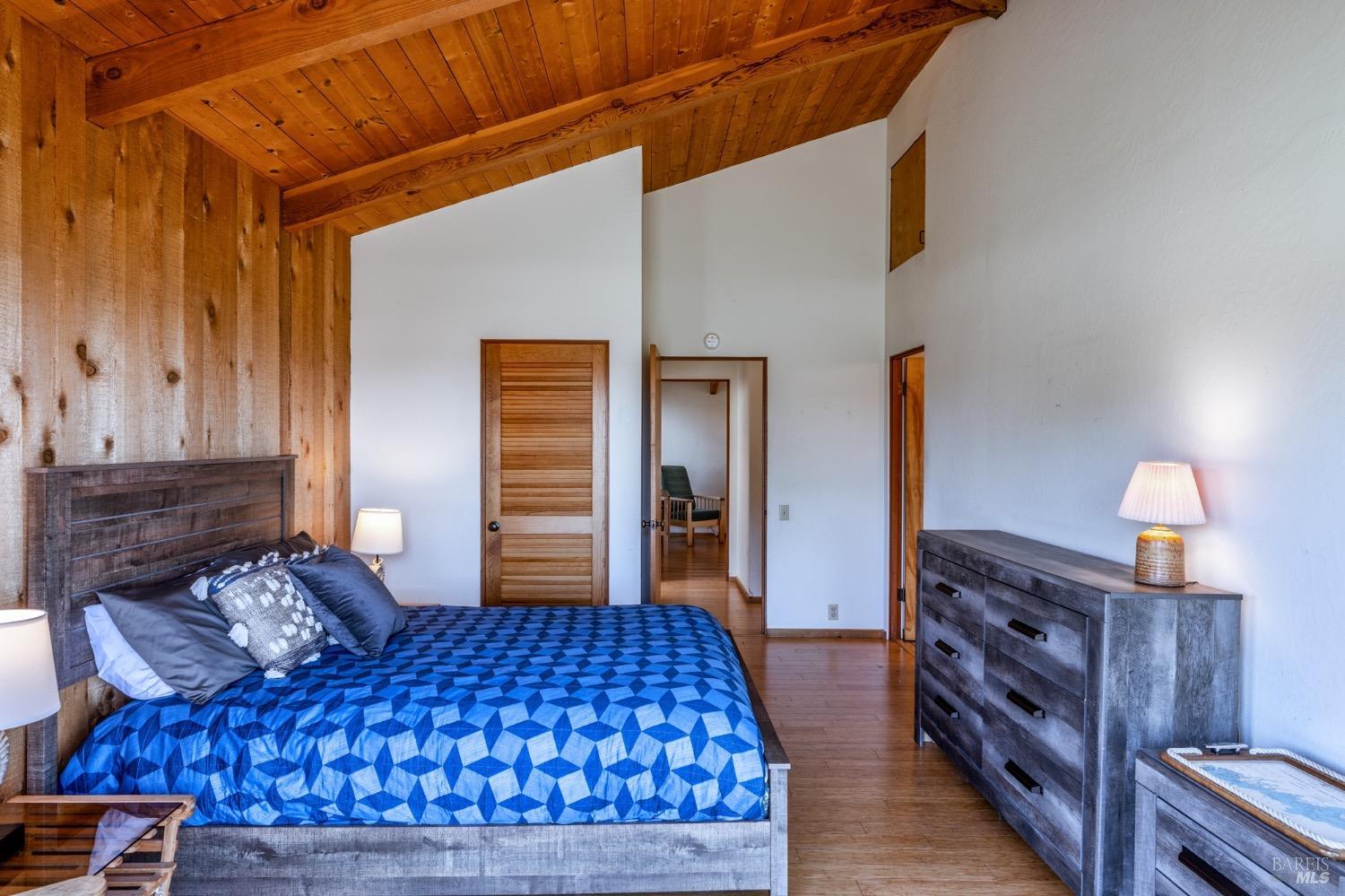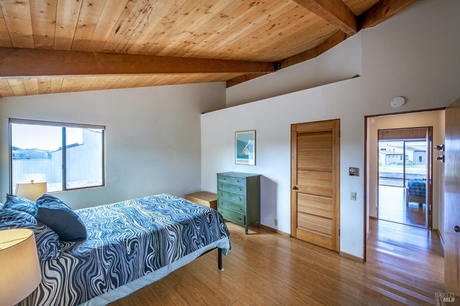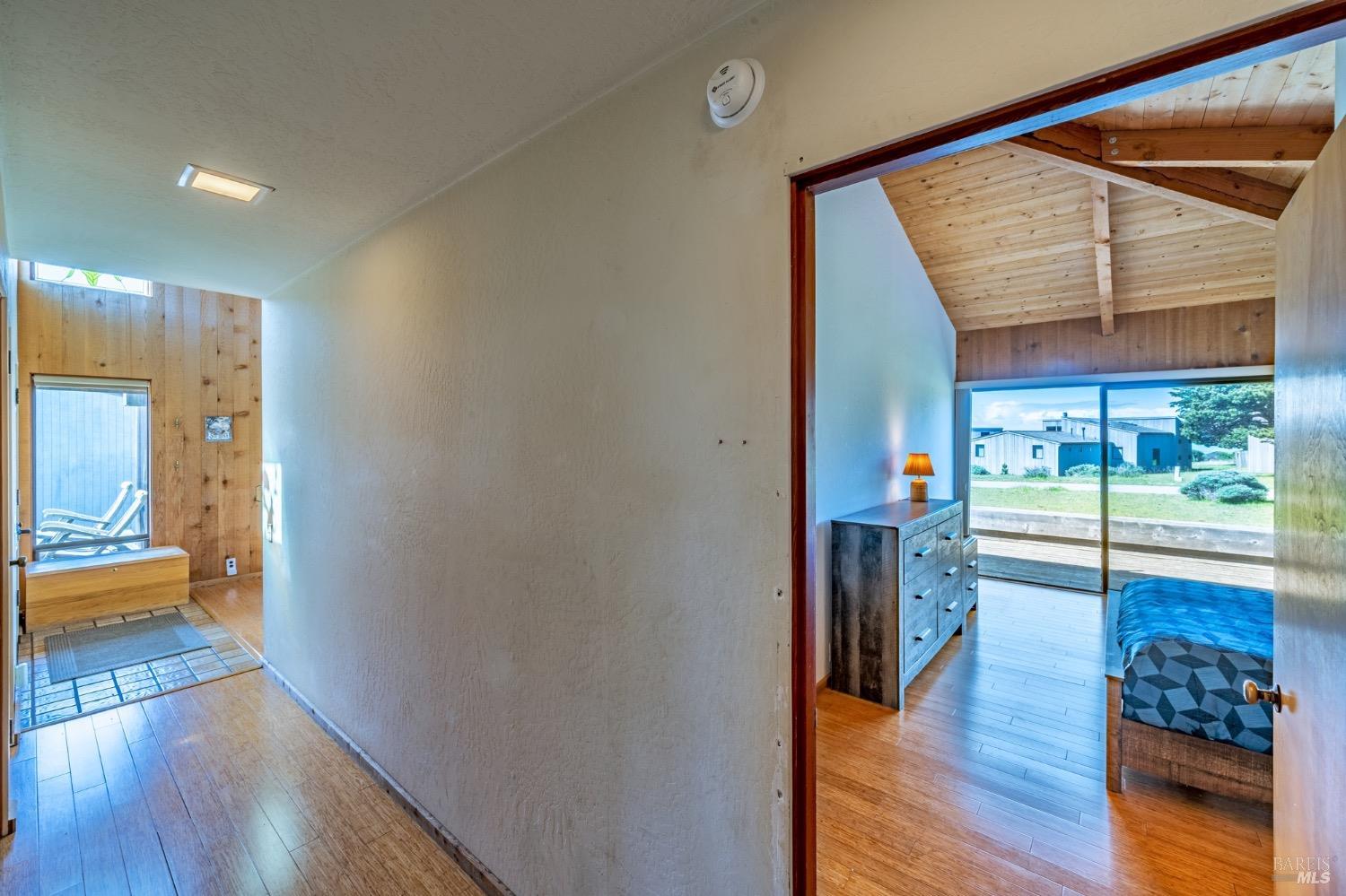 Adorable, West Meadow, 2 bed/ 2 bath, one-level home designed by Don Jacobs, FAIA, with close proximity to ocean bluff trail. Cozy living room features warm wood walls, open beam ceiling, fireplace, built-in shelving and a window seat. Dining area opens to outdoor deck with ocean view. Kitchen has wood cabinetry, window over sink and closet pantry. Down the hall you'll find the guest bathroom, guest bedroom and ensuite primary bedroom with a sliding glass door that opens to an outdoor deck with ocean view. The back deck with a hot tub makes for a great place to relax by day or by night. Roof mount solar electric system. Enjoy all the amenities The Sea Ranch has to offer including 40+ miles of trails, beaches, three recreation centers with pools, pickleball/tennis courts. Close to town of Gualala for shopping, services and dining. Sold turnkey. Bring your imagination and ideas to make this home your very own.
