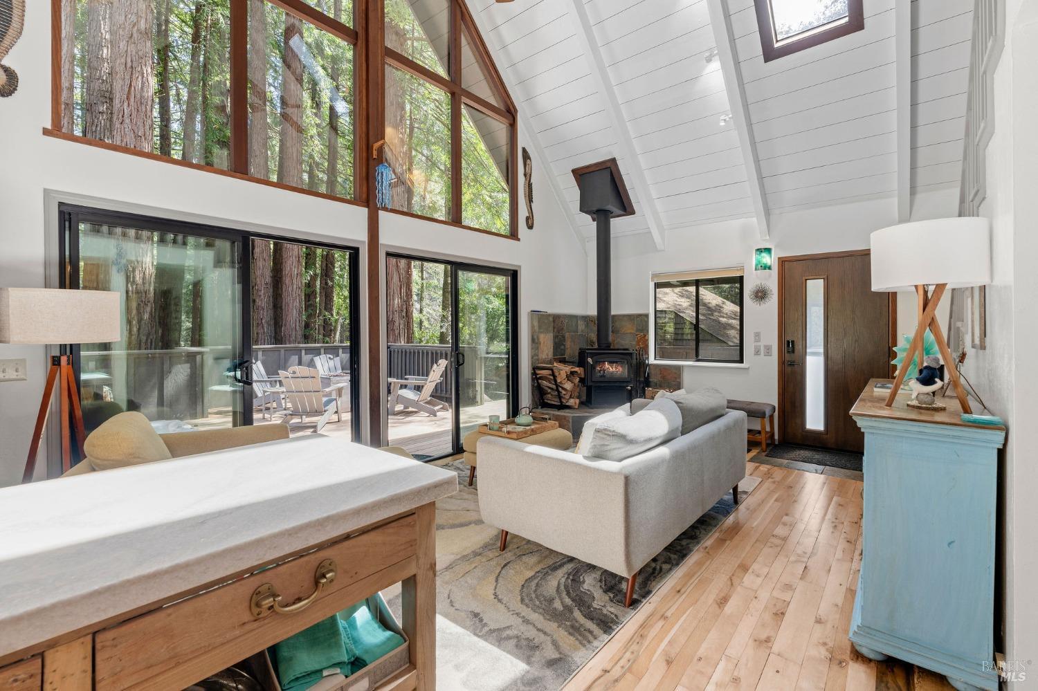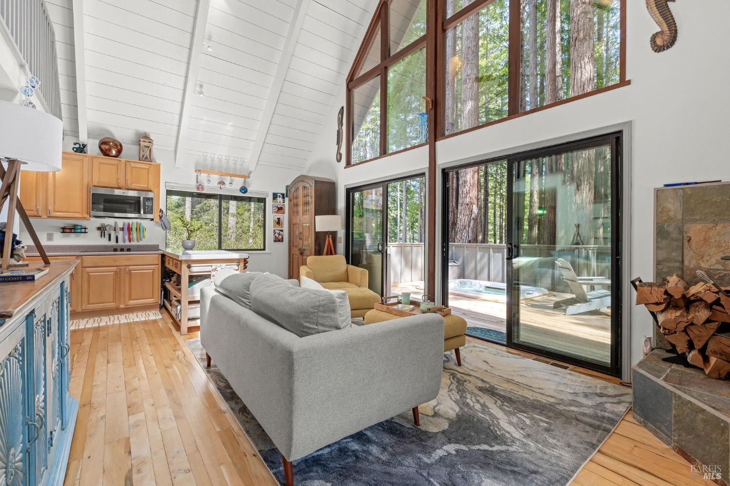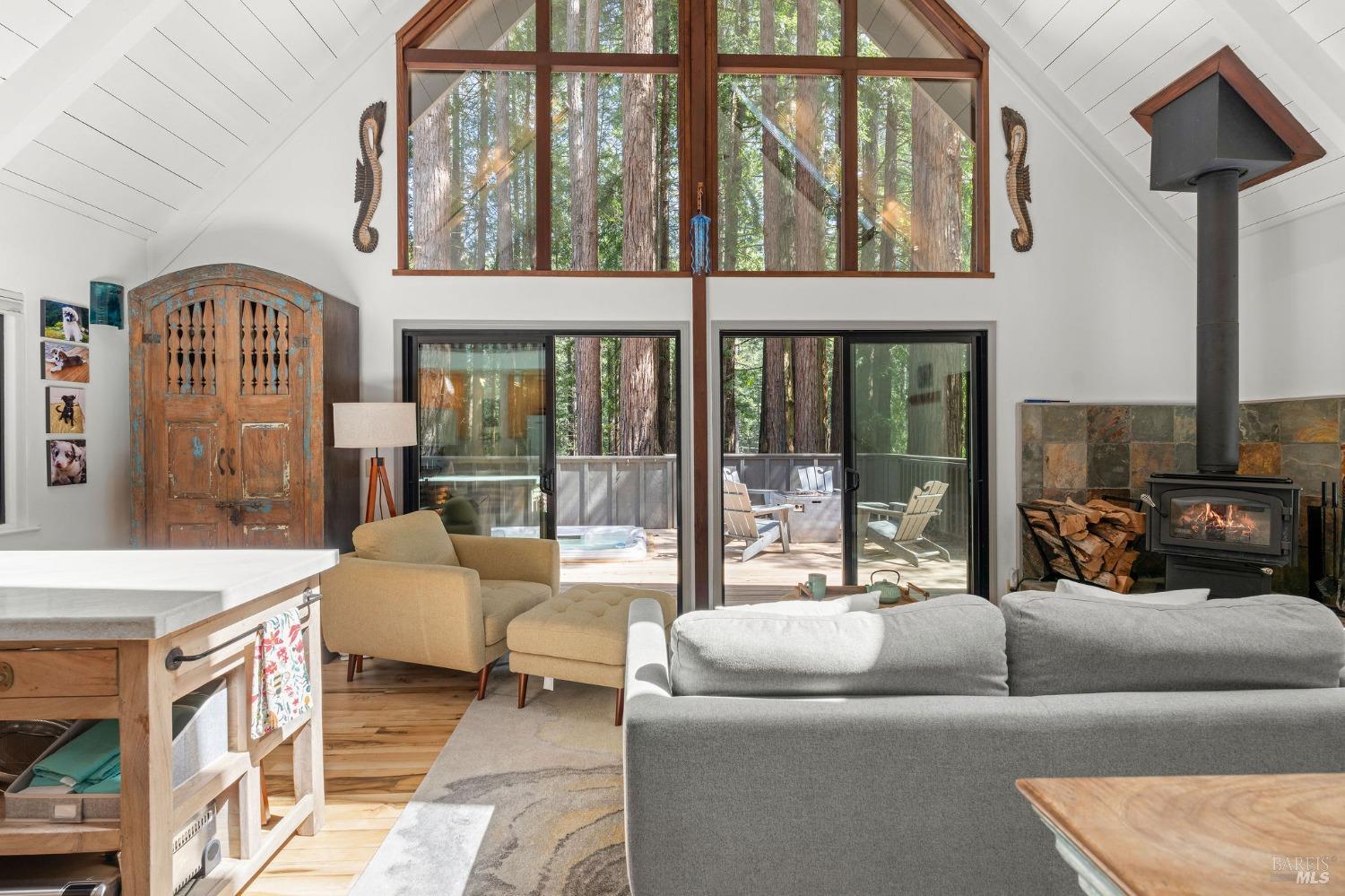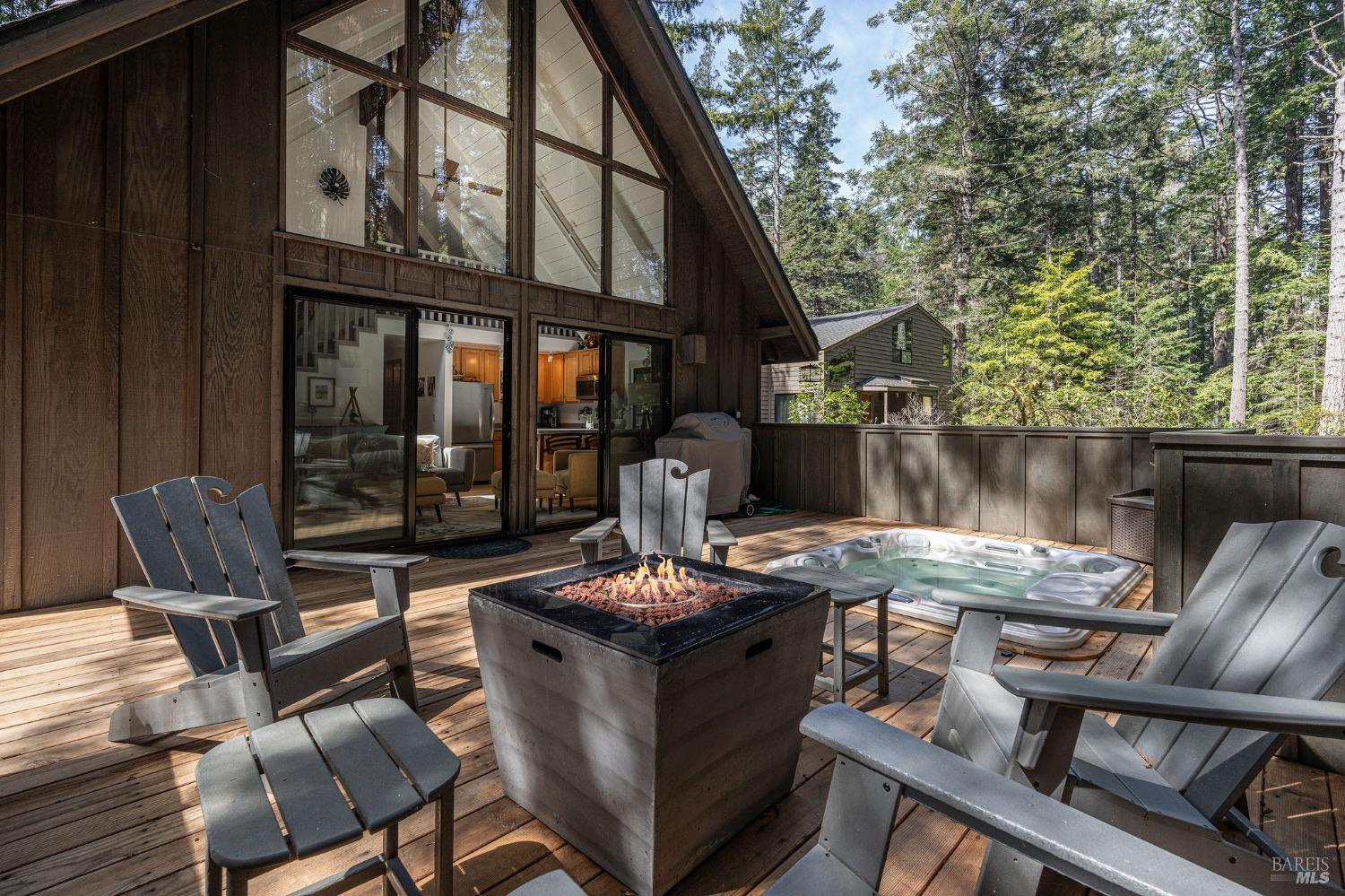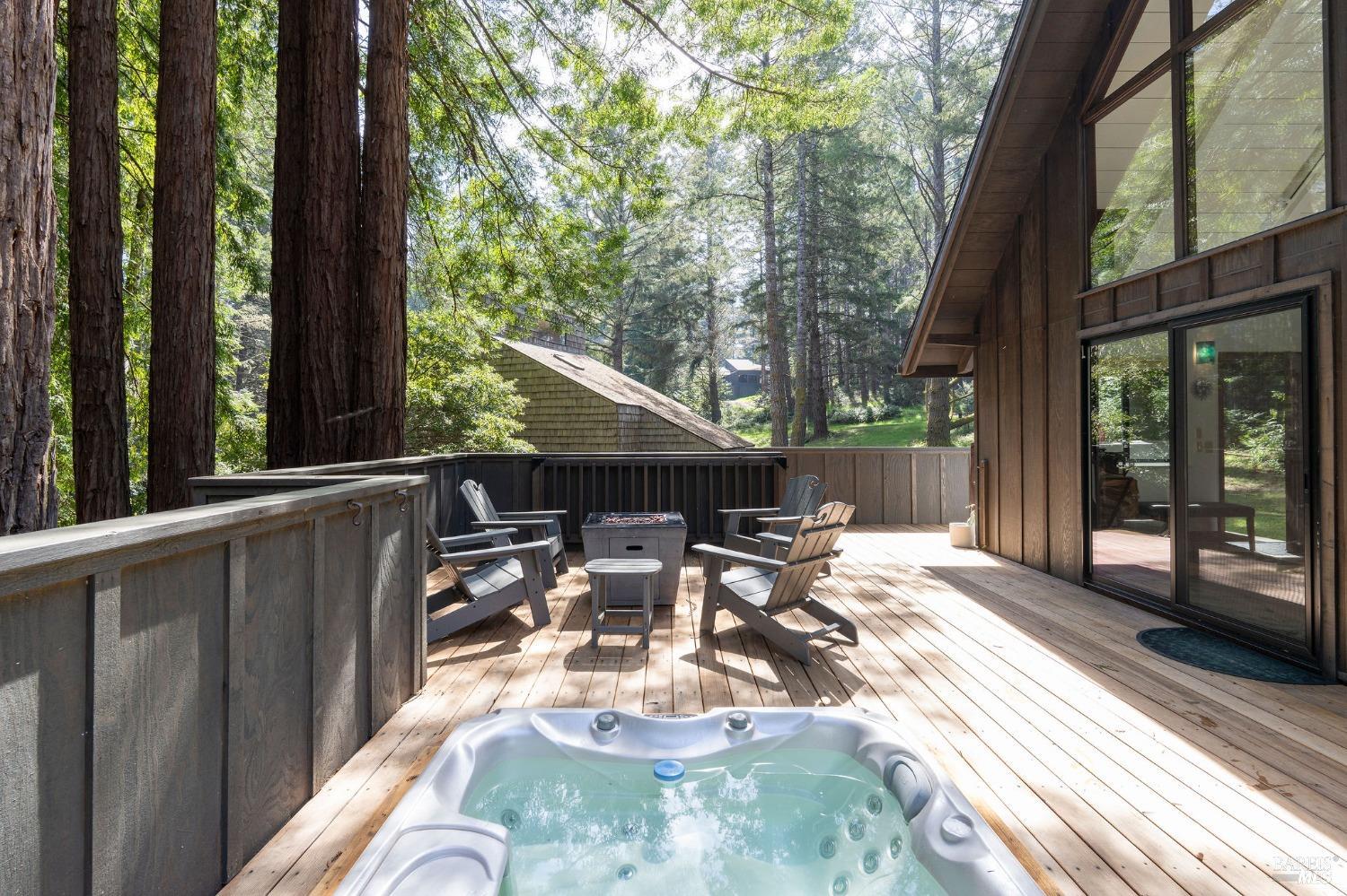 Tranquility Awaits at the Dancing Raven in The Sea Ranch. Nestled among towering redwoods and enchanting fairy rings, this charming 2-bedroom, 1-bathroom A-frame offers a serene retreat. Ideally positioned between the Pacific Ocean and the Gualala River, a scenic trail behind the home provides easy access to both. Inside, soaring ceilings create an airy, open feel, while recent upgrades including new interior doors, a brand-new deck, and a built-in hot tub enhance both comfort and style. A spacious loft offers flexible living space, perfect for a home office, guest area, or artist studio. The Sea Ranch community is serviced by underground utilities, including high-speed fiber optic internet (this home operates on a septic system). Residents enjoy a wealth of amenities, such as 50+ miles of trails, three recreational centers with outdoor heated pools, tennis and pickleball courts, security, and fire station. Experience the magic of coastal living at Dancing Raven where nature, comfort, and community come together.