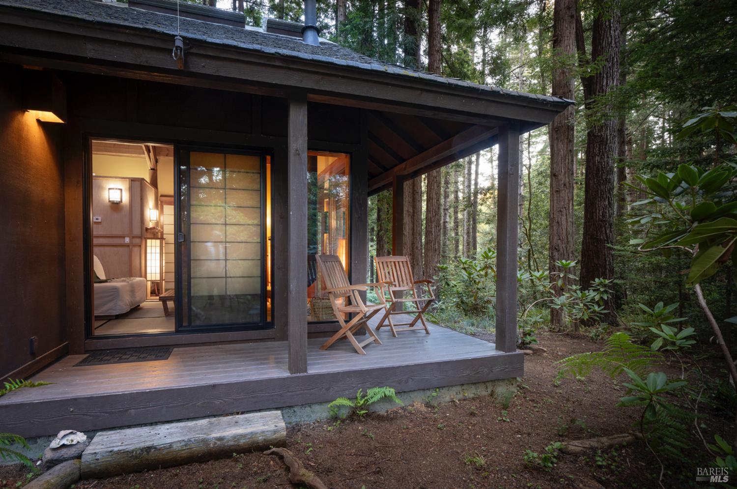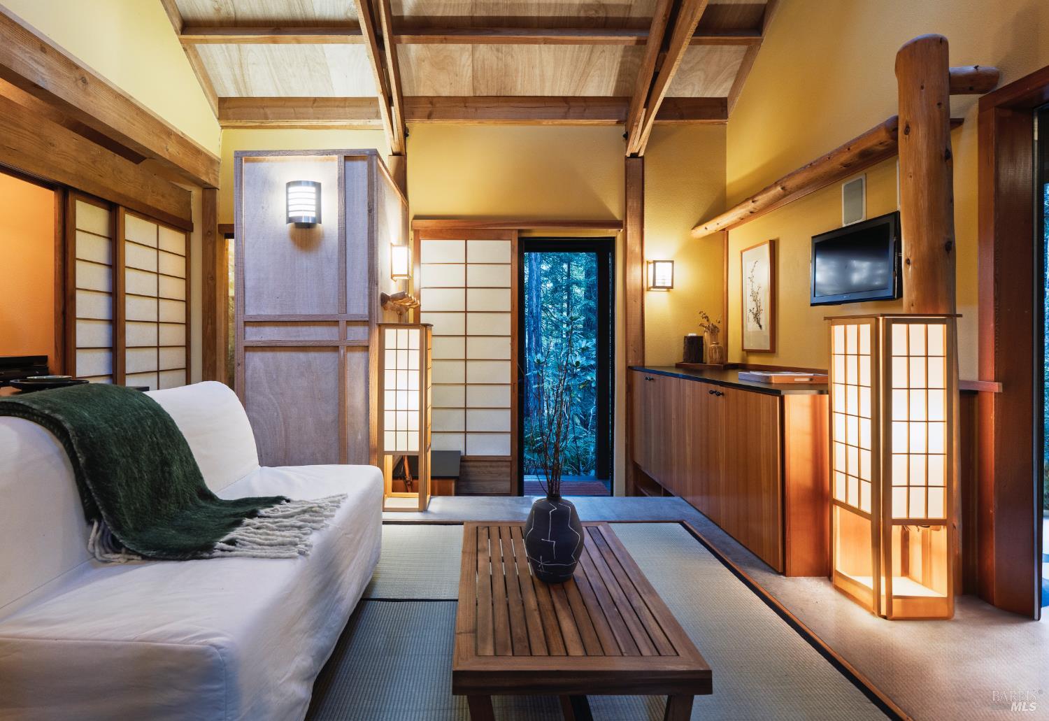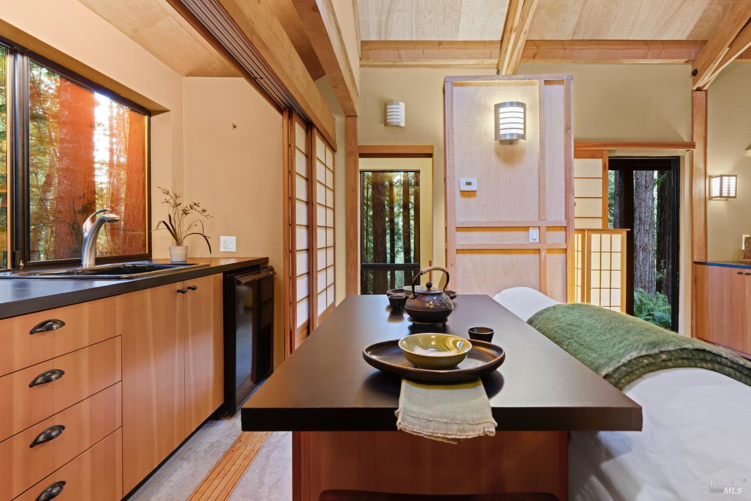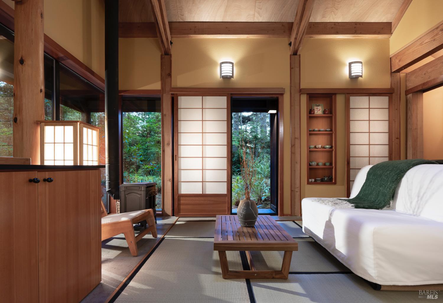 Follow your path through a calming walking experience of the forest before reaching the Tea House. Tea House is a weekend retreat of approximately 384 square foot size with a Japanese aesthetic. Inspired by tea house tradition inside and out, it's an exquisite example of making multiple uses out of a single space by distilling needs down to what really matters. By using alcoves, shoji screens, and a tokonoma it elegantly accommodates living, dining, kitchen, and sleeping all centered on a traditional tatami mat floor. The tiny building appears lifted into place among the redwood trees. Designed by local Architect Fiona E. O'Neill, a one woman-owned firm designing homes at The Sea Ranch since 1991.