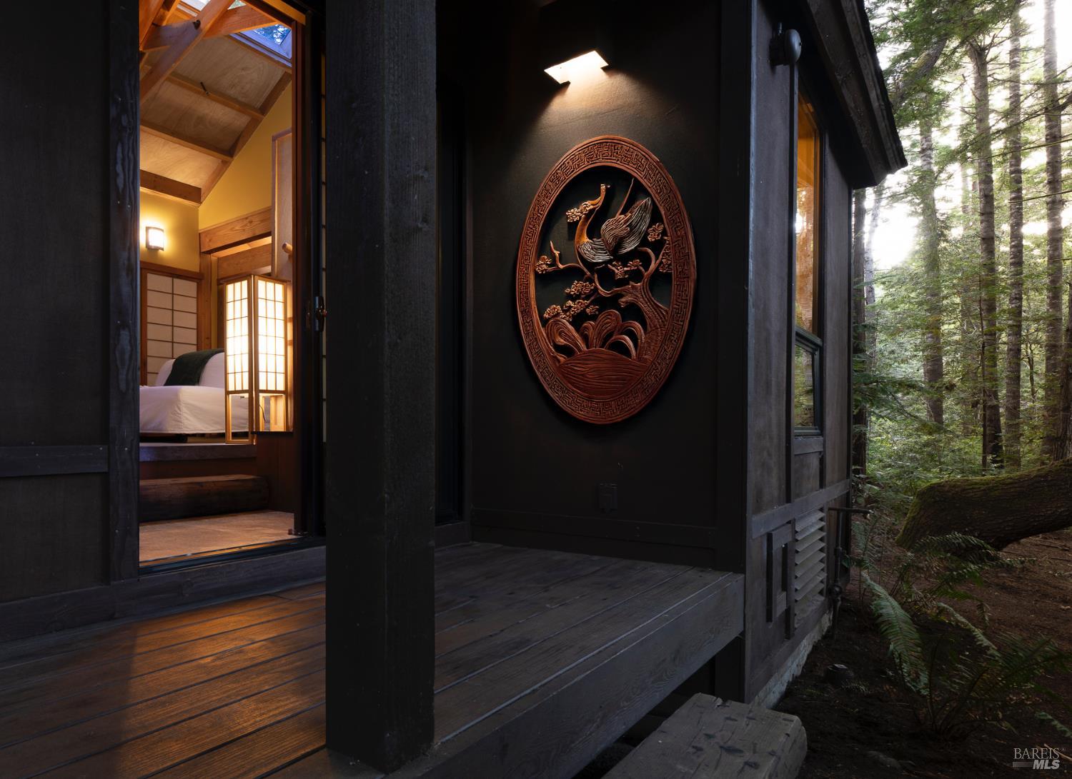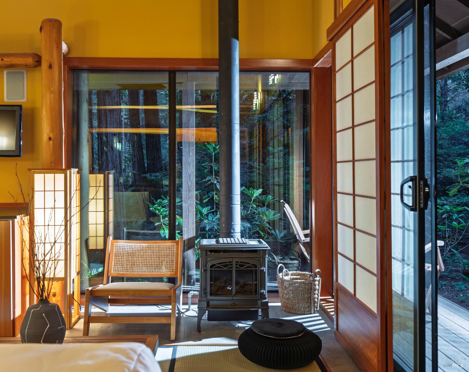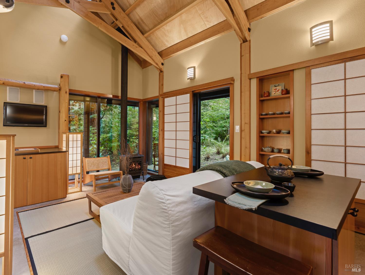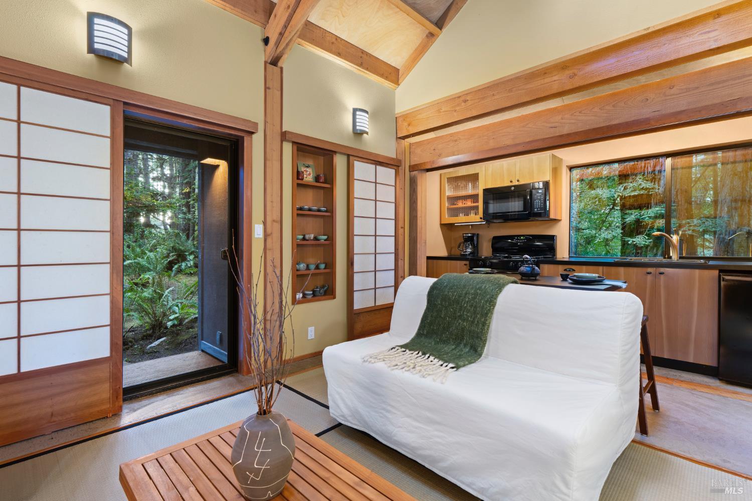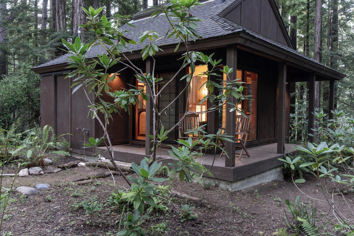 Follow your path through a calming walking experience of the forest before reaching the Tea House. Tea House is a weekend retreat of approximately 384 square foot size with a Japanese aesthetic. Inspired by tea house tradition inside and out, it's an exquisite example of making multiple uses out of a single space by distilling needs down to what really matters. By using alcoves, shoji screens, and a tokonoma it elegantly accommodates living, dining, kitchen, and sleeping all centered on a traditional tatami mat floor. The tiny building appears lifted into place among the redwood trees. Designed by local Architect Fiona E. O'Neill, a one woman-owned firm designing homes at The Sea Ranch since 1991.