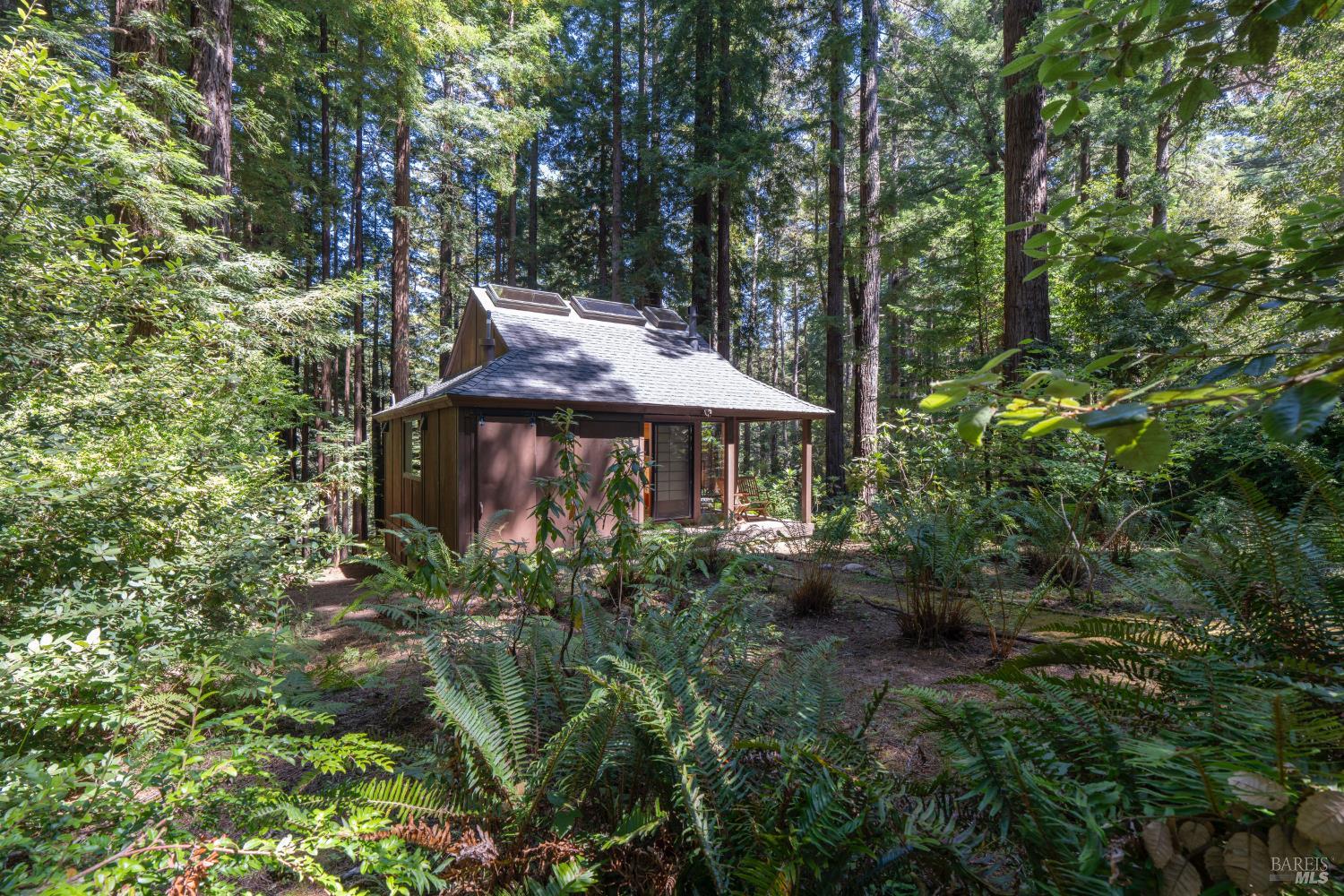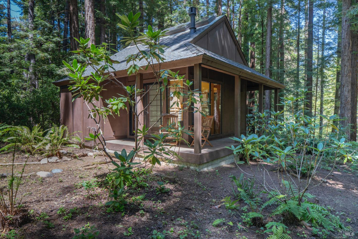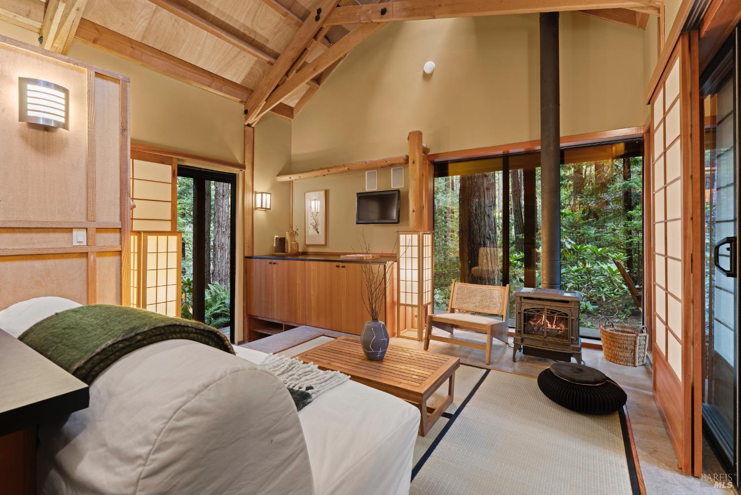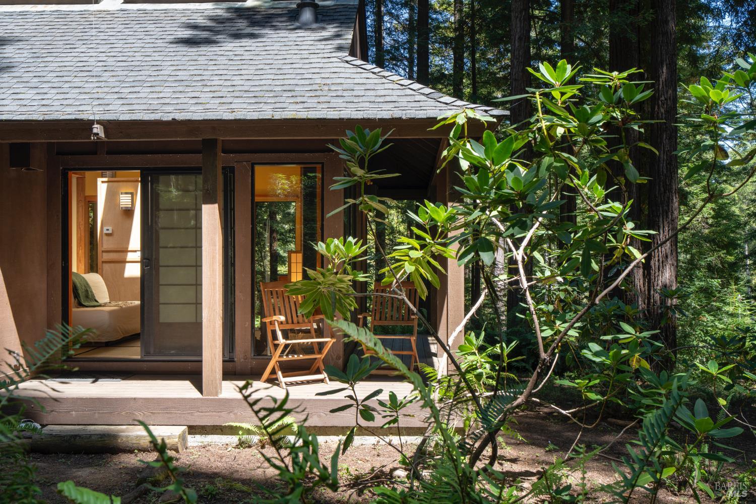 Follow your path through a calming walking experience of the forest before reaching the Tea House. Tea House is a weekend retreat of approximately 384 square foot size with a Japanese aesthetic. Inspired by tea house tradition inside and out, it's an exquisite example of making multiple uses out of a single space by distilling needs down to what really matters. By using alcoves, shoji screens, and a tokonoma it elegantly accommodates living, dining, kitchen, and sleeping all centered on a traditional tatami mat floor. The tiny building appears lifted into place among the redwood trees. Designed by local Architect Fiona E. O'Neill, a one woman-owned firm designing homes at The Sea Ranch since 1991.