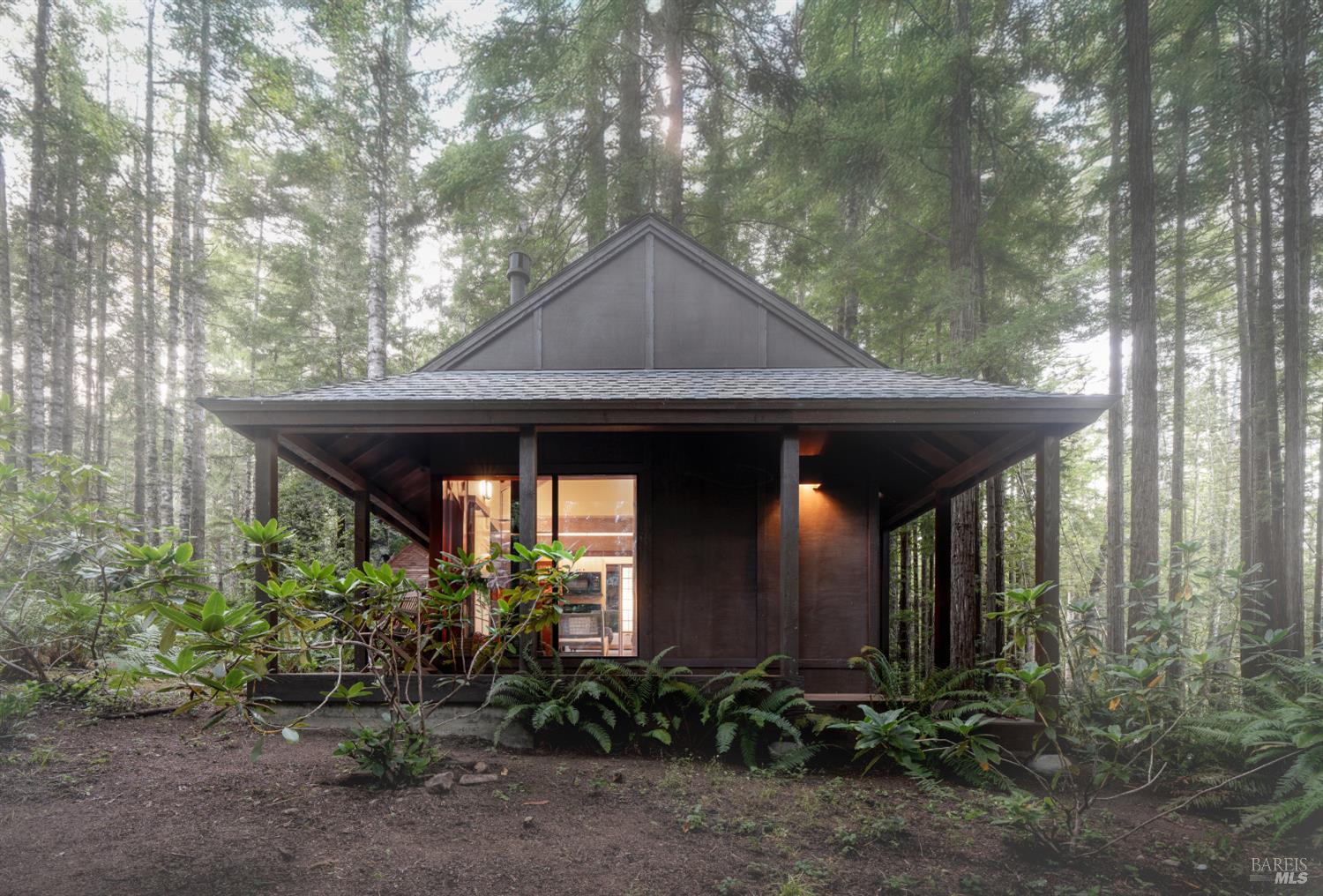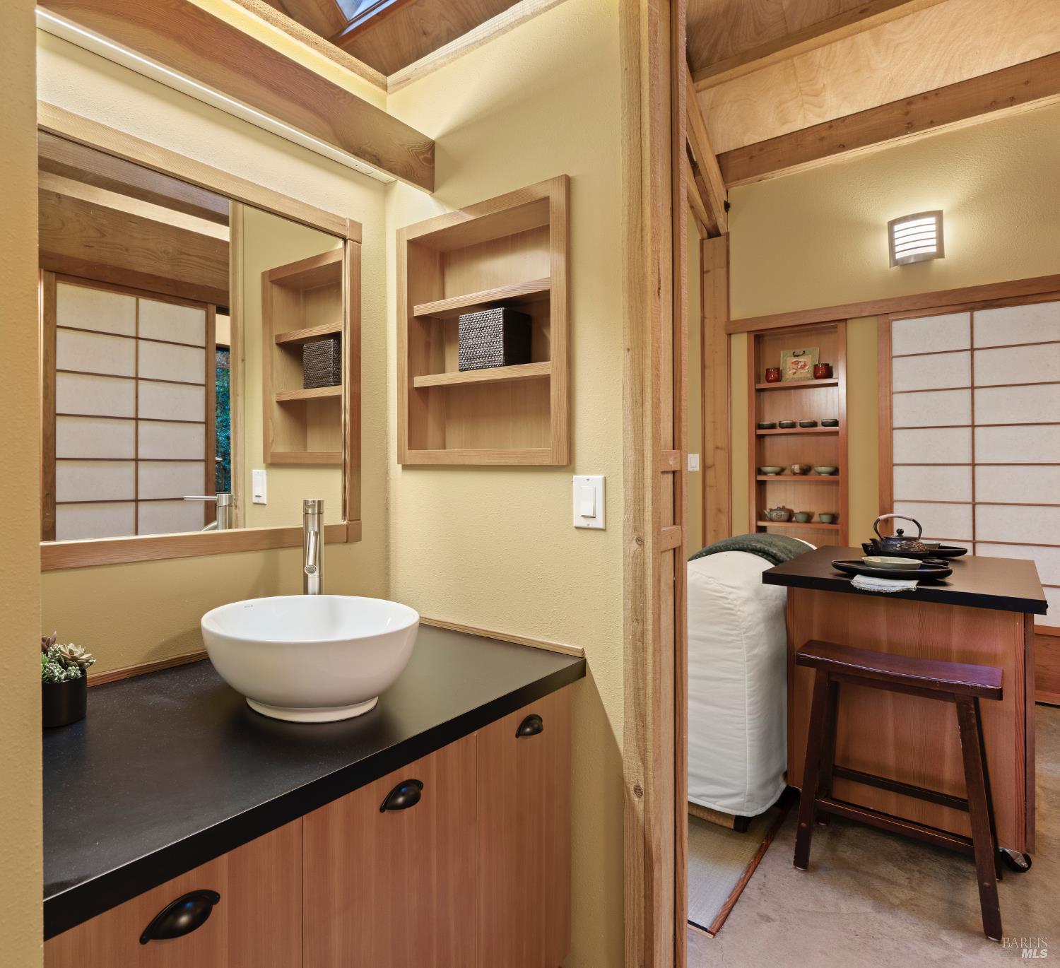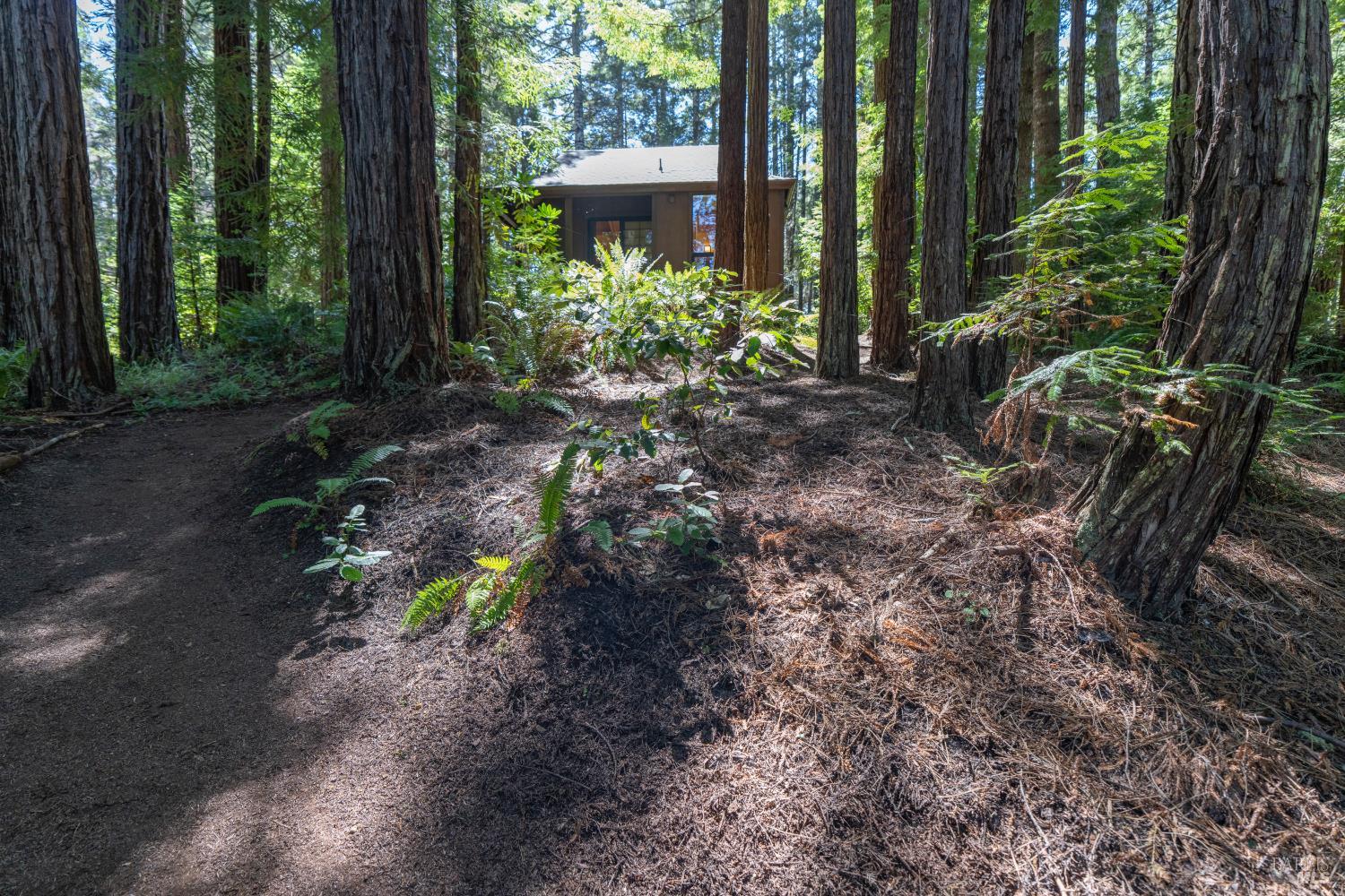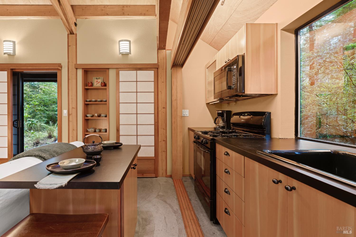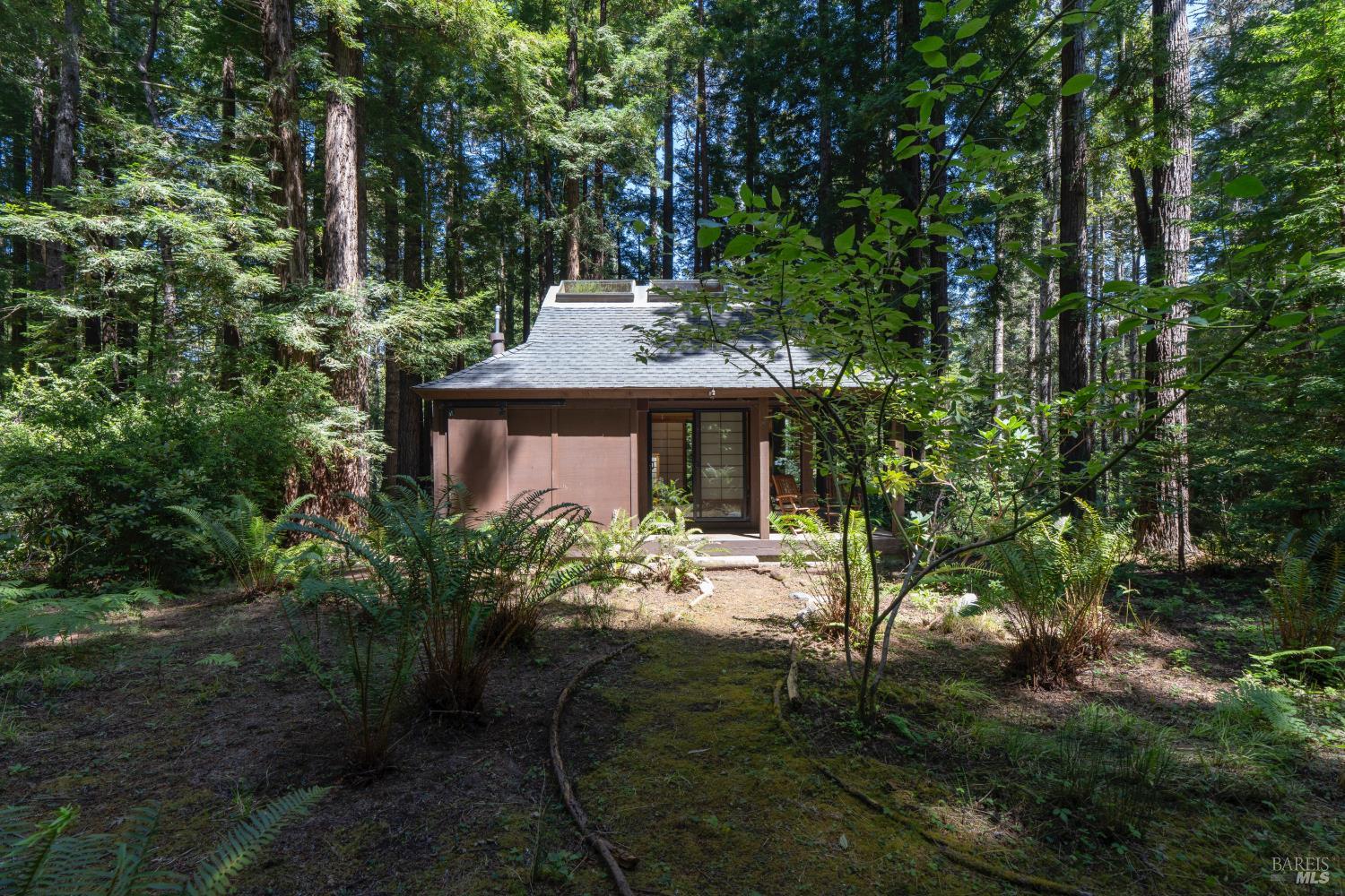 Follow your path through a calming walking experience of the forest before reaching the Tea House. Tea House is a weekend retreat of approximately 384 square foot size with a Japanese aesthetic. Inspired by tea house tradition inside and out, it's an exquisite example of making multiple uses out of a single space by distilling needs down to what really matters. By using alcoves, shoji screens, and a tokonoma it elegantly accommodates living, dining, kitchen, and sleeping all centered on a traditional tatami mat floor. The tiny building appears lifted into place among the redwood trees. Designed by local Architect Fiona E. O'Neill, a one woman-owned firm designing homes at The Sea Ranch since 1991.